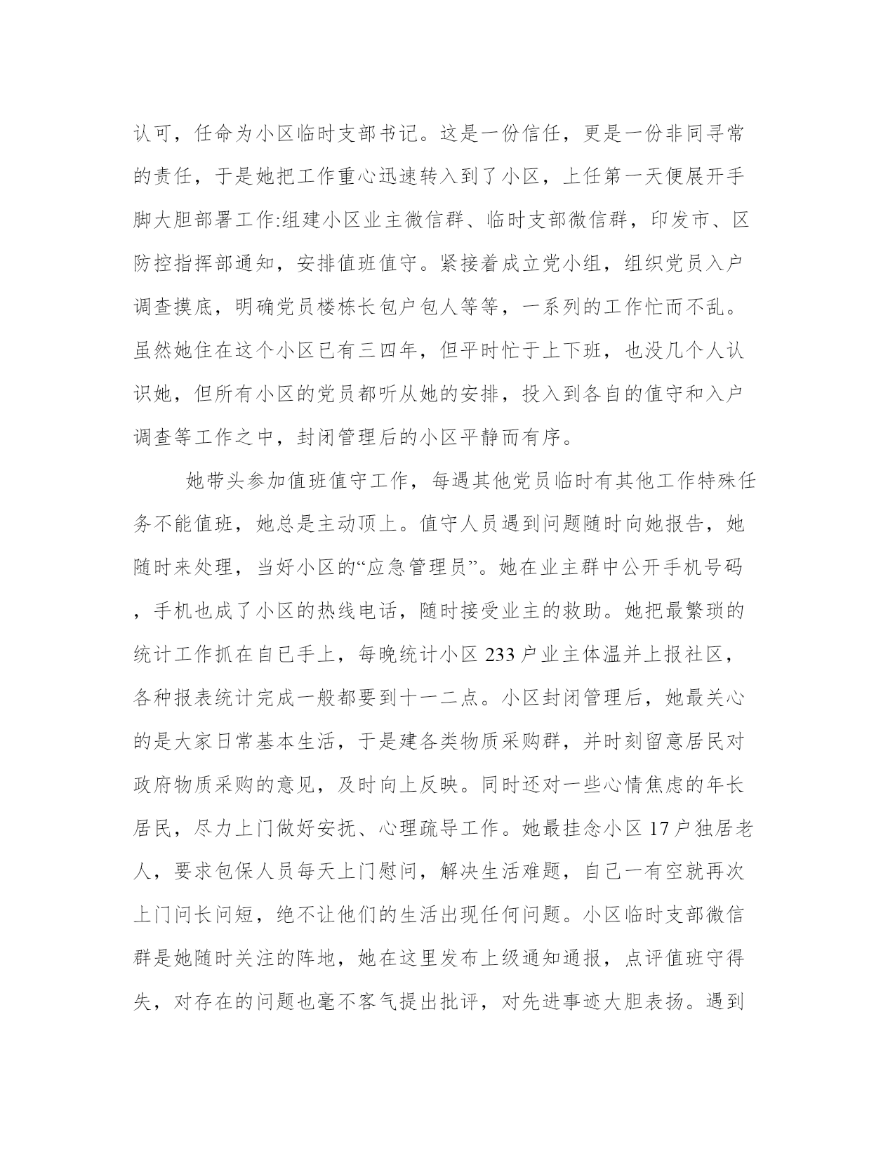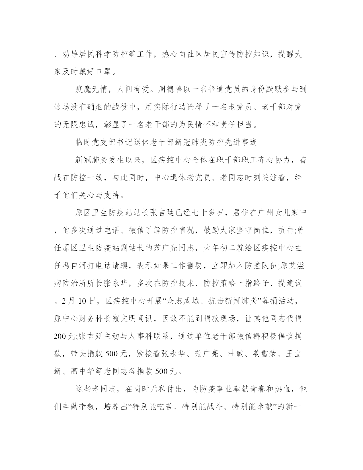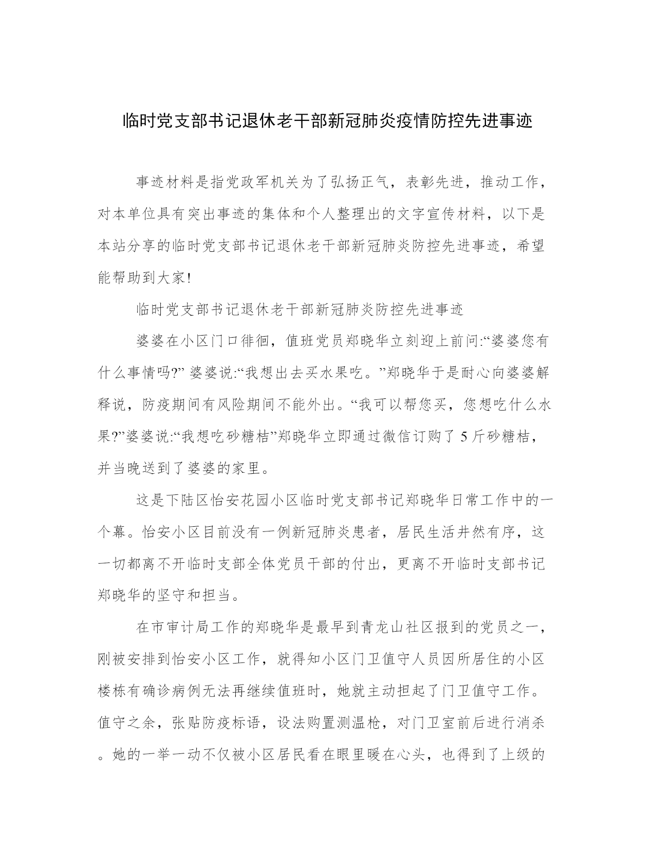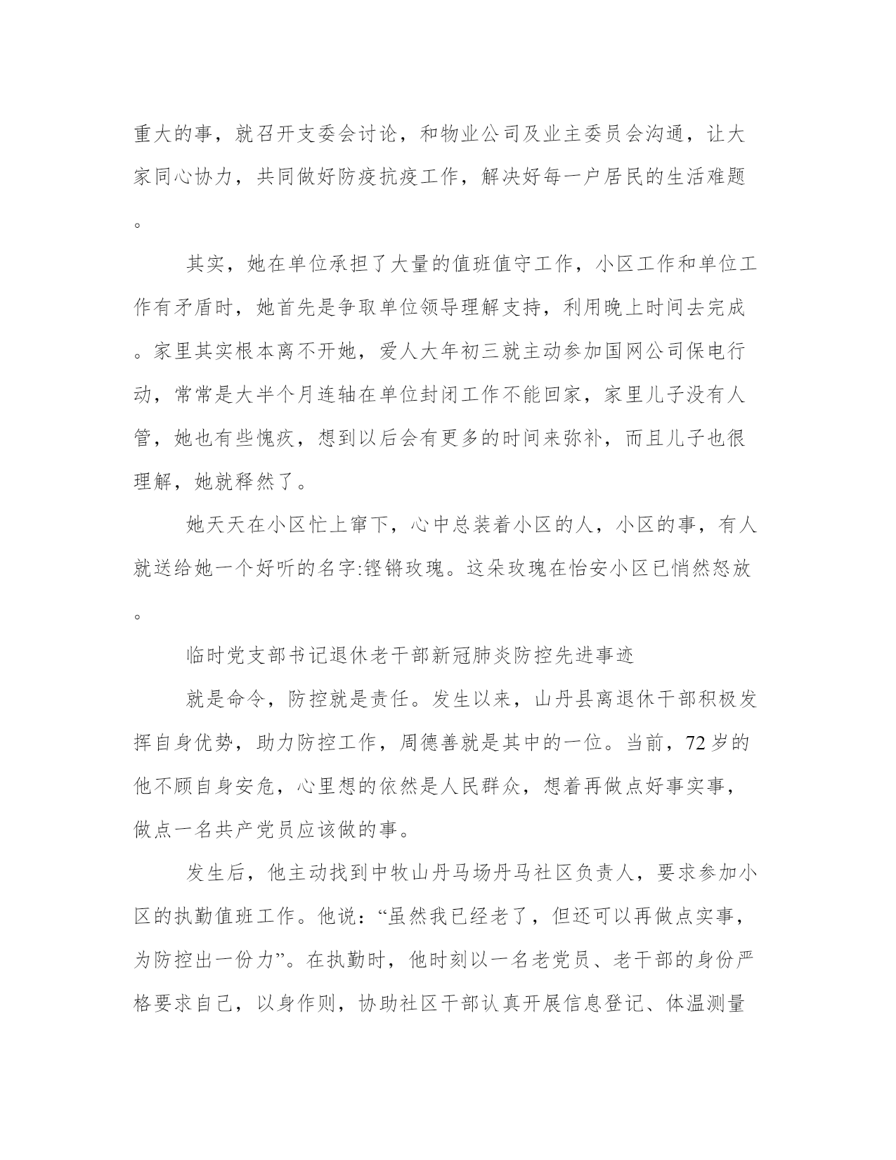 临时党支部书记退休老干部新冠肺炎疫情防控先进事迹事迹材料是指党政军机关为了弘扬正气,表彰先进,推动工作,对本单位具有突出事迹的集体和个人整理出的文字宣传材料,以下是本站分享的临时党支部书记退休老干部新冠肺炎防控先进事迹,希望能帮助到大家!临时党支部书记退休老干部新冠肺炎防控先进事迹婆婆在小区门口徘徊,值班党员郑晓华立刻迎上前问:“婆婆您有什么事情吗?”婆婆说:“我想出去买水果吃。”郑晓华于是耐心向婆婆解释说,防疫期间有风险期间不能外出。“我可以帮您买,您想吃什么水果?”婆婆说:“我想吃砂糖桔”郑晓华立即通过微信订购了5斤砂糖桔,并当晚送到了婆婆的家里。这是下陆区怡安花园小区临时党支部书记郑晓华日常工作中的一个幕。怡安小区目前没有一例新冠肺炎患者,居民生活井然有序,这一切都离不开临时支部全体党员干部的付出,更离不开临时支部书记郑晓华的坚守和担当。在市审计局工作的郑晓华是最早到青龙山社区报到的党员之一,刚被安排到怡安小区工作,就得知小区门卫值守人员因所居住的小区楼栋有确诊病例无法再继续值班时,她就主动担起了门卫值守工作。值守之余,张贴防疫标语,设法购置测温枪,对门卫室前后进行消杀。她的一举一动不仅被小区居民看在眼里暖在心头,也得到了上级的认可,任命为小区临时支部书记。这是一份信任,更是一份非同寻常的责任,于是她把工作重心迅速转入到了小区,上任第一天便展开手脚大胆部署工作:组建小区业主微信群、临时支部微信群,印发市、区防控指挥部通知,安排值班值守。紧接着成立党小组,组织党员入户调查摸底,明确党员楼栋长包户包人等等,一系列的工作忙而不乱。虽然她住在这个小区已有三四年,但平时忙于上下班,也没几个人认识她,但所有小区的党员都听从她的安排,投入到各自的值守和入户调查等工作之中,封闭管理后的小区平静而有序。她带头参加值班值守工作,每遇其他党员临时有其他工作特殊任务不能值班,她总是主动顶上。值守人员遇到问题随时向她报告,她随时来处理,当好小区的“应急管理员”。她在业主群中公开手机号码,手机也成了小区的热线电话,随时接受业主的救助。她把最繁琐的统计工作抓在自已手上,每晚统计小区233户业主体温并上报社区,各种报表统计完成一般都要到十一二点。小区封闭管理后,她最关心的是大家日常基本生活,于是建各类物质采购群,并时刻留意居民对政府物质采购的意见,及时向上反映。同时还对一些心情焦虑的年长居民,尽力上门做好安抚、心理疏导工作。她最挂念小区17户独居老人,要求包保人员每天上门慰问,解决生活难题,自己一有空就再次上门问长问短,绝不让他们的生活出现任何问题。小区临时支部微信群是她随时关注的阵地,她在这里发布上级通知通报,点评值班守得失,对存在的问题也毫不客气提出批评,对先进事迹大胆表扬。遇到重大的事,就召开支委会讨论,和物业公司及业主委员会沟通,让大家同心协力,共同做好防疫抗疫工作,解决好每一户居民的生活难题。其实,她在单位承担了大量的值班值守工作,小区工作和单位工作有矛盾时,她首先是争取单位领导理解支持,利用晚上时间去完成。家里其实根本离不开她,爱人大年初三就主动参加国网公司保电行动,常常是大半个月连轴在单位封闭工作不能回家,家里儿子没有人管,她也有些愧疚,想到以后会有更多的时间来弥补,而且儿子也很理解,她就释然了。她天天在小区忙上窜下,心中总装着小区的人,小区的事,有人就送给她一个好听的名字:铿锵玫瑰。这朵玫瑰在怡安小区已悄然怒放。临时党支部书记退休老干部新冠肺炎防控先进事迹就是命令,防控就是责任。发生以来,山丹县离退休干部积极发挥自身优势,助力防控工作,周德善就是其中的一位。当前,72岁的他不顾自身安危,心里想的依然是人民群众,想着再做点好事实事,做点一名共产党员应该做的事。发生后,他主动找到中牧山丹马场丹马社区负责人,要求参加小区的执勤值班工作。他说:“虽然我已经老了,但还可以再做点实事,为防控出一份力”。在执勤时,他时刻以一名老党员、老干部的身份严格要求自己,以身作则,协助社区干部认真开展信息登记、体温测量、劝导居民科学防控等工作,热心向社区居民宣传防控知识,提醒大家及时戴好口罩。疫魔无情,人间有爱。周德善以一名普通党员的身份默默参与到这场没有硝烟的战役中,用实际行动诠释了一名老党员、老干部对党的无限忠诚,彰显了一名老干部的为民情怀和责任担当。临时党支部书记退休老干部新冠肺炎防控先进事迹新冠肺炎发生以来,区疾控中心全体在职干部职工齐心协力,奋战在防控一线,与此同时,中心退休老党员、老同志时刻关注着,给予他们关心与支持。原区卫生防疫站站长张吉廷已经七十多岁,居住在广州女儿家中,他多次通过电话、微信了解防控情况,鼓励大家坚守岗位,抗击;曾任原区卫生防疫站副站长的范广亮同志,大年初二就给区疾控中心主任冯自河打电话请缨,表示如果工作需要,立即加入防控队伍;原