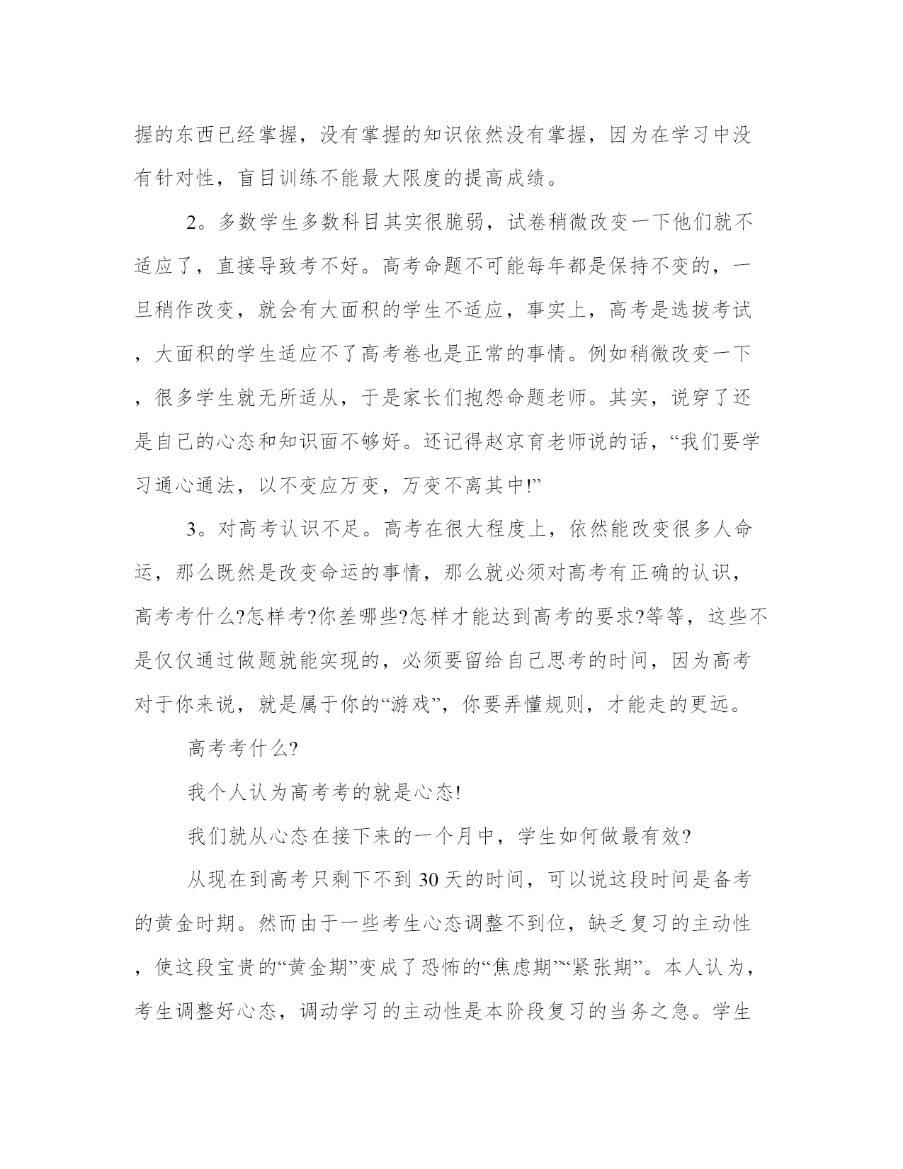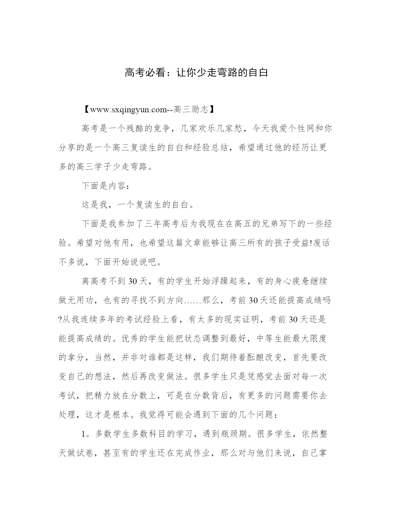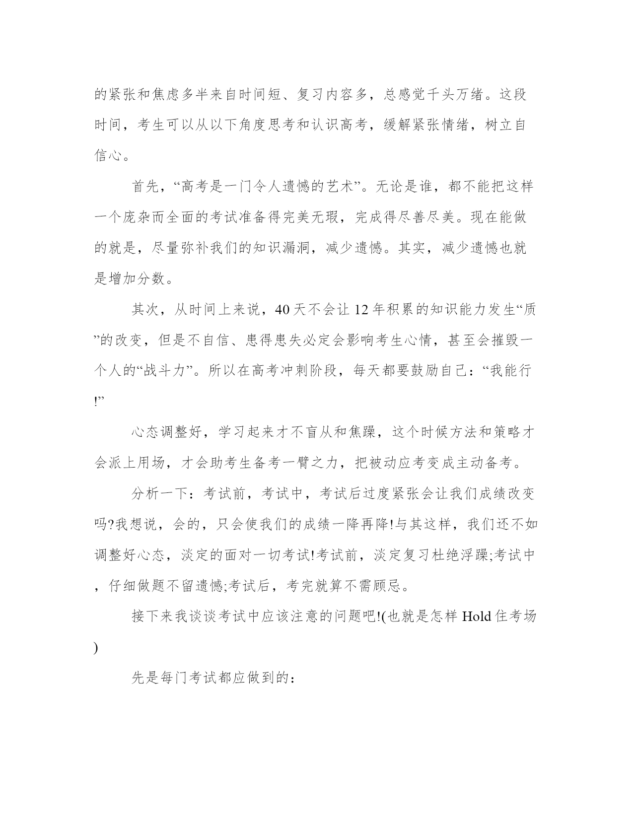 高考必看:让你少走弯路的自白【www.sxqingyun.com--高三励志】高考是一个残酷的竞争,几家欢乐几家愁,今天我爱个性网和你分享的是一个高三复读生的自白和经验总结,希望通过他的经历让更多的高三学子少走弯路。下面是内容:这是我,一个复读生的自白。下面是我参加了三年高考后为我现在在高五的兄弟写下的一些经验。希望对他有用,也希望这篇文章能够让高三所有的孩子受益!废话不多说,下面开始说说吧。离高考不到30天,有的学生开始浮躁起来,有的身心疲惫继续做无用功,也有的寻找不到方向……那么,考前30天还能提高成绩吗?从我连续多年的考试经验上看,有太多的现实证明,考前30天还是能提高成绩的。优秀的学生能把状态调整到最好,中等生能最大限度的拿分,当然,并非对谁都是这样,我们期待着酝酿改变,首先要改变自己的想法,然后再改变做法。很多学生只是凭感觉去面对每一次考试,把精力放在分数上,可是在分数背后,有更多的问题需要你去处理,这才是根本。我觉得可能会遇到下面的几个问题:1。多数学生多数科目的学习,遇到瓶颈期。很多学生,依然整天做试卷,甚至有的学生还在完成作业,那么对与他们来说,自己掌握的东西已经掌握,没有掌握的知识依然没有掌握,因为在学习中没有针对性,盲目训练不能最大限度的提高成绩。2。多数学生多数科目其实很脆弱,试卷稍微改变一下他们就不适应了,直接导致考不好。高考命题不可能每年都是保持不变的,一旦稍作改变,就会有大面积的学生不适应,事实上,高考是选拔考试,大面积的学生适应不了高考卷也是正常的事情。例如稍微改变一下,很多学生就无所适从,于是家长们抱怨命题老师。其实,说穿了还是自己的心态和知识面不够好。还记得赵京育老师说的话,“我们要学习通心通法,以不变应万变,万变不离其中!”3。对高考认识不足。高考在很大程度上,依然能改变很多人命运,那么既然是改变命运的事情,那么就必须对高考有正确的认识,高考考什么?怎样考?你差哪些?怎样才能达到高考的要求?等等,这些不是仅仅通过做题就能实现的,必须要留给自己思考的时间,因为高考对于你来说,就是属于你的“游戏”,你要弄懂规则,才能走的更远。高考考什么?我个人认为高考考的就是心态!我们就从心态在接下来的一个月中,学生如何做最有效?从现在到高考只剩下不到30天的时间,可以说这段时间是备考的黄金时期。然而由于一些考生心态调整不到位,缺乏复习的主动性,使这段宝贵的“黄金期”变成了恐怖的“焦虑期”“紧张期”。本人认为,考生调整好心态,调动学习的主动性是本阶段复习的当务之急。学生的紧张和焦虑多半来自时间短、复习内容多,总感觉千头万绪。这段时间,考生可以从以下角度思考和认识高考,缓解紧张情绪,树立自信心。首先,“高考是一门令人遗憾的艺术”。无论是谁,都不能把这样一个庞杂而全面的考试准备得完美无瑕,完成得尽善尽美。现在能做的就是,尽量弥补我们的知识漏洞,减少遗憾。其实,减少遗憾也就是增加分数。其次,从时间上来说,40天不会让12年积累的知识能力发生“质”的改变,但是不自信、患得患失必定会影响考生心情,甚至会摧毁一个人的“战斗力”。所以在高考冲刺阶段,每天都要鼓励自己:“我能行!”心态调整好,学习起来才不盲从和焦躁,这个时候方法和策略才会派上用场,才会助考生备考一臂之力,把被动应考变成主动备考。分析一下:考试前,考试中,考试后过度紧张会让我们成绩改变吗?我想说,会的,只会使我们的成绩一降再降!与其这样,我们还不如调整好心态,淡定的面对一切考试!考试前,淡定复习杜绝浮躁;考试中,仔细做题不留遗憾;考试后,考完就算不需顾忌。接下来我谈谈考试中应该注意的问题吧!(也就是怎样Hold住考场)先是每门考试都应做到的:一、填名写号要正确。进入考场后,考生应按全省统一制定的《考试操作指令》要求完成答题前的准备工作:即考场分发题(卡)后应按考场提示先将姓名、考号准确填写在答题卡指定处,核对粘贴到答题卡相应位置的条形码与本人信息是否一致,然后检查核对本人的试题题数、页数和答题卡上的题数是否完整、对应。二、通览试卷重审题。考生在稳定情绪并得到试卷后,检查试卷的同时应迅速浏览整份试卷,做到心中有数。对任何一道试题都须仔细审题,即先看清题意,看准提问,然后作答;对综合题、作文题等则要先审题构思再动手答题,并看清答题区域大小,以免因理解有误答错试题回头修改,或因答题区域不够用,浪费时间,影响心态。另外,外语科目听力部分考试结束后,考生方可进行其他部分的答题。三、按序作答先易后难。开考后,考生应按试题顺序作答,即选择、填空、简答、综合应用等,先做容易的、有把握得分的试题,增强信心。遇到难题不紧张、不纠缠,解答不出先绕过,确保会做的题不失误能得分。还要留意题量、题型,各题占分比例不一样,分值少的题应尽量少用时。将疑难试题留到最后分析解决,即使答不出也不会过