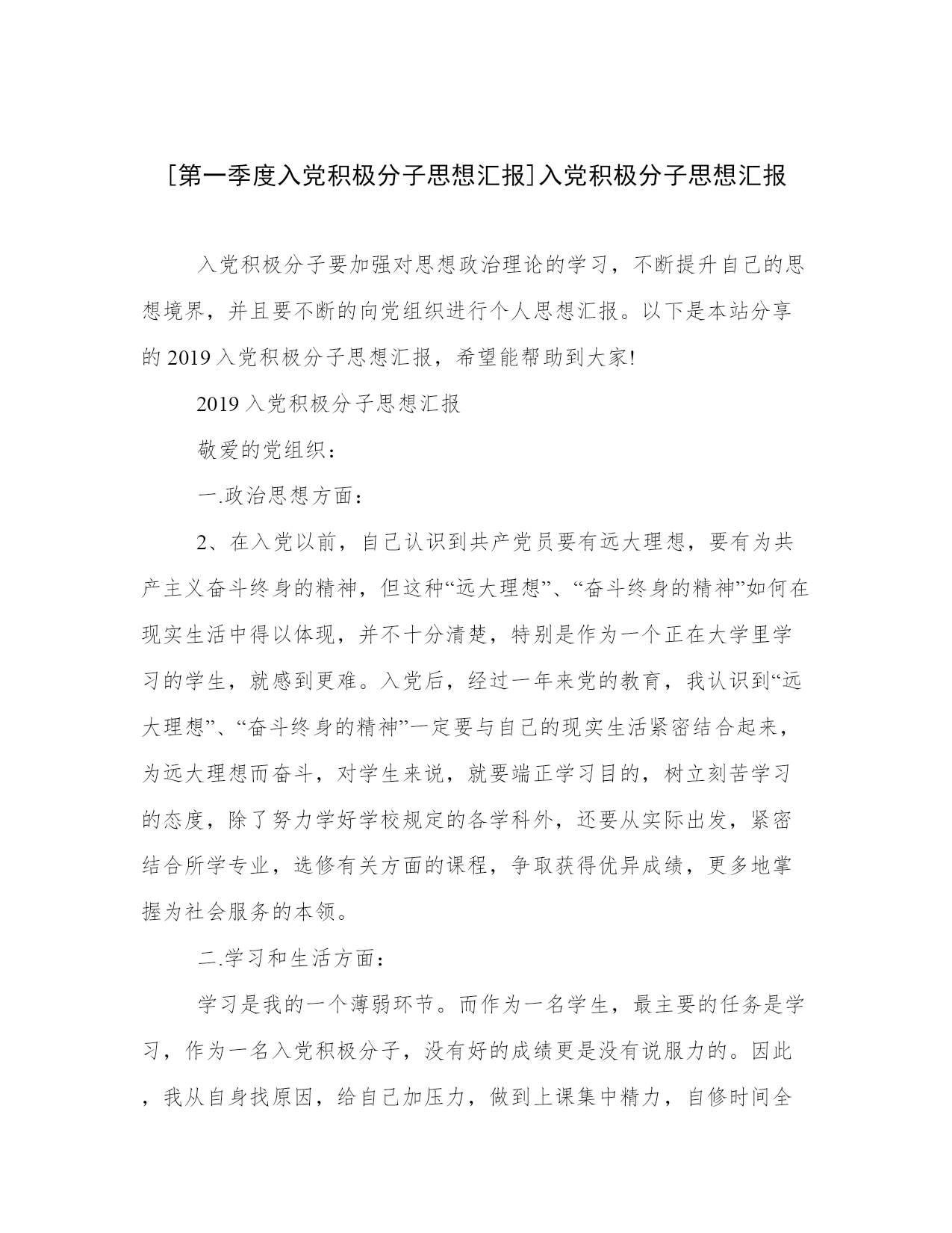 [第一季度入党积极分子思想汇报]入党积极分子思想汇报入党积极分子要加强对思想政治理论的学习,不断提升自己的思想境界,并且要不断的向党组织进行个人思想汇报。以下是本站分享的2019入党积极分子思想汇报,希望能帮助到大家!2019入党积极分子思想汇报敬爱的党组织:一.政治思想方面:2、在入党以前,自己认识到共产党员要有远大理想,要有为共产主义奋斗终身的精神,但这种“远大理想”、“奋斗终身的精神”如何在现实生活中得以体现,并不十分清楚,特别是作为一个正在大学里学习的学生,就感到更难。入党后,经过一年来党的教育,我认识到“远大理想”、“奋斗终身的精神”一定要与自己的现实生活紧密结合起来,为远大理想而奋斗,对学生来说,就要端正学习目的,树立刻苦学习的态度,除了努力学好学校规定的各学科外,还要从实际出发,紧密结合所学专业,选修有关方面的课程,争取获得优异成绩,更多地掌握为社会服务的本领。二.学习和生活方面:学习是我的一个薄弱环节。而作为一名学生,最主要的任务是学习,作为一名入党积极分子,没有好的成绩更是没有说服力的。因此,我从自身找原因,给自己加压力,做到上课集中精力,自修时间全神贯注,通过努力,这一年来我的成绩有所上升,在以后的学习中,我将努力认真学习剩下的课程,争取满意的成绩,为自己四年的大学生活作出的诠释并画上圆满的句号。在平时的生活中,作为一名生干部的我注意从一点一滴的小事做起,从现在做起,不以善小而不为,不以恶小而为之,时刻铭记有所不为才能有所为,努力培养自己良好的生活习惯和道德修养。在生活中乐于助人、关心和团结同学,我还注意经常宣传党的思想、理论以及方针路线,坚持正确的原则与立场,对一些消极思想和不良倾向作坚决斗争。我还经常鼓励思想上进的同学积极向党组织靠拢,日常生活中体现一名党员的模范带头作用。除了作好自己的本职工作外,对于学院里的要求和活动,我还积极的组织参加和配合。三.缺点和不足:一年来,自己在党组织和老师、同学们的帮助和支持下取得了一定的成绩,但我深知自己还存在一些缺点和不足,主要表现在以下几个方面:1、政治理论基础不够扎实,理论联系实际的能力较差;2、学习成绩还不能名列前茅和团结同学还不够普遍;所以在学习和生活中,还要进一步注意自己的学习和言行,要真正做到党员所要求的标准,起到模范带头作用。3、在创造性地开展工作方面努力还不够。总的说,一年来我较好地履行了党员的责任和义务,政治思想觉悟有了很大提高,较好地发挥了党员的先锋模范作用。以上是自己一年来基本情况的小结,不妥之处,恳请组织批评指正。今后的工作和学习中,自己要更进一步严格要求自己,虚心向先进的党员同志学习,注意克服自己的缺点和不足,争取在思想、工作、学习等方面有更大的进步:第一:继续认真学习党的理论知识,用先进的科学理论武装头脑,树立正确的人生观、世界观、价值观,做好从学校走向社会的转变;第二:密切联系同学,与同学们多交流,多谈心,向同学们宣传党的主张,树立好形象为同学们做好榜样;第三:持之以恒地热情地为同学学们服务,并为将来为社会服务做好充分的准备;第四:在工作上勇挑重担,认真完成学校和班级的各项工作,多举办一些有意义的活动,为同学们为学校做出应有的贡献和努力。作为一名入党积极分子,我渴望按期转为中共正式党员,请党组织考虑我的申请,我将虚心接受组织对我的审查和考验!在大学生生活里我会更加努力认真学习,为今后人生路途铺垫更结实基石,我坚信,只要我时时刻刻跟着党走,一心一意为社会做贡献,将来无论在什么岗位上,都能创出一番成绩,那就实现了我的人生价值,因此我渴望成为一名正式的党员。如果因为我自身的原因不能如期转正,我也绝不气馁,而是更加坚定信念,努力提高自己的工作水平和办事能力,勤勤恳恳地干好本职工作,真正从思想上,行动上入党,请党组织不断考验我,并用高标准严格要求我!我将欣然接受批评和指导,使自己成为一名合格的、能经受得起任何考验的真正的共产党员。此致敬礼!汇报人:2019年xx月xx日2019入党积极分子思想汇报敬爱的党组织:自从本人被确定为入党积极分子以来,接受了党的教育,系统地了解了党的历史、性质、奋斗目标、建党宗旨、组织制度和组织原则等基本知识。经过近一段时间的自己学习和党员的帮助,本人在思想上积极要求上进,在工作中向党员同志看齐,对党的认识更加深刻。现将本人近期思想情况汇报如下:第一,要提高学习马克思主义理论的自觉性。"认真学习马克思列宁主义、毛泽东思想、邓小平理论和"三个代表"重要思想",是党章规定的共产党员义务的第一条。共产党员必须懂得:理论上的成熟是政治上成熟的基础,政治上的清醒来源于理论上的坚定。有的同志在重大问题上政治不敏锐,甚至失去辨别能力,重要原因就是缺乏应有的马克思主义理论素养。理论上贫乏,政治上就不清醒。只有刻苦学习马克思主义理论,才能