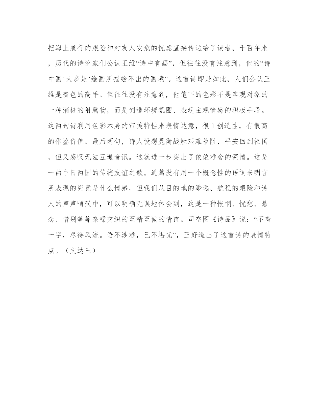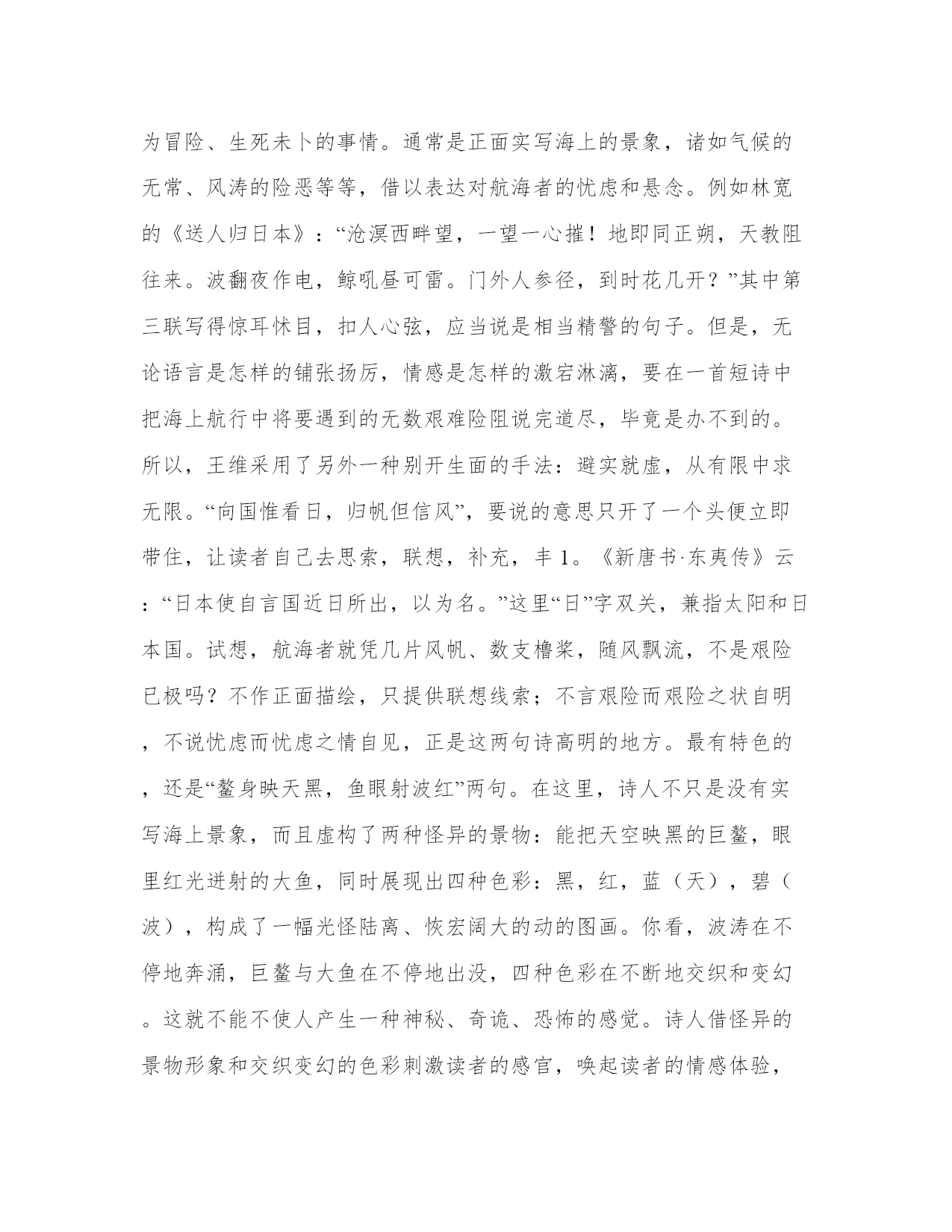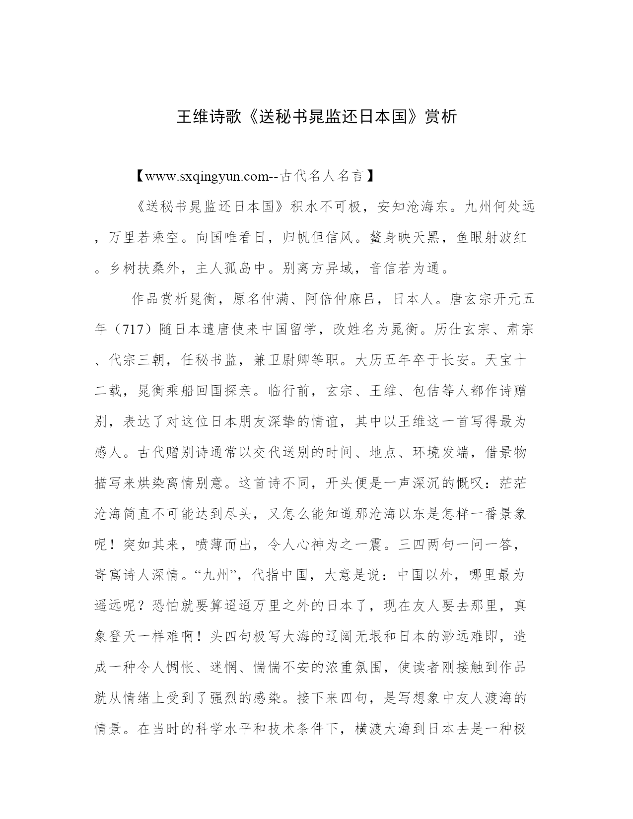 王维诗歌《送秘书晁监还日本国》赏析【www.sxqingyun.com--古代名人名言】《送秘书晁监还日本国》积水不可极,安知沧海东。九州何处远,万里若乘空。向国唯看日,归帆但信风。鳌身映天黑,鱼眼射波红。乡树扶桑外,主人孤岛中。别离方异域,音信若为通。作品赏析晁衡,原名仲满、阿倍仲麻吕,日本人。唐玄宗开元五年(717)随日本遣唐使来中国留学,改姓名为晁衡。历仕玄宗、肃宗、代宗三朝,任秘书监,兼卫尉卿等职。大历五年卒于长安。天宝十二载,晁衡乘船回国探亲。临行前,玄宗、王维、包佶等人都作诗赠别,表达了对这位日本朋友深挚的情谊,其中以王维这一首写得最为感人。古代赠别诗通常以交代送别的时间、地点、环境发端,借景物描写来烘染离情别意。这首诗不同,开头便是一声深沉的慨叹:茫茫沧海简直不可能达到尽头,又怎么能知道那沧海以东是怎样一番景象呢!突如其来,喷薄而出,令人心神为之一震。三四两句一问一答,寄寓诗人深情。“九州”,代指中国,大意是说:中国以外,哪里最为遥远呢?恐怕就要算迢迢万里之外的日本了,现在友人要去那里,真象登天一样难啊!头四句极写大海的辽阔无垠和日本的渺远难即,造成一种令人惆怅、迷惘、惴惴不安的浓重氛围,使读者刚接触到作品就从情绪上受到了强烈的感染。接下来四句,是写想象中友人渡海的情景。在当时的科学水平和技术条件下,横渡大海到日本去是一种极为冒险、生死未卜的事情。通常是正面实写海上的景象,诸如气候的无常、风涛的险恶等等,借以表达对航海者的忧虑和悬念。例如林宽的《送人归日本》:“沧溟西畔望,一望一心摧!地即同正朔,天教阻往来。波翻夜作电,鲸吼昼可雷。门外人参径,到时花几开?”其中第三联写得惊耳怵目,扣人心弦,应当说是相当精警的句子。但是,无论语言是怎样的铺张扬厉,情感是怎样的激宕淋漓,要在一首短诗中把海上航行中将要遇到的无数艰难险阻说完道尽,毕竟是办不到的。所以,王维采用了另外一种别开生面的手法:避实就虚,从有限中求无限。“向国惟看日,归帆但信风”,要说的意思只开了一个头便立即带住,让读者自己去思索,联想,补充,丰1。《新唐书·东夷传》云:“日本使自言国近日所出,以为名。”这里“日”字双关,兼指太阳和日本国。试想,航海者就凭几片风帆、数支橹桨,随风飘流,不是艰险已极吗?不作正面描绘,只提供联想线索;不言艰险而艰险之状自明,不说忧虑而忧虑之情自见,正是这两句诗高明的地方。最有特色的,还是“鳌身映天黑,鱼眼射波红”两句。在这里,诗人不只是没有实写海上景象,而且虚构了两种怪异的景物:能把天空映黑的巨鳌,眼里红光迸射的大鱼,同时展现出四种色彩:黑,红,蓝(天),碧(波),构成了一幅光怪陆离、恢宏阔大的动的图画。你看,波涛在不停地奔涌,巨鳌与大鱼在不停地出没,四种色彩在不断地交织和变幻。这就不能不使人产生一种神秘、奇诡、恐怖的感觉。诗人借怪异的景物形象和交织变幻的色彩刺激读者的感官,唤起读者的情感体验,把海上航行的艰险和对友人安危的忧虑直接传达给了读者。千百年来,历代的诗论家们公认王维“诗中有画”,但往往没有注意到,他的“诗中画”大多是“绘画所描绘不出的画境”。这首诗即是如此。人们公认王维是着色的高手。但往往没有注意到,他笔下的色彩不是客观对象的一种消极的附属物,而是创造环境氛围、表现主观情感的积极手段。这两句诗利用色彩本身的审美特性来表情达意,很1创造性,有很高的借鉴价值。最后两句,诗人设想晁衡战胜艰难险阻,平安回到祖国,但又感叹无法互通音讯。这就进一步突出了依依难舍的深情。这是一曲中日两国的传统友谊之歌。通篇没有用一个概念性的语词来明言所表现的究竟是什么情感,但我们从目的地的渺远、航程的艰险和诗人的声声喟叹中,可以明确无误地体会到,这是一种怅惘、忧愁、悬念、惜别等等杂糅交织的至精至诚的情谊。司空图《诗品》说:“不着一字,尽得风流。语不涉难,已不堪忧”,正好道出了这首诗的表情特点。(文达三)