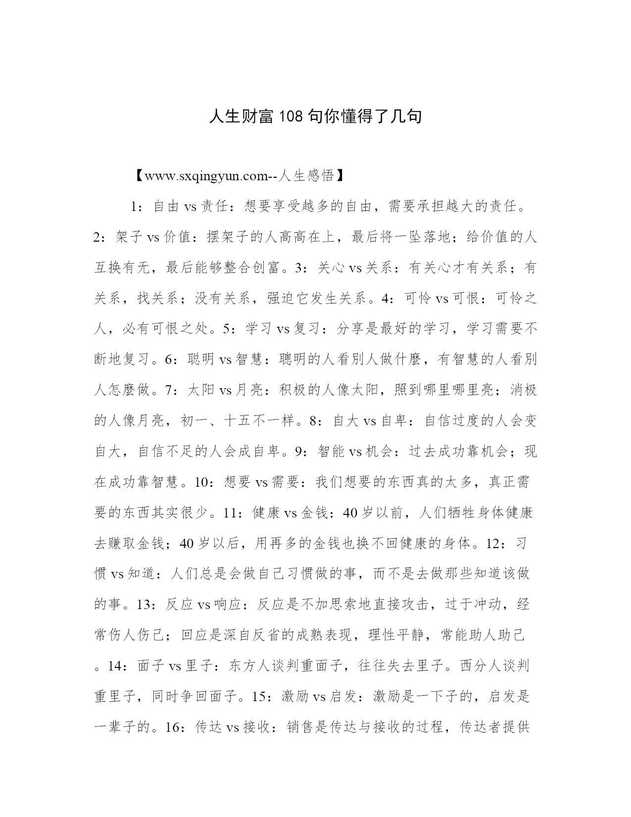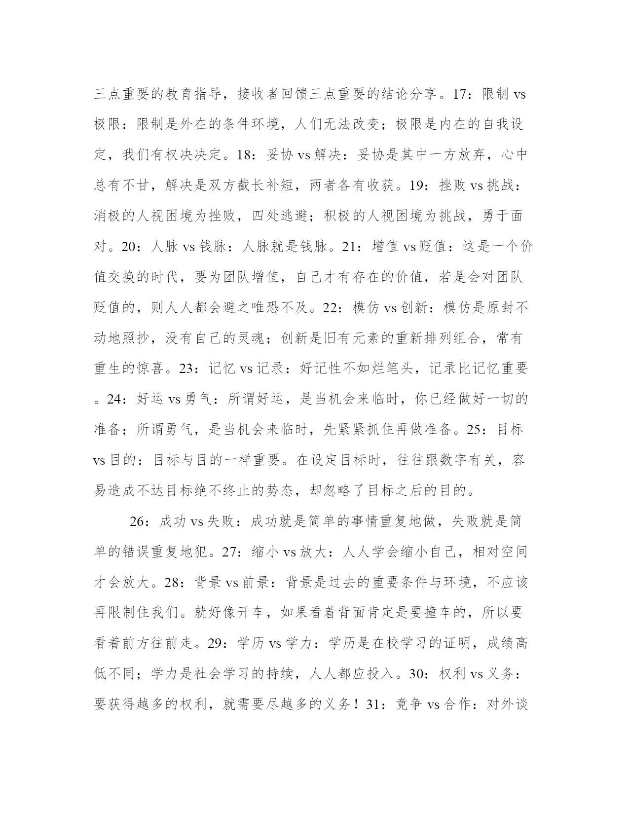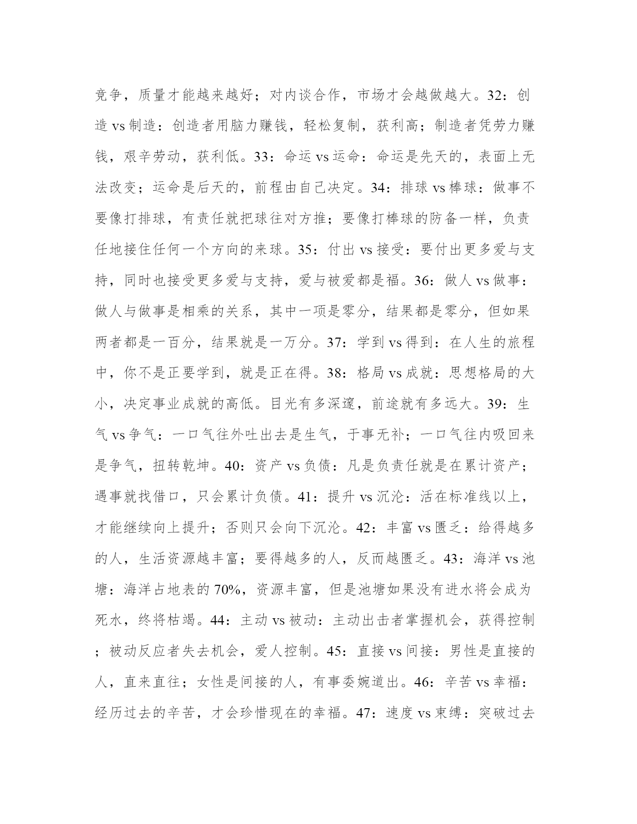 人生财富108句你懂得了几句【www.sxqingyun.com--人生感悟】1:自由vs责任:想要享受越多的自由,需要承担越大的责任。2:架子vs价值:摆架子的人高高在上,最后将一坠落地;给价值的人互换有无,最后能够整合创富。3:关心vs关系:有关心才有关系;有关系,找关系;没有关系,强迫它发生关系。4:可怜vs可恨:可怜之人,必有可恨之处。5:学习vs复习:分享是最好的学习,学习需要不断地复习。6:聪明vs智慧:聰明的人看別人做什麼,有智慧的人看別人怎麼做。7:太阳vs月亮:积极的人像太阳,照到哪里哪里亮;消极的人像月亮,初一、十五不一样。8:自大vs自卑:自信过度的人会变自大,自信不足的人会成自卑。9:智能vs机会:过去成功靠机会;现在成功靠智慧。10:想要vs需要:我们想要的东西真的太多,真正需要的东西其实很少。11:健康vs金钱:40岁以前,人们牺牲身体健康去赚取金钱;40岁以后,用再多的金钱也换不回健康的身体。12:习惯vs知道:人们总是会做自己习惯做的事,而不是去做那些知道该做的事。13:反应vs响应:反应是不加思索地直接攻击,过于冲动,经常伤人伤己;回应是深自反省的成熟表现,理性平静,常能助人助己。14:面子vs里子:东方人谈判重面子,往往失去里子。西分人谈判重里子,同时争回面子。15:激励vs启发:激励是一下子的,启发是一辈子的。16:传达vs接收:销售是传达与接收的过程,传达者提供三点重要的教育指导,接收者回馈三点重要的结论分享。17:限制vs极限:限制是外在的条件环境,人们无法改变;极限是内在的自我设定,我们有权决决定。18:妥协vs解决:妥协是其中一方放弃,心中总有不甘,解决是双方截长补短,两者各有收获。19:挫败vs挑战:消极的人视困境为挫败,四处逃避;积极的人视困境为挑战,勇于面对。20:人脉vs钱脉:人脉就是钱脉。21:增值vs贬值:这是一个价值交换的时代,要为团队增值,自己才有存在的价值,若是会对团队贬值的,则人人都会避之唯恐不及。22:模仿vs创新:模仿是原封不动地照抄,没有自己的灵魂;创新是旧有元素的重新排列组合,常有重生的惊喜。23:记忆vs记录:好记性不如烂笔头,记录比记忆重要。24:好运vs勇气:所谓好运,是当机会来临时,你已经做好一切的准备;所谓勇气,是当机会来临时,先紧紧抓住再做准备。25:目标vs目的:目标与目的一样重要。在设定目标时,往往跟数字有关,容易造成不达目标绝不终止的势态,却忽略了目标之后的目的。26:成功vs失败:成功就是简单的事情重复地做,失败就是简单的错误重复地犯。27:缩小vs放大:人人学会缩小自己,相对空间才会放大。28:背景vs前景:背景是过去的重要条件与环境,不应该再限制住我们。就好像开车,如果看着背面肯定是要撞车的,所以要看着前方往前走。29:学历vs学力:学历是在校学习的证明,成绩高低不同;学力是社会学习的持续,人人都应投入。30:权利vs义务:要获得越多的权利,就需要尽越多的义务!31:竟争vs合作:对外谈竞争,质量才能越来越好;对内谈合作,市场才会越做越大。32:创造vs制造:创造者用脑力赚钱,轻松复制,获利高;制造者凭劳力赚钱,艰辛劳动,获利低。33:命运vs运命:命运是先天的,表面上无法改变;运命是后天的,前程由自己决定。34:排球vs棒球:做事不要像打排球,有责任就把球往对方推;要像打棒球的防备一样,负责任地接住任何一个方向的来球。35:付出vs接受:要付出更多爱与支持,同时也接受更多爱与支持,爱与被爱都是福。36:做人vs做事:做人与做事是相乘的关系,其中一项是零分,结果都是零分,但如果两者都是一百分,结果就是一万分。37:学到vs得到:在人生的旅程中,你不是正要学到,就是正在得。38:格局vs成就:思想格局的大小,决定事业成就的高低。目光有多深邃,前途就有多远大。39:生气vs争气:一口气往外吐出去是生气,于事无补;一口气往内吸回来是争气,扭转乾坤。40:资产vs负债:凡是负责任就是在累计资产;遇事就找借口,只会累计负债。41:提升vs沉沦:活在标准线以上,才能继续向上提升;否则只会向下沉沦。42:丰富vs匮乏:给得越多的人,生活资源越丰富;要得越多的人,反而越匮乏。43:海洋vs池塘:海洋占地表的70%,资源丰富,但是池塘如果没有进水将会成为死水,终将枯竭。44:主动vs被动:主动出击者掌握机会,获得控制;被动反应者失去机会,爱人控制。45:直接vs间接:男性是直接的人,直来直往;女性是间接的人,有事委婉道出。46:辛苦vs幸福:经历过去的辛苦,才会珍惜现在的幸福。47:速度vs束缚:突破过去的束缚,才能够展现更快的速度。48:气势vs气度:不要仗着气势去凌人,要仗着气度去服人。49:天堂vs地狱:人人付出的地方就是天堂,人人争夺的地方