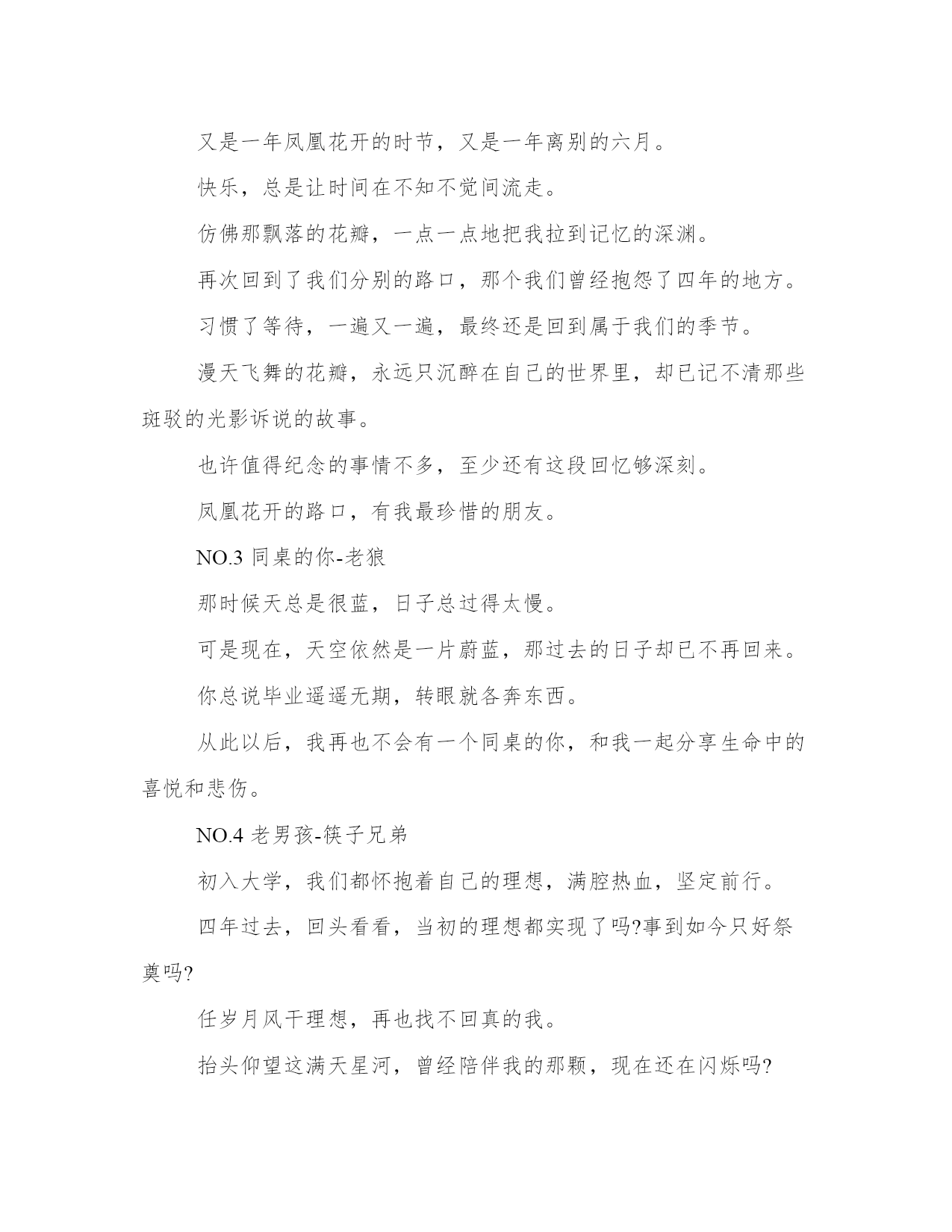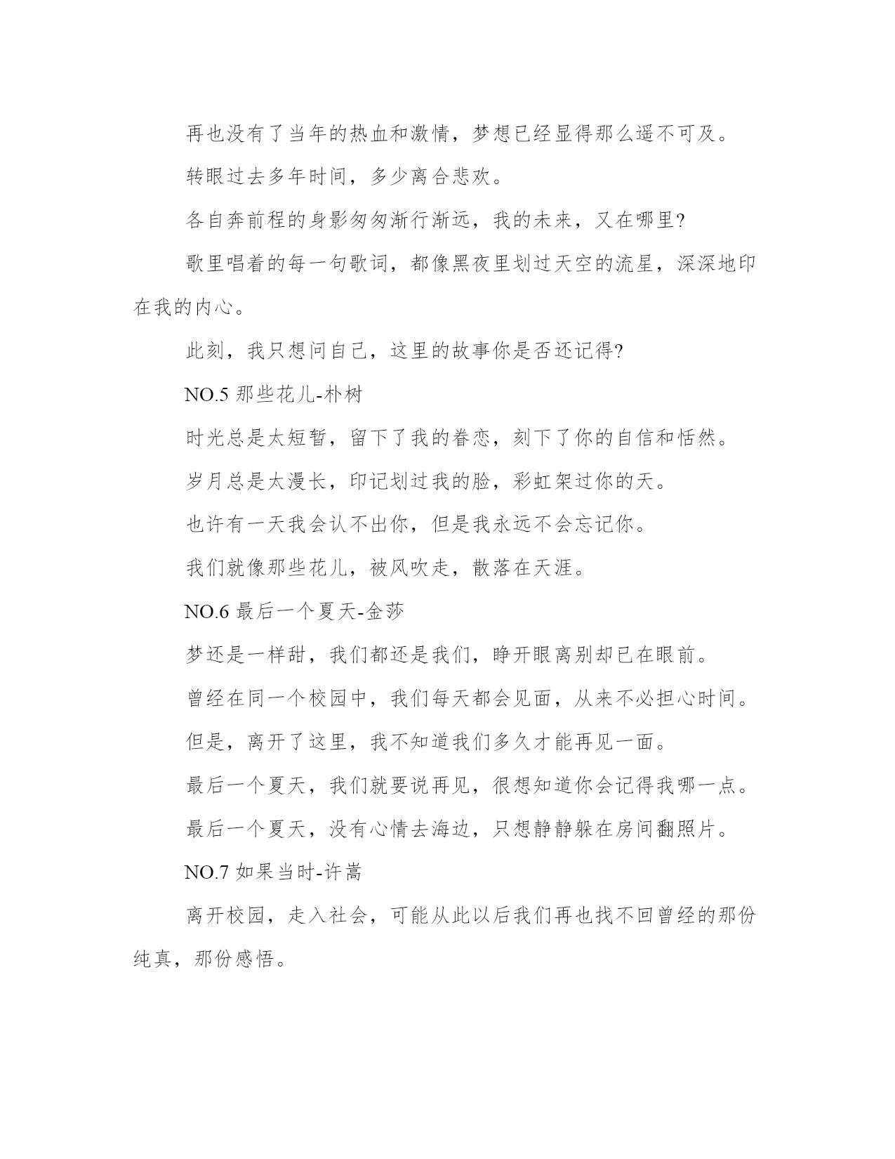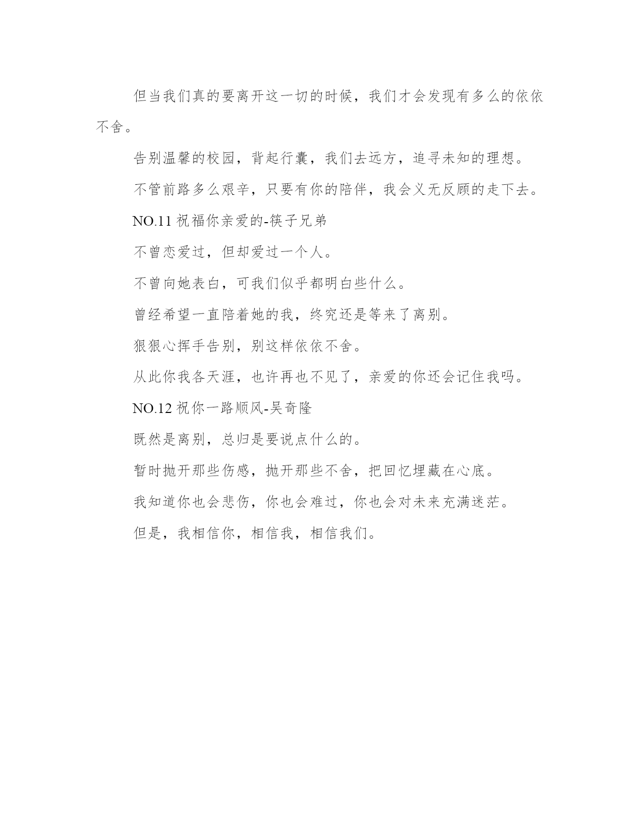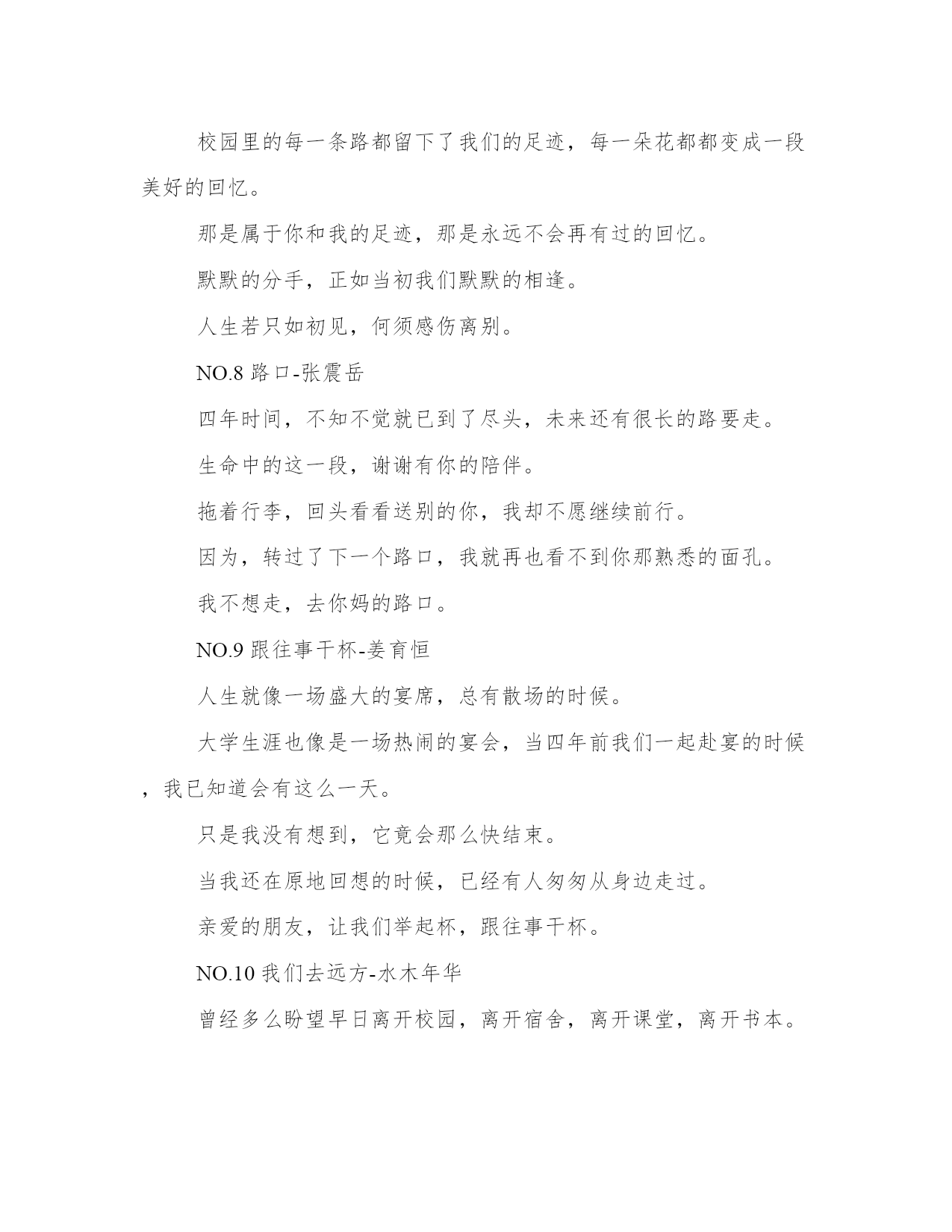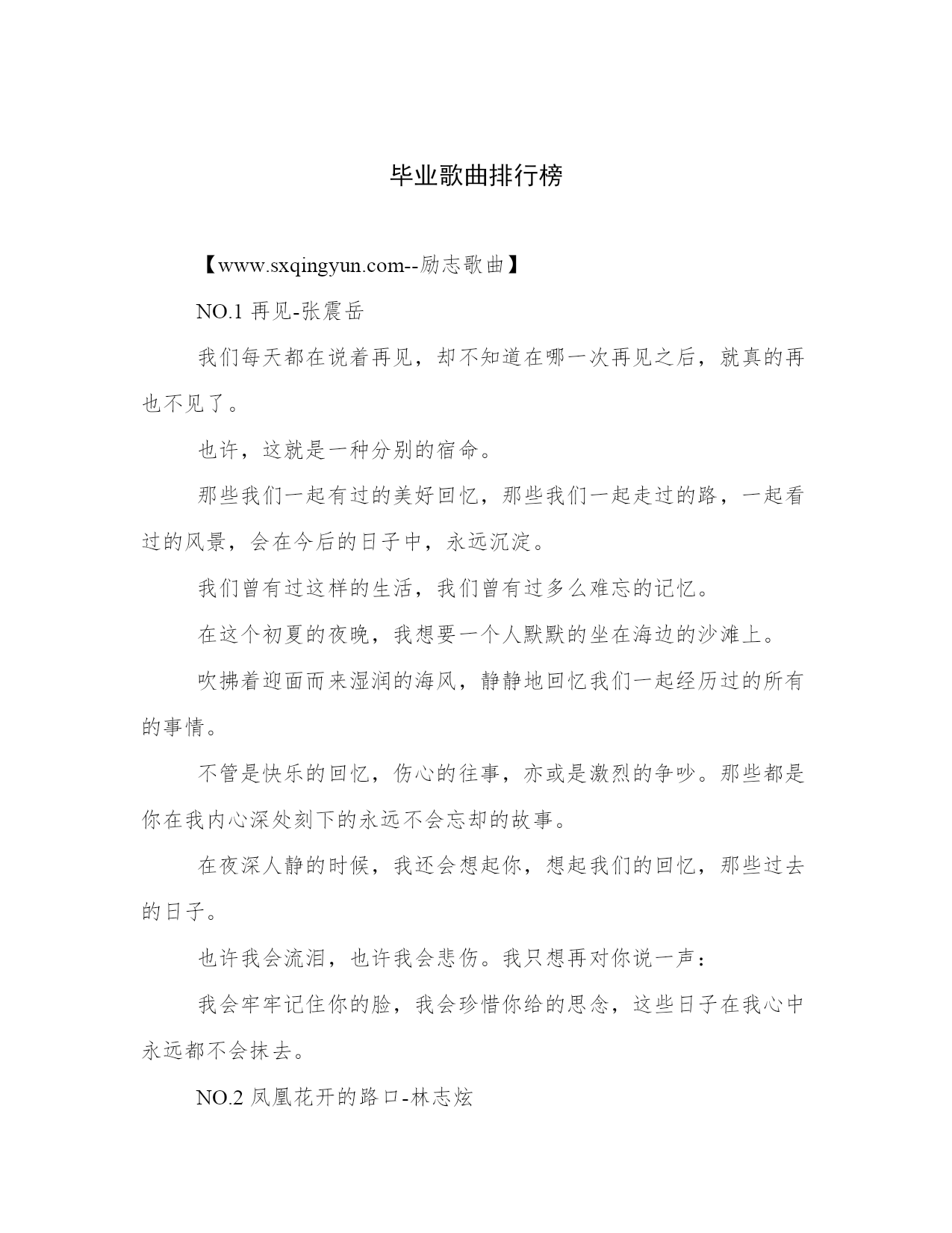 毕业歌曲排行榜【www.sxqingyun.com--励志歌曲】NO.1再见-张震岳我们每天都在说着再见,却不知道在哪一次再见之后,就真的再也不见了。也许,这就是一种分别的宿命。那些我们一起有过的美好回忆,那些我们一起走过的路,一起看过的风景,会在今后的日子中,永远沉淀。我们曾有过这样的生活,我们曾有过多么难忘的记忆。在这个初夏的夜晚,我想要一个人默默的坐在海边的沙滩上。吹拂着迎面而来湿润的海风,静静地回忆我们一起经历过的所有的事情。不管是快乐的回忆,伤心的往事,亦或是激烈的争吵。那些都是你在我内心深处刻下的永远不会忘却的故事。在夜深人静的时候,我还会想起你,想起我们的回忆,那些过去的日子。也许我会流泪,也许我会悲伤。我只想再对你说一声:我会牢牢记住你的脸,我会珍惜你给的思念,这些日子在我心中永远都不会抹去。NO.2凤凰花开的路口-林志炫又是一年凤凰花开的时节,又是一年离别的六月。快乐,总是让时间在不知不觉间流走。仿佛那飘落的花瓣,一点一点地把我拉到记忆的深渊。再次回到了我们分别的路口,那个我们曾经抱怨了四年的地方。习惯了等待,一遍又一遍,最终还是回到属于我们的季节。漫天飞舞的花瓣,永远只沉醉在自己的世界里,却已记不清那些斑驳的光影诉说的故事。也许值得纪念的事情不多,至少还有这段回忆够深刻。凤凰花开的路口,有我最珍惜的朋友。NO.3同桌的你-老狼那时候天总是很蓝,日子总过得太慢。可是现在,天空依然是一片蔚蓝,那过去的日子却已不再回来。你总说毕业遥遥无期,转眼就各奔东西。从此以后,我再也不会有一个同桌的你,和我一起分享生命中的喜悦和悲伤。NO.4老男孩-筷子兄弟初入大学,我们都怀抱着自己的理想,满腔热血,坚定前行。四年过去,回头看看,当初的理想都实现了吗?事到如今只好祭奠吗?任岁月风干理想,再也找不回真的我。抬头仰望这满天星河,曾经陪伴我的那颗,现在还在闪烁吗?再也没有了当年的热血和激情,梦想已经显得那么遥不可及。转眼过去多年时间,多少离合悲欢。各自奔前程的身影匆匆渐行渐远,我的未来,又在哪里?歌里唱着的每一句歌词,都像黑夜里划过天空的流星,深深地印在我的内心。此刻,我只想问自己,这里的故事你是否还记得?NO.5那些花儿-朴树时光总是太短暂,留下了我的眷恋,刻下了你的自信和恬然。岁月总是太漫长,印记划过我的脸,彩虹架过你的天。也许有一天我会认不出你,但是我永远不会忘记你。我们就像那些花儿,被风吹走,散落在天涯。NO.6最后一个夏天-金莎梦还是一样甜,我们都还是我们,睁开眼离别却已在眼前。曾经在同一个校园中,我们每天都会见面,从来不必担心时间。但是,离开了这里,我不知道我们多久才能再见一面。最后一个夏天,我们就要说再见,很想知道你会记得我哪一点。最后一个夏天,没有心情去海边,只想静静躲在房间翻照片。NO.7如果当时-许嵩离开校园,走入社会,可能从此以后我们再也找不回曾经的那份纯真,那份感悟。校园里的每一条路都留下了我们的足迹,每一朵花都都变成一段美好的回忆。那是属于你和我的足迹,那是永远不会再有过的回忆。默默的分手,正如当初我们默默的相逢。人生若只如初见,何须感伤离别。NO.8路口-张震岳四年时间,不知不觉就已到了尽头,未来还有很长的路要走。生命中的这一段,谢谢有你的陪伴。拖着行李,回头看看送别的你,我却不愿继续前行。因为,转过了下一个路口,我就再也看不到你那熟悉的面孔。我不想走,去你妈的路口。NO.9跟往事干杯-姜育恒人生就像一场盛大的宴席,总有散场的时候。大学生涯也像是一场热闹的宴会,当四年前我们一起赴宴的时候,我已知道会有这么一天。只是我没有想到,它竟会那么快结束。当我还在原地回想的时候,已经有人匆匆从身边走过。亲爱的朋友,让我们举起杯,跟往事干杯。NO.10我们去远方-水木年华曾经多么盼望早日离开校园,离开宿舍,离开课堂,离开书本。但当我们真的要离开这一切的时候,我们才会发现有多么的依依不舍。告别温馨的校园,背起行囊,我们去远方,追寻未知的理想。不管前路多么艰辛,只要有你的陪伴,我会义无反顾的走下去。NO.11祝福你亲爱的-筷子兄弟不曾恋爱过,但却爱过一个人。不曾向她表白,可我们似乎都明白些什么。曾经希望一直陪着她的我,终究还是等来了离别。狠狠心挥手告别,别这样依依不舍。从此你我各天涯,也许再也不见了,亲爱的你还会记住我吗。NO.12祝你一路顺风-吴奇隆既然是离别,总归是要说点什么的。暂时抛开那些伤感,抛开那些不舍,把回忆埋藏在心底。我知道你也会悲伤,你也会难过,你也会对未来充满迷茫。但是,我相信你,相信我,相信我们。