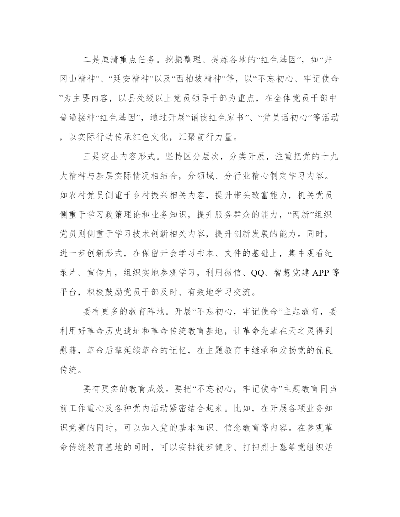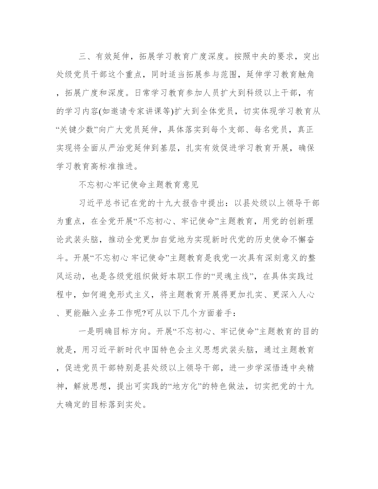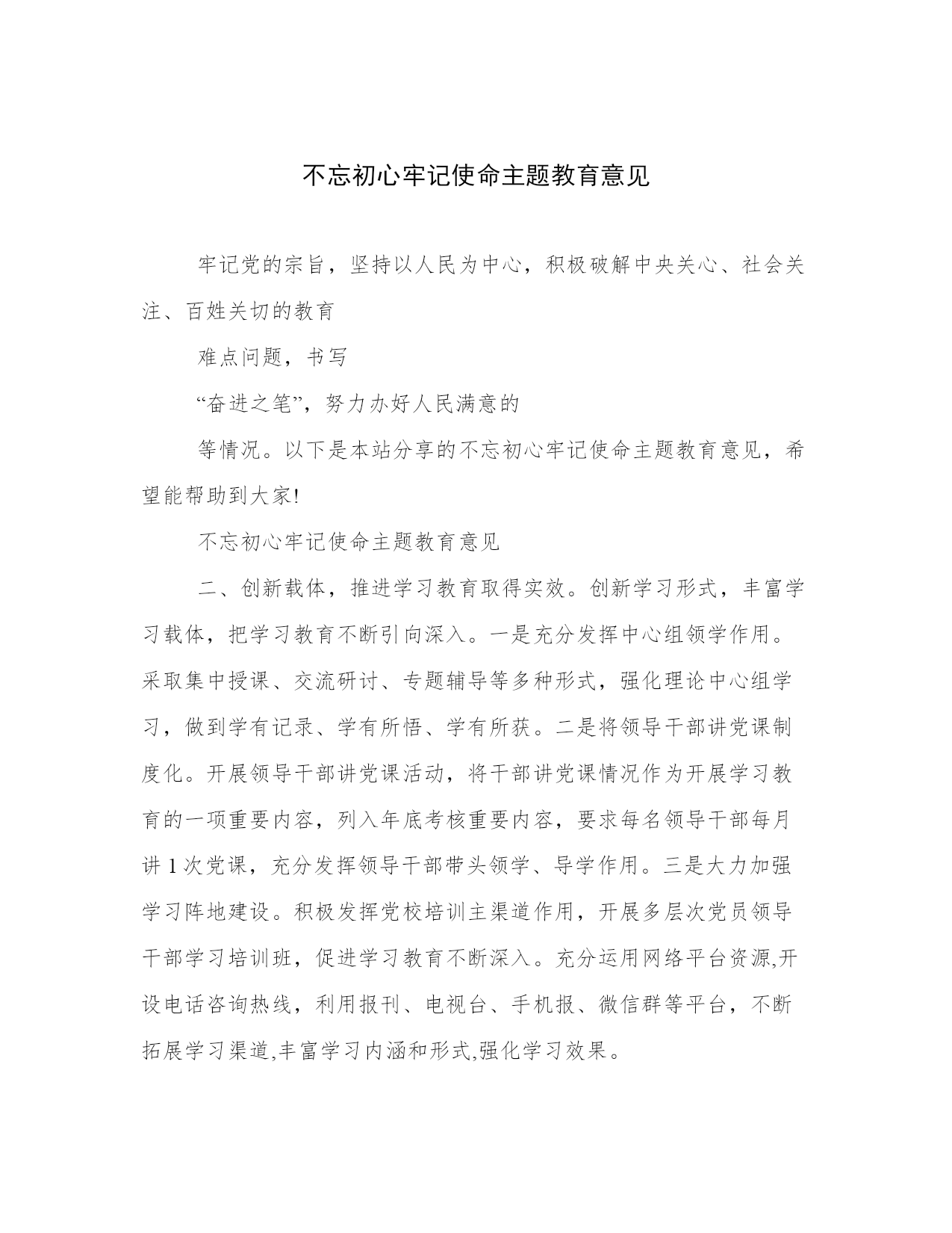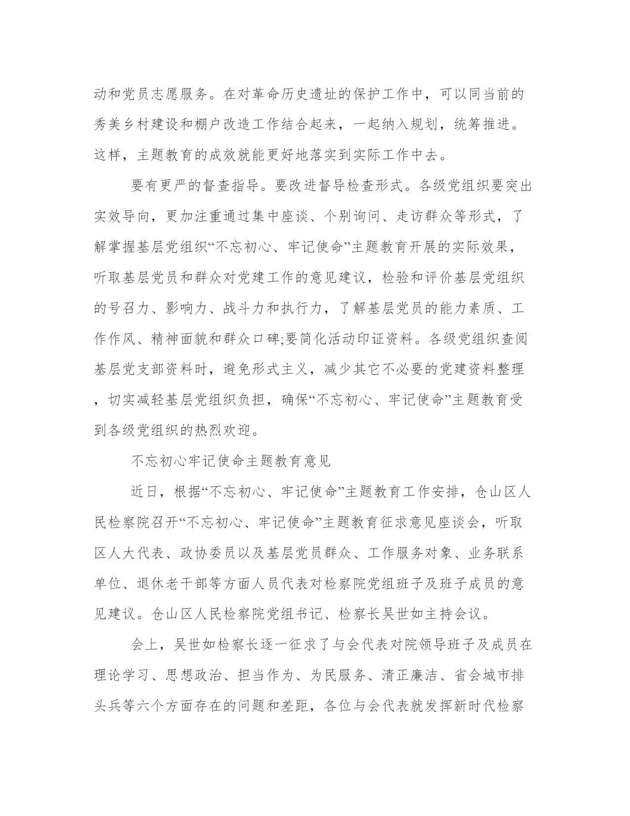 不忘初心牢记使命主题教育意见牢记党的宗旨,坚持以人民为中心,积极破解中央关心、社会关注、百姓关切的教育难点问题,书写“奋进之笔”,努力办好人民满意的等情况。以下是本站分享的不忘初心牢记使命主题教育意见,希望能帮助到大家!不忘初心牢记使命主题教育意见二、创新载体,推进学习教育取得实效。创新学习形式,丰富学习载体,把学习教育不断引向深入。一是充分发挥中心组领学作用。采取集中授课、交流研讨、专题辅导等多种形式,强化理论中心组学习,做到学有记录、学有所悟、学有所获。二是将领导干部讲党课制度化。开展领导干部讲党课活动,将干部讲党课情况作为开展学习教育的一项重要内容,列入年底考核重要内容,要求每名领导干部每月讲1次党课,充分发挥领导干部带头领学、导学作用。三是大力加强学习阵地建设。积极发挥党校培训主渠道作用,开展多层次党员领导干部学习培训班,促进学习教育不断深入。充分运用网络平台资源,开设电话咨询热线,利用报刊、电视台、手机报、微信群等平台,不断拓展学习渠道,丰富学习内涵和形式,强化学习效果。三、有效延伸,拓展学习教育广度深度。按照中央的要求,突出处级党员干部这个重点,同时适当拓展参与范围,延伸学习教育触角,拓展广度和深度。日常学习教育参加人员扩大到科级以上干部,有的学习内容(如邀请专家讲课等)扩大到全体党员,切实体现学习教育从“关键少数”向广大党员延伸,具体落实到每个支部、每名党员,真正实现将全面从严治党延伸到基层,扎实有效促进学习教育开展,确保学习教育高标准推进。不忘初心牢记使命主题教育意见习近平总书记在党的十九大报告中提出:以县处级以上领导干部为重点,在全党开展“不忘初心、牢记使命”主题教育,用党的创新理论武装头脑,推动全党更加自觉地为实现新时代党的历史使命不懈奋斗。开展“不忘初心牢记使命”主题教育是我党一次具有深刻意义的整风运动,也是各级党组织做好本职工作的“灵魂主线”,在具体实践过程中,如何避免形式主义,将主题教育开展得更加扎实、更深入人心、更能融入业务工作呢?可从以下几个方面着手:一是明确目标方向。开展“不忘初心、牢记使命”主题教育的目的就是,用习近平新时代中国特色会主义思想武装头脑,通过主题教育,促进党员干部特别是县处级以上领导干部,进一步学深悟透中央精神,解放思想,提出可实践的“地方化”的特色做法,切实把党的十九大确定的目标落到实处。二是厘清重点任务。挖掘整理、提炼各地的“红色基因”,如“井冈山精神”、“延安精神”以及“西柏坡精神”等,以“不忘初心、牢记使命”为主要内容,以县处级以上党员领导干部为重点,在全体党员干部中普遍接种“红色基因”,通过开展“诵读红色家书”、“党员话初心”等活动,以实际行动传承红色文化,汇聚前行力量。三是突出内容形式。坚持区分层次,分类开展,注重把党的十九大精神与基层实际情况相结合,分领域、分行业精心制定学习内容。如农村党员侧重于乡村振兴相关内容,提升带头致富能力,机关党员侧重于学习政策理论和业务知识,提升服务群众的能力,“两新”组织党员则侧重于学习技术创新相关内容,提升创新发展的能力。同时,进一步创新形式,在保留开会学习书本、文件的基础上,集中观看纪录片、宣传片,组织实地参观学习,利用微信、QQ、智慧党建APP等平台,积极鼓励党员干部及时、有效地学习交流。要有更多的教育阵地。开展“不忘初心,牢记使命”主题教育,要利用好革命历史遗址和革命传统教育基地,让革命先辈在天之灵得到慰藉,革命后辈延续革命的记忆,在主题教育中继承和发扬党的优良传统。要有更实的教育成效。要把“不忘初心,牢记使命”主题教育同当前工作重心及各种党内活动紧密结合起来。比如,在开展各项业务知识竞赛的同时,可以加入党的基本知识、信念教育等内容。在参观革命传统教育基地的同时,可以安排徒步健身、打扫烈士墓等党组织活动和党员志愿服务。在对革命历史遗址的保护工作中,可以同当前的秀美乡村建设和棚户改造工作结合起来,一起纳入规划,统筹推进。这样,主题教育的成效就能更好地落实到实际工作中去。要有更严的督查指导。要改进督导检查形式。各级党组织要突出实效导向,更加注重通过集中座谈、个别询问、走访群众等形式,了解掌握基层党组织“不忘初心、牢记使命”主题教育开展的实际效果,听取基层党员和群众对党建工作的意见建议,检验和评价基层党组织的号召力、影响力、战斗力和执行力,了解基层党员的能力素质、工作作风、精神面貌和群众口碑;要简化活动印证资料。各级党组织查阅基层党支部资料时,避免形式主义,减少其它不必要的党建资料整理,切实减轻基层党组织负担,确保“不忘初心、牢记使命”主题教育受到各级党组织的热烈欢迎。不忘初心牢记使命主题教育意见近日,根据“不忘初心、牢记使命”主题教育工作安排,仓山区人民检察院召开“不忘初心、牢记使命”主题教育征求意见座谈会,听取区人大代表、政协委员