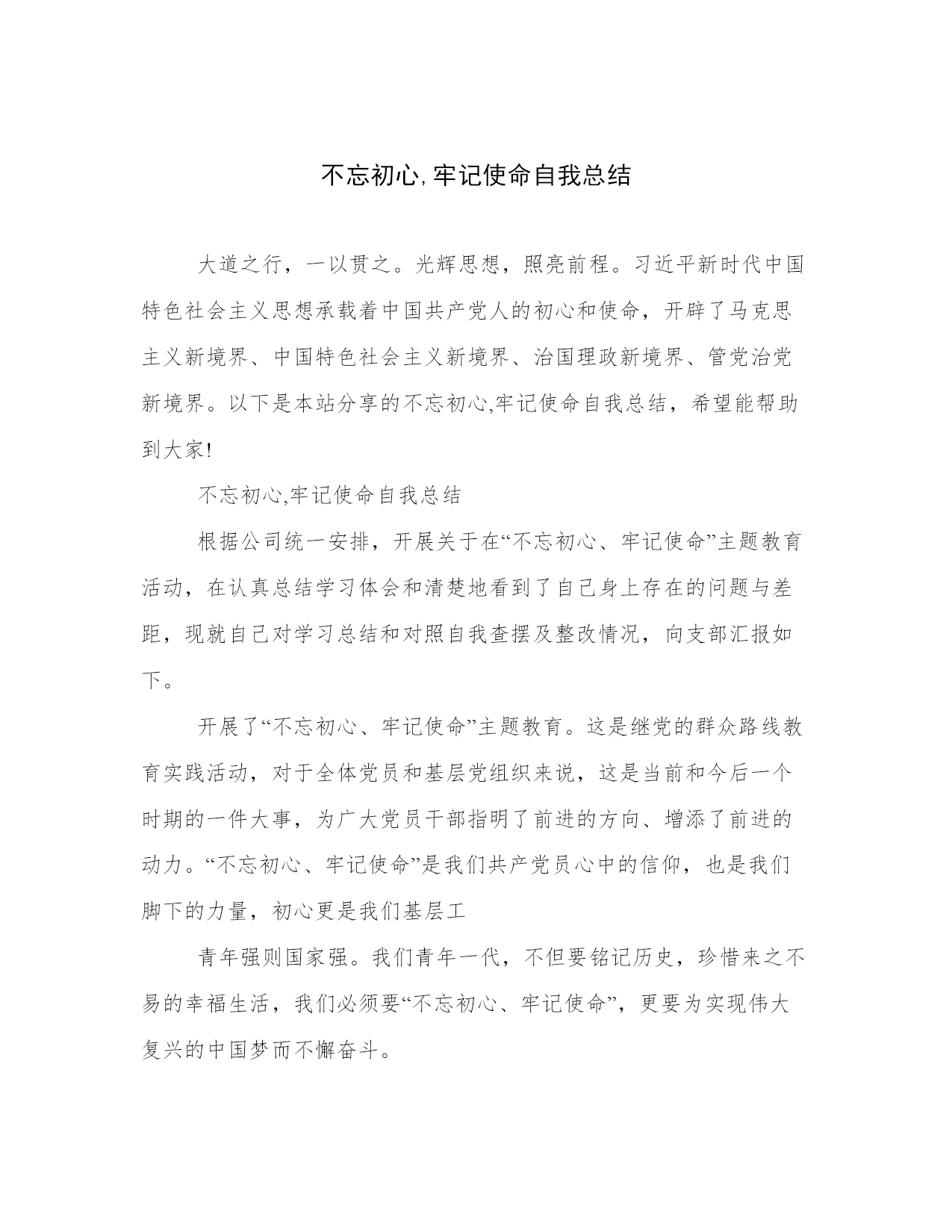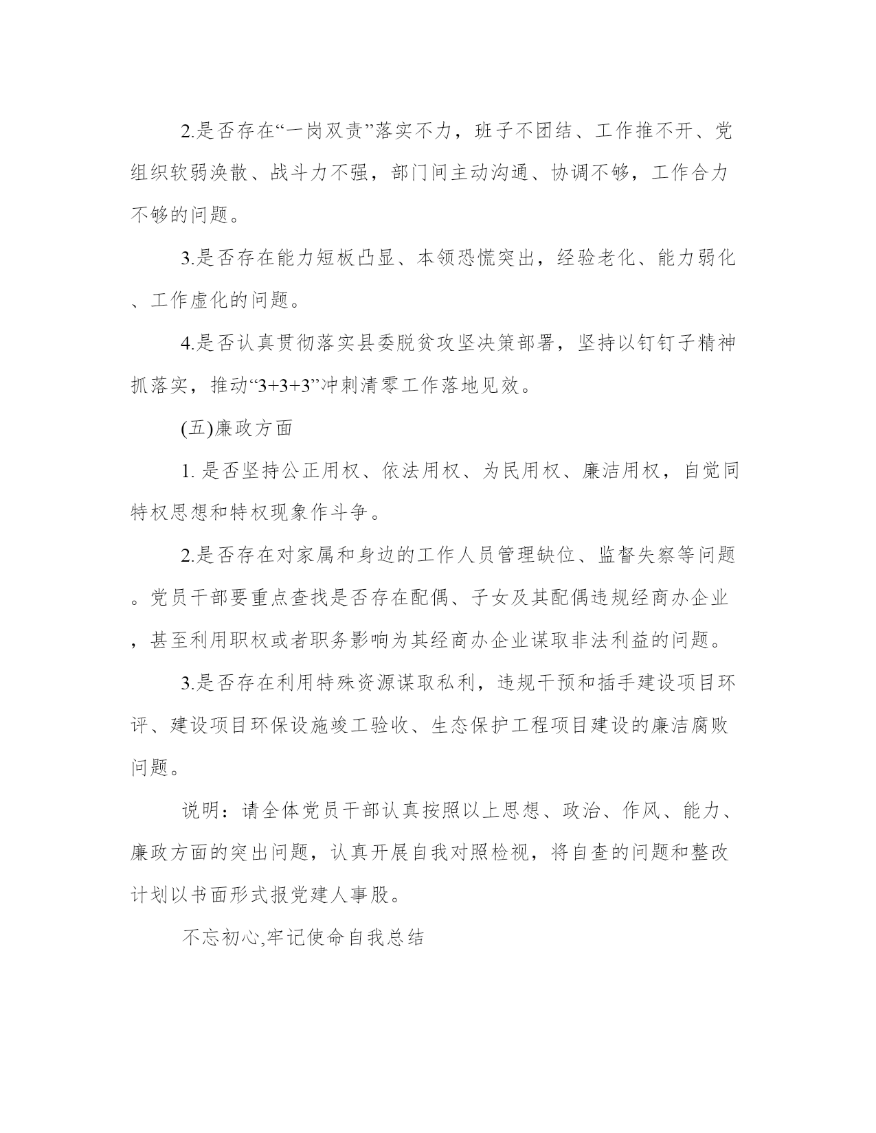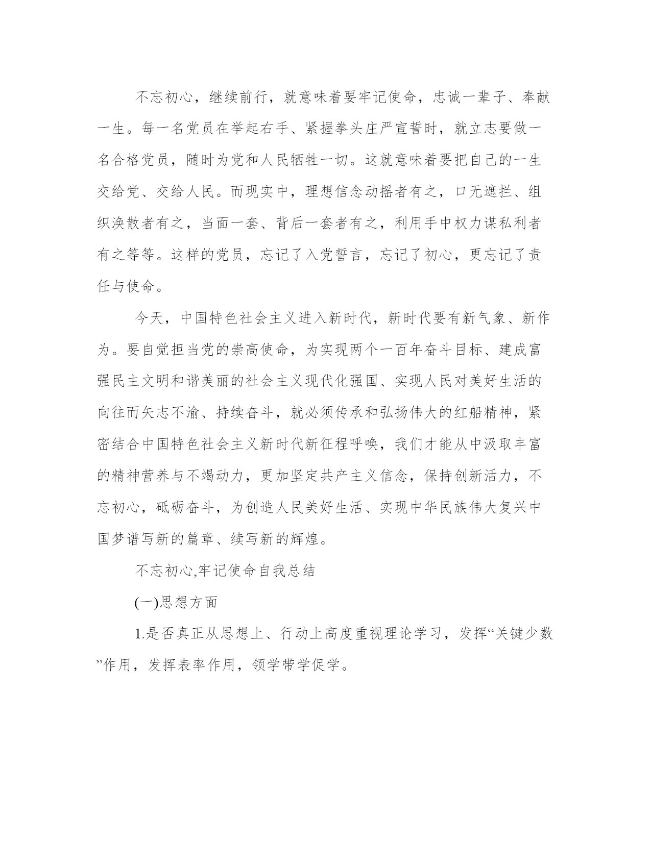 不忘初心,牢记使命自我总结大道之行,一以贯之。光辉思想,照亮前程。习近平新时代中国特色社会主义思想承载着中国共产党人的初心和使命,开辟了马克思主义新境界、中国特色社会主义新境界、治国理政新境界、管党治党新境界。以下是本站分享的不忘初心,牢记使命自我总结,希望能帮助到大家!不忘初心,牢记使命自我总结根据公司统一安排,开展关于在“不忘初心、牢记使命”主题教育活动,在认真总结学习体会和清楚地看到了自己身上存在的问题与差距,现就自己对学习总结和对照自我查摆及整改情况,向支部汇报如下。开展了“不忘初心、牢记使命”主题教育。这是继党的群众路线教育实践活动,对于全体党员和基层党组织来说,这是当前和今后一个时期的一件大事,为广大党员干部指明了前进的方向、增添了前进的动力。“不忘初心、牢记使命”是我们共产党员心中的信仰,也是我们脚下的力量,初心更是我们基层工青年强则国家强。我们青年一代,不但要铭记历史,珍惜来之不易的幸福生活,我们必须要“不忘初心、牢记使命”,更要为实现伟大复兴的中国梦而不懈奋斗。不忘初心,继续前行,就意味着要牢记使命,忠诚一辈子、奉献一生。每一名党员在举起右手、紧握拳头庄严宣誓时,就立志要做一名合格党员,随时为党和人民牺牲一切。这就意味着要把自己的一生交给党、交给人民。而现实中,理想信念动摇者有之,口无遮拦、组织涣散者有之,当面一套、背后一套者有之,利用手中权力谋私利者有之等等。这样的党员,忘记了入党誓言,忘记了初心,更忘记了责任与使命。今天,中国特色社会主义进入新时代,新时代要有新气象、新作为。要自觉担当党的崇高使命,为实现两个一百年奋斗目标、建成富强民主文明和谐美丽的社会主义现代化强国、实现人民对美好生活的向往而矢志不渝、持续奋斗,就必须传承和弘扬伟大的红船精神,紧密结合中国特色社会主义新时代新征程呼唤,我们才能从中汲取丰富的精神营养与不竭动力,更加坚定共产主义信念,保持创新活力,不忘初心,砥砺奋斗,为创造人民美好生活、实现中华民族伟大复兴中国梦谱写新的篇章、续写新的辉煌。不忘初心,牢记使命自我总结(一)思想方面1.是否真正从思想上、行动上高度重视理论学习,发挥“关键少数”作用,发挥表率作用,领学带学促学。2.是否存在学习责任感不强、紧迫感不强、主动性不强、系统性不强、实践性不强等问题。是否存在学而不实、学而不思、学用脱节等问题。3.是否真正做到学懂弄通做实,坚持用党的创新理论成果武装头脑、指导实践、推动工作,在学思用贯通、知信行统一中推动学习走深、走心、走实。(二)政治方面1.是否牢固树立“四个意识”,坚定“四个自信”,坚决做到“两个维护”,坚决拥护习近平总书记的核心地位,坚决维护党中央权威和集中统一领导,坚决贯彻落实习近平总书记重要指示批示和党中央决策部署。是否存在对贯彻落实习近平新时代中国特色社会主义思想和中央、省委、州委、县委决策部署阳奉阴违、敷衍推诿的问题。2.是否对党忠诚,信仰坚定,时刻保持斗争精神,在重大政治原则和大是大非面前立场坚定,对各种错误言论行动保持高度的政治警惕和政治敏锐,旗帜鲜明敢于斗争,不搞“低级红”“高级黑”,不当“两面人”“老好人”。3.是否严守党章党规党纪,严格遵守党内民主集中制,做到“五个必须”、严防“七个有之”,不搞个人主义、分散主义、自由主义、本位主义、好人主义等。4.是否时刻保持党员本色、入党初心,有没有信仰缺失、思想滑坡、能力蜕化。是否自觉接受党内政治生活洗礼淬炼,自觉参加组织生活,经常性开展批评和自我批评,常怀忧党之心为党之责强党之志。(三)作风方面1.是否存在贯彻执行中央八项规定精神,遵守环保系统“六项禁令”,执行环境监察“六不准”要求不到位的问题。2.是否存在层层加重基层负担,督查检查考核过多过频,表态多调门高、行动少落实差,“走过场”“做虚功”等形式主义、官僚主义问题。3.是否存在与群众感情淡化、为群众服务意识弱化、群众观念退化的问题,是否存在“门难进、脸难看、事难办”问题,对基层职工、群众反映的问题诉求忽视漠视,协调沟通解决不及时不主动。4.是否存在不严格遵守管理制度规定,违反工作纪律和劳动纪律的问题。如纪律规矩意识不强、执行考勤规定不严等作风慵懒散问题。(四)能力方面1.是否认真贯彻落实习近平总书记视察甘肃重要讲话精神,主动对标中央、省委、州委、县委决策部署,坚持高标准、严要求,科学谋划,抓好顶层设计和全面工作,稳步推动生态环境保护工作高质量发展。2.是否存在“一岗双责”落实不力,班子不团结、工作推不开、党组织软弱涣散、战斗力不强,部门间主动沟通、协调不够,工作合力不够的问题。3.是否存在能力短板凸显、本领恐慌突出,经验老化、能力弱化、工作虚化的问题。4.是否认真贯彻落实县委脱贫攻坚决策部署,坚持以钉钉子精神抓落实,推动“3+3+3”冲刺清零工作落地见效。(五)廉政方