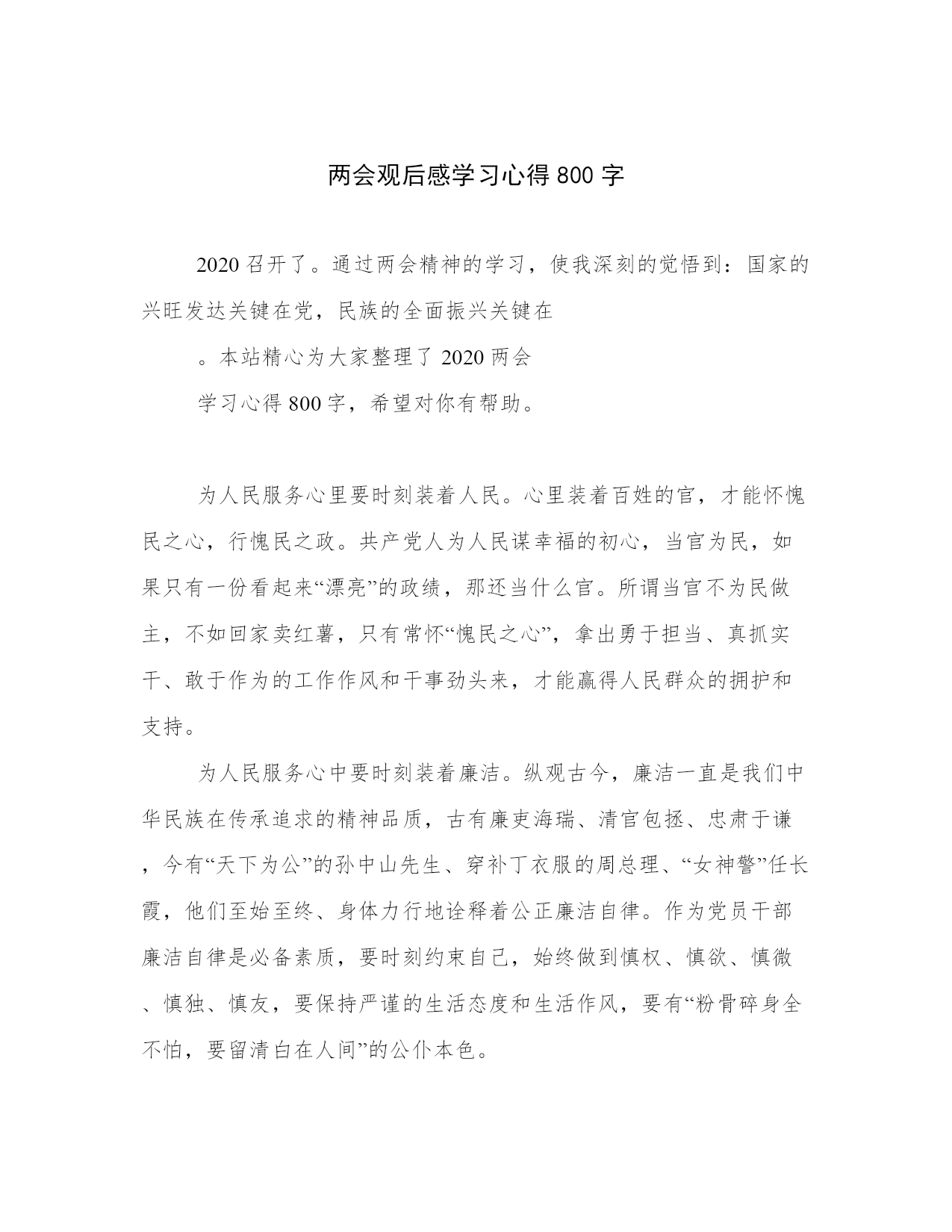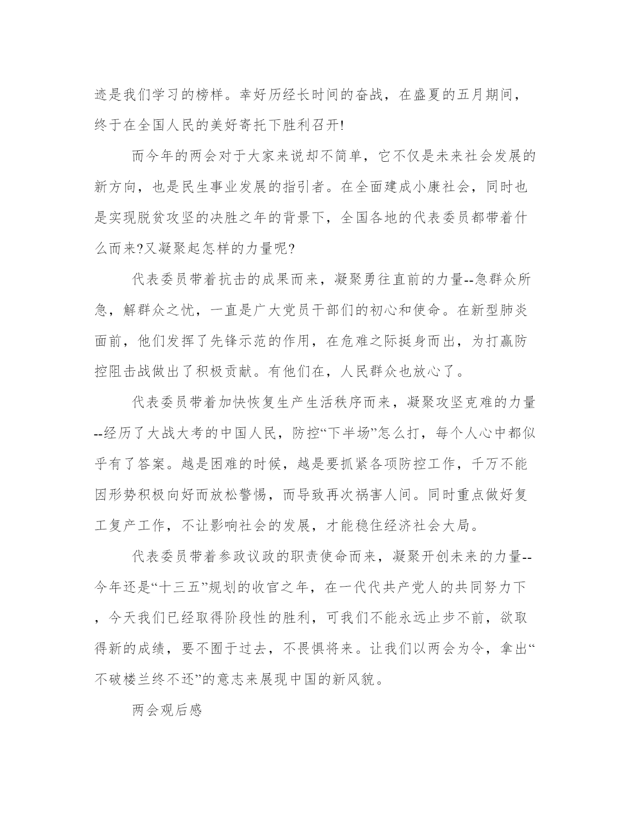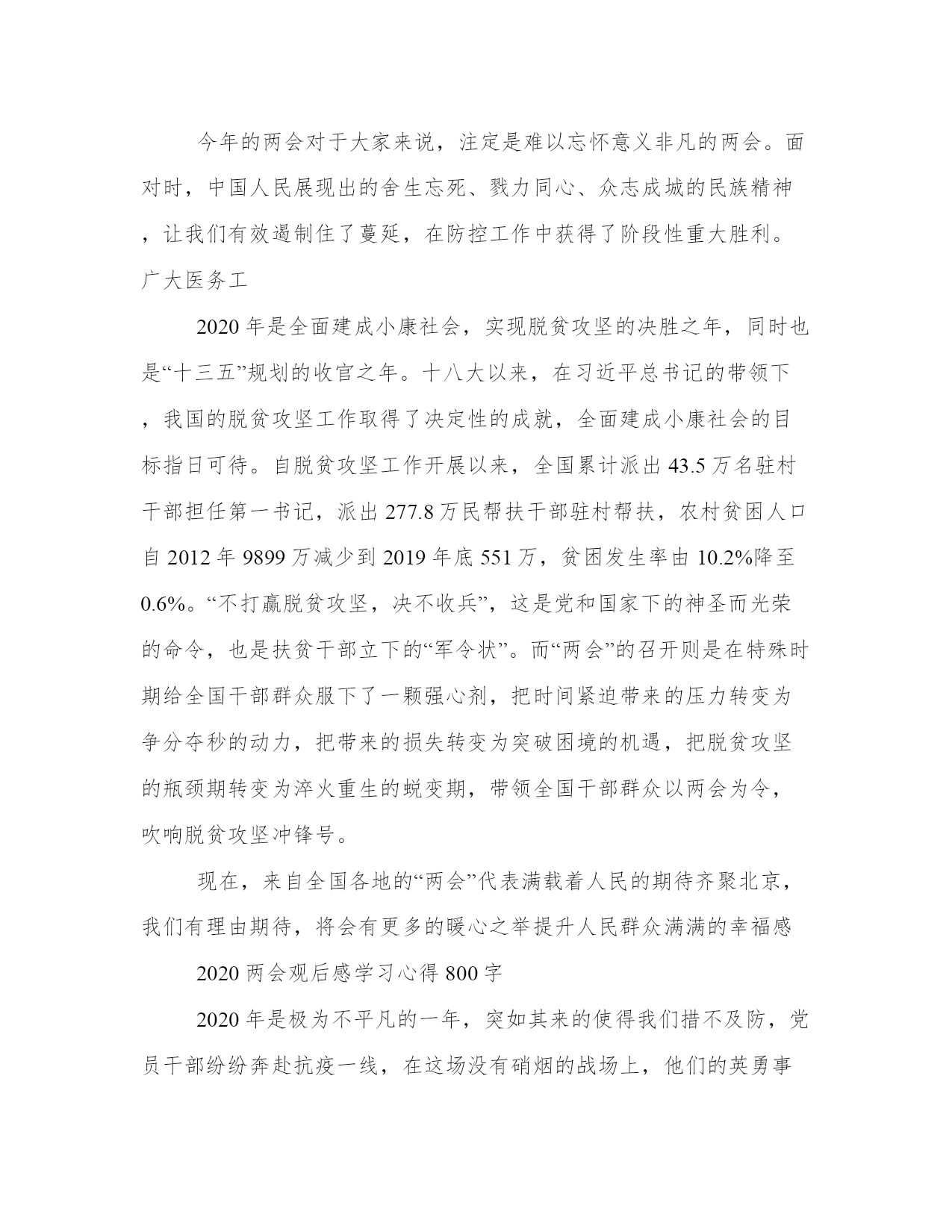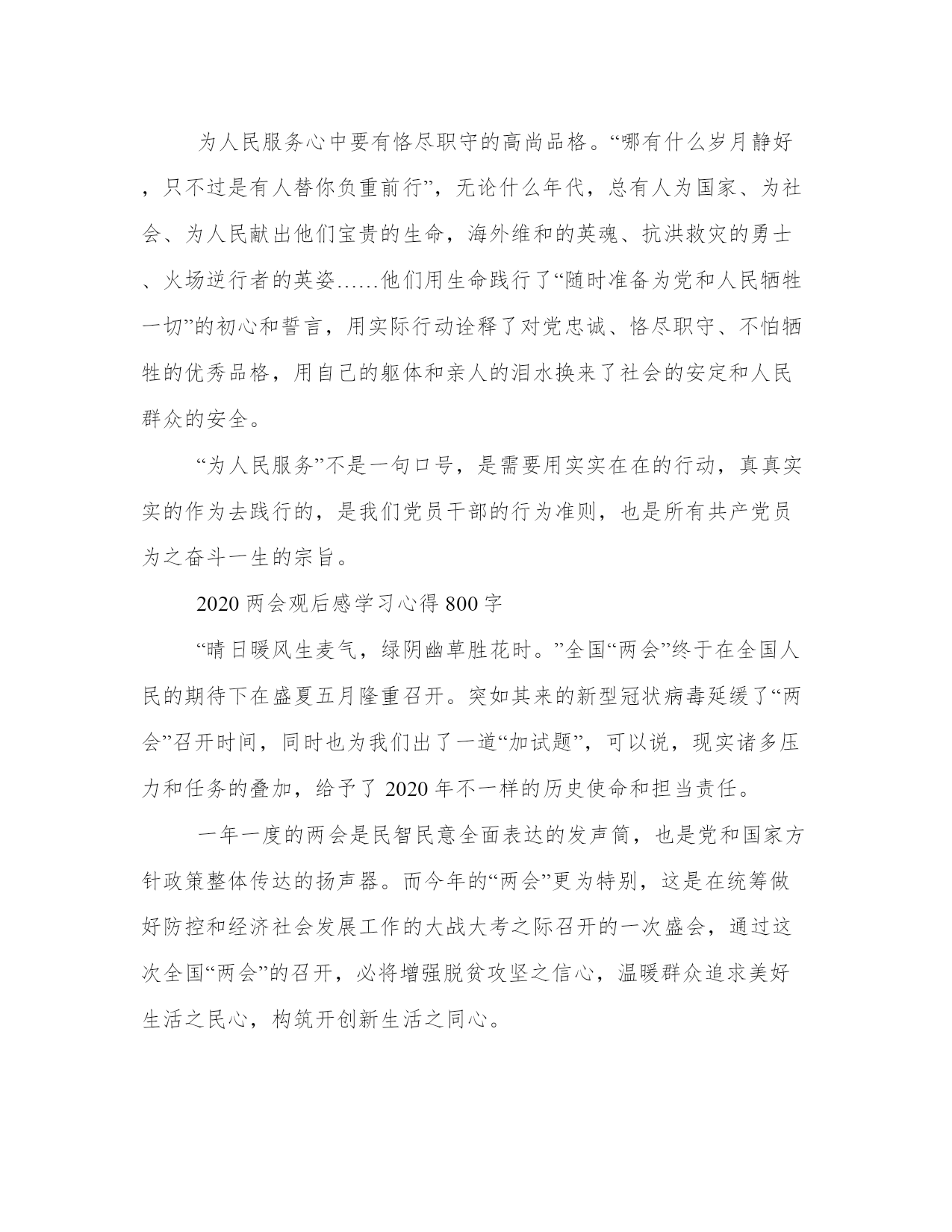 两会观后感学习心得800字2020召开了。通过两会精神的学习,使我深刻的觉悟到:国家的兴旺发达关键在党,民族的全面振兴关键在。本站精心为大家整理了2020两会学习心得800字,希望对你有帮助。为人民服务心里要时刻装着人民。心里装着百姓的官,才能怀愧民之心,行愧民之政。共产党人为人民谋幸福的初心,当官为民,如果只有一份看起来“漂亮”的政绩,那还当什么官。所谓当官不为民做主,不如回家卖红薯,只有常怀“愧民之心”,拿出勇于担当、真抓实干、敢于作为的工作作风和干事劲头来,才能赢得人民群众的拥护和支持。为人民服务心中要时刻装着廉洁。纵观古今,廉洁一直是我们中华民族在传承追求的精神品质,古有廉吏海瑞、清官包拯、忠肃于谦,今有“天下为公”的孙中山先生、穿补丁衣服的周总理、“女神警”任长霞,他们至始至终、身体力行地诠释着公正廉洁自律。作为党员干部廉洁自律是必备素质,要时刻约束自己,始终做到慎权、慎欲、慎微、慎独、慎友,要保持严谨的生活态度和生活作风,要有“粉骨碎身全不怕,要留清白在人间”的公仆本色。为人民服务心中要有恪尽职守的高尚品格。“哪有什么岁月静好,只不过是有人替你负重前行”,无论什么年代,总有人为国家、为社会、为人民献出他们宝贵的生命,海外维和的英魂、抗洪救灾的勇士、火场逆行者的英姿……他们用生命践行了“随时准备为党和人民牺牲一切”的初心和誓言,用实际行动诠释了对党忠诚、恪尽职守、不怕牺牲的优秀品格,用自己的躯体和亲人的泪水换来了社会的安定和人民群众的安全。“为人民服务”不是一句口号,是需要用实实在在的行动,真真实实的作为去践行的,是我们党员干部的行为准则,也是所有共产党员为之奋斗一生的宗旨。2020两会观后感学习心得800字“晴日暖风生麦气,绿阴幽草胜花时。”全国“两会”终于在全国人民的期待下在盛夏五月隆重召开。突如其来的新型冠状病毒延缓了“两会”召开时间,同时也为我们出了一道“加试题”,可以说,现实诸多压力和任务的叠加,给予了2020年不一样的历史使命和担当责任。一年一度的两会是民智民意全面表达的发声筒,也是党和国家方针政策整体传达的扬声器。而今年的“两会”更为特别,这是在统筹做好防控和经济社会发展工作的大战大考之际召开的一次盛会,通过这次全国“两会”的召开,必将增强脱贫攻坚之信心,温暖群众追求美好生活之民心,构筑开创新生活之同心。今年的两会对于大家来说,注定是难以忘怀意义非凡的两会。面对时,中国人民展现出的舍生忘死、戮力同心、众志成城的民族精神,让我们有效遏制住了蔓延,在防控工作中获得了阶段性重大胜利。广大医务工2020年是全面建成小康社会,实现脱贫攻坚的决胜之年,同时也是“十三五”规划的收官之年。十八大以来,在习近平总书记的带领下,我国的脱贫攻坚工作取得了决定性的成就,全面建成小康社会的目标指日可待。自脱贫攻坚工作开展以来,全国累计派出43.5万名驻村干部担任第一书记,派出277.8万民帮扶干部驻村帮扶,农村贫困人口自2012年9899万减少到2019年底551万,贫困发生率由10.2%降至0.6%。“不打赢脱贫攻坚,决不收兵”,这是党和国家下的神圣而光荣的命令,也是扶贫干部立下的“军令状”。而“两会”的召开则是在特殊时期给全国干部群众服下了一颗强心剂,把时间紧迫带来的压力转变为争分夺秒的动力,把带来的损失转变为突破困境的机遇,把脱贫攻坚的瓶颈期转变为淬火重生的蜕变期,带领全国干部群众以两会为令,吹响脱贫攻坚冲锋号。现在,来自全国各地的“两会”代表满载着人民的期待齐聚北京,我们有理由期待,将会有更多的暖心之举提升人民群众满满的幸福感2020两会观后感学习心得800字2020年是极为不平凡的一年,突如其来的使得我们措不及防,党员干部纷纷奔赴抗疫一线,在这场没有硝烟的战场上,他们的英勇事迹是我们学习的榜样。幸好历经长时间的奋战,在盛夏的五月期间,终于在全国人民的美好寄托下胜利召开!而今年的两会对于大家来说却不简单,它不仅是未来社会发展的新方向,也是民生事业发展的指引者。在全面建成小康社会,同时也是实现脱贫攻坚的决胜之年的背景下,全国各地的代表委员都带着什么而来?又凝聚起怎样的力量呢?代表委员带着抗击的成果而来,凝聚勇往直前的力量--急群众所急,解群众之忧,一直是广大党员干部们的初心和使命。在新型肺炎面前,他们发挥了先锋示范的作用,在危难之际挺身而出,为打赢防控阻击战做出了积极贡献。有他们在,人民群众也放心了。代表委员带着加快恢复生产生活秩序而来,凝聚攻坚克难的力量--经历了大战大考的中国人民,防控“下半场”怎么打,每个人心中都似乎有了答案。越是困难的时候,越是要抓紧各项防控工作,千万不能因形势积极向好而放松警惕,而导致再次祸害人间。同时重点做好复工复产工作,不让影响社会的发展,才能稳住经济社会大局。代表委员带着参政议政的职责使命而