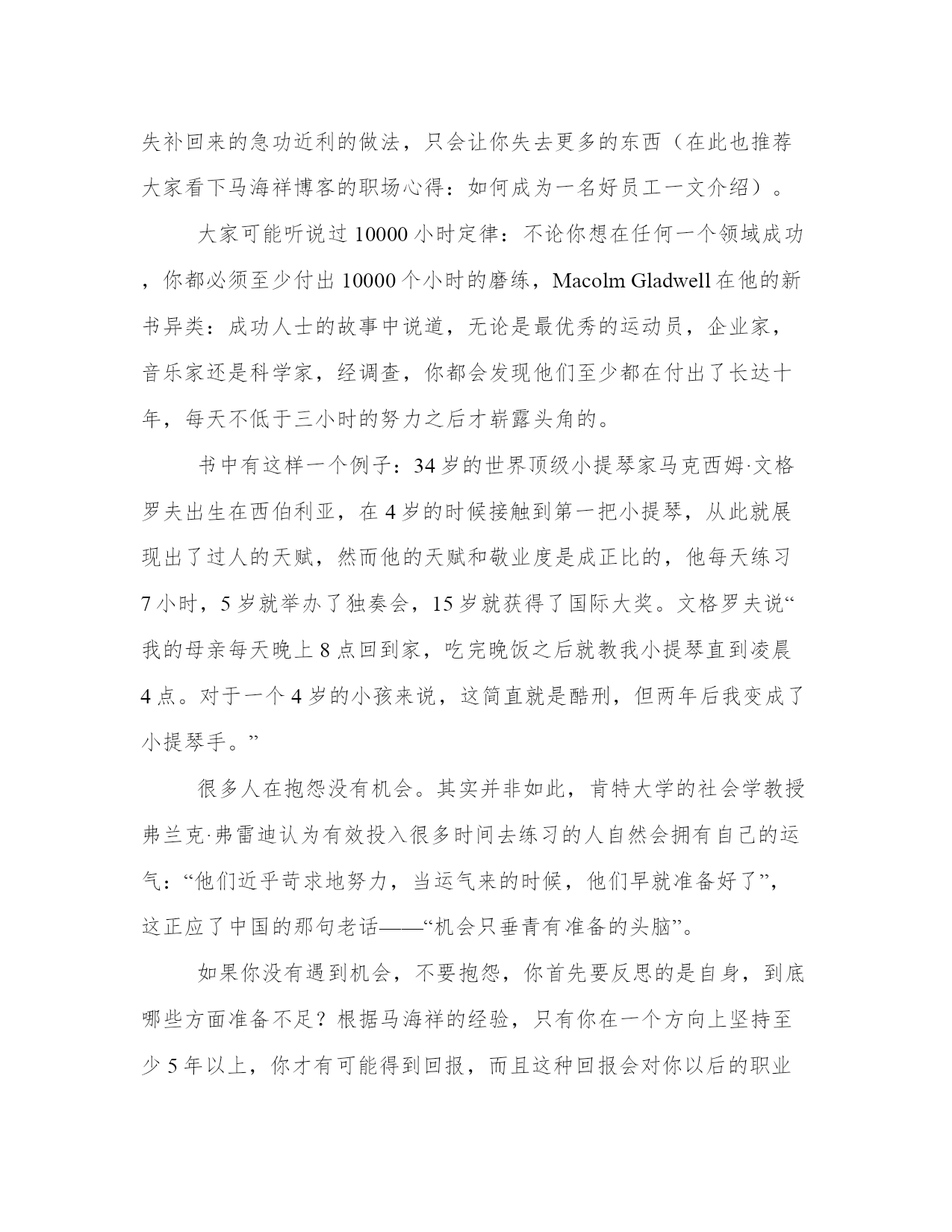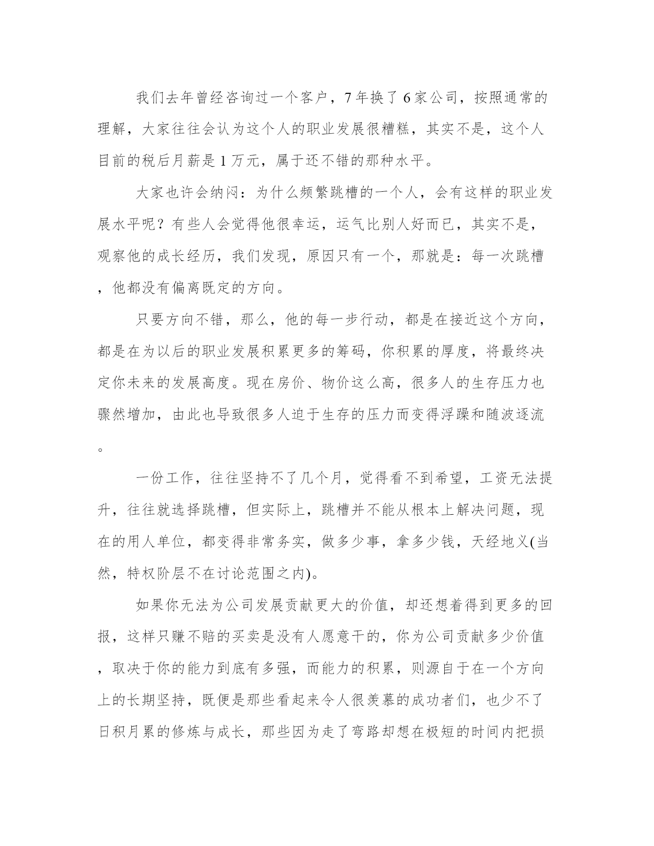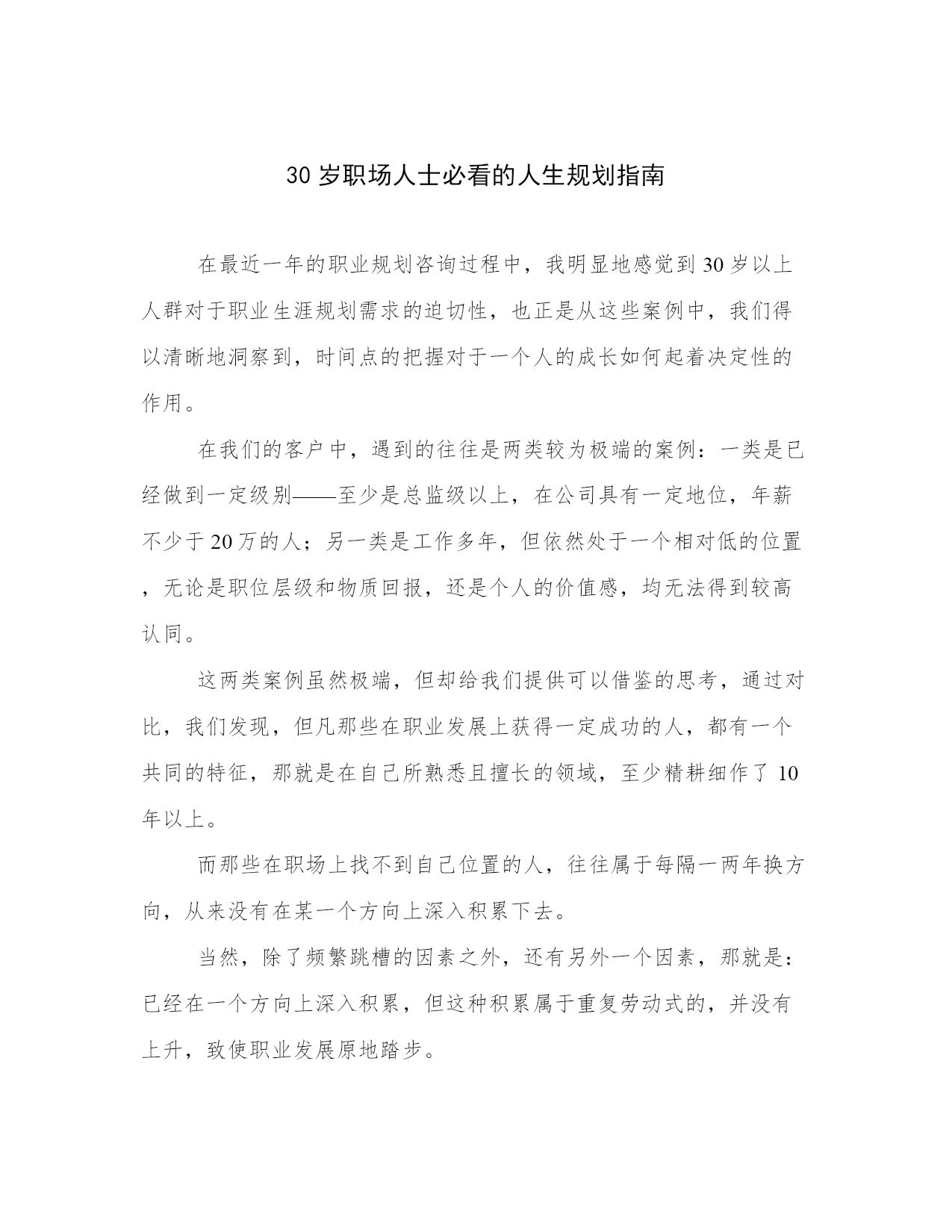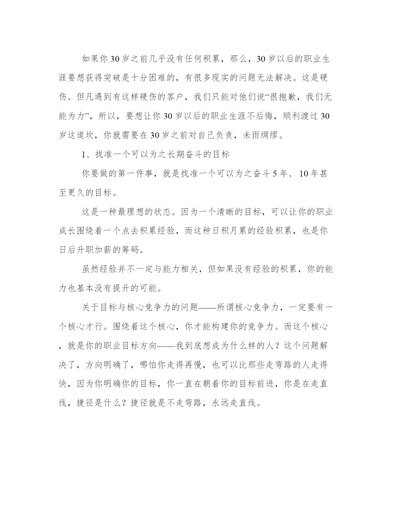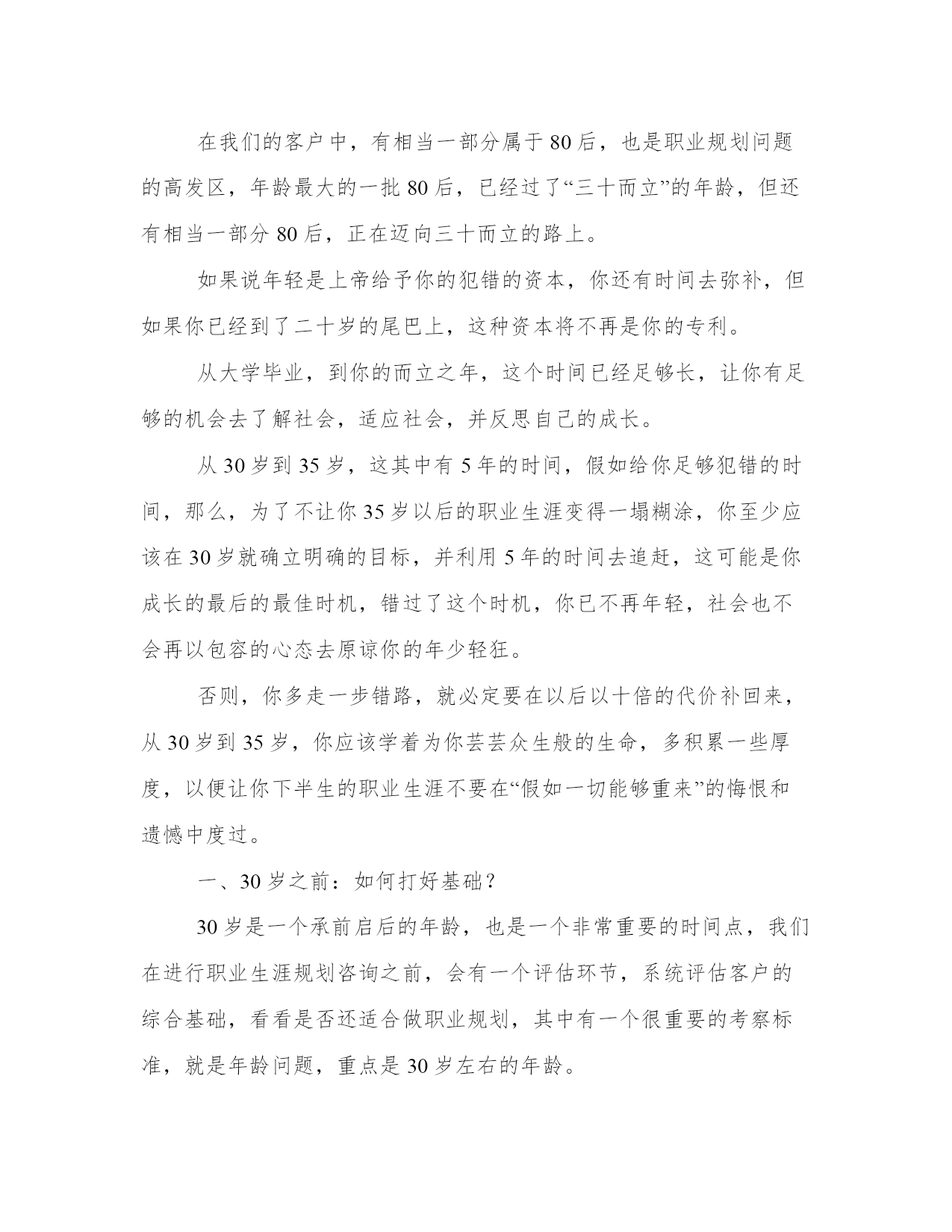 30岁职场人士必看的人生规划指南在最近一年的职业规划咨询过程中,我明显地感觉到30岁以上人群对于职业生涯规划需求的迫切性,也正是从这些案例中,我们得以清晰地洞察到,时间点的把握对于一个人的成长如何起着决定性的作用。在我们的客户中,遇到的往往是两类较为极端的案例:一类是已经做到一定级别——至少是总监级以上,在公司具有一定地位,年薪不少于20万的人;另一类是工作多年,但依然处于一个相对低的位置,无论是职位层级和物质回报,还是个人的价值感,均无法得到较高认同。这两类案例虽然极端,但却给我们提供可以借鉴的思考,通过对比,我们发现,但凡那些在职业发展上获得一定成功的人,都有一个共同的特征,那就是在自己所熟悉且擅长的领域,至少精耕细作了10年以上。而那些在职场上找不到自己位置的人,往往属于每隔一两年换方向,从来没有在某一个方向上深入积累下去。当然,除了频繁跳槽的因素之外,还有另外一个因素,那就是:已经在一个方向上深入积累,但这种积累属于重复劳动式的,并没有上升,致使职业发展原地踏步。在我们的客户中,有相当一部分属于80后,也是职业规划问题的高发区,年龄最大的一批80后,已经过了“三十而立”的年龄,但还有相当一部分80后,正在迈向三十而立的路上。如果说年轻是上帝给予你的犯错的资本,你还有时间去弥补,但如果你已经到了二十岁的尾巴上,这种资本将不再是你的专利。从大学毕业,到你的而立之年,这个时间已经足够长,让你有足够的机会去了解社会,适应社会,并反思自己的成长。从30岁到35岁,这其中有5年的时间,假如给你足够犯错的时间,那么,为了不让你35岁以后的职业生涯变得一塌糊涂,你至少应该在30岁就确立明确的目标,并利用5年的时间去追赶,这可能是你成长的最后的最佳时机,错过了这个时机,你已不再年轻,社会也不会再以包容的心态去原谅你的年少轻狂。否则,你多走一步错路,就必定要在以后以十倍的代价补回来,从30岁到35岁,你应该学着为你芸芸众生般的生命,多积累一些厚度,以便让你下半生的职业生涯不要在“假如一切能够重来”的悔恨和遗憾中度过。一、30岁之前:如何打好基础?30岁是一个承前启后的年龄,也是一个非常重要的时间点,我们在进行职业生涯规划咨询之前,会有一个评估环节,系统评估客户的综合基础,看看是否还适合做职业规划,其中有一个很重要的考察标准,就是年龄问题,重点是30岁左右的年龄。如果你30岁之前几乎没有任何积累,那么,30岁以后的职业生涯要想获得突破是十分困难的,有很多现实的问题无法解决。这是硬伤。但凡遇到有这样硬伤的客户,我们只能对他们说“很抱歉,我们无能为力”,所以,要想让你30岁以后的职业生涯不后悔,顺利渡过30岁这道坎,你就需要在30岁之前对自己负责,未雨绸缪。1、找准一个可以为之长期奋斗的目标你要做的第一件事,就是找准一个可以为之奋斗5年、10年甚至更久的目标。这是一种最理想的状态。因为一个清晰的目标,可以让你的职业成长围绕着一个点去积累经验,而这种日积月累的经验积累,也是你日后升职加薪的筹码。虽然经验并不一定与能力相关,但如果没有经验的积累,你的能力也基本没有提升的可能。关于目标与核心竞争力的问题——所谓核心竞争力,一定要有一个核心才行。围绕着这个核心,你才能构建你的竞争力。而这个核心,就是你的职业目标方向——我到底想成为什么样的人?这个问题解决了,方向明确了,哪怕你走得再慢,也可以比那些走弯路的人走得快,因为你明确你的目标,你一直在朝着你的目标前进,你是在走直线,捷径是什么?捷径就是不走弯路,永远走直线。我们去年曾经咨询过一个客户,7年换了6家公司,按照通常的理解,大家往往会认为这个人的职业发展很糟糕,其实不是,这个人目前的税后月薪是1万元,属于还不错的那种水平。大家也许会纳闷:为什么频繁跳槽的一个人,会有这样的职业发展水平呢?有些人会觉得他很幸运,运气比别人好而已,其实不是,观察他的成长经历,我们发现,原因只有一个,那就是:每一次跳槽,他都没有偏离既定的方向。只要方向不错,那么,他的每一步行动,都是在接近这个方向,都是在为以后的职业发展积累更多的筹码,你积累的厚度,将最终决定你未来的发展高度。现在房价、物价这么高,很多人的生存压力也骤然增加,由此也导致很多人迫于生存的压力而变得浮躁和随波逐流。一份工作,往往坚持不了几个月,觉得看不到希望,工资无法提升,往往就选择跳槽,但实际上,跳槽并不能从根本上解决问题,现在的用人单位,都变得非常务实,做多少事,拿多少钱,天经地义(当然,特权阶层不在讨论范围之内)。如果你无法为公司发展贡献更大的价值,却还想着得到更多的回报,这样只赚不赔的买卖是没有人愿意干的,你为公司贡献多少价值,取决于你的能力到底有多强,而能力的积累,则源自于在一个方向上的长期坚持,既便是那些看起来令人很羡慕的成功者们,也少不了日积月累的