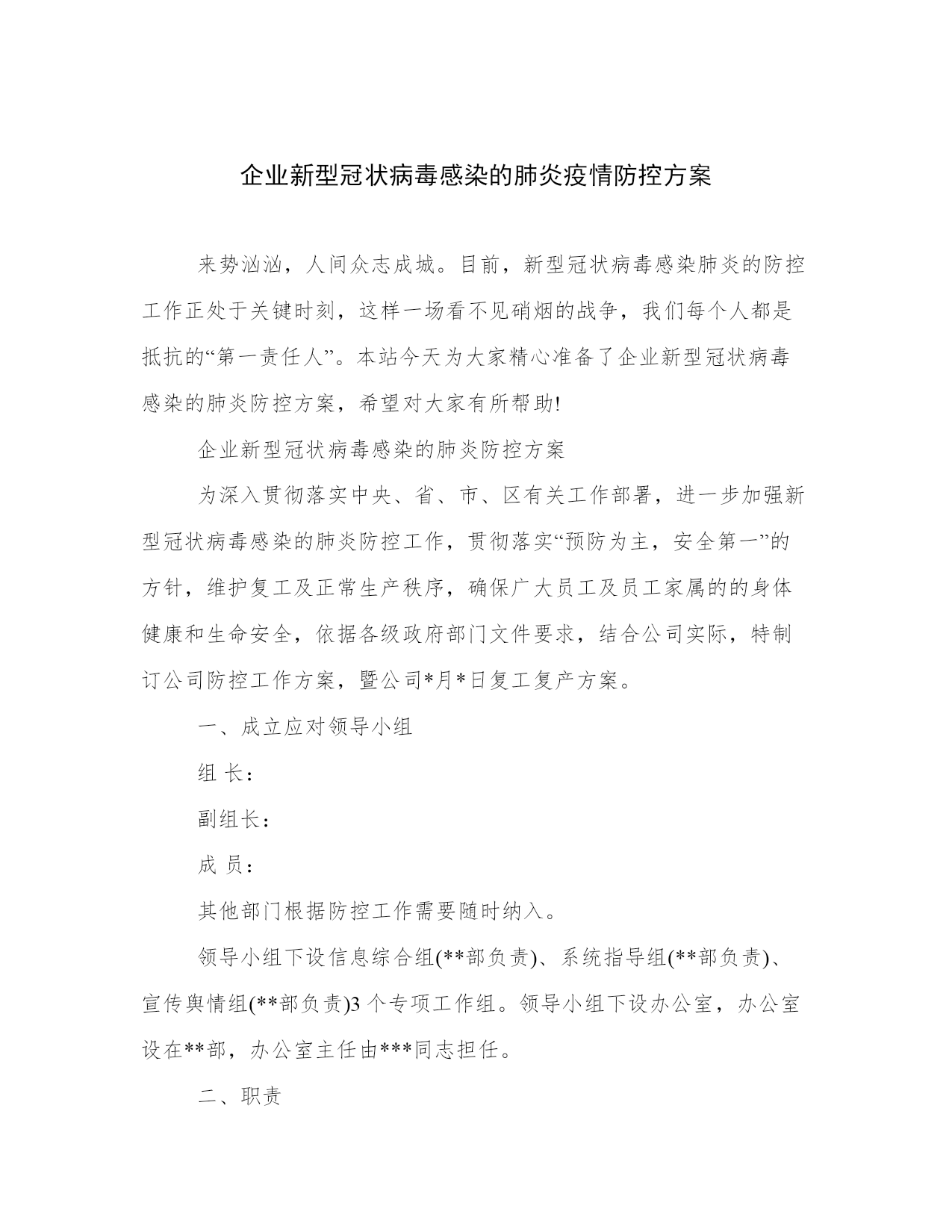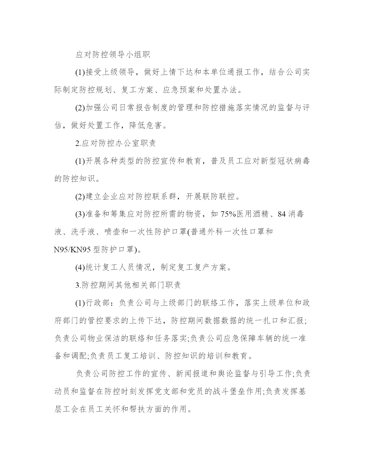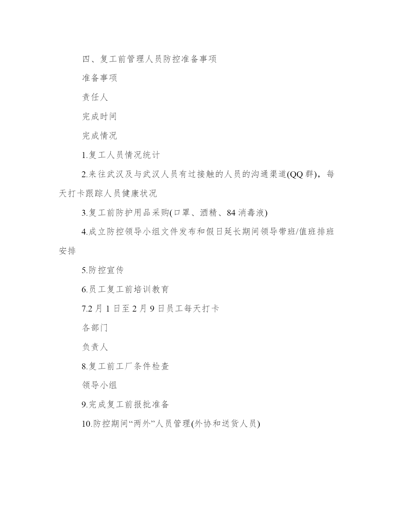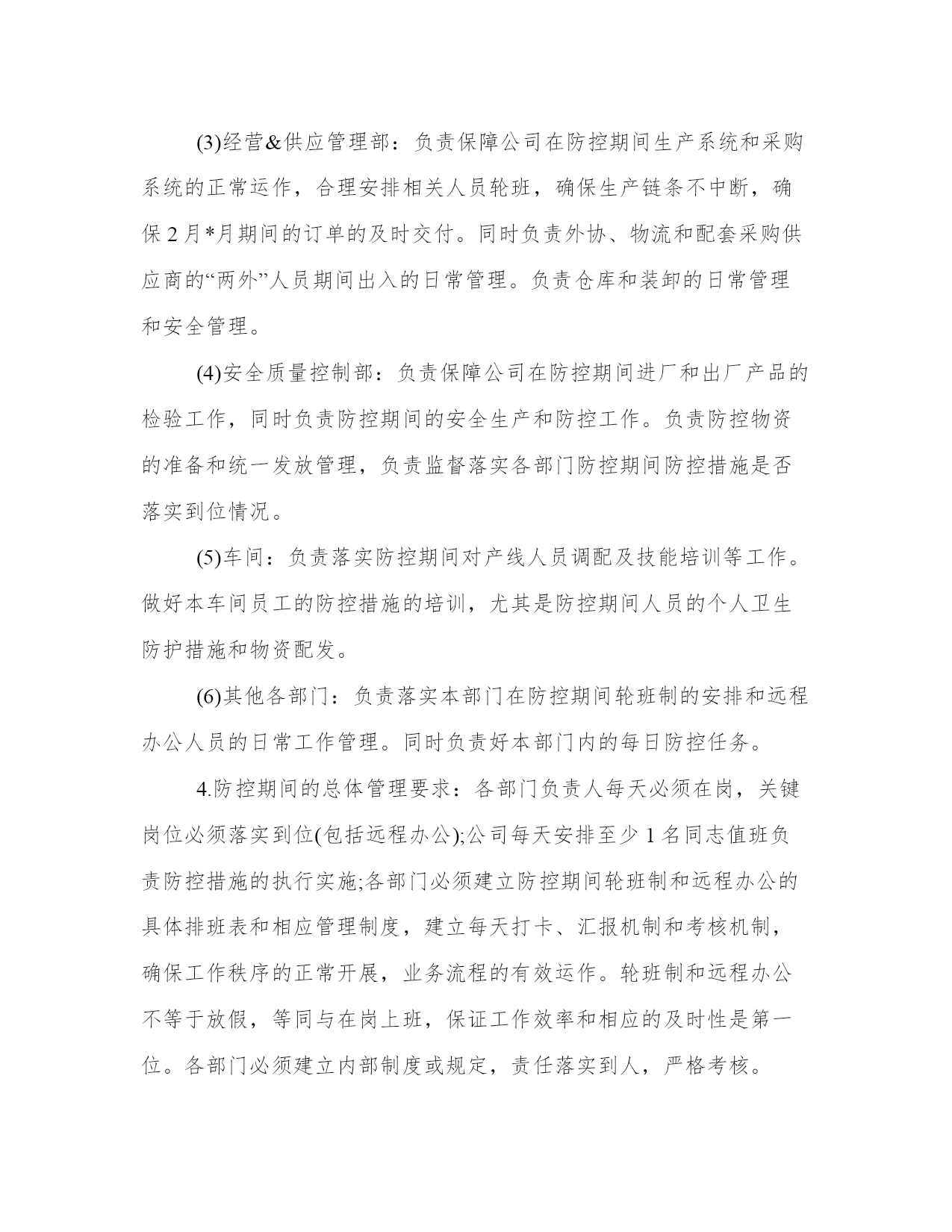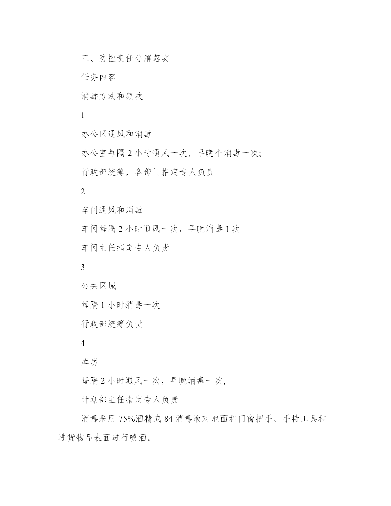 企业新型冠状病毒感染的肺炎疫情防控方案来势汹汹,人间众志成城。目前,新型冠状病毒感染肺炎的防控工作正处于关键时刻,这样一场看不见硝烟的战争,我们每个人都是抵抗的“第一责任人”。本站今天为大家精心准备了企业新型冠状病毒感染的肺炎防控方案,希望对大家有所帮助!企业新型冠状病毒感染的肺炎防控方案为深入贯彻落实中央、省、市、区有关工作部署,进一步加强新型冠状病毒感染的肺炎防控工作,贯彻落实“预防为主,安全第一”的方针,维护复工及正常生产秩序,确保广大员工及员工家属的的身体健康和生命安全,依据各级政府部门文件要求,结合公司实际,特制订公司防控工作方案,暨公司*月*日复工复产方案。一、成立应对领导小组组长:副组长:成员:其他部门根据防控工作需要随时纳入。领导小组下设信息综合组(**部负责)、系统指导组(**部负责)、宣传舆情组(**部负责)3个专项工作组。领导小组下设办公室,办公室设在**部,办公室主任由***同志担任。二、职责应对防控领导小组职(1)接受上级领导,做好上情下达和本单位通报工作,结合公司实际制定防控规划、复工方案、应急预案和处置办法。(2)加强公司日常报告制度的管理和防控措施落实情况的监督与评估,做好处置工作,降低危害。2.应对防控办公室职责(1)开展各种类型的防控宣传和教育,普及员工应对新型冠状病毒的防控知识。(2)建立企业应对防控联系群,开展联防联控。(3)准备和筹集应对防控所需的物资,如75%医用酒精、84消毒液、洗手液、喷壶和一次性防护口罩(普通外科一次性口罩和N95/KN95型防护口罩)。(4)统计复工人员情况,制定复工复产方案。3.防控期间其他相关部门职责(1)行政部:负责公司与上级部门的联络工作,落实上级单位和政府部门的管控要求的上传下达,防控期间数据数据的统一扎口和汇报;负责公司物业保洁的联络和任务落实;负责公司应急保障车辆的统一准备和调配;负责员工复工培训、防控知识的培训和教育。负责公司防控工作的宣传、新闻报道和舆论监督与引导工作;负责动员和监督在防控时刻发挥党支部和党员的战斗堡垒作用;负责发挥基层工会在员工关怀和帮扶方面的作用。(3)经营&供应管理部:负责保障公司在防控期间生产系统和采购系统的正常运作,合理安排相关人员轮班,确保生产链条不中断,确保2月*月期间的订单的及时交付。同时负责外协、物流和配套采购供应商的“两外”人员期间出入的日常管理。负责仓库和装卸的日常管理和安全管理。(4)安全质量控制部:负责保障公司在防控期间进厂和出厂产品的检验工作,同时负责防控期间的安全生产和防控工作。负责防控物资的准备和统一发放管理,负责监督落实各部门防控期间防控措施是否落实到位情况。(5)车间:负责落实防控期间对产线人员调配及技能培训等工作。做好本车间员工的防控措施的培训,尤其是防控期间人员的个人卫生防护措施和物资配发。(6)其他各部门:负责落实本部门在防控期间轮班制的安排和远程办公人员的日常工作管理。同时负责好本部门内的每日防控任务。4.防控期间的总体管理要求:各部门负责人每天必须在岗,关键岗位必须落实到位(包括远程办公);公司每天安排至少1名同志值班负责防控措施的执行实施;各部门必须建立防控期间轮班制和远程办公的具体排班表和相应管理制度,建立每天打卡、汇报机制和考核机制,确保工作秩序的正常开展,业务流程的有效运作。轮班制和远程办公不等于放假,等同与在岗上班,保证工作效率和相应的及时性是第一位。各部门必须建立内部制度或规定,责任落实到人,严格考核。三、防控责任分解落实任务内容消毒方法和频次1办公区通风和消毒办公室每隔2小时通风一次,早晚个消毒一次;行政部统筹,各部门指定专人负责2车间通风和消毒车间每隔2小时通风一次,早晚消毒1次车间主任指定专人负责3公共区域每隔1小时消毒一次行政部统筹负责4库房每隔2小时通风一次,早晚消毒一次;计划部主任指定专人负责消毒采用75%酒精或84消毒液对地面和门窗把手、手持工具和进货物品表面进行喷洒。四、复工前管理人员防控准备事项准备事项责任人完成时间完成情况1.复工人员情况统计2.来往武汉及与武汉人员有过接触的人员的沟通渠道(QQ群),每天打卡跟踪人员健康状况3.复工前防护用品采购(口罩、酒精、84消毒液)4.成立防控领导小组文件发布和假日延长期间领导带班/值班排班安排5.防控宣传6.员工复工前培训教育7.2月1日至2月9日员工每天打卡各部门负责人8.复工前工厂条件检查领导小组9.完成复工前报批准备10.防控期间“两外”人员管理(外协和送货人员)11.来访人员管理,进出门岗严格执行测体温和登记制,对于来自武汉地区的重点关注谁接待谁负责五、复工复产前的防疫准备1.广泛开展防范新型冠状病毒肺炎的宣传,发放预防手册。2.准备口罩,应急订购的***只三层无纺布防尘口罩到位。确保可以应对2月~4