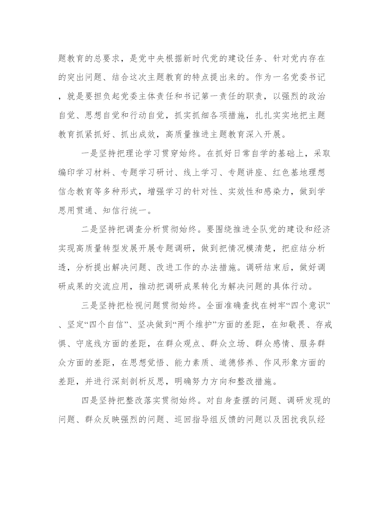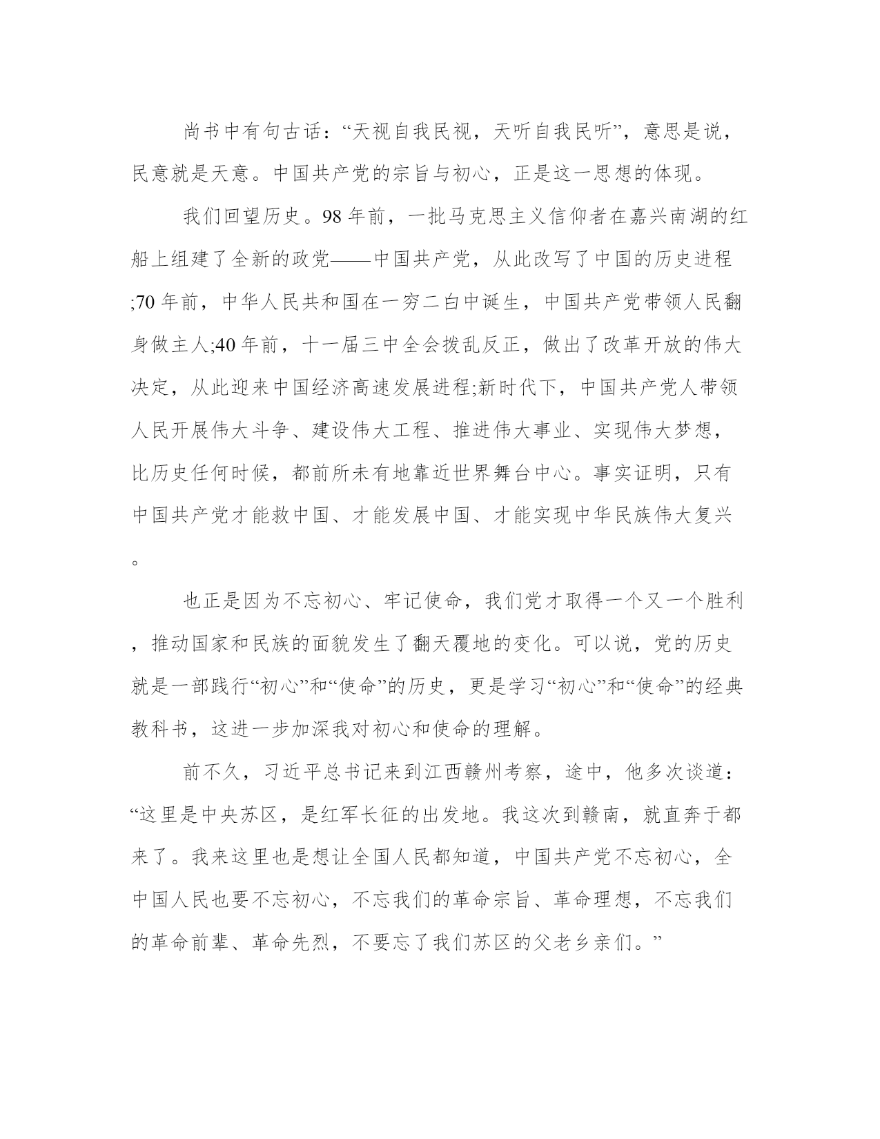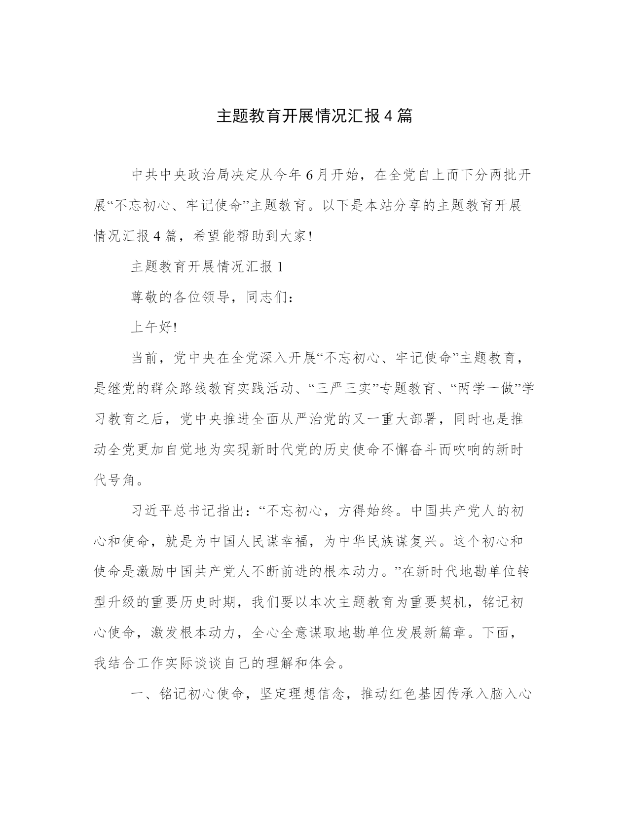主题教育开展情况汇报4篇中共中央政治局决定从今年6月开始,在全党自上而下分两批开展“不忘初心、牢记使命”主题教育。以下是本站分享的主题教育开展情况汇报4篇,希望能帮助到大家!主题教育开展情况汇报1尊敬的各位领导,同志们:上午好!当前,党中央在全党深入开展“不忘初心、牢记使命”主题教育,是继党的群众路线教育实践活动、“三严三实”专题教育、“两学一做”学习教育之后,党中央推进全面从严治党的又一重大部署,同时也是推动全党更加自觉地为实现新时代党的历史使命不懈奋斗而吹响的新时代号角。习近平总书记指出:“不忘初心,方得始终。中国共产党人的初心和使命,就是为中国人民谋幸福,为中华民族谋复兴。这个初心和使命是激励中国共产党人不断前进的根本动力。”在新时代地勘单位转型升级的重要历史时期,我们要以本次主题教育为重要契机,铭记初心使命,激发根本动力,全心全意谋取地勘单位发展新篇章。下面,我结合工作实际谈谈自己的理解和体会。一、铭记初心使命,坚定理想信念,推动红色基因传承入脑入心尚书中有句古话:“天视自我民视,天听自我民听”,意思是说,民意就是天意。中国共产党的宗旨与初心,正是这一思想的体现。我们回望历史。98年前,一批马克思主义信仰者在嘉兴南湖的红船上组建了全新的政党——中国共产党,从此改写了中国的历史进程;70年前,中华人民共和国在一穷二白中诞生,中国共产党带领人民翻身做主人;40年前,十一届三中全会拨乱反正,做出了改革开放的伟大决定,从此迎来中国经济高速发展进程;新时代下,中国共产党人带领人民开展伟大斗争、建设伟大工程、推进伟大事业、实现伟大梦想,比历史任何时候,都前所未有地靠近世界舞台中心。事实证明,只有中国共产党才能救中国、才能发展中国、才能实现中华民族伟大复兴。也正是因为不忘初心、牢记使命,我们党才取得一个又一个胜利,推动国家和民族的面貌发生了翻天覆地的变化。可以说,党的历史就是一部践行“初心”和“使命”的历史,更是学习“初心”和“使命”的经典教科书,这进一步加深我对初心和使命的理解。前不久,习近平总书记来到江西赣州考察,途中,他多次谈道:“这里是中央苏区,是红军长征的出发地。我这次到赣南,就直奔于都来了。我来这里也是想让全国人民都知道,中国共产党不忘初心,全中国人民也要不忘初心,不忘我们的革命宗旨、革命理想,不忘我们的革命前辈、革命先烈,不要忘了我们苏区的父老乡亲们。”为什么革命时期的赣南人民如此爱戴共产党的军队,仅仅兴国县,23万人中就有8万人参加红军?我认为,原因在于中国共产党为人民利益而奋斗,得到人民拥护,这是中国共产党胜利的决定性因素。我队在鹰潭贵溪市挂点了8户贫困户,每当我前往贫困户家中慰问时,他们在临别时说得最多的话就是“感谢共产党!”这是没有任何彩排预演、完全发自肺腑的话,这也是当今最广大的人民群众对中国共产党拥护与信任的直观体现。我出生在赣南这片红色的土地上,是一名有着34年党龄的党员,受党教育多年。我深深地感受到,在新中国成立70周年即将到来之际,习近平总书记此次革命圣地的红色之行意义深邃。习总书记的“红色足迹”,正是“不忘初心,牢记使命”的真实写照,正是对红色基因传承的不朽信念,正是共产党人饮水思源时刻为民的情怀。无论何时,我们都不能辜负最广大人民群众的拥护与期盼,时刻要按照新时代的发展要求,传承红色基因,树牢“四个意识”,坚定“四个自信”,做到“两个维护”,提高政治站位,以饱满的政治热情、强烈的使命担当、扎实的工作举措,奋力开创新时代地矿改革发展新篇章。二、铭记初心使命,强化政治担当,推动主题教育活动走深走实党中央有号召,我们就要坚决行动。忠诚履职,勇于担当,是共产党人不忘初心,牢记使命的具体表现。“不忘初心,牢记使命”是理论的,更是实践的,主题教育不是写在纸上、挂在墙上、说在嘴上,而是要真正落在实处。“守初心、担使命,找差距、抓落实”是这次主题教育的总要求,是党中央根据新时代党的建设任务、针对党内存在的突出问题、结合这次主题教育的特点提出来的。作为一名党委书记,就是要担负起党委主体责任和书记第一责任的职责,以强烈的政治自觉、思想自觉和行动自觉,抓实抓细各项措施,扎扎实实地把主题教育抓紧抓好、抓出成效,高质量推进主题教育深入开展。一是坚持把理论学习贯穿始终。在抓好日常自学的基础上,采取编印学习材料、专题学习研讨、线上学习、专题讲座、红色基地理想信念教育等多种形式,增强学习的针对性、实效性和感染力,做到学思用贯通、知信行统一。二是坚持把调查分析贯彻始终。要围绕推进全队党的建设和经济实现高质量转型发展开展专题调研,做到把情况模清楚,把症结分析透,分析提出解决问题、改进工作的办法措施。调研结束后,做好调研成果的交流应用,推动把调研成果转化为解决问题的具体行动。三是坚持把检视问题贯彻始终。全面准确查找在树牢“四个意识”、