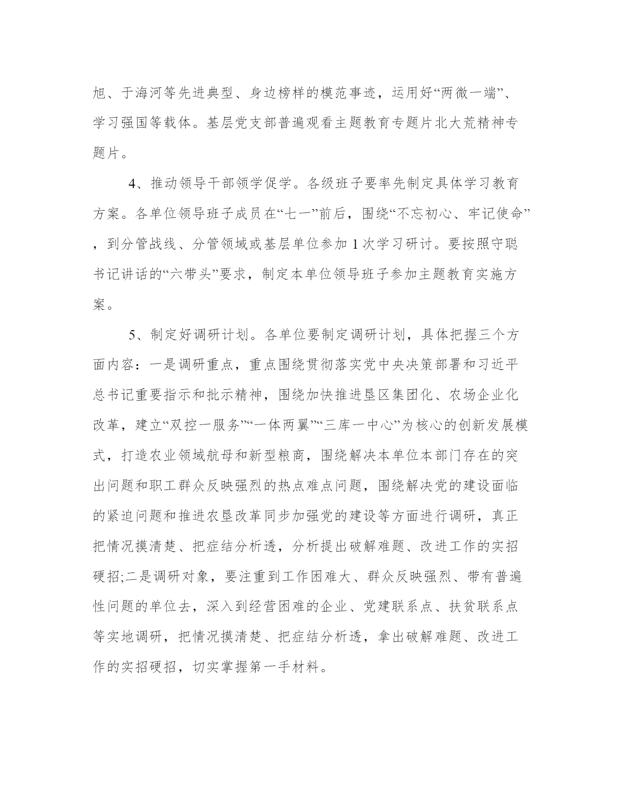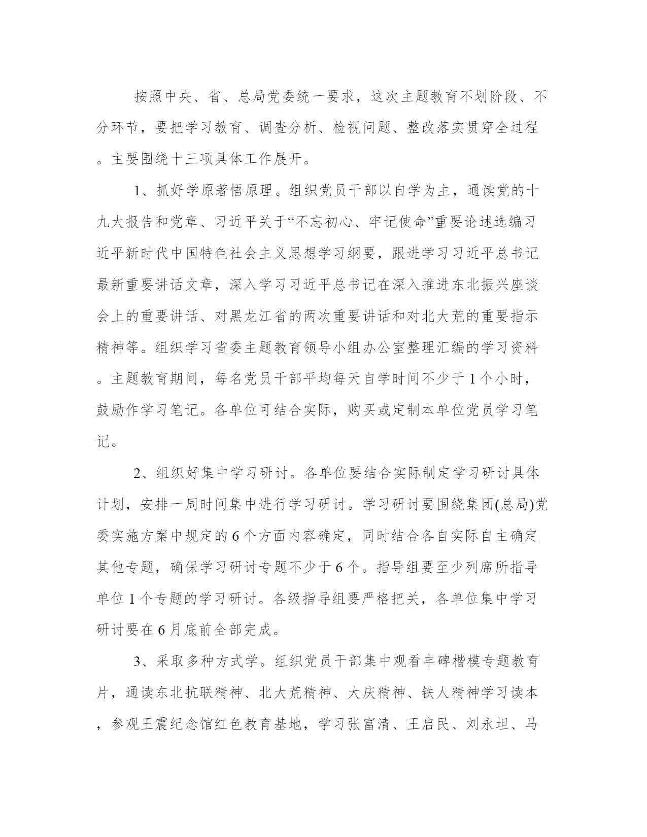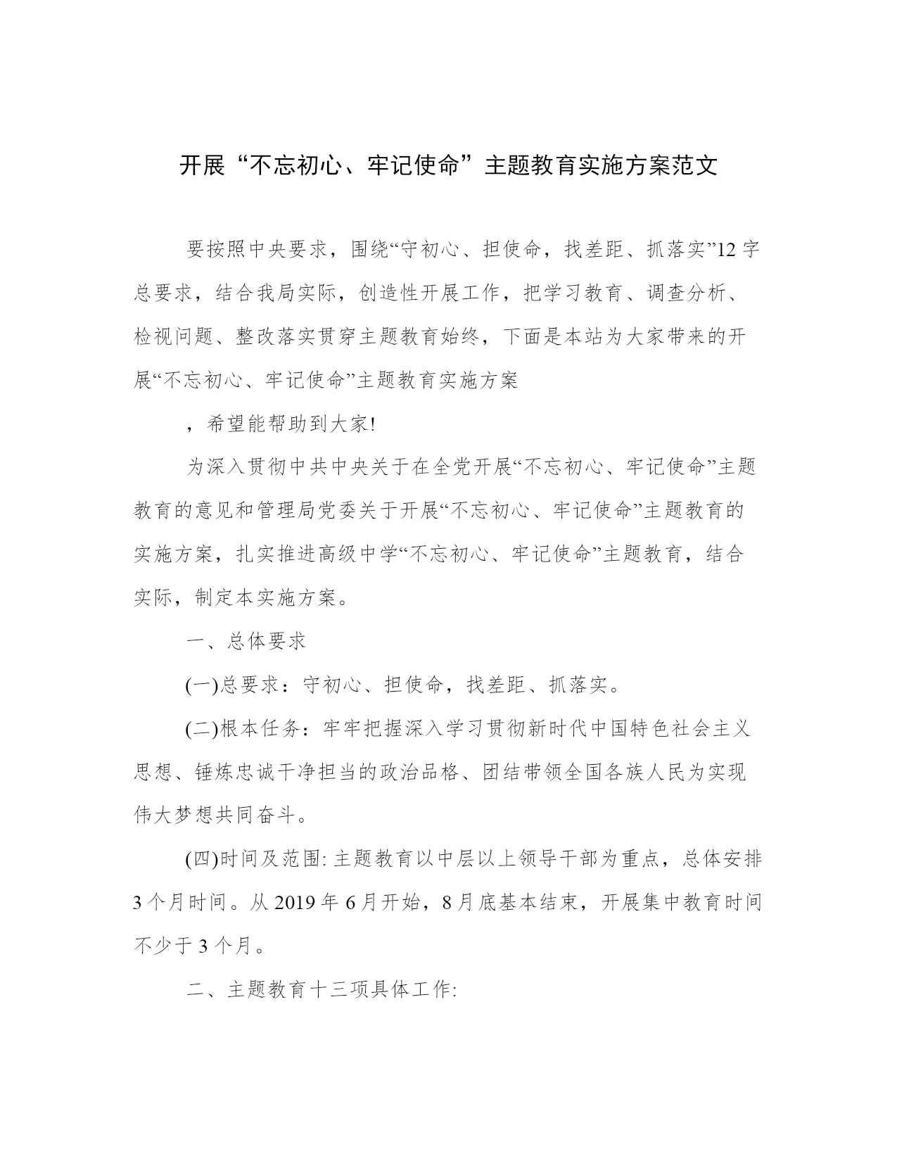 开展“不忘初心、牢记使命”主题教育实施方案范文要按照中央要求,围绕“守初心、担使命,找差距、抓落实”12字总要求,结合我局实际,创造性开展工作,把学习教育、调查分析、检视问题、整改落实贯穿主题教育始终,下面是本站为大家带来的开展“不忘初心、牢记使命”主题教育实施方案,希望能帮助到大家!为深入贯彻中共中央关于在全党开展“不忘初心、牢记使命”主题教育的意见和管理局党委关于开展“不忘初心、牢记使命”主题教育的实施方案,扎实推进高级中学“不忘初心、牢记使命”主题教育,结合实际,制定本实施方案。一、总体要求(一)总要求:守初心、担使命,找差距、抓落实。(二)根本任务:牢牢把握深入学习贯彻新时代中国特色社会主义思想、锤炼忠诚干净担当的政治品格、团结带领全国各族人民为实现伟大梦想共同奋斗。(四)时间及范围:主题教育以中层以上领导干部为重点,总体安排3个月时间。从2019年6月开始,8月底基本结束,开展集中教育时间不少于3个月。二、主题教育十三项具体工作:按照中央、省、总局党委统一要求,这次主题教育不划阶段、不分环节,要把学习教育、调查分析、检视问题、整改落实贯穿全过程。主要围绕十三项具体工作展开。1、抓好学原著悟原理。组织党员干部以自学为主,通读党的十九大报告和党章、习近平关于“不忘初心、牢记使命”重要论述选编习近平新时代中国特色社会主义思想学习纲要,跟进学习习近平总书记最新重要讲话文章,深入学习习近平总书记在深入推进东北振兴座谈会上的重要讲话、对黑龙江省的两次重要讲话和对北大荒的重要指示精神等。组织学习省委主题教育领导小组办公室整理汇编的学习资料。主题教育期间,每名党员干部平均每天自学时间不少于1个小时,鼓励作学习笔记。各单位可结合实际,购买或定制本单位党员学习笔记。2、组织好集中学习研讨。各单位要结合实际制定学习研讨具体计划,安排一周时间集中进行学习研讨。学习研讨要围绕集团(总局)党委实施方案中规定的6个方面内容确定,同时结合各自实际自主确定其他专题,确保学习研讨专题不少于6个。指导组要至少列席所指导单位1个专题的学习研讨。各级指导组要严格把关,各单位集中学习研讨要在6月底前全部完成。3、采取多种方式学。组织党员干部集中观看丰碑楷模专题教育片,通读东北抗联精神、北大荒精神、大庆精神、铁人精神学习读本,参观王震纪念馆红色教育基地,学习张富清、王启民、刘永坦、马旭、于海河等先进典型、身边榜样的模范事迹,运用好“两微一端”、学习强国等载体。基层党支部普遍观看主题教育专题片北大荒精神专题片。4、推动领导干部领学促学。各级班子要率先制定具体学习教育方案。各单位领导班子成员在“七一”前后,围绕“不忘初心、牢记使命”,到分管战线、分管领域或基层单位参加1次学习研讨。要按照守聪书记讲话的“六带头”要求,制定本单位领导班子参加主题教育实施方案。5、制定好调研计划。各单位要制定调研计划,具体把握三个方面内容:一是调研重点,重点围绕贯彻落实党中央决策部署和习近平总书记重要指示和批示精神,围绕加快推进垦区集团化、农场企业化改革,建立“双控一服务”“一体两翼”“三库一中心”为核心的创新发展模式,打造农业领域航母和新型粮商,围绕解决本单位本部门存在的突出问题和职工群众反映强烈的热点难点问题,围绕解决党的建设面临的紧迫问题和推进农垦改革同步加强党的建设等方面进行调研,真正把情况摸清楚、把症结分析透,分析提出破解难题、改进工作的实招硬招;二是调研对象,要注重到工作困难大、群众反映强烈、带有普遍性问题的单位去,深入到经营困难的企业、党建联系点、扶贫联系点等实地调研,把情况摸清楚、把症结分析透,拿出破解难题、改进工作的实招硬招,切实掌握第一手材料。6、总结调研成果。重点把握以下三方面内容:一是结合调研听取意见情况,听取意见的方式方法,征求到哪些意见建议;二是撰写调研报告情况,每名班子成员是否围绕调研重点都撰写一篇高质量的调研报告,是否交流调研成果;三是检查调研成果转化情况,对可复制、可普及的典型做法和实践经验,是否分析相关转化措施和政策规定。各级党委领导班子成员要围绕调研重点撰写1篇高质量的调研报告。7、讲好专题党课。各单位领导班子成员在学习调研的基础上讲专题党课。在内容上,要重点讲学习体会收获,讲运用习近平新时代中国特色社会主义思想指导实践、推动工作存在的差距和改进工作的思路措施;在对象上,每名领导班子成员都要讲一次专题党课;在范围上,主要领导在本单位本部门要带头讲,其他班子成员要到分管领域、分管战线或基层单位讲;在时限上,专题党课要确保在7月中旬至8月中旬期间全部讲完。指导组要参加各单位各部门主要领导的专题党课。9、做好意见建议征集。要结合调查分析,通过召开座谈会、设立意见箱、开通电子信箱、与干部谈心谈话等多种方式,充分听取工作服务对象、基层党员群众对领导班子、领导干