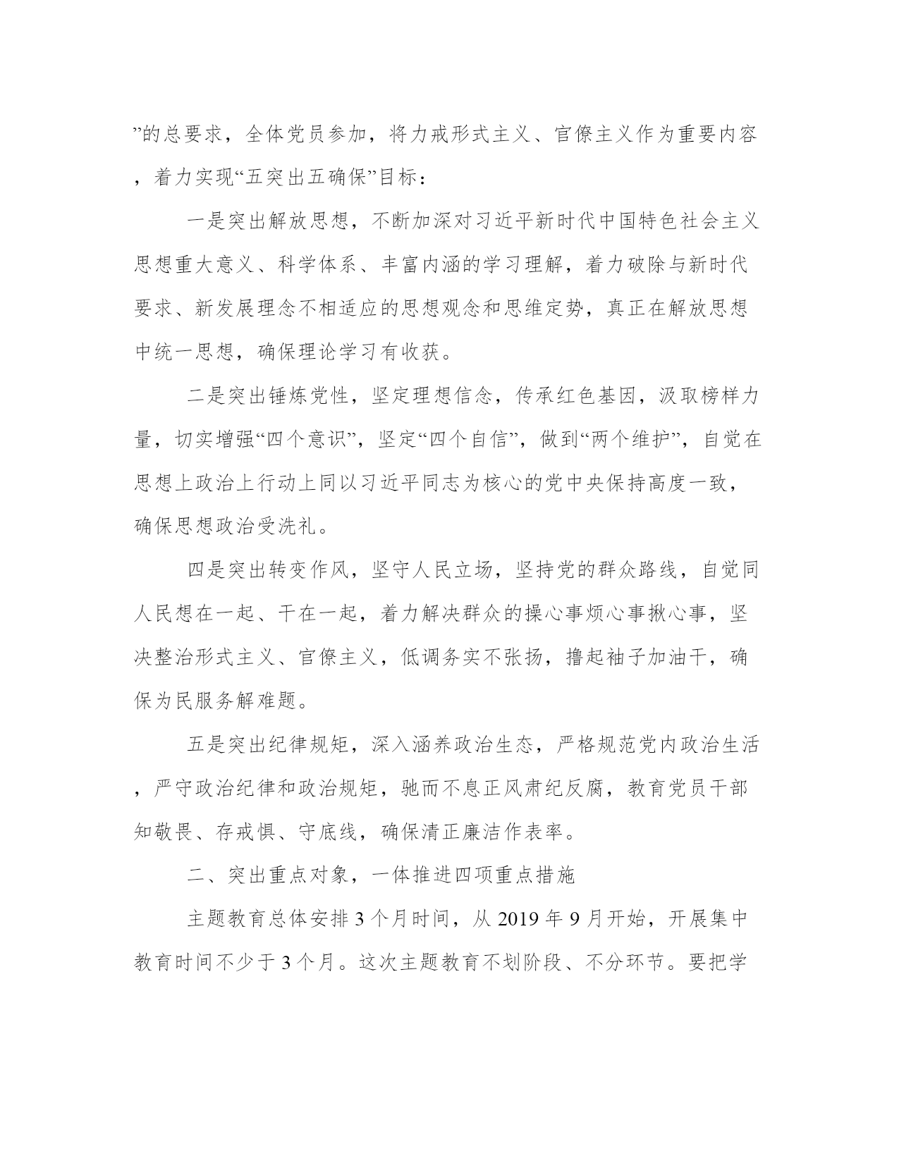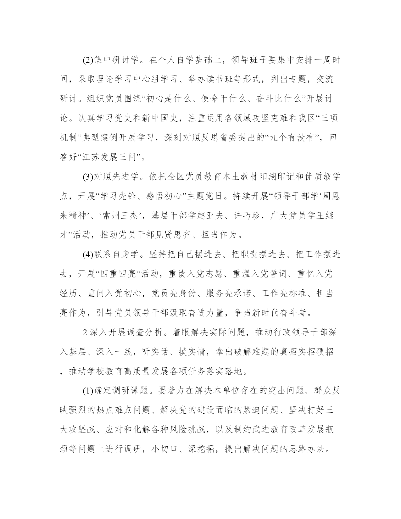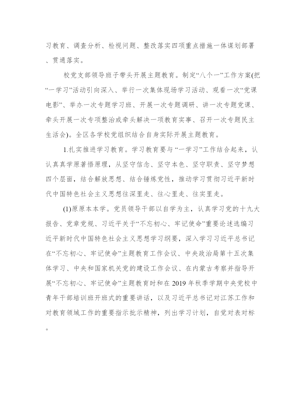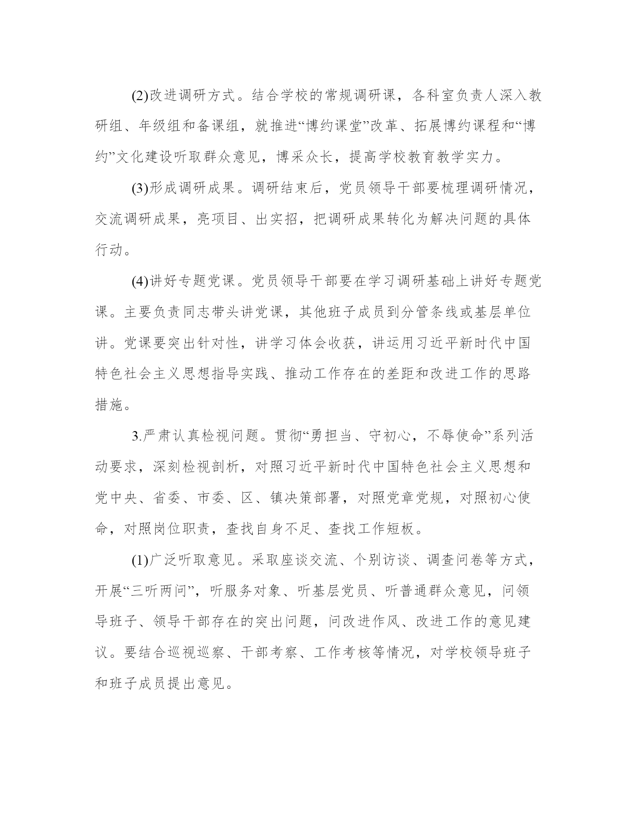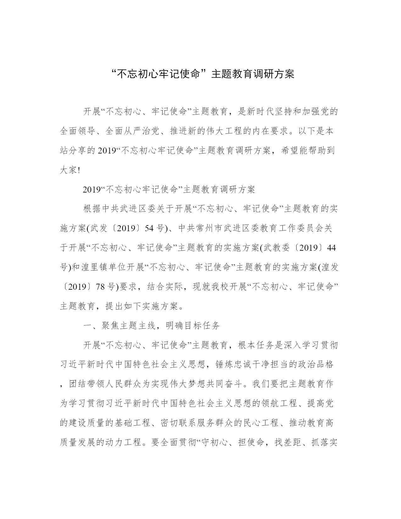 “不忘初心牢记使命”主题教育调研方案开展“不忘初心、牢记使命”主题教育,是新时代坚持和加强党的全面领导、全面从严治党、推进新的伟大工程的内在要求。以下是本站分享的2019“不忘初心牢记使命”主题教育调研方案,希望能帮助到大家!2019“不忘初心牢记使命”主题教育调研方案根据中共武进区委关于开展“不忘初心、牢记使命”主题教育的实施方案(武发〔2019〕54号)、中共常州市武进区委教育工作委员会关于开展“不忘初心、牢记使命”主题教育的实施方案(武教委〔2019〕44号)和湟里镇单位开展“不忘初心、牢记使命”主题教育的实施方案(湟发〔2019〕78号)要求,结合实际,现就我校开展“不忘初心、牢记使命”主题教育,提出如下实施方案。一、聚焦主题主线,明确目标任务开展“不忘初心、牢记使命”主题教育,根本任务是深入学习贯彻习近平新时代中国特色社会主义思想,锤炼忠诚干净担当的政治品格,团结带领人民群众为实现伟大梦想共同奋斗。我们要把主题教育作为学习贯彻习近平新时代中国特色社会主义思想的领航工程、提高党的建设质量的基础工程、密切联系服务群众的民心工程、推动教育高质量发展的动力工程。要全面贯彻“守初心、担使命,找差距、抓落实”的总要求,全体党员参加,将力戒形式主义、官僚主义作为重要内容,着力实现“五突出五确保”目标:一是突出解放思想,不断加深对习近平新时代中国特色社会主义思想重大意义、科学体系、丰富内涵的学习理解,着力破除与新时代要求、新发展理念不相适应的思想观念和思维定势,真正在解放思想中统一思想,确保理论学习有收获。二是突出锤炼党性,坚定理想信念,传承红色基因,汲取榜样力量,切实增强“四个意识”,坚定“四个自信”,做到“两个维护”,自觉在思想上政治上行动上同以习近平同志为核心的党中央保持高度一致,确保思想政治受洗礼。四是突出转变作风,坚守人民立场,坚持党的群众路线,自觉同人民想在一起、干在一起,着力解决群众的操心事烦心事揪心事,坚决整治形式主义、官僚主义,低调务实不张扬,撸起袖子加油干,确保为民服务解难题。五是突出纪律规矩,深入涵养政治生态,严格规范党内政治生活,严守政治纪律和政治规矩,驰而不息正风肃纪反腐,教育党员干部知敬畏、存戒惧、守底线,确保清正廉洁作表率。二、突出重点对象,一体推进四项重点措施主题教育总体安排3个月时间,从2019年9月开始,开展集中教育时间不少于3个月。这次主题教育不划阶段、不分环节。要把学习教育、调查分析、检视问题、整改落实四项重点措施一体谋划部署、贯通落实。校党支部领导班子带头开展主题教育。制定“八个一”工作方案(把“一学习”活动引向深入、举行一次集体现场学习活动、观看一次“党课电影”、举办一次专题学习班、开展一次专题调研、讲一次专题党课、牵头开展一次专项整治或牵头解决一项教育实事、召开一次专题民主生活会)。全区各学校党组织结合自身实际开展主题教育。1.扎实推进学习教育。学习教育要与“一学习”工作结合起来,认认真真学原著悟原理,从坚守信念、坚守本色、坚守职责、坚守梦想四个层面,结合解放思想、结合锤炼党性,推动学习贯彻习近平新时代中国特色社会主义思想往深里走、往心里走、往实里走。(1)原原本本学。党员领导干部以自学为主,认真学习党的十九大报告、党章党规、习近平关于“不忘初心、牢记使命”重要论述选编习近平新时代中国特色社会主义思想学习纲要,深入学习习近平总书记在“不忘初心、牢记使命”主题教育工作会议、中央政治局第十五次集体学习、中央和国家机关党的建设工作会议、在内蒙古考察并指导开展“不忘初心、牢记使命”主题教育时和在2019年秋季学期中央党校中青年干部培训班开班式的重要讲话,以及习近平总书记对江苏工作和对教育领域工作的重要指示批示精神,列出学习计划,自觉对表对标。(2)集中研讨学。在个人自学基础上,领导班子要集中安排一周时间,采取理论学习中心组学习、举办读书班等形式,列出专题,交流研讨。组织党员围绕“初心是什么、使命干什么、奋斗比什么”开展讨论。认真学习党史和新中国史,注重运用各领域攻坚克难和我区“三项机制”典型案例开展学习,深刻对照反思省委提出的“九个有没有”,回答好“江苏发展三问”。(3)对照先进学。依托全区党员教育本土教材阳湖印记和优质教学点,开展“学习先锋、感悟初心”主题党日。持续开展“领导干部学‘周恩来精神’、‘常州三杰’,基层干部学赵亚夫、许巧珍,广大党员学王继才”活动,推动党员干部见贤思齐、担当作为。(4)联系自身学。坚持把自己摆进去、把职责摆进去、把工作摆进去,开展“四重四亮”活动,重读入党志愿、重温入党誓词、重忆入党经历、重问入党初心,党员亮身份、服务亮承诺、工作亮标准、担当亮作为,引导党员领导干部汲取奋进力量,争当新时代奋斗者。2.深入开展调查分析。着眼解决实际问题,推动行政领导干部深入基层、深入