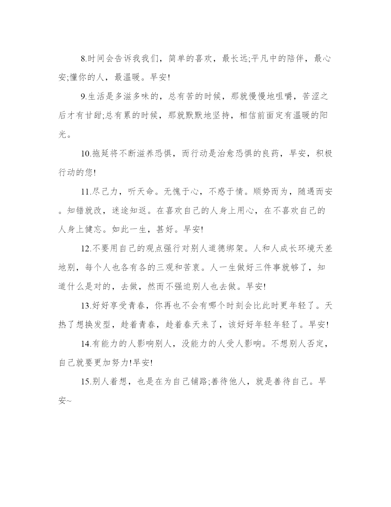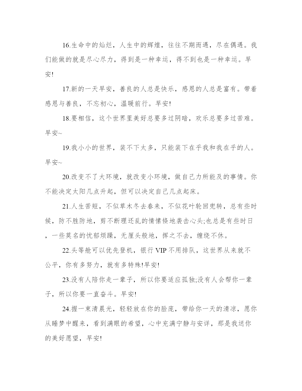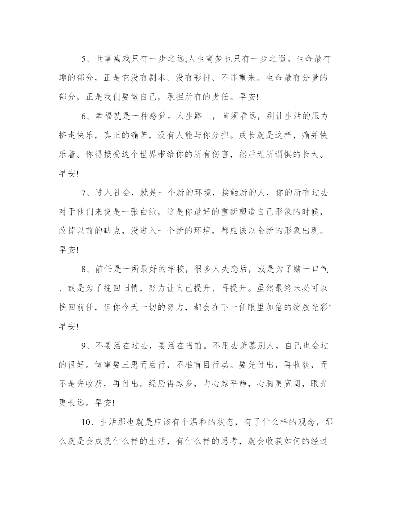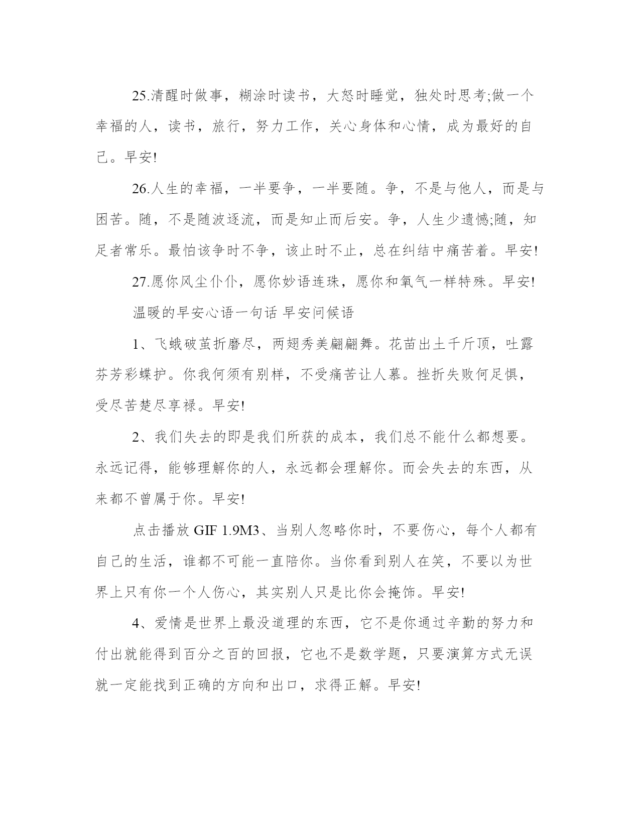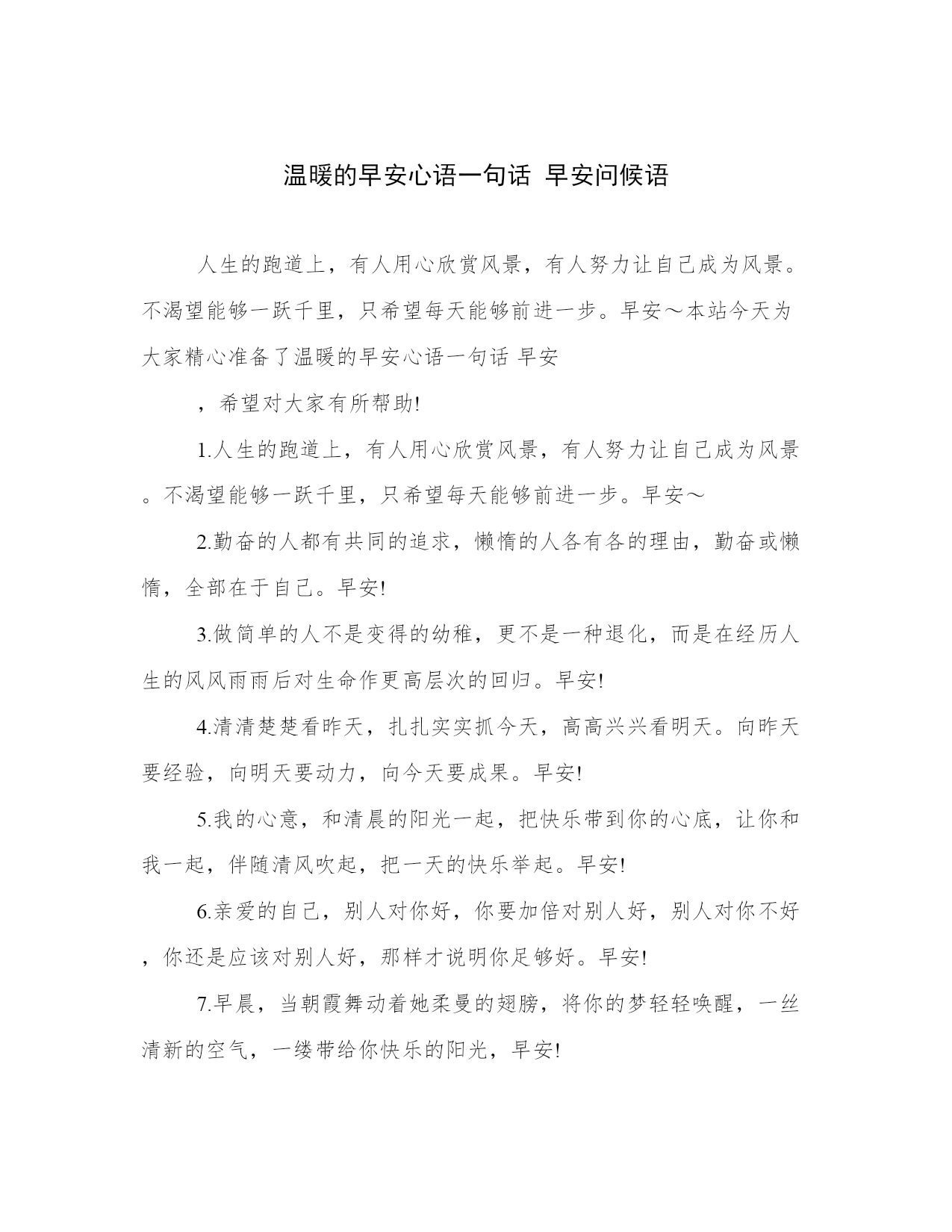 温暖的早安心语一句话早安问候语人生的跑道上,有人用心欣赏风景,有人努力让自己成为风景。不渴望能够一跃千里,只希望每天能够前进一步。早安~本站今天为大家精心准备了温暖的早安心语一句话早安,希望对大家有所帮助!1.人生的跑道上,有人用心欣赏风景,有人努力让自己成为风景。不渴望能够一跃千里,只希望每天能够前进一步。早安~2.勤奋的人都有共同的追求,懒惰的人各有各的理由,勤奋或懒惰,全部在于自己。早安!3.做简单的人不是变得的幼稚,更不是一种退化,而是在经历人生的风风雨雨后对生命作更高层次的回归。早安!4.清清楚楚看昨天,扎扎实实抓今天,高高兴兴看明天。向昨天要经验,向明天要动力,向今天要成果。早安!5.我的心意,和清晨的阳光一起,把快乐带到你的心底,让你和我一起,伴随清风吹起,把一天的快乐举起。早安!6.亲爱的自己,别人对你好,你要加倍对别人好,别人对你不好,你还是应该对别人好,那样才说明你足够好。早安!7.早晨,当朝霞舞动着她柔曼的翅膀,将你的梦轻轻唤醒,一丝清新的空气,一缕带给你快乐的阳光,早安!8.时间会告诉我我们,简单的喜欢,最长远;平凡中的陪伴,最心安;懂你的人,最温暖。早安!9.生活是多滋多味的,总有苦的时候,那就慢慢地咀嚼,苦涩之后才有甘甜;总有累的时候,那就默默地坚持,相信前面定有温暖的阳光。10.拖延将不断滋养恐惧,而行动是治愈恐惧的良药,早安,积极行动的您!11.尽己力,听天命。无愧于心,不惑于情。顺势而为,随遇而安。知错就改,迷途知返。在喜欢自己的人身上用心,在不喜欢自己的人身上健忘。如此一生,甚好。早安!12.不要用自己的观点强行对别人道德绑架。人和人成长环境天差地别,每个人也各有各的三观和苦衷。人一生做好三件事就够了,知道什么是对的,去做,然而不强迫别人也去做。早安!13.好好享受青春,你再也不会有哪个时刻会比此时更年轻了。天热了想换发型,趁着青春,趁着春天来了,该好好年轻年轻了。早安!14.有能力的人影响别人,没能力的人受人影响。不想别人否定,自己就要更加努力!早安!15.别人着想,也是在为自己铺路;善待他人,就是善待自己。早安~16.生命中的灿烂,人生中的辉煌,往往不期而遇,尽在偶遇。我们能做的就是尽心尽力,得到是一种幸运,得不到也是一种幸运。早安!17.新的一天早安,善良的人总是快乐,感恩的人总是富有。带着感恩与善良,不忘初心,温暖前行。早安!18.要相信,这个世界里美好总要多过阴暗,欢乐总要多过苦难。早安~19.我小小的世界,装不下太多,只能装下在乎我和我在乎的人。早安~20.改变不了大环境,就改变小环境,做自己力所能及的事情。你不能决定太阳几点升起,但可以决定自己几点起床。21.人生苦短,不似草木冬去春来,不似花叶轮回兜转,总有些时候,防不胜防地,剪不断理还乱的情愫倏地袭击心头;也总是有些时日,一些莫名的忧郁烦躁,无厘头般地,挥之不去,缠绕不休。22.头等舱可以优先登机,银行VIP不用排队,这世界从来就不公平,你有多努力,就有多特殊!早安!23.没有人陪你走一辈子,所以你要适应孤独;没有人会帮你一辈子,所以你要一直奋斗。早安!24.握一束清晨光,轻轻放在你的脸庞,带给你一天的清凉,愿你从睡梦中醒来,看到满眼的希望,心中充满宁静与安详,那是我送你的美好愿望,早安!25.清醒时做事,糊涂时读书,大怒时睡觉,独处时思考;做一个幸福的人,读书,旅行,努力工作,关心身体和心情,成为最好的自己。早安!26.人生的幸福,一半要争,一半要随。争,不是与他人,而是与困苦。随,不是随波逐流,而是知止而后安。争,人生少遗憾;随,知足者常乐。最怕该争时不争,该止时不止,总在纠结中痛苦着。早安!27.愿你风尘仆仆,愿你妙语连珠,愿你和氧气一样特殊。早安!温暖的早安心语一句话早安问候语1、飞蛾破茧折磨尽,两翅秀美翩翩舞。花苗出土千斤顶,吐露芬芳彩蝶护。你我何须有别样,不受痛苦让人慕。挫折失败何足惧,受尽苦楚尽享禄。早安!2、我们失去的即是我们所获的成本,我们总不能什么都想要。永远记得,能够理解你的人,永远都会理解你。而会失去的东西,从来都不曾属于你。早安!点击播放GIF1.9M3、当别人忽略你时,不要伤心,每个人都有自己的生活,谁都不可能一直陪你。当你看到别人在笑,不要以为世界上只有你一个人伤心,其实别人只是比你会掩饰。早安!4、爱情是世界上最没道理的东西,它不是你通过辛勤的努力和付出就能得到百分之百的回报,它也不是数学题,只要演算方式无误就一定能找到正确的方向和出口,求得正解。早安!5、世事离戏只有一步之远;人生离梦也只有一步之遥。生命最有趣的部分,正是它没有剧本、没有彩排、不能重来。生命最有分量的部分,正是我们要做自己,承担所有的责任。早安!6、幸福就是一种感觉。人生路上,首须看远,别让生活的压力挤走快乐,真正的痛苦,没
