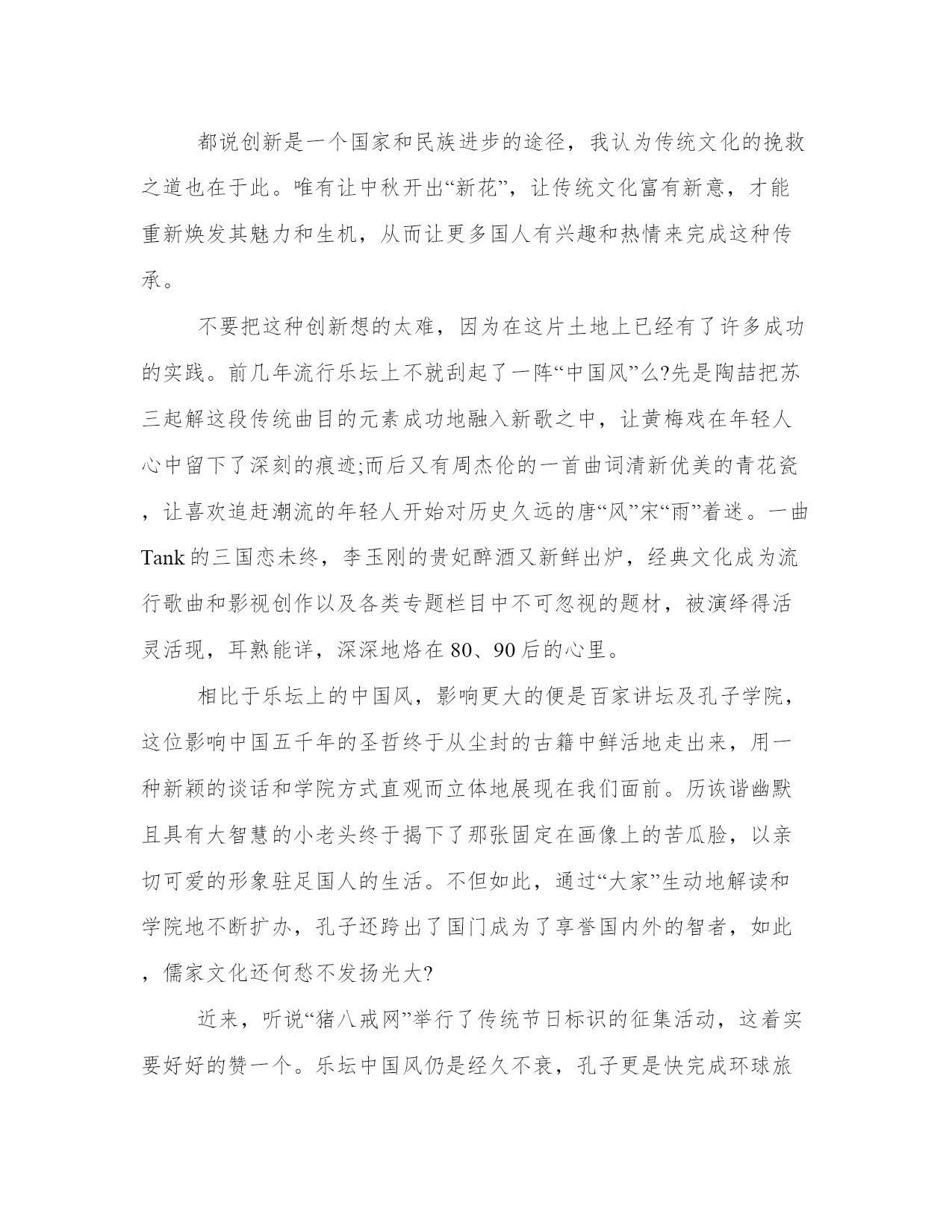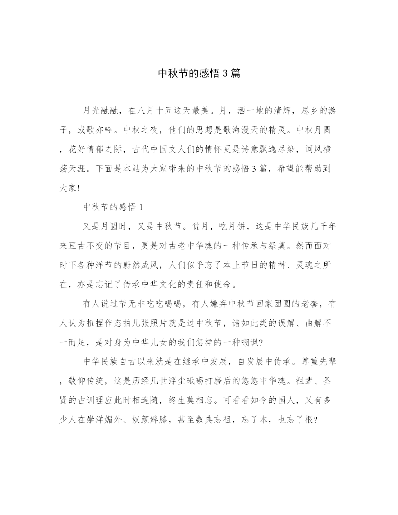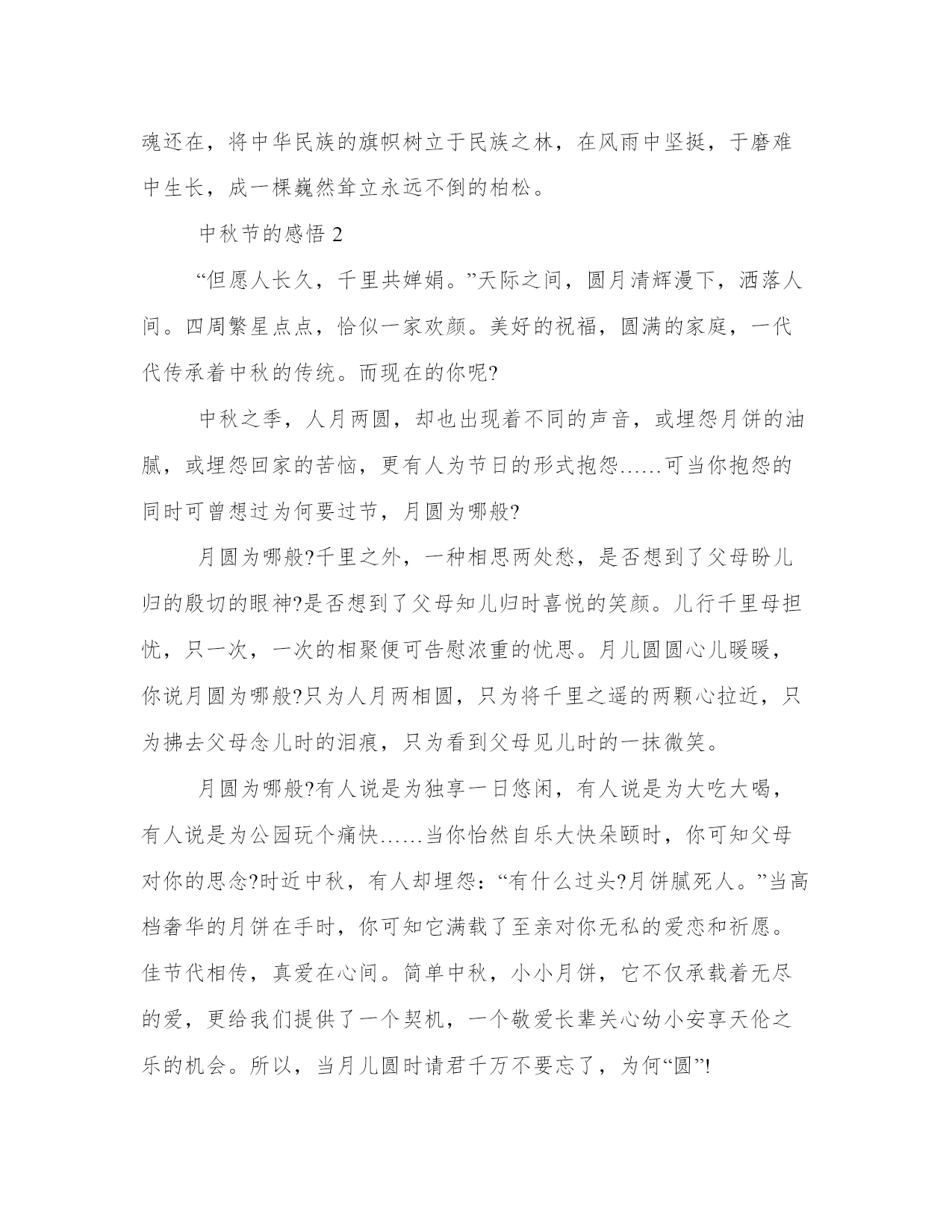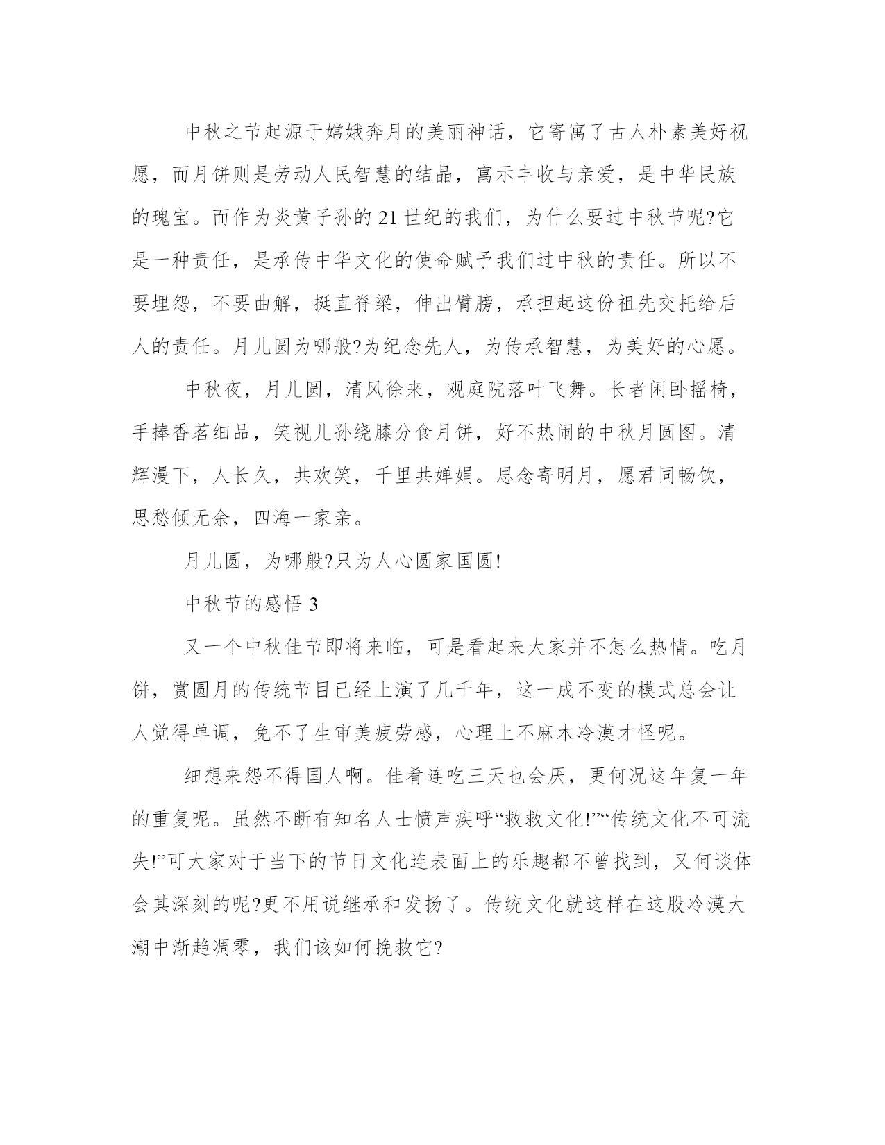 中秋节的感悟3篇月光融融,在八月十五这天最美。月,洒一地的清辉,思乡的游子,或歌亦吟。中秋之夜,他们的思想是歌海漫天的精灵。中秋月圆,花好情郁之际,古代中国文人们的情怀更是诗意飘逸尽染,词风横荡天涯。下面是本站为大家带来的中秋节的感悟3篇,希望能帮助到大家!中秋节的感悟1又是月圆时,又是中秋节。赏月,吃月饼,这是中华民族几千年来亘古不变的节目,更是对古老中华魂的一种传承与祭奠。然而面对时下各种洋节的蔚然成风,人们似乎忘了本土节日的精神、灵魂之所在,亦是忘记了传承中华文化的责任和使命。有人说过节无非吃吃喝喝,有人嫌弃中秋节回家团圆的老套,有人认为扭捏作态拍几张照片就是过中秋节,诸如此类的误解、曲解不一而足,是对身为中华儿女的我们怎样的一种嘲讽?中华民族自古以来就是在继承中发展,自发展中传承。尊重先辈,敬仰传统,这是历经几世浮尘砥砺打磨后的悠悠中华魂。祖辈、圣贤的古训理应此时相追随,终生莫相忘。可看看如今的国人,又有多少人在崇洋媚外、奴颜婢膝,甚至数典忘祖,忘了本,也忘了根?君已知韩国、日本纷纷抢占中国的传统佳节所带来的市场,更有甚者,将中国的传统习俗申请成为本国的文化遗产。面对这种文化侵略,作为泱泱华夏的骨肉血亲,为何竟这般麻木不仁不为所动?不只是对待本国节日,乃至中华五千年多少优良传统,我们已经忘却它们所真正代表着的,不只是一种形式,更是中华民族长期以来形成的以爱国主义为核心,自强不息,勤劳勇敢,团结协作,艰苦奋斗的民族精神!是推动中华民族再次走向繁荣富强的铮铮铁骨和磐磐基石。正因为中华传统节日于华夏子孙炎黄儿女举足轻重意义重大,国家才要设立条款予以保护。身在祖国未去过国外的人,对于中华传统节日于我们的意义或价值,也许并无深切具体的感触,当你一旦踏出国门,走进异国的领土,能给你力量的,或许就是这中华魂。传承,不止是对中华民族传统节日的继承,更是对中国历代所有优秀文化的承续。因为它们是中华民族上下五千载的历史见证、精神载体。传承中华民族魂,是对古老训条至理箴言矢志不渝的坚守;传承中华民族魂,是对民族信仰的顶礼恪守、不悔的虔诚;传承中华民族魂,是对华夏文明不变的崇敬永远的守护。风华是一指流沙,苍老是一段年华。传承中华魂,如沧海巫山。岁月如流,沉积万千后成不为浮华所动的傲岸。中华民族不倒,中华魂还在,将中华民族的旗帜树立于民族之林,在风雨中坚挺,于磨难中生长,成一棵巍然耸立永远不倒的柏松。中秋节的感悟2“但愿人长久,千里共婵娟。”天际之间,圆月清辉漫下,洒落人间。四周繁星点点,恰似一家欢颜。美好的祝福,圆满的家庭,一代代传承着中秋的传统。而现在的你呢?中秋之季,人月两圆,却也出现着不同的声音,或埋怨月饼的油腻,或埋怨回家的苦恼,更有人为节日的形式抱怨……可当你抱怨的同时可曾想过为何要过节,月圆为哪般?月圆为哪般?千里之外,一种相思两处愁,是否想到了父母盼儿归的殷切的眼神?是否想到了父母知儿归时喜悦的笑颜。儿行千里母担忧,只一次,一次的相聚便可告慰浓重的忧思。月儿圆圆心儿暖暖,你说月圆为哪般?只为人月两相圆,只为将千里之遥的两颗心拉近,只为拂去父母念儿时的泪痕,只为看到父母见儿时的一抹微笑。月圆为哪般?有人说是为独享一日悠闲,有人说是为大吃大喝,有人说是为公园玩个痛快……当你怡然自乐大快朵颐时,你可知父母对你的思念?时近中秋,有人却埋怨:“有什么过头?月饼腻死人。”当高档奢华的月饼在手时,你可知它满载了至亲对你无私的爱恋和祈愿。佳节代相传,真爱在心间。简单中秋,小小月饼,它不仅承载着无尽的爱,更给我们提供了一个契机,一个敬爱长辈关心幼小安享天伦之乐的机会。所以,当月儿圆时请君千万不要忘了,为何“圆”!中秋之节起源于嫦娥奔月的美丽神话,它寄寓了古人朴素美好祝愿,而月饼则是劳动人民智慧的结晶,寓示丰收与亲爱,是中华民族的瑰宝。而作为炎黄子孙的21世纪的我们,为什么要过中秋节呢?它是一种责任,是承传中华文化的使命赋予我们过中秋的责任。所以不要埋怨,不要曲解,挺直脊梁,伸出臂膀,承担起这份祖先交托给后人的责任。月儿圆为哪般?为纪念先人,为传承智慧,为美好的心愿。中秋夜,月儿圆,清风徐来,观庭院落叶飞舞。长者闲卧摇椅,手捧香茗细品,笑视儿孙绕膝分食月饼,好不热闹的中秋月圆图。清辉漫下,人长久,共欢笑,千里共婵娟。思念寄明月,愿君同畅饮,思愁倾无余,四海一家亲。月儿圆,为哪般?只为人心圆家国圆!中秋节的感悟3又一个中秋佳节即将来临,可是看起来大家并不怎么热情。吃月饼,赏圆月的传统节目已经上演了几千年,这一成不变的模式总会让人觉得单调,免不了生审美疲劳感,心理上不麻木冷漠才怪呢。细想来怨不得国人啊。佳肴连吃三天也会厌,更何况这年复一年的重复呢。虽然不断有知名人士愤声疾呼“救救文化!”“传统文化不可流失!”可大家对于当下的节日文化连表面上的乐趣都不曾