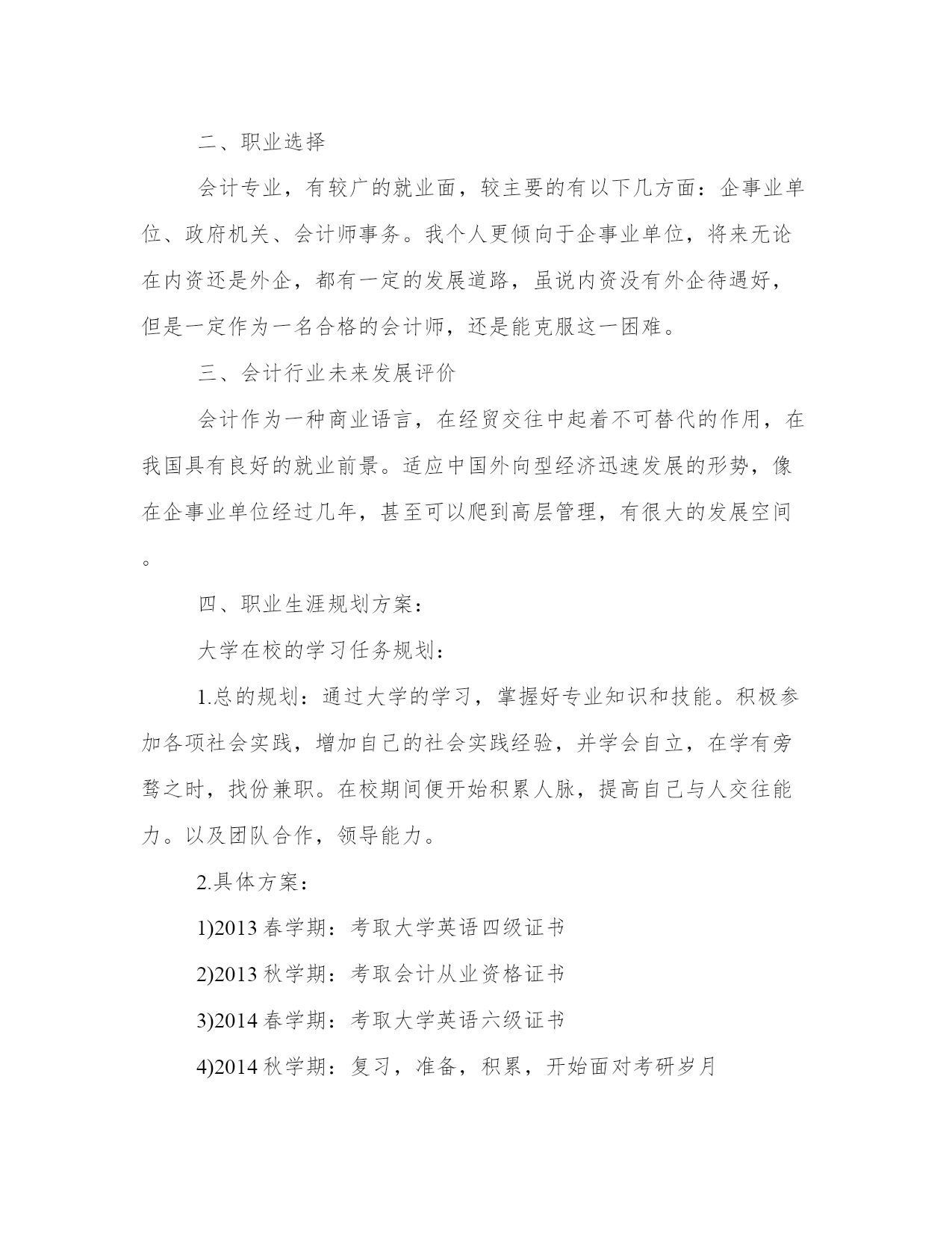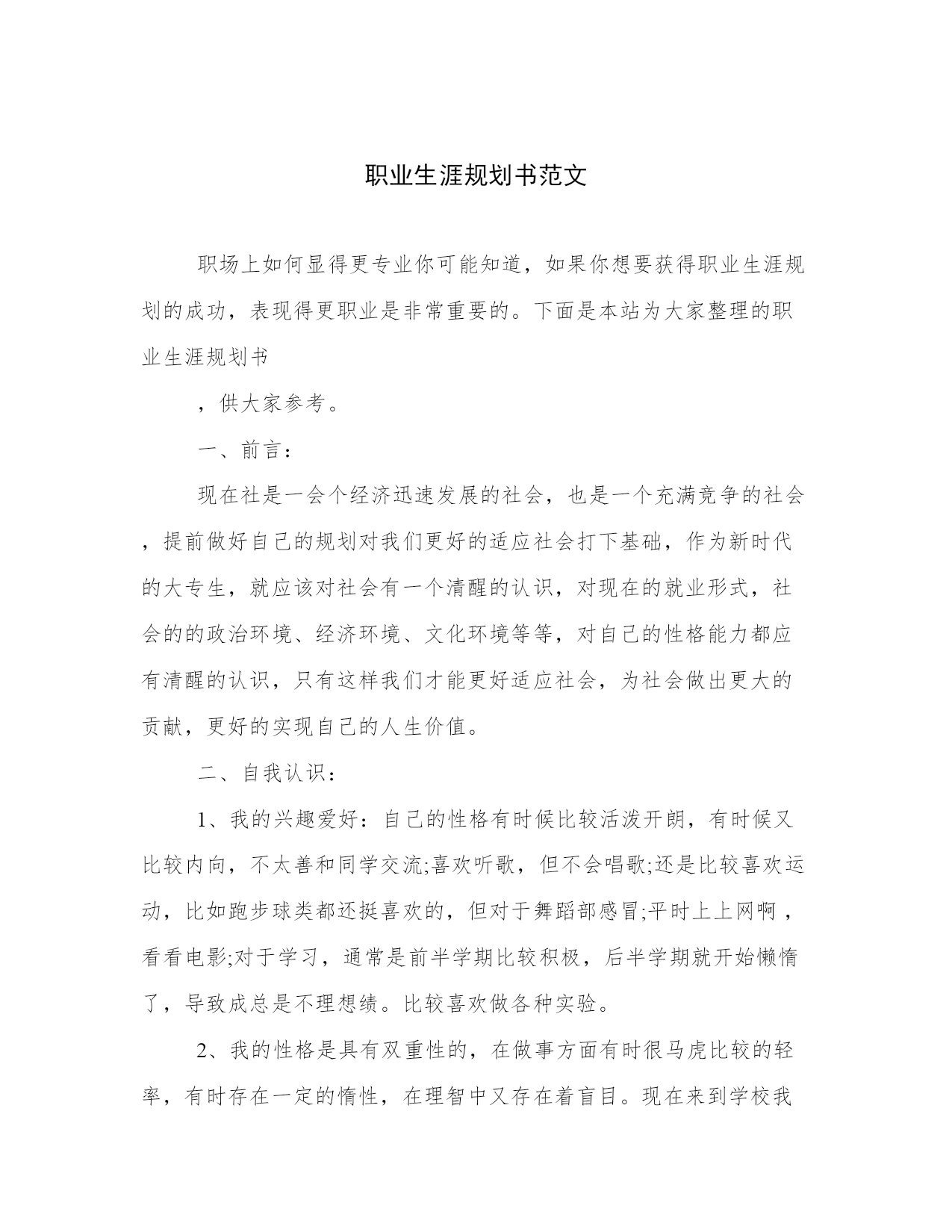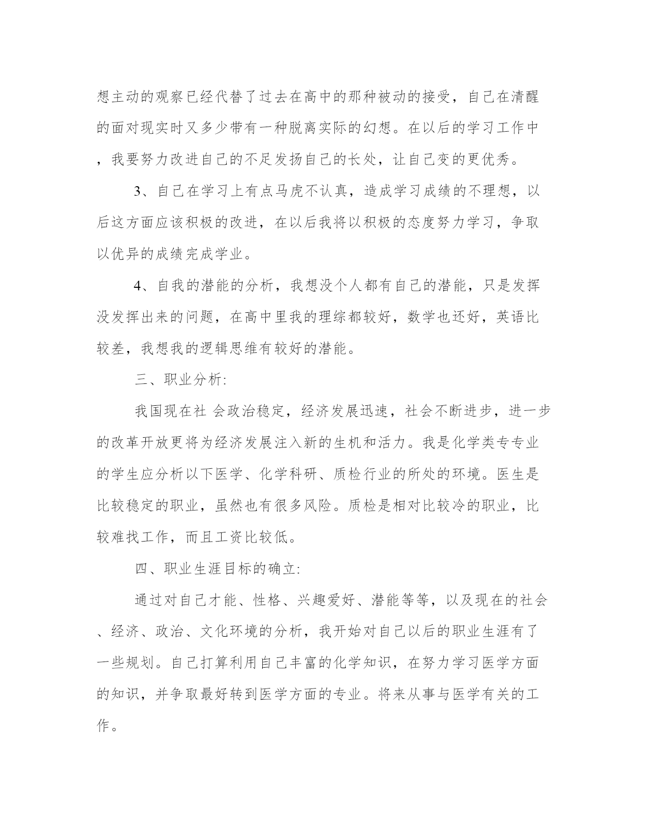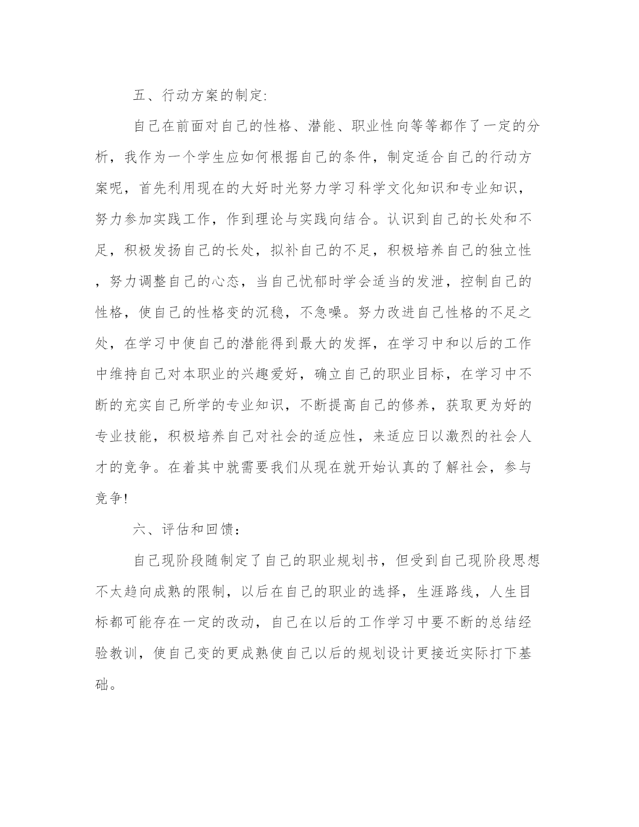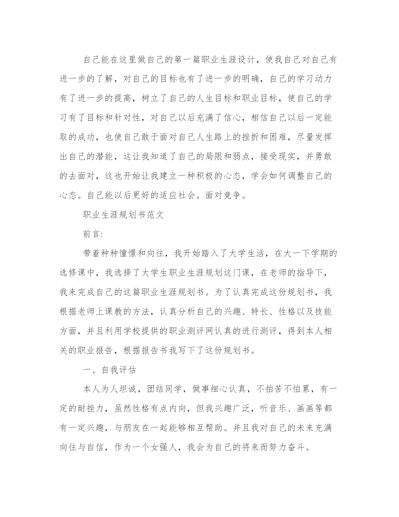 职业生涯规划书范文职场上如何显得更专业你可能知道,如果你想要获得职业生涯规划的成功,表现得更职业是非常重要的。下面是本站为大家整理的职业生涯规划书,供大家参考。一、前言:现在社是一会个经济迅速发展的社会,也是一个充满竞争的社会,提前做好自己的规划对我们更好的适应社会打下基础,作为新时代的大专生,就应该对社会有一个清醒的认识,对现在的就业形式,社会的的政治环境、经济环境、文化环境等等,对自己的性格能力都应有清醒的认识,只有这样我们才能更好适应社会,为社会做出更大的贡献,更好的实现自己的人生价值。二、自我认识:1、我的兴趣爱好:自己的性格有时候比较活泼开朗,有时候又比较内向,不太善和同学交流;喜欢听歌,但不会唱歌;还是比较喜欢运动,比如跑步球类都还挺喜欢的,但对于舞蹈部感冒;平时上上网啊,看看电影;对于学习,通常是前半学期比较积极,后半学期就开始懒惰了,导致成总是不理想绩。比较喜欢做各种实验。2、我的性格是具有双重性的,在做事方面有时很马虎比较的轻率,有时存在一定的惰性,在理智中又存在着盲目。现在来到学校我想主动的观察已经代替了过去在高中的那种被动的接受,自己在清醒的面对现实时又多少带有一种脱离实际的幻想。在以后的学习工作中,我要努力改进自己的不足发扬自己的长处,让自己变的更优秀。3、自己在学习上有点马虎不认真,造成学习成绩的不理想,以后这方面应该积极的改进,在以后我将以积极的态度努力学习,争取以优异的成绩完成学业。4、自我的潜能的分析,我想没个人都有自己的潜能,只是发挥没发挥出来的问题,在高中里我的理综都较好,数学也还好,英语比较差,我想我的逻辑思维有较好的潜能。三、职业分析:我国现在社会政治稳定,经济发展迅速,社会不断进步,进一步的改革开放更将为经济发展注入新的生机和活力。我是化学类专专业的学生应分析以下医学、化学科研、质检行业的所处的环境。医生是比较稳定的职业,虽然也有很多风险。质检是相对比较冷的职业,比较难找工作,而且工资比较低。四、职业生涯目标的确立:通过对自己才能、性格、兴趣爱好、潜能等等,以及现在的社会、经济、政治、文化环境的分析,我开始对自己以后的职业生涯有了一些规划。自己打算利用自己丰富的化学知识,在努力学习医学方面的知识,并争取最好转到医学方面的专业。将来从事与医学有关的工作。五、行动方案的制定:自己在前面对自己的性格、潜能、职业性向等等都作了一定的分析,我作为一个学生应如何根据自己的条件,制定适合自己的行动方案呢,首先利用现在的大好时光努力学习科学文化知识和专业知识,努力参加实践工作,作到理论与实践向结合。认识到自己的长处和不足,积极发扬自己的长处,拟补自己的不足,积极培养自己的独立性,努力调整自己的心态,当自己忧郁时学会适当的发泄,控制自己的性格,使自己的性格变的沉稳,不急噪。努力改进自己性格的不足之处,在学习中使自己的潜能得到最大的发挥,在学习中和以后的工作中维持自己对本职业的兴趣爱好,确立自己的职业目标,在学习中不断的充实自己所学的专业知识,不断提高自己的修养,获取更为好的专业技能,积极培养自己对社会的适应性,来适应日以激烈的社会人才的竞争。在着其中就需要我们从现在就开始认真的了解社会,参与竞争!六、评估和回馈:自己现阶段随制定了自己的职业规划书,但受到自己现阶段思想不太趋向成熟的限制,以后在自己的职业的选择,生涯路线,人生目标都可能存在一定的改动,自己在以后的工作学习中要不断的总结经验教训,使自己变的更成熟使自己以后的规划设计更接近实际打下基础。自己能在这里做自己的第一篇职业生涯设计,使我自己对自己有进一步的了解,对自己的目标也有了进一步的明确,自己的学习动力有了进一步的提高,树立了自己的人生目标和职业目标,使自己的学习有了目标和针对性,对自己以后充满了信心,相信自己以后一定能取的成功,也使自己敢于面对自己人生路上的挫折和困难,尽量发挥出自己的潜能,这让我知道了自己的局限和弱点,接受现实,并勇敢的去面对,这也开始让我建立一种积极的心态,学会如何调整自己的心态。自己能以后更好的适应社会。面对竞争。职业生涯规划书范文前言:带着种种憧憬和向往,我开始踏入了大学生活,在大一下学期的选修课中,我选择了大学生职业生涯规划这门课,在老师的指导下,我来完成自己的这篇职业生涯规划书。为了认真完成这份规划书,我根据老师上课教的方法,认真分析自己的兴趣、特长、性格以及技能方面,并且利用学校提供的职业测评网认真的进行测评,得到本人相关的职业报告,根据报告书我写下了这份规划书。一、自我评估本人为人坦诚,团结同学,做事细心认真,不拍苦不怕累,有一定的耐挫力,虽然性格有点内向,但我兴趣广泛,听音乐、画画等都有一定兴趣,与朋友在一起能够相互帮助。并且我对自己的未来充满向往与自信,作为一个女强人,我会为自己的将来而努力奋斗。二、职业选