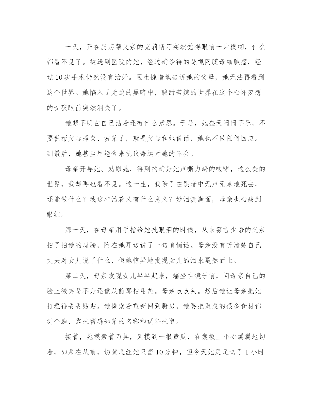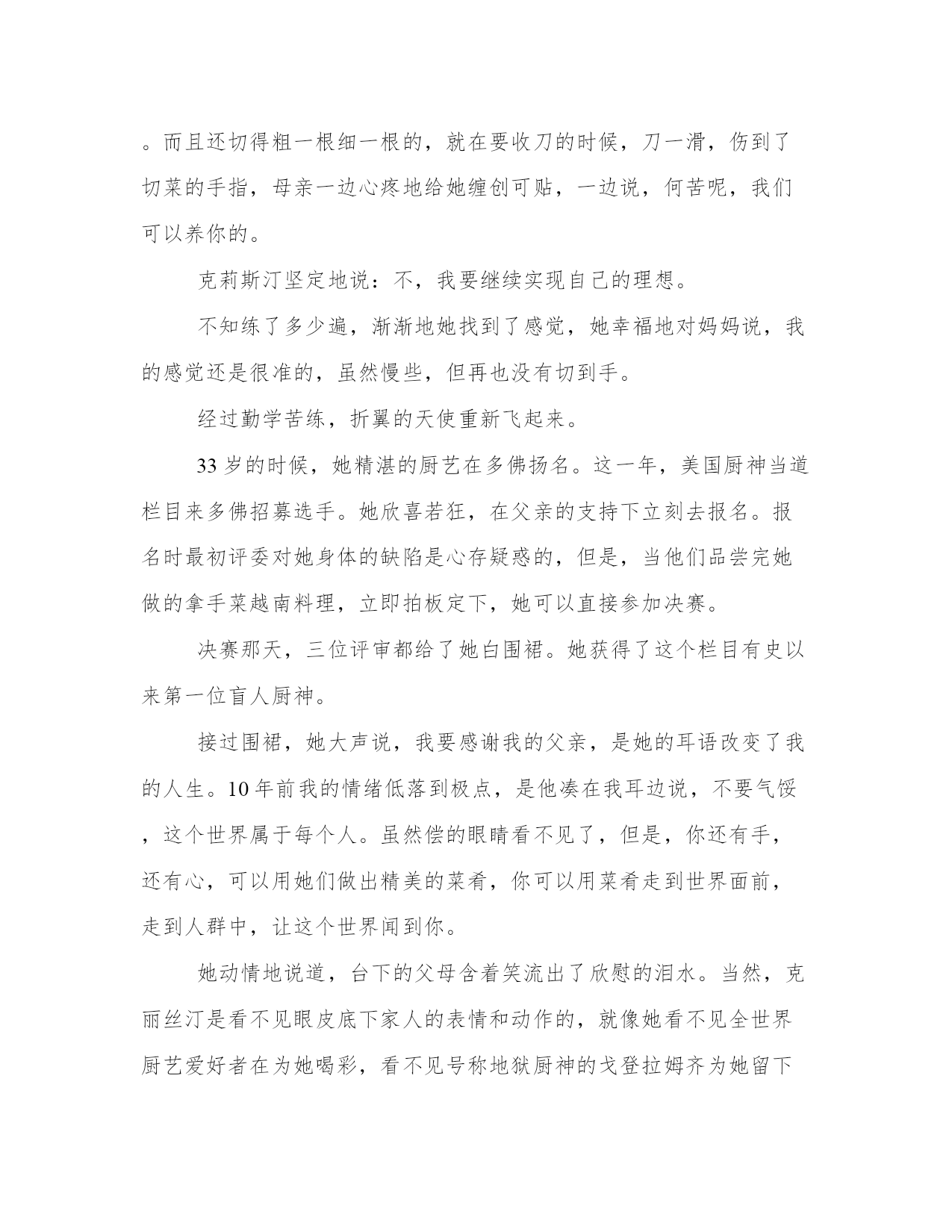 盲人厨神克莉丝汀经典奋斗励志故事:让这个世界闻到你【www.sxqingyun.com--励志故事】2012年6月,美国厨神当道栏目迎来了一位特殊的选手,盲女克莉丝汀。她刚一现身,就惹得三位评委哇哇叫,即使是明眼人,要想做出一道色香味俱全的菜肴征服评委都很难,大家都禁不住为她捏了把汗。但镇定的克莉斯汀无论刀工,做菜的火候都不比明眼人差。她运用视觉以外的各种感官,用手、用心且在5分钟内做了一道越南料理腌菜咸鱼。最终,这道菜打动了苛刻的评委,克丽丝汀成功晋级。地狱评委戈登拉姆齐盛赞她说,你身上有很多值得骄傲的光芒。克莉丝汀的父母是越南移民,她出生在美国的多佛,父母经营着一个饭店。每天早晨一睁眼,她就能闻见饭店厨房里饭菜的香气。中午放学或者晚上放学,她会帮父母择菜、洗菜。小小年纪的她在家庭的熏陶下,喜欢上了做菜。高中毕业时,她毫不犹豫地选择了职高学校的烹饪系。在学校里她系统地学习了几大菜系理论知识,寒暑假,她不放过任何一次实践机会。渐渐的,在自家饭店她做的菜小有名气,很多客人专门点她做的菜。正在克莉斯汀想在美食上大展宏图的时候,不幸却悄悄降临在这个美丽女孩身上。一天,正在厨房帮父亲的克莉斯汀突然觉得眼前一片模糊,什么都看不见了。被送到医院的她,经过确诊得的是视网膜母细胞瘤,经过10次手术仍然没有治好。医生惋惜地告诉她的父母,她无法再看到这个世界。她陷入了无边的黑暗中,酸甜苦辣的世界在这个心怀梦想的女孩眼前突然消失了。她想不明白自己活着还有什么意思。于是,她整天闷闷不乐,不要说帮父母择菜、洗菜了,就是父母和她说话,她也不做任何回应。到最后,她甚至用绝食来抗议命运对她的不公。母亲开导她、劝慰她,得到的确是她声嘶力竭的咆哮,这么美的世界,我却再也看不见。这一生,我除了在黑暗中无声无息地死去,还能做什么?我这样活着又有什么意义?她泪流满面,母亲也心酸到眼红。那一天,在母亲用手指给她批眼泪的时候,从来寡言少语的父亲拍了拍她的肩膀,附在她耳边说了一句悄悄话。母亲没有听清楚自己丈夫对女儿说了什么,但她惊异地发现女儿的泪水戛然而止。第二天,母亲发现女儿早早起来,端坐在镜子前,问母亲自己的脸上微笑是不是还像从前那枯甜美。母亲点点头。然后她让母亲把她打理得妥妥贴贴。她摸索着重新回到厨房,她要把做菜的很多食材都尝个遍,靠味蕾感知菜的名称和调料味道。接着,她摸索着刀具,又摸到一根黄瓜,在案板上小心翼翼地切着,如果在从前,切黄瓜丝她只需10分钟,但今天她足足切了1小时。而且还切得粗一根细一根的,就在要收刀的时候,刀一滑,伤到了切菜的手指,母亲一边心疼地给她缠创可贴,一边说,何苦呢,我们可以养你的。克莉斯汀坚定地说:不,我要继续实现自己的理想。不知练了多少遍,渐渐地她找到了感觉,她幸福地对妈妈说,我的感觉还是很准的,虽然慢些,但再也没有切到手。经过勤学苦练,折翼的天使重新飞起来。33岁的时候,她精湛的厨艺在多佛扬名。这一年,美国厨神当道栏目来多佛招募选手。她欣喜若狂,在父亲的支持下立刻去报名。报名时最初评委对她身体的缺陷是心存疑惑的,但是,当他们品尝完她做的拿手菜越南料理,立即拍板定下,她可以直接参加决赛。决赛那天,三位评审都给了她白围裙。她获得了这个栏目有史以来第一位盲人厨神。接过围裙,她大声说,我要感谢我的父亲,是她的耳语改变了我的人生。10年前我的情绪低落到极点,是他凑在我耳边说,不要气馁,这个世界属于每个人。虽然偿的眼睛看不见了,但是,你还有手,还有心,可以用她们做出精美的菜肴,你可以用菜肴走到世界面前,走到人群中,让这个世界闻到你。她动情地说道,台下的父母含着笑流出了欣慰的泪水。当然,克丽丝汀是看不见眼皮底下家人的表情和动作的,就像她看不见全世界厨艺爱好者在为她喝彩,看不见号称地狱厨神的戈登拉姆齐为她留下的欣赏的泪水。但是,她走到了世界面前,让全世界通过她的菜闻到了她。