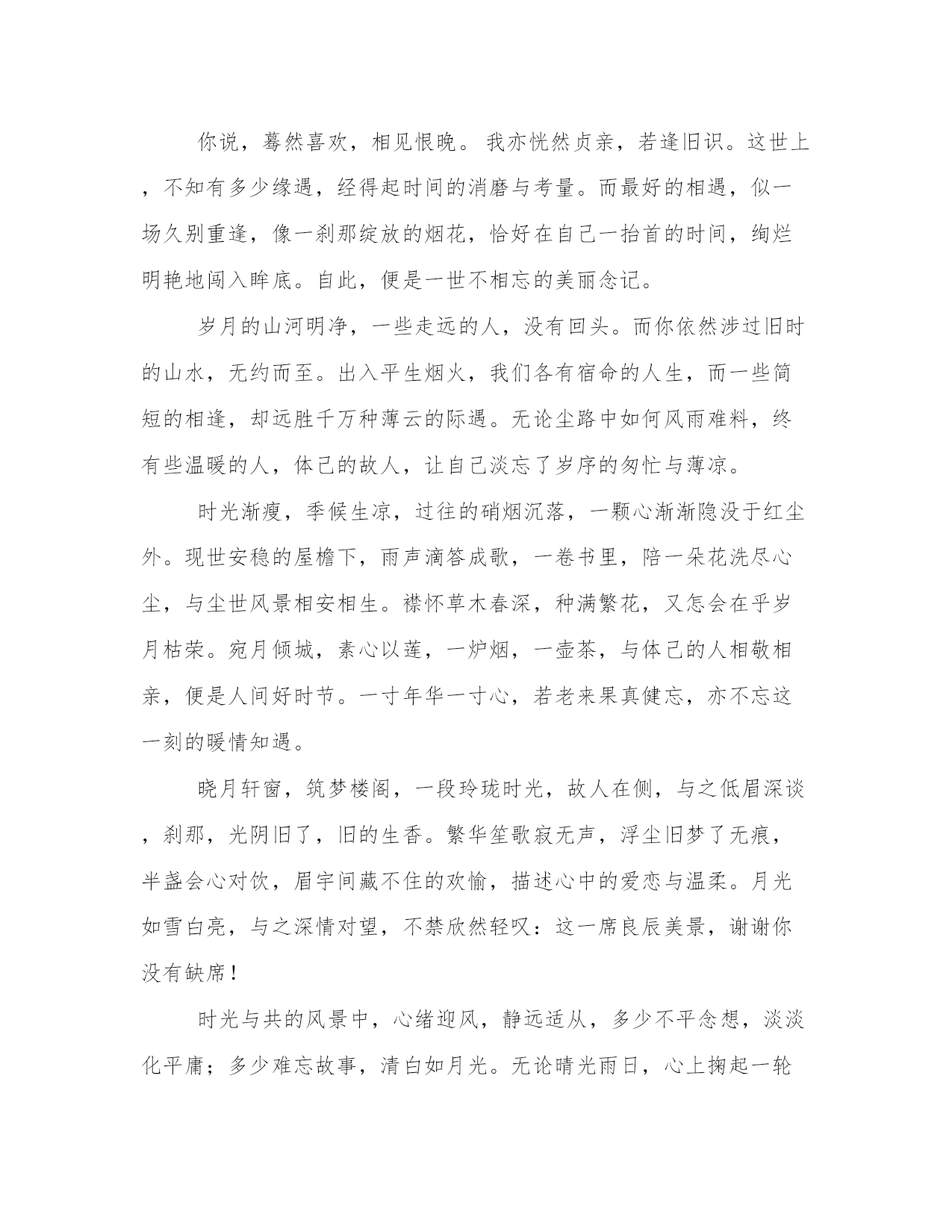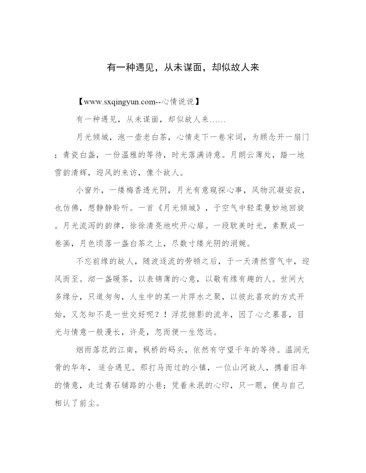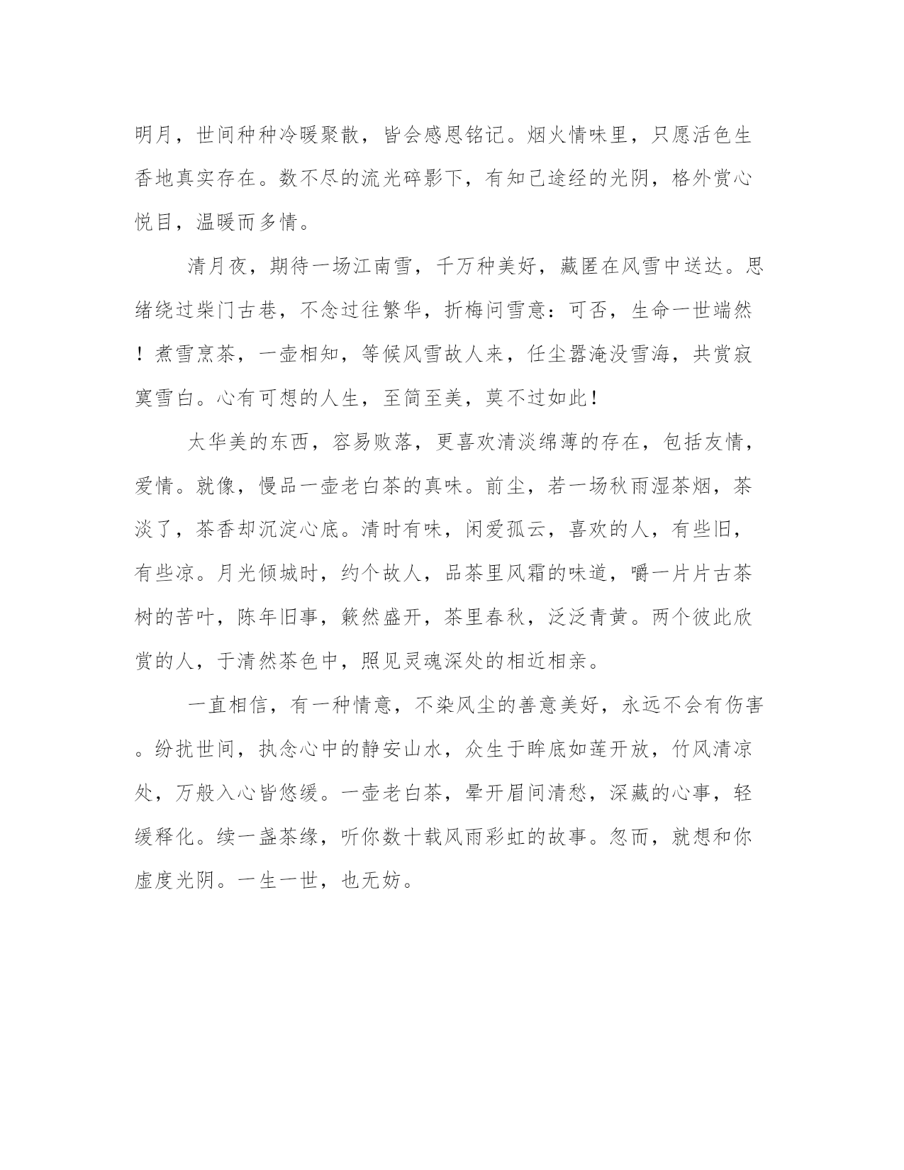 有一种遇见,从未谋面,却似故人来【www.sxqingyun.com--心情说说】有一种遇见,从未谋面,却似故人来……月光倾城,泡一壶老白茶,心情走下一卷宋词,为顾念开一扇门;青瓷白盏,一份温雅的等待,时光落满诗意。月朗云薄处,踏一地雪韵清辉,迎风的来访,像个故人。小窗外,一缕梅香透光阴,月光有意窥探心事,风物沉凝安寂,也仿佛,想静静聆听。一首《月光倾城》,于空气中轻柔曼妙地回旋。月光流泻的韵律,徐徐清亮地吹开心扉。一段耽美时光,素默成一卷画,月色顷落一盏白茶之上,尽数寸缕光阴的涓婉。不忘前缘的故人,随波逐流的劳顿之后,于一天清然雪气中,迎风而至。沏一盏暖茶,以表锦薄的心意,以敬有缘有趣的人。世间大多缘分,只道匆匆,人生中的某一片萍水之聚,以彼此喜欢的方式开始,又怎知不是一世交好呢?!浮花掠影的流年,因了心之慕喜,目光与情意一般漫长,许是,忽而便一生悠远。烟雨落花的江南,枫桥的码头,依然有守望千年的等待。温润无骨的华年,适合遇见。那打马而过的小镇,一位山河故人,携着旧年的情意,走过青石铺路的小巷;凭着未泯的心印,只一眼,便与自己相认了前尘。你说,蓦然喜欢,相见恨晚。我亦恍然贞亲,若逢旧识。这世上,不知有多少缘遇,经得起时间的消磨与考量。而最好的相遇,似一场久别重逢,像一刹那绽放的烟花,恰好在自己一抬首的时间,绚烂明艳地闯入眸底。自此,便是一世不相忘的美丽念记。岁月的山河明净,一些走远的人,没有回头。而你依然涉过旧时的山水,无约而至。出入平生烟火,我们各有宿命的人生,而一些简短的相逢,却远胜千万种薄云的际遇。无论尘路中如何风雨难料,终有些温暖的人,体己的故人,让自己淡忘了岁序的匆忙与薄凉。时光渐瘦,季候生凉,过往的硝烟沉落,一颗心渐渐隐没于红尘外。现世安稳的屋檐下,雨声滴答成歌,一卷书里,陪一朵花洗尽心尘,与尘世风景相安相生。襟怀草木春深,种满繁花,又怎会在乎岁月枯荣。宛月倾城,素心以莲,一炉烟,一壶茶,与体己的人相敬相亲,便是人间好时节。一寸年华一寸心,若老来果真健忘,亦不忘这一刻的暖情知遇。晓月轩窗,筑梦楼阁,一段玲珑时光,故人在侧,与之低眉深谈,刹那,光阴旧了,旧的生香。繁华笙歌寂无声,浮尘旧梦了无痕,半盏会心对饮,眉宇间藏不住的欢愉,描述心中的爱恋与温柔。月光如雪白亮,与之深情对望,不禁欣然轻叹:这一席良辰美景,谢谢你没有缺席!时光与共的风景中,心绪迎风,静远适从,多少不平念想,淡淡化平庸;多少难忘故事,清白如月光。无论晴光雨日,心上掬起一轮明月,世间种种冷暖聚散,皆会感恩铭记。烟火情味里,只愿活色生香地真实存在。数不尽的流光碎影下,有知己途经的光阴,格外赏心悦目,温暖而多情。清月夜,期待一场江南雪,千万种美好,藏匿在风雪中送达。思绪绕过柴门古巷,不念过往繁华,折梅问雪意:可否,生命一世端然!煮雪烹茶,一壶相知,等候风雪故人来,任尘嚣淹没雪海,共赏寂寞雪白。心有可想的人生,至简至美,莫不过如此!太华美的东西,容易败落,更喜欢清淡绵薄的存在,包括友情,爱情。就像,慢品一壶老白茶的真味。前尘,若一场秋雨湿茶烟,茶淡了,茶香却沉淀心底。清时有味,闲爱孤云,喜欢的人,有些旧,有些凉。月光倾城时,约个故人,品茶里风霜的味道,嚼一片片古茶树的苦叶,陈年旧事,簌然盛开,茶里春秋,泛泛青黄。两个彼此欣赏的人,于清然茶色中,照见灵魂深处的相近相亲。一直相信,有一种情意,不染风尘的善意美好,永远不会有伤害。纷扰世间,执念心中的静安山水,众生于眸底如莲开放,竹风清凉处,万般入心皆悠缓。一壶老白茶,晕开眉间清愁,深藏的心事,轻缓释化。续一盏茶缘,听你数十载风雨彩虹的故事。忽而,就想和你虚度光阴。一生一世,也无妨。