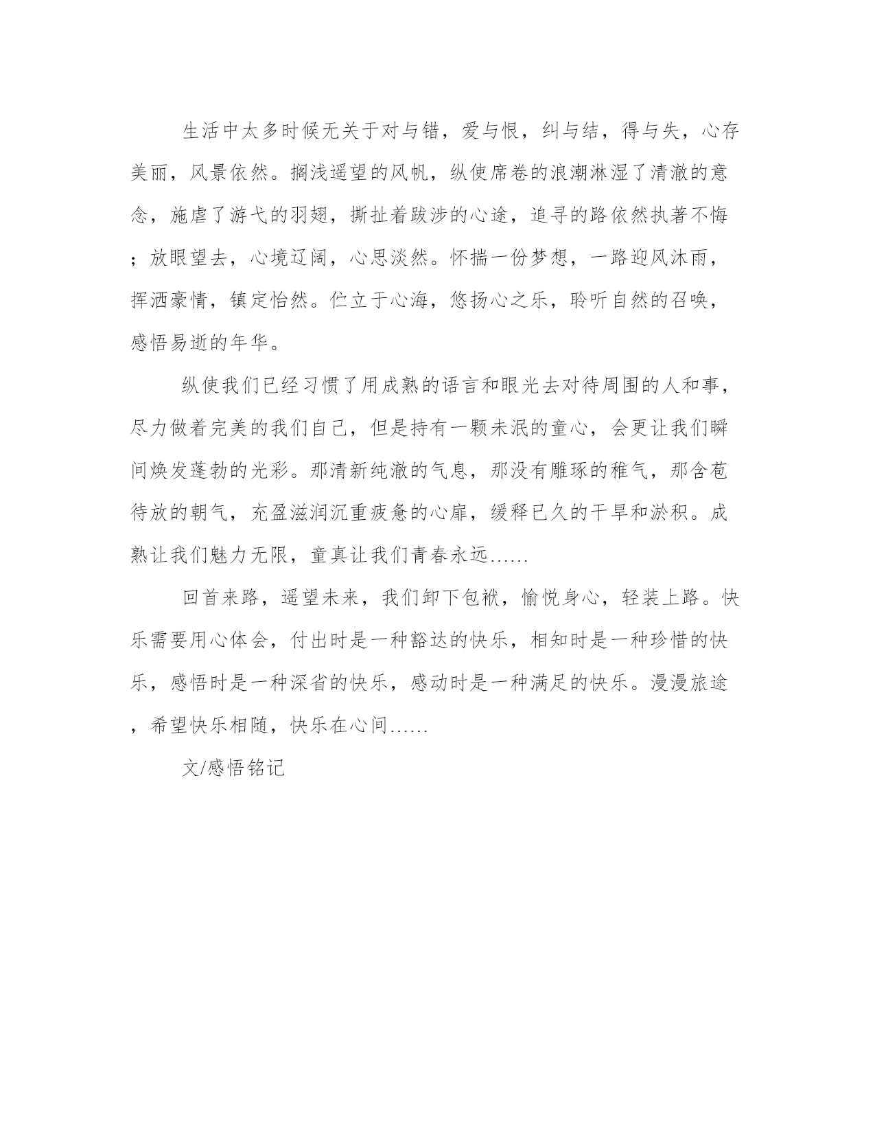 给忙碌的节奏加上舒缓的节拍【www.sxqingyun.com--热门资讯】在岁月的行程里,我们看到了自己的忙碌,收获着自己的充实,体味着生活的真实,品味着生活的乐趣。即便会遇到暴雨侵袭,会遭受风沙狂卷,一份安然的心境会让我们从容对待,直面一切艰难。放松心态,给心深呼吸,给爱来供氧,给忙碌的节奏加上舒缓的节拍,给紧绷的神经融入音乐的幻彩……仰望生活的高山,我们竭尽全力,却无力登至顶巅,但此时攀援的坚定脚步已让你收获一份追逐的乐趣,追逐的过程苦中可见美丽,它蓄积了真诚和努力,它储备着能量和韧力,它释放着梦想和希翼,微笑着投入前行的路途,一路的风景尽收眼底,结局如何已不再重要。享受生命,爱坚强的自己,会保存路途深处的凝望,守侯身边每一份执着的过往;若心黯然了,快乐就失去了颜色;若幸福丢失了,生活就没有了春色。若不能释放淤积,会压抑前进的路途;若不能畅然心扉,会淡漠与外界的交流。我们无法做到完美,只需做到问心无愧;无法左右世界,但可以选择人生;无力改变一切,却能释放自我!人,矛盾的结合体!也许难得糊涂才是一种超凡境界,竭尽完美本身就是一种缺憾。生活中太多时候无关于对与错,爱与恨,纠与结,得与失,心存美丽,风景依然。搁浅遥望的风帆,纵使席卷的浪潮淋湿了清澈的意念,施虐了游弋的羽翅,撕扯着跋涉的心途,追寻的路依然执著不悔;放眼望去,心境辽阔,心思淡然。怀揣一份梦想,一路迎风沐雨,挥洒豪情,镇定怡然。伫立于心海,悠扬心之乐,聆听自然的召唤,感悟易逝的年华。纵使我们已经习惯了用成熟的语言和眼光去对待周围的人和事,尽力做着完美的我们自己,但是持有一颗未泯的童心,会更让我们瞬间焕发蓬勃的光彩。那清新纯澈的气息,那没有雕琢的稚气,那含苞待放的朝气,充盈滋润沉重疲惫的心扉,缓释已久的干旱和淤积。成熟让我们魅力无限,童真让我们青春永远……回首来路,遥望未来,我们卸下包袱,愉悦身心,轻装上路。快乐需要用心体会,付出时是一种豁达的快乐,相知时是一种珍惜的快乐,感悟时是一种深省的快乐,感动时是一种满足的快乐。漫漫旅途,希望快乐相随,快乐在心间……文/感悟铭记