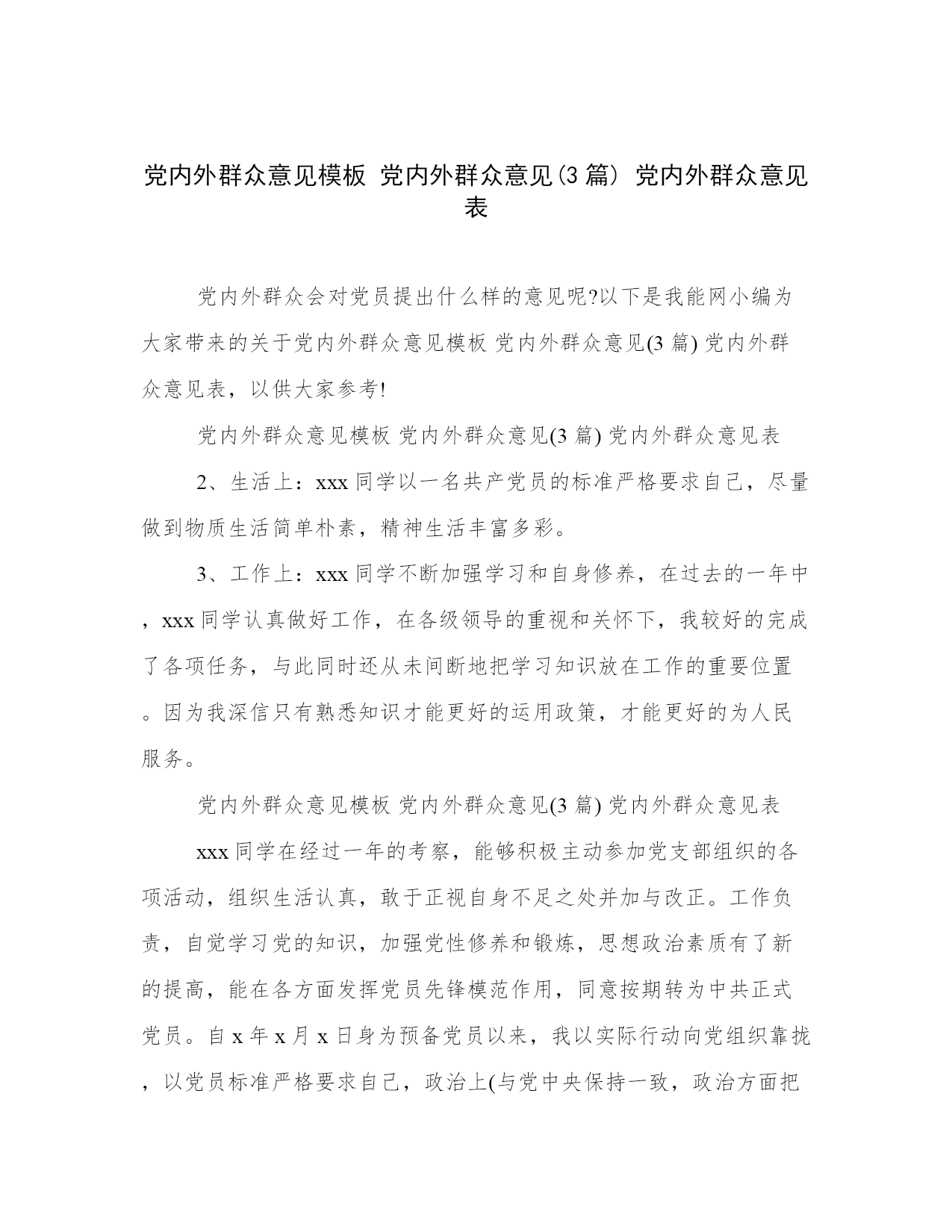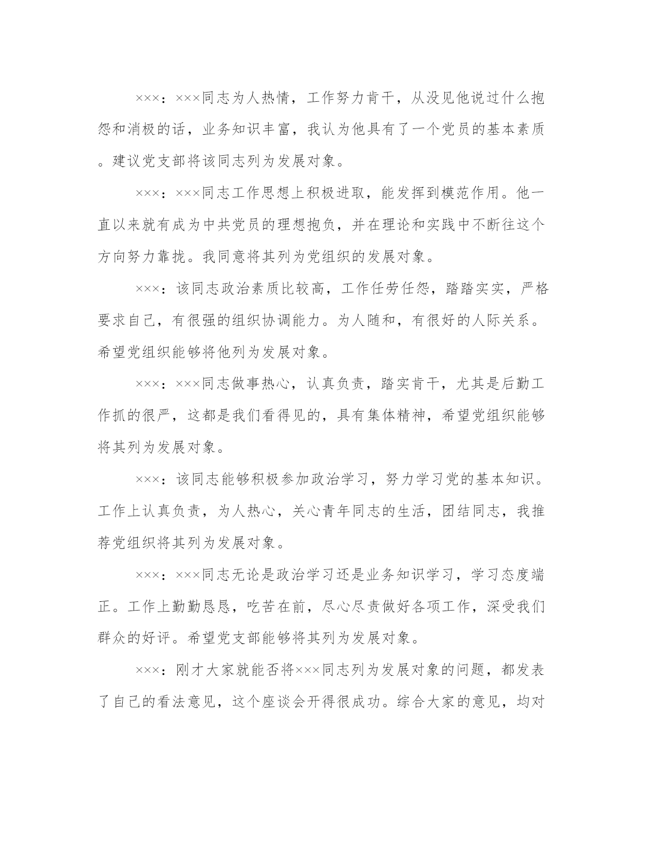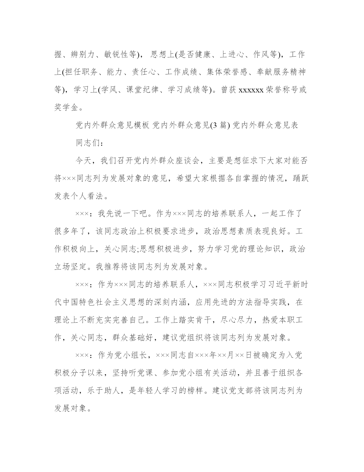 党内外群众意见模板党内外群众意见(3篇)党内外群众意见表党内外群众会对党员提出什么样的意见呢?以下是我能网小编为大家带来的关于党内外群众意见模板党内外群众意见(3篇)党内外群众意见表,以供大家参考!党内外群众意见模板党内外群众意见(3篇)党内外群众意见表2、生活上:xxx同学以一名共产党员的标准严格要求自己,尽量做到物质生活简单朴素,精神生活丰富多彩。3、工作上:xxx同学不断加强学习和自身修养,在过去的一年中,xxx同学认真做好工作,在各级领导的重视和关怀下,我较好的完成了各项任务,与此同时还从未间断地把学习知识放在工作的重要位置。因为我深信只有熟悉知识才能更好的运用政策,才能更好的为人民服务。党内外群众意见模板党内外群众意见(3篇)党内外群众意见表xxx同学在经过一年的考察,能够积极主动参加党支部组织的各项活动,组织生活认真,敢于正视自身不足之处并加与改正。工作负责,自觉学习党的知识,加强党性修养和锻炼,思想政治素质有了新的提高,能在各方面发挥党员先锋模范作用,同意按期转为中共正式党员。自x年x月x日身为预备党员以来,我以实际行动向党组织靠拢,以党员标准严格要求自己,政治上(与党中央保持一致,政治方面把握、辨别力、敏锐性等),思想上(是否健康、上进心、作风等),工作上(担任职务、能力、责任心、工作成绩、集体荣誉感、奉献服务精神等),学习上(学风、课堂纪律、学习成绩等)。曾获xxxxxx荣誉称号或奖学金。党内外群众意见模板党内外群众意见(3篇)党内外群众意见表同志们:今天,我们召开党内外群众座谈会,主要是想征求下大家对能否将×××同志列为发展对象的意见,希望大家根据各自掌握的情况,踊跃发表个人看法。×××:我先说一下吧。作为×××同志的培养联系人,一起工作了很多年了,该同志政治上积极要求进步,政治思想素质表现良好。工作积极向上,关心同志;思想积极进步,努力学习党的理论知识,政治立场坚定。我推荐将该同志列为发展对象。×××:作为×××同志的培养联系人,×××同志积极学习习近平新时代中国特色社会主义思想的深刻内涵,应用先进的方法指导实践,在理论上不断充实完善自己。工作上踏实肯干,尽心尽力,热爱本职工作,关心同志,群众基础好,建议党组织将该同志列为发展对象。×××:作为党小组长,×××同志自×××年××月××日被确定为入党积极分子以来,坚持听党课、参加党小组有关活动,并且善于组织各项活动,乐于助人,是年轻人学习的榜样。建议党支部将该同志列为发展对象。×××:×××同志为人热情,工作努力肯干,从没见他说过什么抱怨和消极的话,业务知识丰富,我认为他具有了一个党员的基本素质。建议党支部将该同志列为发展对象。×××:×××同志工作思想上积极进取,能发挥到模范作用。他一直以来就有成为中共党员的理想抱负,并在理论和实践中不断往这个方向努力靠拢。我同意将其列为党组织的发展对象。×××:该同志政治素质比较高,工作任劳任怨,踏踏实实,严格要求自己,有很强的组织协调能力。为人随和,有很好的人际关系。希望党组织能够将他列为发展对象。×××:×××同志做事热心,认真负责,踏实肯干,尤其是后勤工作抓的很严,这都是我们看得见的,具有集体精神,希望党组织能够将其列为发展对象。×××:该同志能够积极参加政治学习,努力学习党的基本知识。工作上认真负责,为人热心,关心青年同志的生活,团结同志,我推荐党组织将其列为发展对象。×××:×××同志无论是政治学习还是业务知识学习,学习态度端正。工作上勤勤恳恳,吃苦在前,尽心尽责做好各项工作,深受我们群众的好评。希望党支部能够将其列为发展对象。×××:刚才大家就能否将×××同志列为发展对象的问题,都发表了自己的看法意见,这个座谈会开得很成功。综合大家的意见,均对推荐将×××同志列为发展对象,党支部将采纳各位提出的意见,谢谢大家。主持人签名:×××年××月××日