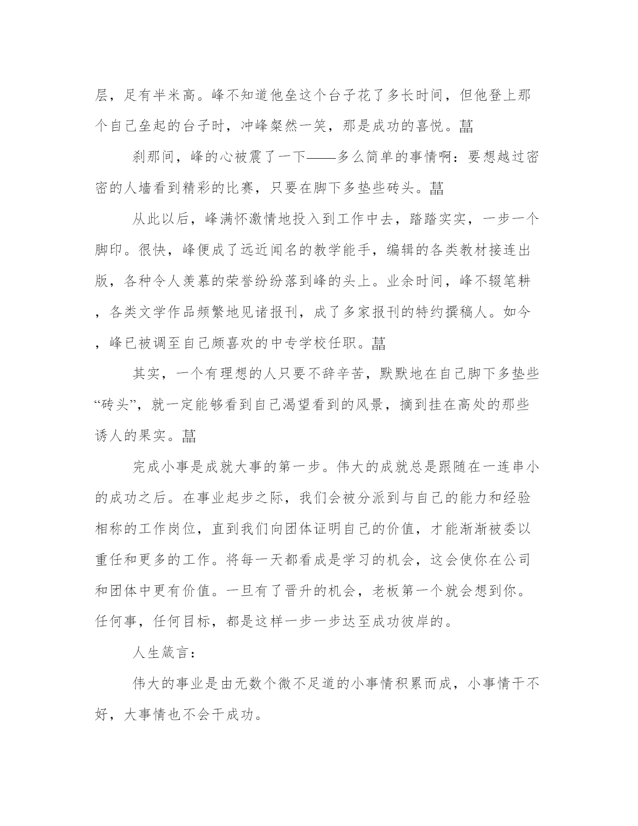 小事情干不好,大事情也不会干成功【www.sxqingyun.com--小学作文】大学刚毕业那会儿,峰被分配到一个偏远的林区小镇当教师,工资低得可怜。其实峰有着不少优势,教学基本功不错,还擅长写作。于是,峰一边抱怨命运不公,一边羡慕那些拥有一份体面的工作、拿一份优厚的薪水的同窗。这样一来,他不仅对工作没了热情,而且连写作也没兴趣。峰整天琢磨着“跳槽”,幻想能有机会调换一个好的工作环境,也拿一份优厚的报酬。就这样两年时间匆匆过去了,峰的本质工作干得一塌糊涂,写作上也没有什么收获。这期间,峰试着联系了几个自己喜欢的单位,但最终没有一个接纳他。然而,后来发生的一件微不足道的小事,改变了峰一直想改变的命运。那天学校开运动会,这在文化活动极其贫乏的小镇,无疑是件大事,因而前来观看的人特别多。小小的操场四周很快围出一道密不透风的环形人墙。峰来晚了,站在人墙后面,翘起脚也看不到里面热闹的情景。这时,身旁一个很矮的小男孩吸引了峰的视线。只见他一趟趟地从不远处搬来砖头,在那厚厚的人墙后面,耐心地垒着一个台子,一层又一层,足有半米高。峰不知道他垒这个台子花了多长时间,但他登上那个自己垒起的台子时,冲峰粲然一笑,那是成功的喜悦。刹那间,峰的心被震了一下——多么简单的事情啊:要想越过密密的人墙看到精彩的比赛,只要在脚下多垫些砖头。从此以后,峰满怀激情地投入到工作中去,踏踏实实,一步一个脚印。很快,峰便成了远近闻名的教学能手,编辑的各类教材接连出版,各种令人羡慕的荣誉纷纷落到峰的头上。业余时间,峰不辍笔耕,各类文学作品频繁地见诸报刊,成了多家报刊的特约撰稿人。如今,峰已被调至自己颇喜欢的中专学校任职。其实,一个有理想的人只要不辞辛苦,默默地在自己脚下多垫些“砖头”,就一定能够看到自己渴望看到的风景,摘到挂在高处的那些诱人的果实。完成小事是成就大事的第一步。伟大的成就总是跟随在一连串小的成功之后。在事业起步之际,我们会被分派到与自己的能力和经验相称的工作岗位,直到我们向团体证明自己的价值,才能渐渐被委以重任和更多的工作。将每一天都看成是学习的机会,这会使你在公司和团体中更有价值。一旦有了晋升的机会,老板第一个就会想到你。任何事,任何目标,都是这样一步一步达至成功彼岸的。人生箴言:伟大的事业是由无数个微不足道的小事情积累而成,小事情干不好,大事情也不会干成功。成功不一定是做大事,把一件小事做好,并且持之以恒地做好每一件事,这也是成功的基本要素。