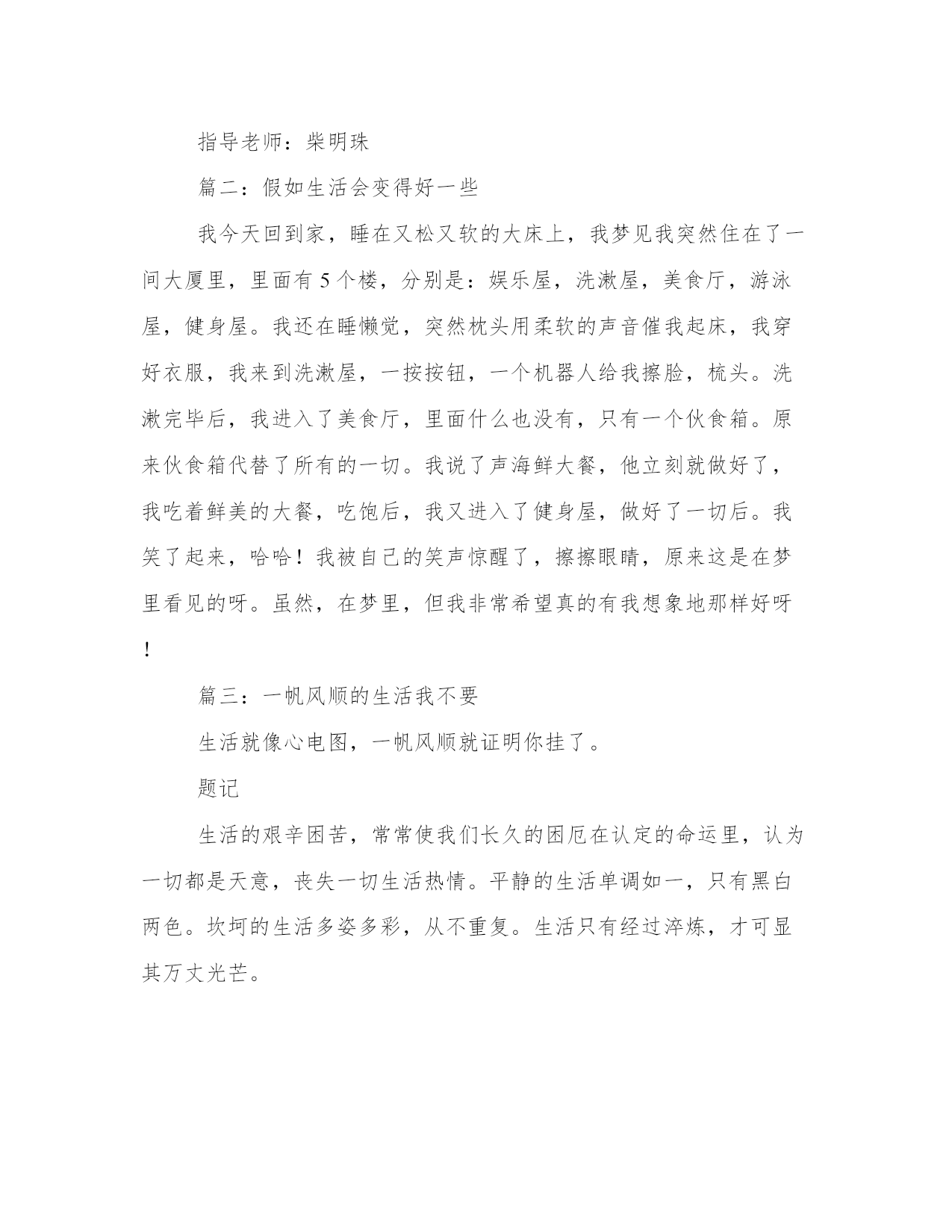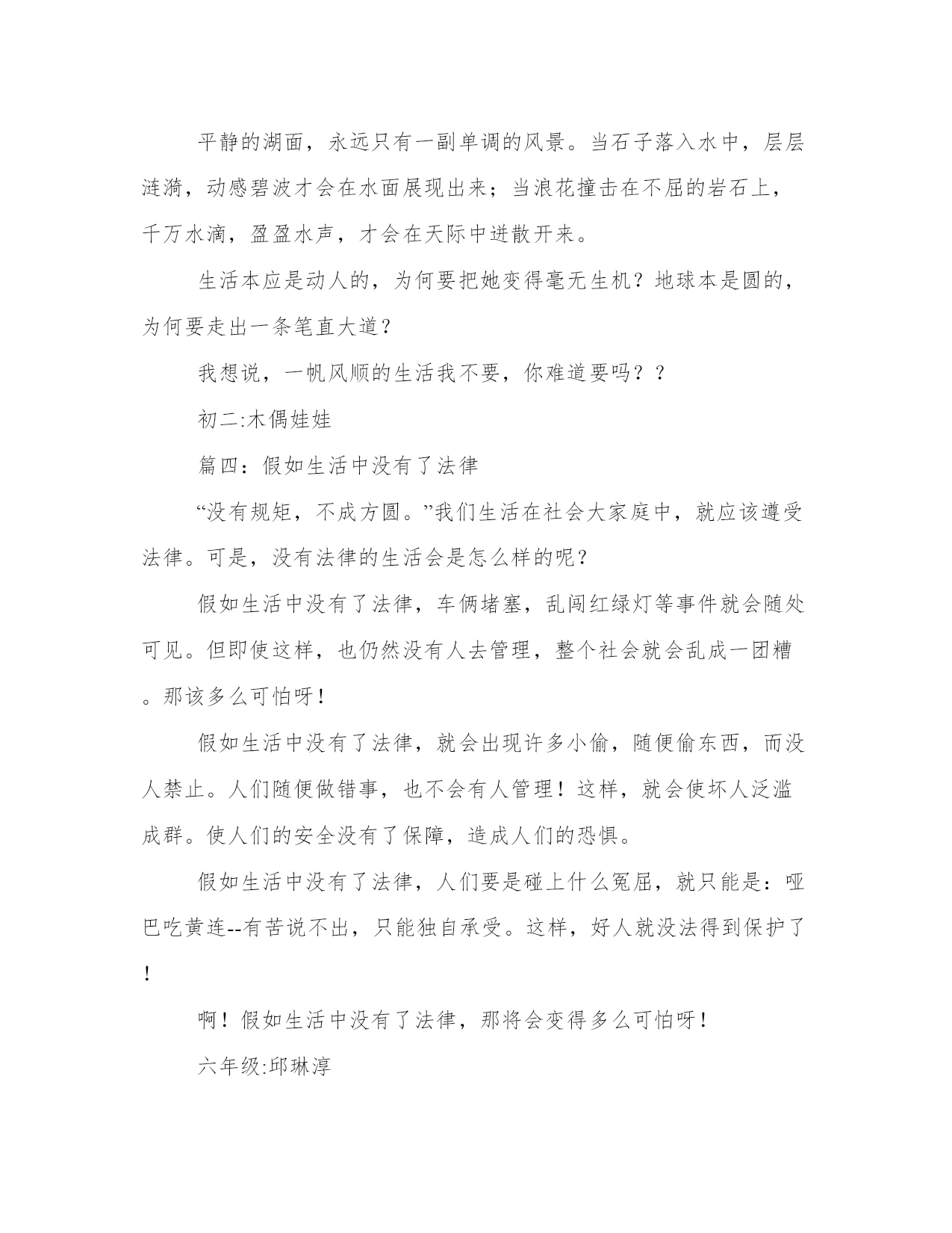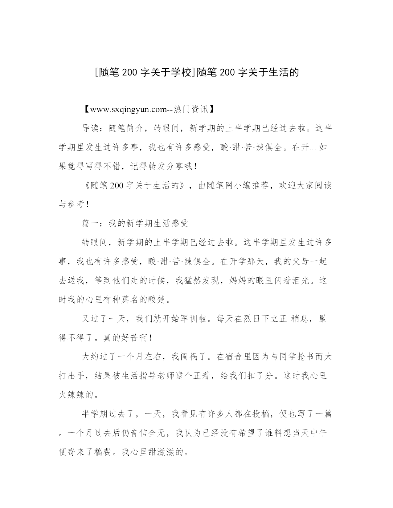 [随笔200字关于学校]随笔200字关于生活的【www.sxqingyun.com--热门资讯】导读:随笔简介,转眼间,新学期的上半学期已经过去啦。这半学期里发生过许多事,我也有许多感受,酸·甜·苦·辣俱全。在开...如果觉得写得不错,记得转发分享哦!《随笔200字关于生活的》,由随笔网小编推荐,欢迎大家阅读与参考!篇一:我的新学期生活感受转眼间,新学期的上半学期已经过去啦。这半学期里发生过许多事,我也有许多感受,酸·甜·苦·辣俱全。在开学那天,我的父母一起去送我,等到他们走的时候,我猛然发现,妈妈的眼里闪着泪光。这时我的心里有种莫名的酸楚。又过了一天,我们就开始军训啦。每天在烈日下立正·稍息,累得不得了。真的好苦啊!大约过了一个月左右,我闯祸了。在宿舍里因为与同学抢书而大打出手,结果被生活指导老师逮个正着,给我们扣了分。这时我心里火辣辣的。半学期过去了,一天,我看见有许多人都在投稿,便也写了一篇。一个月过去后仍音信全无,我认为已经没有希望了谁料想当天中午便寄来了稿费。我心里甜滋滋的。指导老师:柴明珠篇二:假如生活会变得好一些我今天回到家,睡在又松又软的大床上,我梦见我突然住在了一间大厦里,里面有5个楼,分别是:娱乐屋,洗漱屋,美食厅,游泳屋,健身屋。我还在睡懒觉,突然枕头用柔软的声音催我起床,我穿好衣服,我来到洗漱屋,一按按钮,一个机器人给我擦脸,梳头。洗漱完毕后,我进入了美食厅,里面什么也没有,只有一个伙食箱。原来伙食箱代替了所有的一切。我说了声海鲜大餐,他立刻就做好了,我吃着鲜美的大餐,吃饱后,我又进入了健身屋,做好了一切后。我笑了起来,哈哈!我被自己的笑声惊醒了,擦擦眼睛,原来这是在梦里看见的呀。虽然,在梦里,但我非常希望真的有我想象地那样好呀!篇三:一帆风顺的生活我不要生活就像心电图,一帆风顺就证明你挂了。题记生活的艰辛困苦,常常使我们长久的困厄在认定的命运里,认为一切都是天意,丧失一切生活热情。平静的生活单调如一,只有黑白两色。坎坷的生活多姿多彩,从不重复。生活只有经过淬炼,才可显其万丈光芒。平静的湖面,永远只有一副单调的风景。当石子落入水中,层层涟漪,动感碧波才会在水面展现出来;当浪花撞击在不屈的岩石上,千万水滴,盈盈水声,才会在天际中迸散开来。生活本应是动人的,为何要把她变得毫无生机?地球本是圆的,为何要走出一条笔直大道?我想说,一帆风顺的生活我不要,你难道要吗??初二:木偶娃娃篇四:假如生活中没有了法律“没有规矩,不成方圆。”我们生活在社会大家庭中,就应该遵受法律。可是,没有法律的生活会是怎么样的呢?假如生活中没有了法律,车俩堵塞,乱闯红绿灯等事件就会随处可见。但即使这样,也仍然没有人去管理,整个社会就会乱成一团糟。那该多么可怕呀!假如生活中没有了法律,就会出现许多小偷,随便偷东西,而没人禁止。人们随便做错事,也不会有人管理!这样,就会使坏人泛滥成群。使人们的安全没有了保障,造成人们的恐惧。假如生活中没有了法律,人们要是碰上什么冤屈,就只能是:哑巴吃黄连--有苦说不出,只能独自承受。这样,好人就没法得到保护了!啊!假如生活中没有了法律,那将会变得多么可怕呀!六年级:邱琳淳篇五:路还要走,生活还要继续不要再颓废了天空一样还是蓝色不要再怀念了过去终究是过去的我们都在慢慢长大也慢慢发现身边的人和事不是一直都存在的我知道我们同样有苦不堪言的过去所有的记忆都在脑海也许从未散去每天都想着听着重复做着同样的事情同样的我们同样的悲伤同样是叹息和往常一样打开电脑看着留言消息有些人稍微怠慢开小号说我是垃圾我知道我唯一能做的就是一笑而过我明白一切都是自找的何必庸人自扰呢干嘛要去计较呢一切都会变好的我总是在自我安慰自我陶醉不知不觉我已经感觉不到疲惫不知道该怎样做才能不感到失落为什么我很努力却没有结果不奢望把谁看透也许这就是借口自己选择的路就要坚持的走高一:刘艳蓉感谢阅读《随笔200字关于生活的》,欢迎持续关注随笔网,小编将为您推荐更多精彩内容!