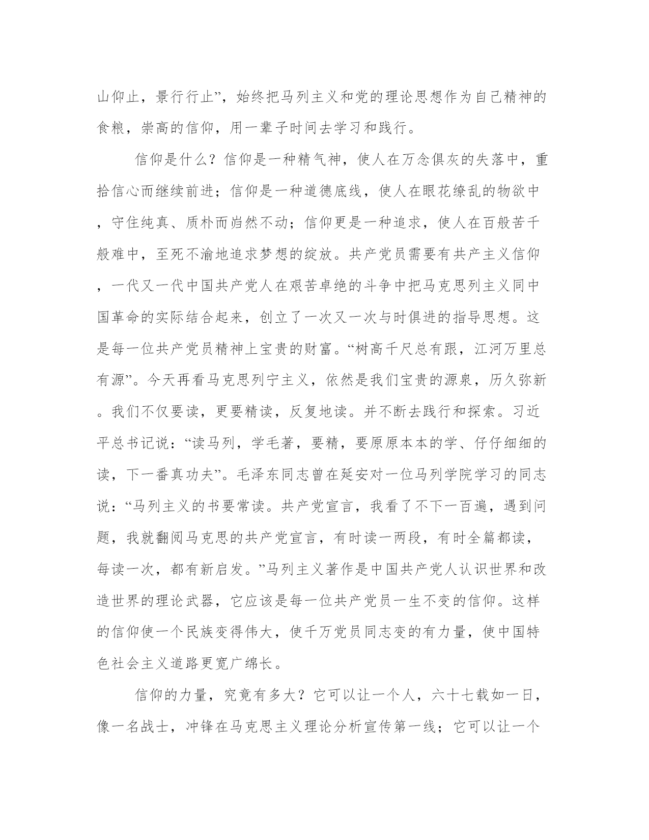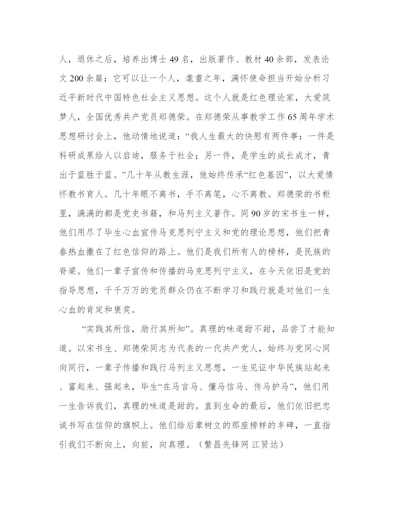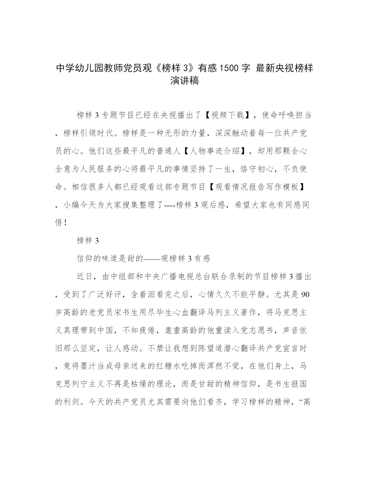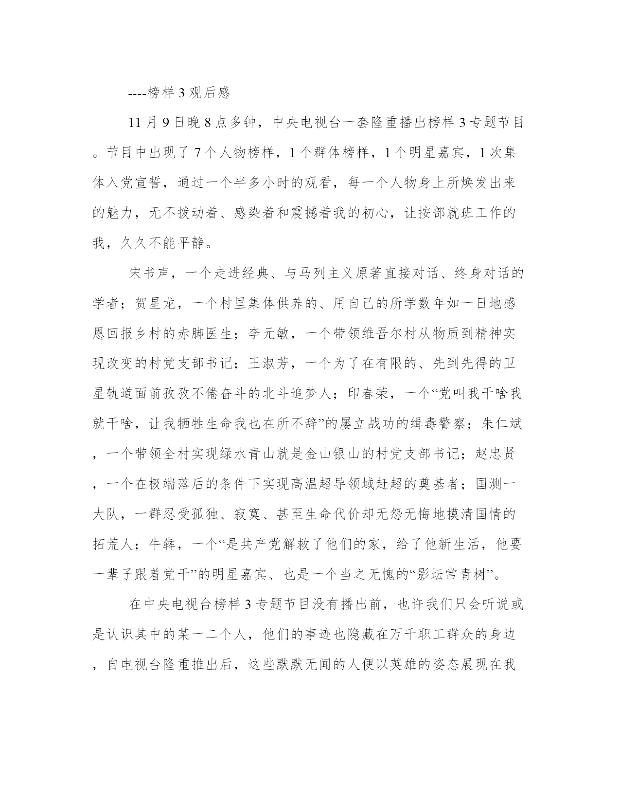 中学幼儿园教师党员观《榜样3》有感1500字最新央视榜样演讲稿榜样3专题节目已经在央视播出了【视频下载】,使命呼唤担当,榜样引领时代。榜样是一种无形的力量,深深触动着每一位共产党员的心。他们这些最平凡的普通人【人物事迹介绍】,却用那颗全心全意为人民服务的心将最平凡的事情坚持了一生,恪守初心,不负使命。相信很多人都已经观看这部专题节目【观看情况报告写作模板】,小编今天为大家搜集整理了----榜样3观后感,希望大家也有同感同悟!榜样3信仰的味道是甜的——观榜样3有感近日,由中组部和中央广播电视总台联合录制的节目榜样3播出,受到了广泛好评,含着泪看完之后,心情久久不能平静。尤其是90岁高龄的老党员宋书生用尽毕生心血翻译马列主义著作,将马克思主义真理带到中国,不知疲倦,耄耋高龄的他重读入党志愿书,声音依旧那么坚定,让人感动。不禁让我想到陈望道潜心翻译共产党宣言时,竟将墨汁当成母亲送来的红糖水吃掉而浑然不觉,在他们身上,马克思列宁主义不再是枯燥的理论,而是甘甜的精神信仰,是书生报国的利剑。今天的共产党员尤其需要向他们看齐,学习榜样的精神,“高山仰止,景行行止”,始终把马列主义和党的理论思想作为自己精神的食粮,崇高的信仰,用一辈子时间去学习和践行。信仰是什么?信仰是一种精气神,使人在万念俱灰的失落中,重拾信心而继续前进;信仰是一种道德底线,使人在眼花缭乱的物欲中,守住纯真、质朴而岿然不动;信仰更是一种追求,使人在百般苦千般难中,至死不渝地追求梦想的绽放。共产党员需要有共产主义信仰,一代又一代中国共产党人在艰苦卓绝的斗争中把马克思列主义同中国革命的实际结合起来,创立了一次又一次与时俱进的指导思想。这是每一位共产党员精神上宝贵的财富。“树高千尺总有跟,江河万里总有源”。今天再看马克思列宁主义,依然是我们宝贵的源泉,历久弥新。我们不仅要读,更要精读,反复地读。并不断去践行和探索。习近平总书记说:“读马列,学毛著,要精,要原原本本的学、仔仔细细的读,下一番真功夫”。毛泽东同志曾在延安对一位马列学院学习的同志说:“马列主义的书要常读。共产党宣言,我看了不下一百遍,遇到问题,我就翻阅马克思的共产党宣言,有时读一两段,有时全篇都读,每读一次,都有新启发。”马列主义著作是中国共产党人认识世界和改造世界的理论武器,它应该是每一位共产党员一生不变的信仰。这样的信仰使一个民族变得伟大,使千万党员同志变的有力量,使中国特色社会主义道路更宽广绵长。信仰的力量,究竟有多大?它可以让一个人,六十七载如一日,像一名战士,冲锋在马克思主义理论分析宣传第一线;它可以让一个人,退休之后,培养出博士49名,出版著作、教材40余部,发表论文200余篇;它可以让一个人,耄耋之年,满怀使命担当开始分析习近平新时代中国特色社会主义思想。这个人就是红色理论家,大爱筑梦人,全国优秀共产党员郑德荣。在郑德荣从事教学工作65周年学术思想研讨会上,他动情地说道:“我人生最大的快慰有两件事:一件是科研成果给人以启迪,服务于社会;另一件,是学生的成长成才,青出于蓝胜于蓝。”几十年从教生涯,他始终传承“红色基因”,以大爱情怀教书育人。几十年眼不离书,手不离笔,心不离教。郑德荣的书柜里,满满的都是党史书籍,和马列主义著作。同90岁的宋书生一样,他们用尽了毕生心血宣传马克思列宁主义和党的理论思想,他们把青春热血撒在了红色信仰的路上。他们是我们所有人的榜样,是民族的脊梁。他们一辈子宣传和传播的马克思列宁主义,在今天依旧是党的指导思想,千千万万的党员群众仍在不断学习和践行就是对他们一生心血的肯定和褒奖。“实践其所信,励行其所知”。真理的味道甜不甜,品尝了才能知道。以宋书生、郑德荣同志为代表的一代共产党人,始终与党同心同向同行,一辈子传播和践行马列主义思想,一生见证中华民族站起来、富起来、强起来,毕生“在马言马、懂马信马、传马护马”,他们用一生告诉我们,真理的味道是甜的。直到生命的最后,他们依旧把忠诚书写在信仰的旗帜上。他们给后辈树立的那座榜样的丰碑,一直指引我们不断向上,向前,向真理。(繁昌先锋网江贤达)----榜样3观后感11月9日晚8点多钟,中央电视台一套隆重播出榜样3专题节目。节目中出现了7个人物榜样,1个群体榜样,1个明星嘉宾,1次集体入党宣誓,通过一个半多小时的观看,每一个人物身上所焕发出来的魅力,无不拨动着、感染着和震撼着我的初心,让按部就班工作的我,久久不能平静。宋书声,一个走进经典、与马列主义原著直接对话、终身对话的学者;贺星龙,一个村里集体供养的、用自己的所学数年如一日地感恩回报乡村的赤脚医生;李元敏,一个带领维吾尔村从物质到精神实现改变的村党支部书记;王淑芳,一个为了在有限的、先到先得的卫星轨道面前孜孜不倦奋斗的北斗追梦人;印春荣,一个“党叫我干啥我就干啥,让我牺牲生命我也在所不辞”的屡立