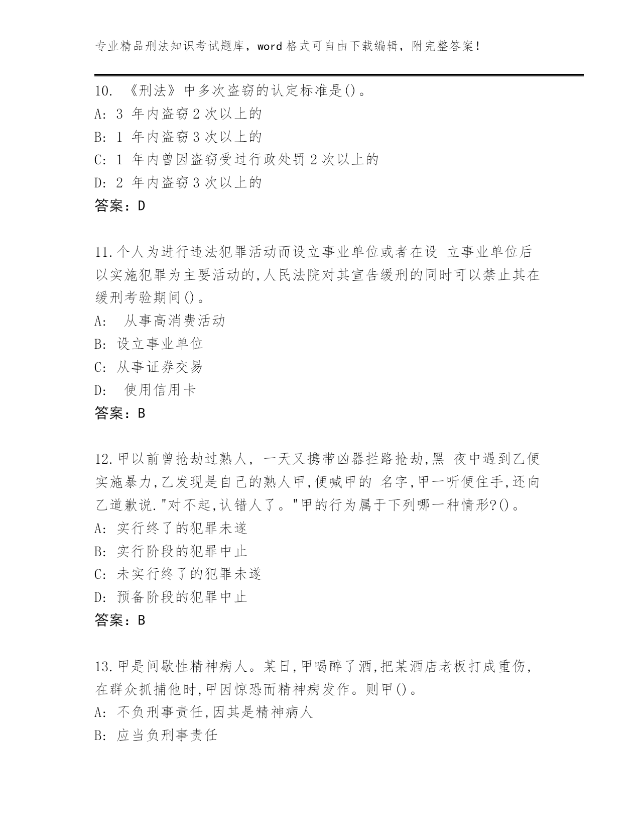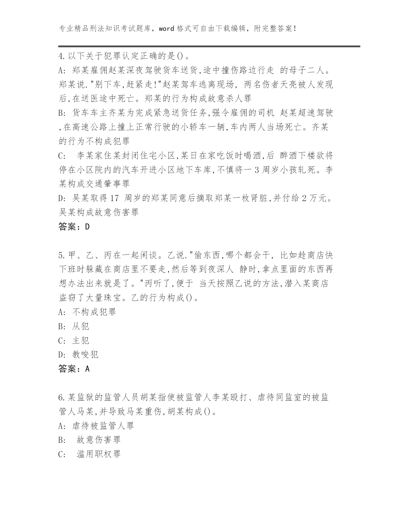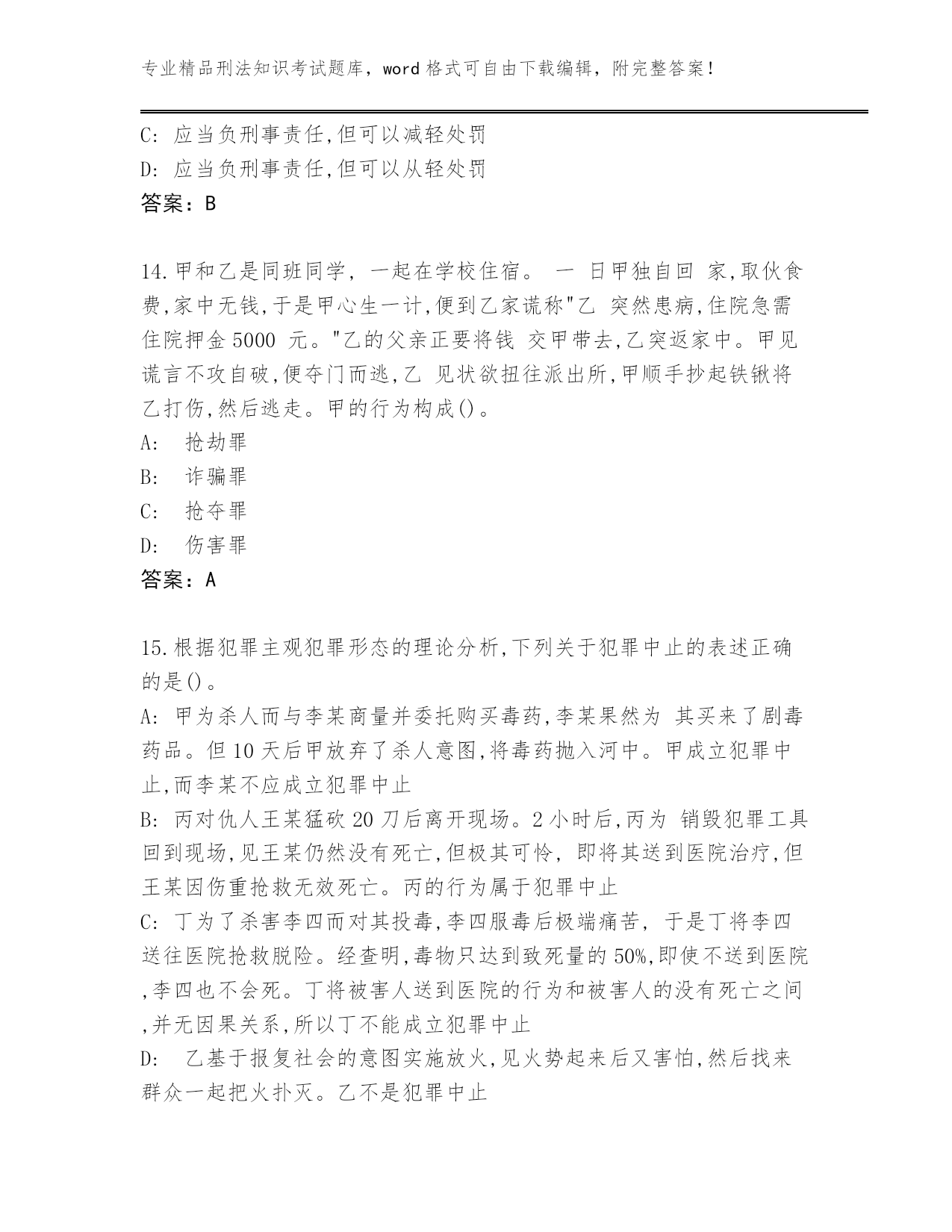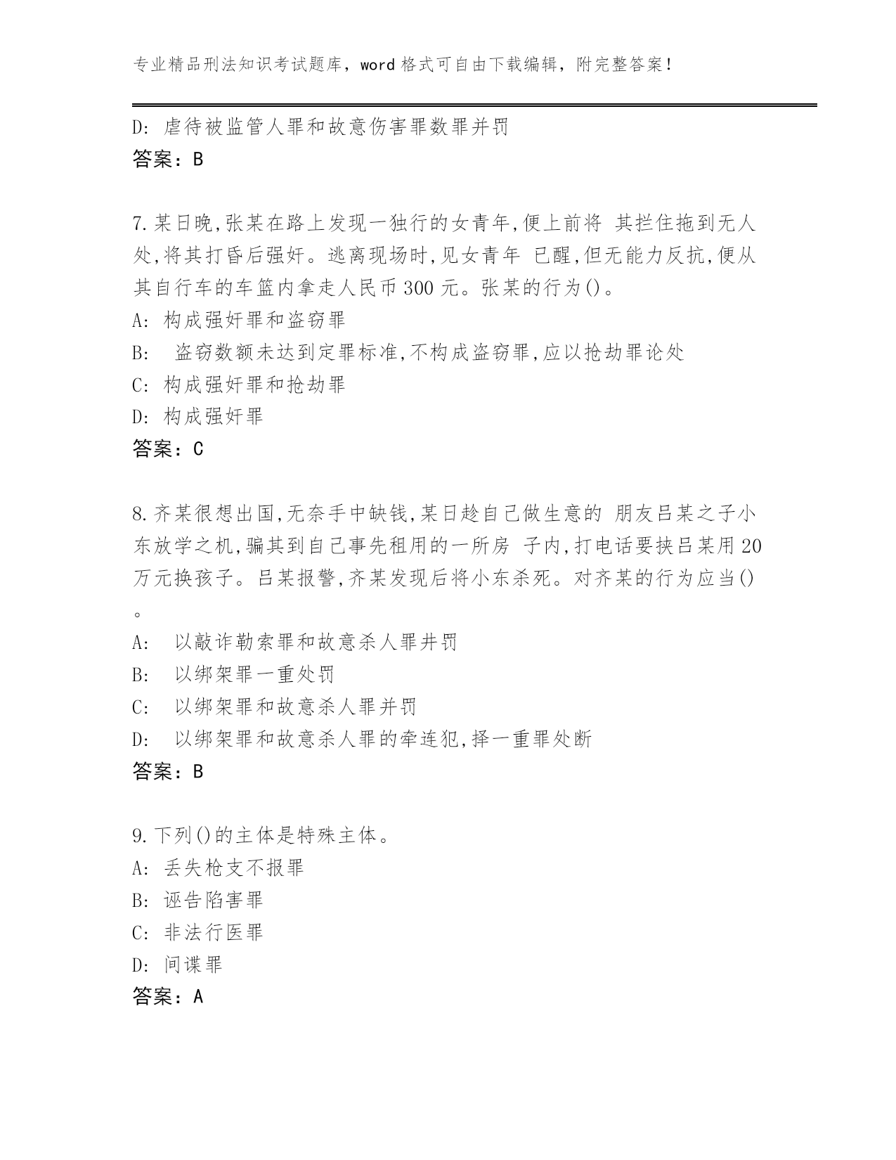 专业精品刑法知识考试题库,word格式可自由下载编辑,附完整答案!完整版刑法知识考试免费答案第I部分单选题(50题)1.胡某到某银行实施抢劫,到达银行后,发现周围停有多辆警车,并有警察在活动,感到无法下手,遂返回。胡某的行为属于()。A:没有犯罪行为B:犯罪中止C:犯罪未遂D:犯罪预备答案:D2.关于单位犯罪的主体,下列选项错误的是()。A:依法配置枪支的单位,可以成为非法出借枪支犯罪的主体B:为进行违法犯罪活动而设立的事业单位,或者事业单位设立后,以实施犯罪为主要活动的,不能成为单位犯罪的主体C:不具有法人资格的私营企业,也可以成为单位犯罪的主体D:《刑法》分则规定的只能由单位构成的犯罪,不可能由自然人单独实施答案:C3.对下列()实施防卫行为造成不法侵害人伤亡的,不负刑事责任。A:盗窃罪B:走私罪C:妨害公务罪D:抢劫罪答案:D4.以下关于犯罪认定正确的是()。A:郑某雇佣赵某深夜驾驶货车送货,途中撞伤路边行走的母子二人。郑某说."别下车,赶紧走!"赵某驾车逃离现场,两名伤者天亮被人发现后,在送医途中死亡。郑某的行为构成故意杀人罪B:货车车主齐某为完成紧急送货任务,强令雇佣的司机赵某超速驾驶,在高速公路上撞上正常行驶的小轿车一辆,车内两人当场死亡。齐某的行为不构成犯罪C:李某家住某封闭住宅小区,某日在家吃饭时喝酒,后醉酒下楼欲将停在小区院内的汽车开进小区地下车库,不慎将一3周岁小孩轧死。李某构成交通肇事罪D:吴某取得17周岁的郑某同意后摘取郑某一枚肾脏,并付给2万元。吴某构成故意伤害罪答案:D5.甲、乙、丙在一起闲谈。乙说."偷东西,哪个都会干,比如趁商店快下班时躲藏在商店里不要走,然后等到夜深人静时,拿点里面的东西再想办法出来就是了。"丙听了,便于当天按照乙说的方法,潜入某商店盗窃了大量珠宝。乙的行为构成()。A:不构成犯罪B:从犯C:主犯D:教唆犯答案:A6.某监狱的监管人员胡某指使被监管人李某殴打、虐待同监室的被监管人马某,并导致马某重伤,胡某构成()。A:虐待被监管人罪B:故意伤害罪C:滥用职权罪D:虐待被监管人罪和故意伤害罪数罪并罚答案:B7.某日晚,张某在路上发现一独行的女青年,便上前将其拦住拖到无人处,将其打昏后强奸。逃离现场时,见女青年已醒,但无能力反抗,便从其自行车的车篮内拿走人民币300元。张某的行为()。A:构成强奸罪和盗窃罪B:盗窃数额未达到定罪标准,不构成盗窃罪,应以抢劫罪论处C:构成强奸罪和抢劫罪D:构成强奸罪答案:C8.齐某很想出国,无奈手中缺钱,某日趁自己做生意的朋友吕某之子小东放学之机,骗其到自己事先租用的一所房子内,打电话要挟吕某用20万元换孩子。吕某报警,齐某发现后将小东杀死。对齐某的行为应当()。A:以敲诈勒索罪和故意杀人罪井罚B:以绑架罪一重处罚C:以绑架罪和故意杀人罪并罚D:以绑架罪和故意杀人罪的牵连犯,择一重罪处断答案:B9.下列()的主体是特殊主体。A:丢失枪支不报罪B:诬告陷害罪C:非法行医罪D:间谍罪答案:A10.《刑法》中多次盗窃的认定标准是()。A:3年内盗窃2次以上的B:1年内盗窃3次以上的C:1年内曾因盗窃受过行政处罚2次以上的D:2年内盗窃3次以上的答案:D11.个人为进行违法犯罪活动而设立事业单位或者在设立事业单位后以实施犯罪为主要活动的,人民法院对其宣告缓刑的同时可以禁止其在缓刑考验期间()。A:从事高消费活动B:设立事业单位C:从事证券交易D:使用信用卡答案:B12.甲以前曾抢劫过熟人,一天又携带凶器拦路抢劫,黑夜中遇到乙便实施暴力,乙发现是自己的熟人甲,便喊甲的名字,甲一听便住手,还向乙道歉说."对不起,认错人了。"甲的行为属于下列哪一种情形?()。A:实行终了的犯罪未遂B:实行阶段的犯罪中止C:未实行终了的犯罪未遂D:预备阶段的犯罪中止答案:B13.甲是间歇性精神病人。某日,甲喝醉了酒,把某酒店老板打成重伤,在群众抓捕他时,甲因惊恐而精神病发作。则甲()。A:不负刑事责任,因其是精神病人B:应当负刑事责任C:应当负刑事责任,但可以减轻处罚D:应当负刑事责任,但可以从轻处罚答案:B14.甲和乙是同班同学,一起在学校住宿。一日甲独自回家,取伙食费,家中无钱,于是甲心生一计,便到乙家谎称"乙突然患病,住院急需住院押金5000元。"乙的父亲正要将钱交甲带去,乙突返家中。甲见谎言不攻自破,便夺门而逃,乙见状欲扭往派出所,甲顺手抄起铁锹将乙打伤,然后逃走。甲的行为构成()。A:抢劫罪B:诈骗罪C:抢夺罪D:伤害罪答案:A15.根据犯罪主观犯罪形态的理论分析,下列关于犯罪中止的表述正确的是()。A:甲为杀人而与李某商量并委托购买毒药,李某果然为其买来了剧毒药品。但10天后甲放弃了杀人意图,将毒药抛入河中。甲成立犯罪中止,而李某不应成立犯罪中止B:丙对仇人王某猛砍20