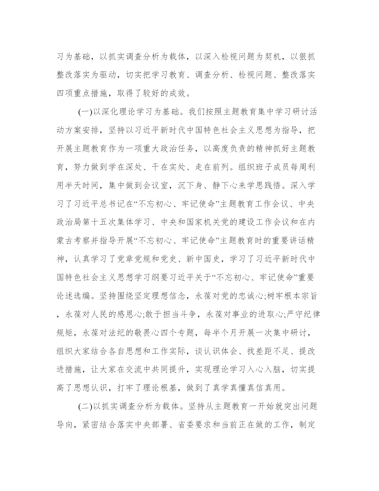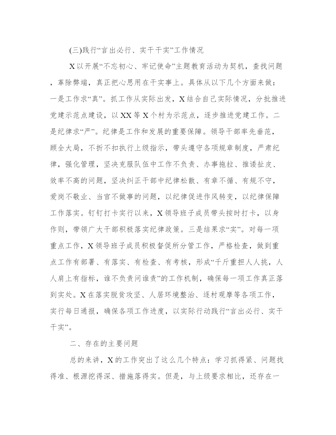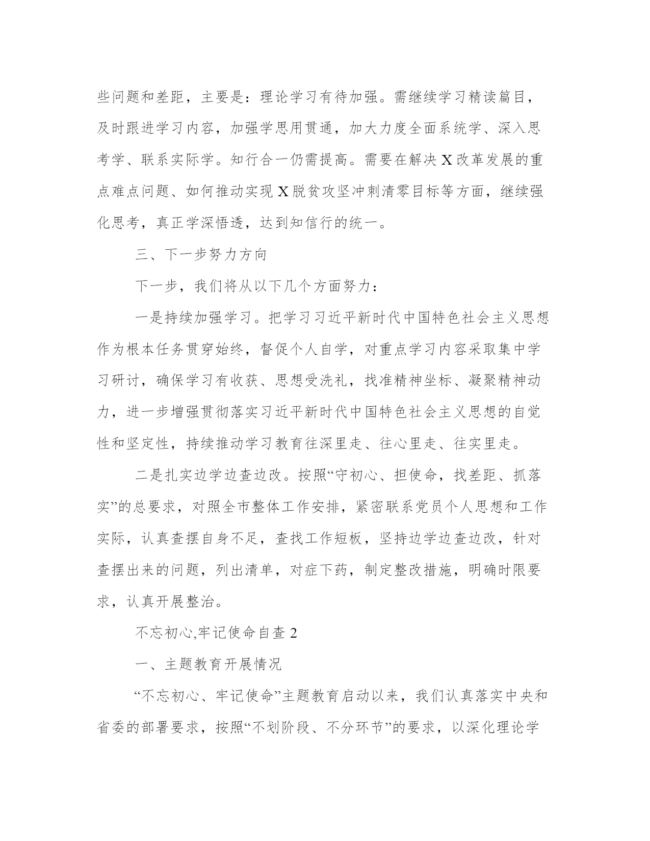 不忘初心,牢记使命自查3篇按照上级关于做好第二批主题教育评估工作的要求,我们通过广泛听取意见、随机测评、分析研判等方式,认真对我局和各党支部开展主题教育的情况进行自查评估,现将有关情况报告如下。下面是本站为大家带来的不忘初心,牢记使命自查3篇,希望能帮助到大家!不忘初心,牢记使命自查1“不忘初心、牢记使命”主题教育开展以来,X紧紧围绕根本任务、牢牢把握“十二字”总要求、紧扣五大目标、坚持四个“贯穿始终”,以优良作风抓好主题教育各项工作落实,推动主题教育取得了阶段性成效。按照会议要求,现将X主题教育开展情况作简要汇报如下:一、工作情况(一)工作进展情况一是组织领导到位。成立了X党委书记X同志任组长,其他班子成员为副组长的X主题教育领导小组,领导小组下设办公室,分管领导X兼任办公室主任。组织召开X主题教育动员部署会,及时跟进传达学习习近平总书记在“不忘初心、牢记使命”主题教育工作会议、中央政治局第十五次集体学习、省委书记XXX同志重要讲话精神,加强动员部署,深化思想发动,安排重点任务。二是统筹协调到位。深入学习中央关于在全党开展“不忘初心、牢记使命”主题教育的意见和省委实施方案,严格落实X月X日县委常委(扩大)会议精神,对重点任务做出安排部署,确保主题教育方向明、任务清。三是示范引领到位。X领导班子成员强化示范引领,党员干部广泛参与,力争使主题教育取得最好效果。深化交流研讨,坚持以X理论学习中心组学习为载体,在主题教育读书班上,各部门负责人、各村支部书记,围绕党的政治建设、全面从严治党等X个专题作了研讨交流。抓实支部学习教育,坚持党支部书记带头,各村支部书记要讲专题党课,每名党员干部都谈心得、谈体会,党员干部全员制定了自学计划,抓好自身学习。坚持以考促学、以学促知、以知促改,分X个批次组织X“不忘初心、牢记使命”主题教育应知应会测试,X所有党员干部参与,测试结果在X范围内通报。并在X月份组织乡党员干部观看党旗下的忏悔(二),以反面典型,警醒党员干部,鞭策党员干部以实际行动彰显新担当、展现新作为。(二)重点项目引进和建设工作情况乡党委、政府坚持招商引资工作是“天字号”工程,始终摆上议事日程,抓信息、盯项目,通过各方努力引资X亿元。分别是从X市引进投资X亿元的X有限公司项目,去年X月份签约,现在厂房建设正在进行中。该项目投入运营后,将带动我乡和周边乡镇XX等中草药的大规模种植,吸收X余名周边村民就业,产生年产值约X亿元的规模经济效益;投资X万元的中医药科技项目,落地在X;投资XX万元的XX项目和投资XX万元的XX公司,分别在XX和XX投入运营并已经取得了良好的经济效益。(三)践行“言出必行、实干干实”工作情况X以开展“不忘初心、牢记使命”主题教育活动为契机,查找问题,革除弊端,真正把心思用在干实事上。具体从以下几个方面来做:一是工作求“真”。抓工作从实际出发,X结合自己实际情况,分批推进党建示范点建设,以XX等X个村为示范点,逐步推进党建工作。二是纪律求“严”。纪律是工作和发展的重要保障。领导干部率先垂范,顾全大局,不折不扣执行上级指示,带头遵守各项规章制度,严肃纪律,强化管理,坚决克服队伍中工作不负责、办事拖拉、推诿扯皮、效率不高的问题,坚决纠正干部中纪律松散、有章不循、有规不守,爱岗不敬业、当官不做事的问题,以纪律促进作风转变,以纪律保障工作落实。钉钉打卡实行以来,X领导班子成员带头按时打卡,以身作则,带领广大干部积极落实纪律政策。三是结果求“实”。对每一项重点工作,X领导班子成员积极督促所分管工作,严格检查,做到重点工作有部署、有落实、有检查、有考核,形成“千斤重担人人挑,人人肩上有指标,谁不负责问谁责”的工作机制,确保每一项工作真正落到实处。X在落实脱贫攻坚、人居环境整治、逐村观摩等各项工作,实行每日通报,确保各项工作进度,以实际行动践行“言出必行、实干干实”。二、存在的主要问题总的来讲,X的工作突出了这么几个特点:学习抓得紧、问题找得准、根源挖得深、措施落得实。但是,与上级要求相比,还存在一些问题和差距,主要是:理论学习有待加强。需继续学习精读篇目,及时跟进学习内容,加强学思用贯通,加大力度全面系统学、深入思考学、联系实际学。知行合一仍需提高。需要在解决X改革发展的重点难点问题、如何推动实现X脱贫攻坚冲刺清零目标等方面,继续强化思考,真正学深悟透,达到知信行的统一。三、下一步努力方向下一步,我们将从以下几个方面努力:一是持续加强学习。把学习习近平新时代中国特色社会主义思想作为根本任务贯穿始终,督促个人自学,对重点学习内容采取集中学习研讨,确保学习有收获、思想受洗礼,找准精神坐标、凝聚精神动力,进一步增强贯彻落实习近平新时代中国特色社会主义思想的自觉性和坚定性,持续推动学习教育往深里走、往心里走、往实里走。二是扎实边学边查边改