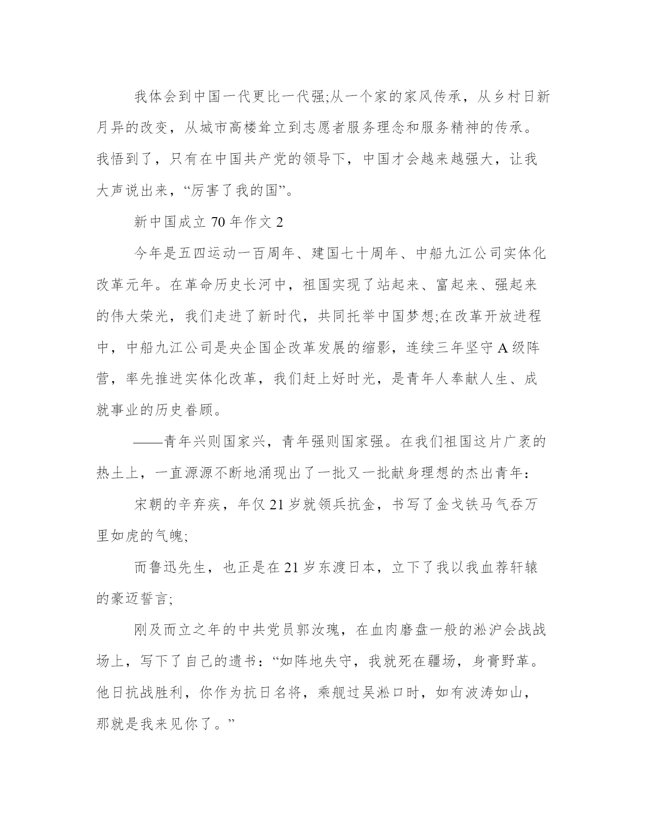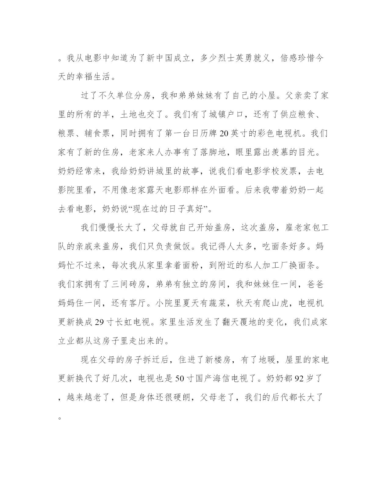 新中国成立70年作文三篇我们这一辈被父母认为是最幸福的一代,因为我们出生的时代没有文化大革命,没有大饥荒,也没有参与艰苦的伟大社会主义市场经济建设时期,我们是伴随着互联网的发展而成长的,也是第一批接触到五彩缤纷的互联网世界的人。本站精心为大家整理了新中国成立70年三篇,希望对你有帮助。提起我的祖国是从儿时抗战影片里,学到了没有强大的祖国,就没有我们今天的幸福生活。从地理课本上学到祖国有960万平方公里。从奶奶讲的故事里知道旧社会苦难的日子,一袋黑豆换来一家人的一个月的口粮!从父亲几次乔迁新居中,看到我们家的几十年变化。儿时在老家父母和爷爷奶奶在一起居住。全家人住的房子都是用黄土和麦草一起活成泥巴,用土坯盖的房子。家中拥有了第一套三间土房。门口有个小院,那是全家人齐心协力盖了好久,才住进去的新房。家里填了一台黑白14寸昆仑牌电视,还是父亲卖种西瓜和家里的猪羊钱才买的。当时有黑白电视家不多,我们家晚上经常聚集了好多人。家里有一个土炕,晚上父母和弟弟妹妹都在一起睡,而我却睡在奶奶家里。我总是喜欢听奶奶讲旧社会和新中国有什么不同,从故事里我萌萌懂懂地爱上了新中国。农场喇叭里每天都唱社会主义好,我也学会了这首歌曲,至今想起儿时记忆,总是会和这首歌曲连在一起。我从电影中知道为了新中国成立,多少烈士英勇就义,倍感珍惜今天的幸福生活。过了不久单位分房,我和弟弟妹妹有了自己的小屋。父亲卖了家里的所有的羊,土地也交了。我们有了城镇户口,还有了供应粮食、粮票、辅食票,同时拥有了第一台日历牌20英寸的彩色电视机。我们家有了新的住房,老家来人办事有了落脚地,眼里露出羡慕的目光。奶奶经常来,我给奶奶讲城里的故事,说我们看电影学校发票,去电影院里看,不用像老家露天电影那样在外面看。后来我带着奶奶一起去看电影,奶奶说“现在过的日子真好”。我们慢慢长大了,父母就自己开始盖房,这次盖房,雇老家包工队的亲戚来盖房,我们只负责做饭。我记得人太多,吃面条好多。妈妈忙不过来,每次我从家里拿着面粉,到附近的私人加工厂换面条。我们家拥有了三间砖房,弟弟有独立的房间,我和妹妹住一间,爸爸妈妈住一间,还有客厅。小院里夏天有蔬菜,秋天有爬山虎,电视机更新换成29寸长虹电视。家里生活发生了翻天覆地的变化,我们成家立业都从这房子里走出来的。现在父母的房子拆迁后,住进了新楼房,有了地暖,屋里的家电更新换代了好几次,电视也是50寸国产海信电视了。奶奶都92岁了,越来越老了,但是身体还很硬朗,父母老了,我们的后代都长大了。我体会到中国一代更比一代强;从一个家的家风传承,从乡村日新月异的改变,从城市高楼耸立到志愿者服务理念和服务精神的传承。我悟到了,只有在中国共产党的领导下,中国才会越来越强大,让我大声说出来,“厉害了我的国”。新中国成立70年作文2今年是五四运动一百周年、建国七十周年、中船九江公司实体化改革元年。在革命历史长河中,祖国实现了站起来、富起来、强起来的伟大荣光,我们走进了新时代,共同托举中国梦想;在改革开放进程中,中船九江公司是央企国企改革发展的缩影,连续三年坚守A级阵营,率先推进实体化改革,我们赶上好时光,是青年人奉献人生、成就事业的历史眷顾。——青年兴则国家兴,青年强则国家强。在我们祖国这片广袤的热土上,一直源源不断地涌现出了一批又一批献身理想的杰出青年:宋朝的辛弃疾,年仅21岁就领兵抗金,书写了金戈铁马气吞万里如虎的气魄;而鲁迅先生,也正是在21岁东渡日本,立下了我以我血荐轩辕的豪迈誓言;刚及而立之年的中共党员郭汝瑰,在血肉磨盘一般的淞沪会战战场上,写下了自己的遗书:“如阵地失守,我就死在疆场,身膏野革。他日抗战胜利,你作为抗日名将,乘舰过吴淞口时,如有波涛如山,那就是我来见你了。”国家危难之际,一批又一批的有志青年挺身而出,他们是华夏民族的铁骨精魂,是挺立潮头的英雄,是无数人心中的楷模!抚摸时代的丰碑,无数风华正茂的青年才俊献身革命、浴血奋战;站在改革的潮头,新时代呼唤一批又一批有志青年接续奋斗!青年朋友们,习近平总书记指出:“中国梦是历史的、现实的,也是未来的;是我们这一代的,更是青年一代的。中华民族伟大复兴的中国梦终将在一代代青年的接力奋斗中变为现实。”时代赋予了青年勇于献身事业,为实现中华民族伟大复兴的中国梦不懈奋斗的使命!对我们中船九江青年而言,必须有时不我待的勇气、舍我其谁的担当,肩负起服务国家战略、支撑国防建设、引领行业发展三大使命。勇立潮头、敢担重任、献身事业的时机正在当下,恰是此时——看啊!中船九江实体化改革的澎湃大幕已经拉起!功成不必在我,成功路上必定有我。现在的我,是在人事岗位上的一颗小小螺丝钉,回顾几年以来的工作历程,有一些我见到、听到的小故事,想和在座的朋友们一起分享:在加工车间有一名普通工人夏武林,在从事镗床加工的30年来,他默默扎根一线,献身