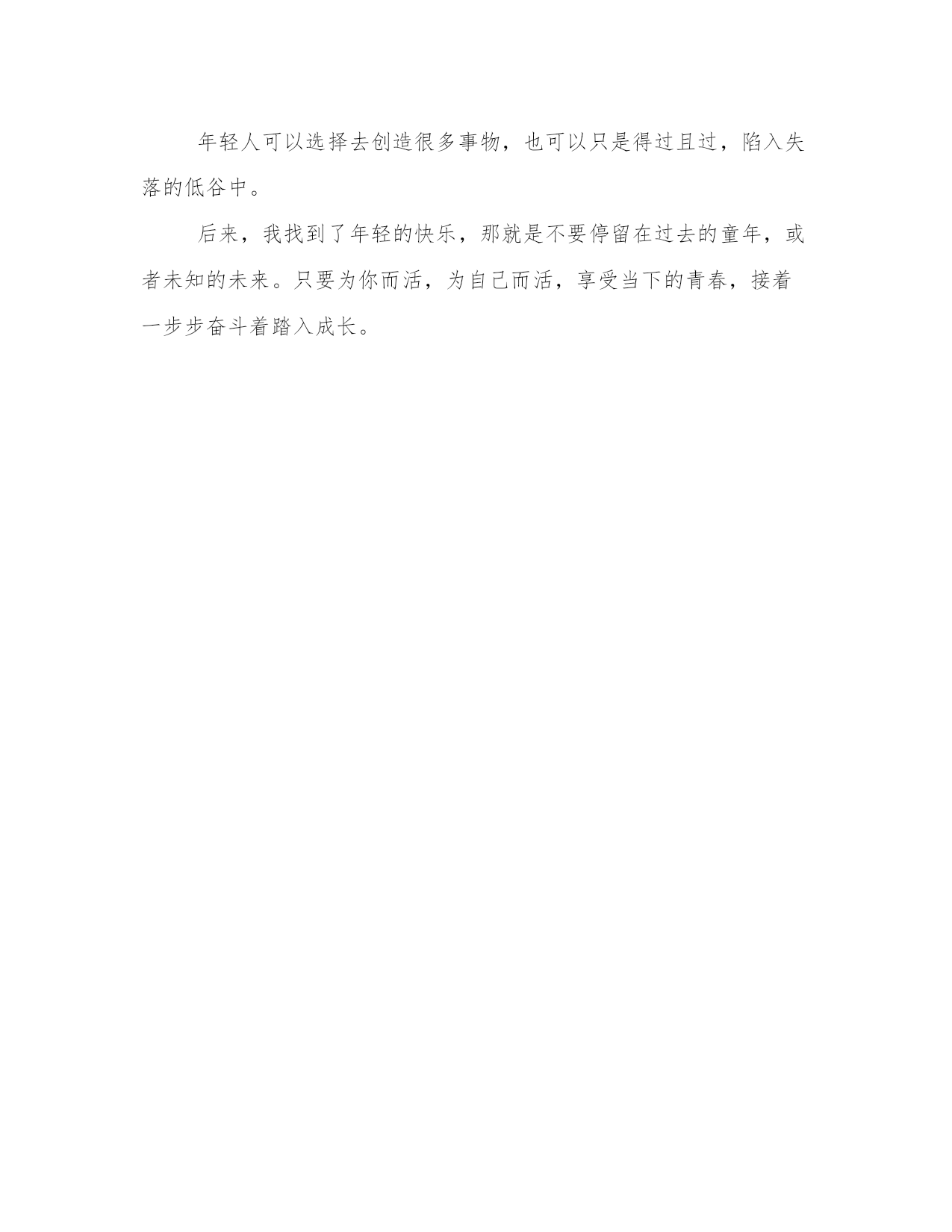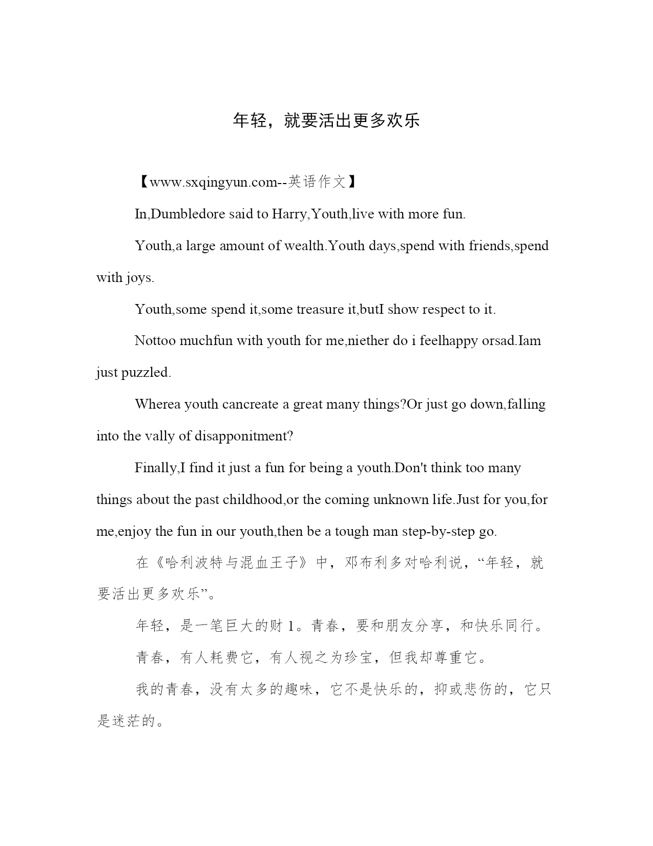 年轻,就要活出更多欢乐【www.sxqingyun.com--英语作文】In,DumbledoresaidtoHarry,Youth,livewithmorefun.Youth,alargeamountofwealth.Youthdays,spendwithfriends,spendwithjoys.Youth,somespendit,sometreasureit,butIshowrespecttoit.Nottoomuchfunwithyouthforme,nietherdoifeelhappyorsad.Iamjustpuzzled.Whereayouthcancreateagreatmanythings?Orjustgodown,fallingintothevallyofdisapponitment?Finally,Ifinditjustafunforbeingayouth.Don'tthinktoomanythingsaboutthepastchildhood,orthecomingunknownlife.Justforyou,forme,enjoythefuninouryouth,thenbeatoughmanstep-by-stepgo.在《哈利波特与混血王子》中,邓布利多对哈利说,“年轻,就要活出更多欢乐”。年轻,是一笔巨大的财1。青春,要和朋友分享,和快乐同行。青春,有人耗费它,有人视之为珍宝,但我却尊重它。我的青春,没有太多的趣味,它不是快乐的,抑或悲伤的,它只是迷茫的。年轻人可以选择去创造很多事物,也可以只是得过且过,陷入失落的低谷中。后来,我找到了年轻的快乐,那就是不要停留在过去的童年,或者未知的未来。只要为你而活,为自己而活,享受当下的青春,接着一步步奋斗着踏入成长。