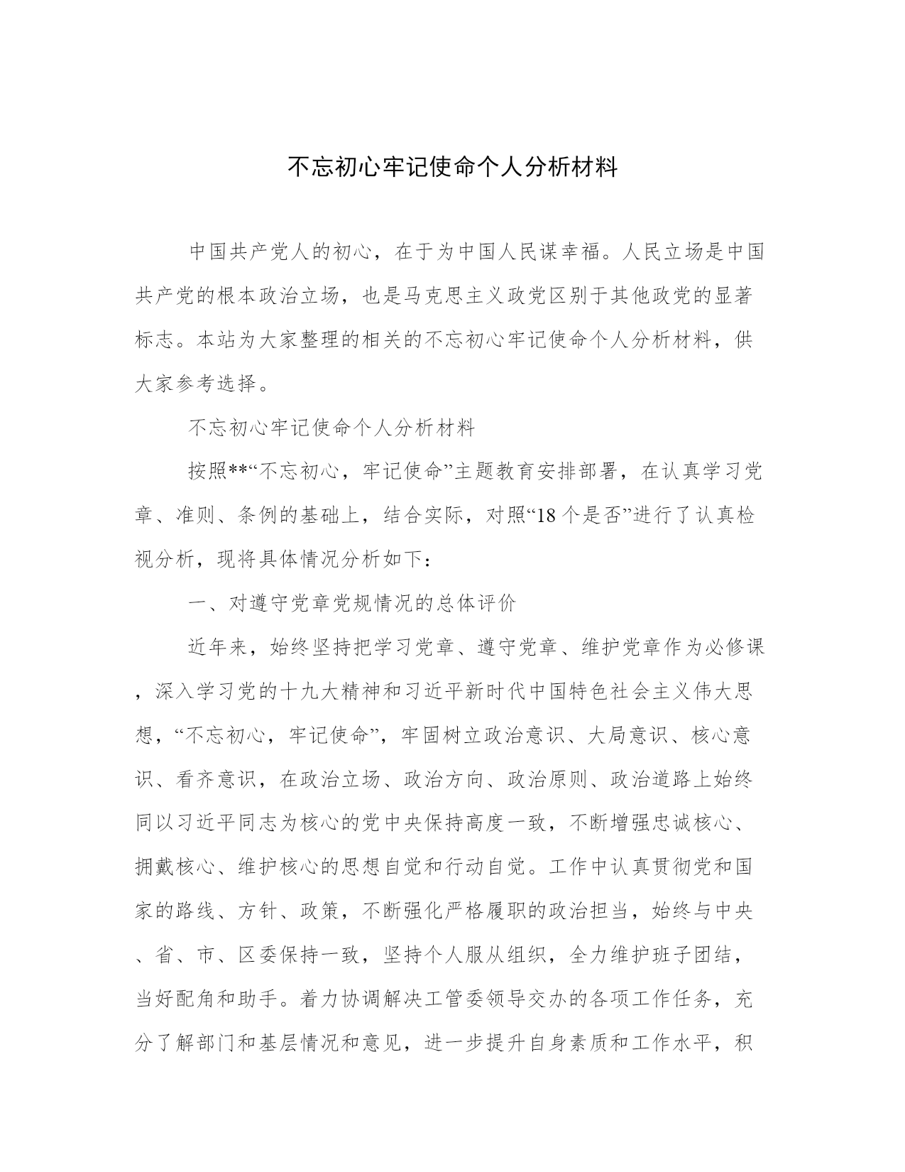 不忘初心牢记使命个人分析材料中国共产党人的初心,在于为中国人民谋幸福。人民立场是中国共产党的根本政治立场,也是马克思主义政党区别于其他政党的显著标志。本站为大家整理的相关的不忘初心牢记使命个人分析材料,供大家参考选择。不忘初心牢记使命个人分析材料按照**“不忘初心,牢记使命”主题教育安排部署,在认真学习党章、准则、条例的基础上,结合实际,对照“18个是否”进行了认真检视分析,现将具体情况分析如下:一、对遵守党章党规情况的总体评价近年来,始终坚持把学习党章、遵守党章、维护党章作为必修课,深入学习党的十九大精神和习近平新时代中国特色社会主义伟大思想,“不忘初心,牢记使命”,牢固树立政治意识、大局意识、核心意识、看齐意识,在政治立场、政治方向、政治原则、政治道路上始终同以习近平同志为核心的党中央保持高度一致,不断增强忠诚核心、拥戴核心、维护核心的思想自觉和行动自觉。工作中认真贯彻党和国家的路线、方针、政策,不断强化严格履职的政治担当,始终与中央、省、市、区委保持一致,坚持个人服从组织,全力维护班子团结,当好配角和助手。着力协调解决工管委领导交办的各项工作任务,充分了解部门和基层情况和意见,进一步提升自身素质和工作水平,积极主动当好参谋助手,履职能力得到有效提升。带头遵守党章党规党纪,以更高标准严格要求自己,认真贯彻廉洁自律准则和纪律处分条例,坚持党性原则,加强自我约束,守住纪律红线,不折不扣遵守党的纪律和规矩,做到不越界、不越轨。二、个人检视问题情况(一)对照党章党规重点查摆情况1.对照“是否坚持党的性质宗旨,贯彻党的基本理论、基本路线、基本方略,坚持四项基本原则,坚持新发展理念,坚持中国特色社会主义事业“五位一体”总体布局和“四个全面”战略布局”方面。存在理论学习不深不实,不系统的问题。主要表现在:对党的十九大精神特别是习近平中国特色社会主义思想停留于培训学习、党政办党支部集体学习、参加座谈研讨、在学习强国学习平台打卡学习等层面,全面学习、深入分析不够;自我学习上缺乏系统性、计划性,思想意识上缺乏主动性、自觉性;有时以工作代替学习,有时以任务重事情多给自己找理由懈怠学习,导致未能达到应有的学习深度和学习效果;对习近平中国特色社会主义思想系统把握、延伸拓展、联系实际、指导工作上存在较大差距。2.对照“是否认真履行党员八项义务,践行入党誓言,充分发挥党员先锋模范作用”方面。不存在问题。3.对照“是否按照党员干部六项基本条件,真正做到信念坚定、为民服务、勤政务实、敢于担当、清正廉洁”方面。不存在问题。4.对照“是否严格遵守党的组织制度,严守党的政治纪律和政治规矩,做到令行禁止,保证中央政令畅通”方面。不存在问题。5.对照“是否坚持党的群众路线,树牢宗旨意识,坚持从群众中来、到群众中去,善于做好新形势下的群众工作”方面。存在理论指导实践不够的问题。主要表现在:虽然在思想认识上做到了树牢为人民服务的宗旨意识,行动上也做到了紧密联系基层,积极为群众排忧解难,但还存在主动下基层了解民情民意少,根据工作要求被动服务情况多;主动分析解决问题少,根据工作需要被动协调解决问题多的情况。常常认为自己根据工作需要把基层的问题情况了解清楚了,向领导和部门反馈了,相关工作协调推进了就算工作到位了,由领导和职能部门根据情况分析解决就可以了,没能结合新时代习近平中国特色社会主义思想和中央,省、市、区的决策部署深入调查分析具体问题的解决方法,参谋助手作用发挥不充分。(二)对照准则重点查摆情况6.对照“是否坚定理想信念,坚定马克思主义信仰和社会主义信念,以实际行动让党员和群众感受到理想信念的强大力量”方面。不存在问题。7.对照“是否坚定不移贯彻党的基本路线,在大是大非面前站稳政治立场,在错误言行面前敢于抵制、斗争”方面。不存在问题。8.对照“是否坚决维护以习近平同志为核心的党中央权威和集中统一领导,增强“四个意识”,对党忠诚老实、光明磊落,严格执行重大问题请示报告制度”方面。不存在问题。9.对照“是否严格落实中央八项规定精神,坚决反对‘四风’”方面。不存在问题。10.是否坚持民主集中制原则,发扬党内民主,保障党员权利,注意听取不同意见,自觉服从组织分工安排,不独断专行或各自为政”方面。不存在问题。11.对照“是否坚持正确选人用人导向,坚持好干部标准,自觉防范和纠正用人上的不正之风和种种偏向”方面。不存在问题。12.对照“是否勇于开展批评和自我批评,自觉接受对权力运行的制约和监督,加强自律、慎独慎微,按规则正确行使全力”方面。不存在问题。13.对照“是否保持清正廉洁的政治本色,坚持“三严三实”,坚决同消极腐败作斗争”方面。不存在问题。(三)对照条例重点查摆情况14.对照“是否在重大原则问题上同党中央保持一致,自觉执行党组织决定”方面。不存在问题。15.对照“是否存在滥用