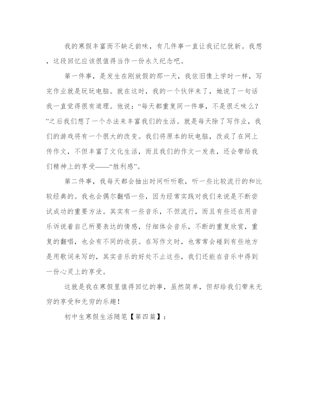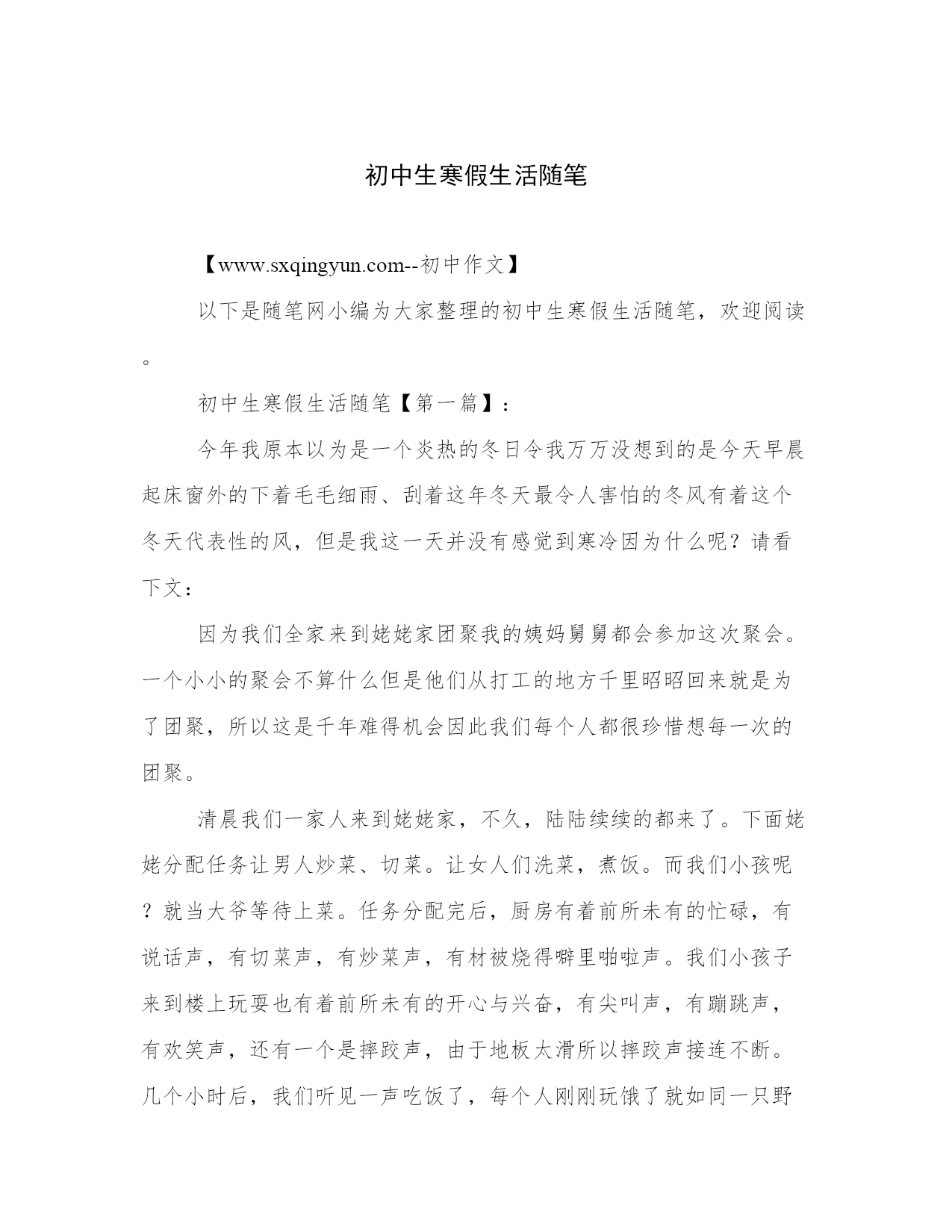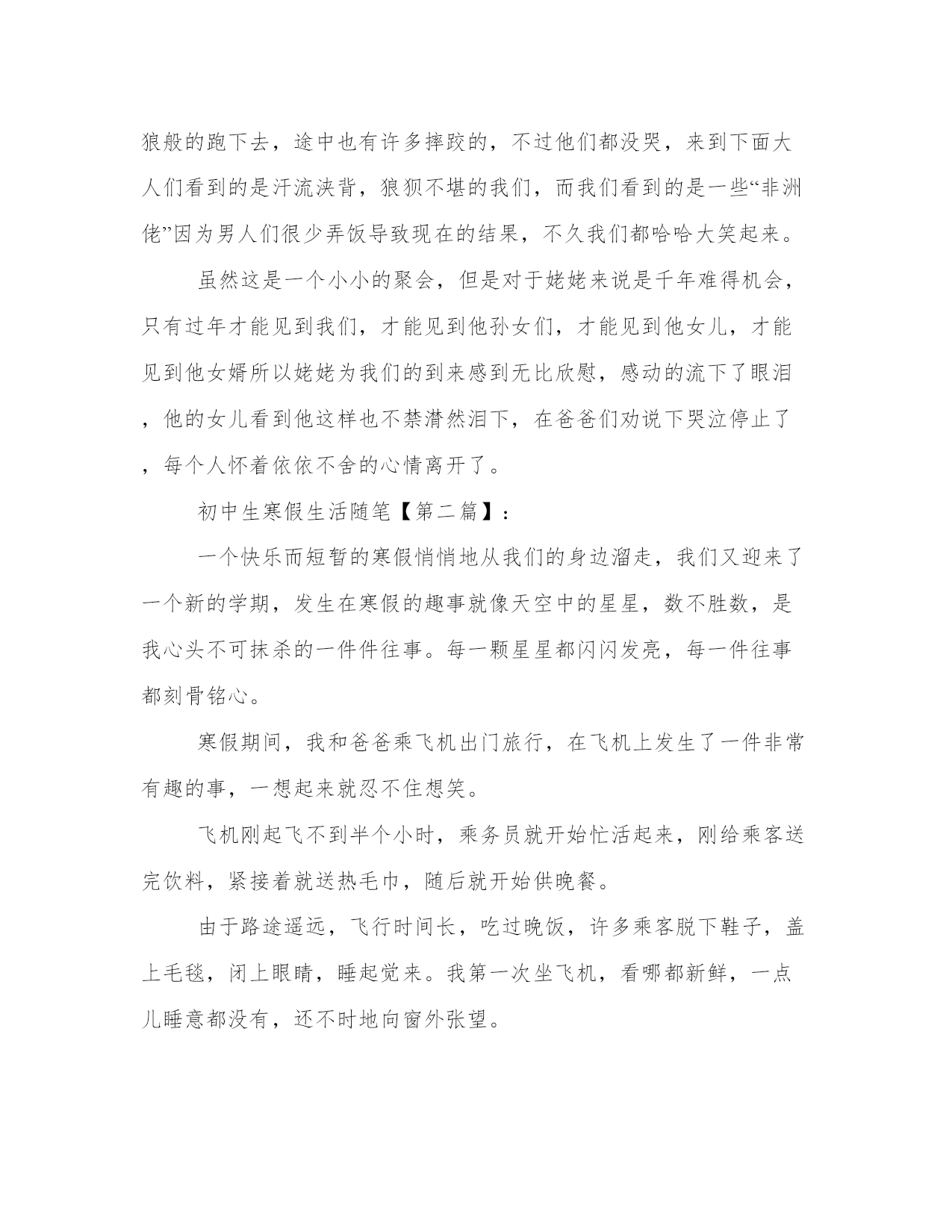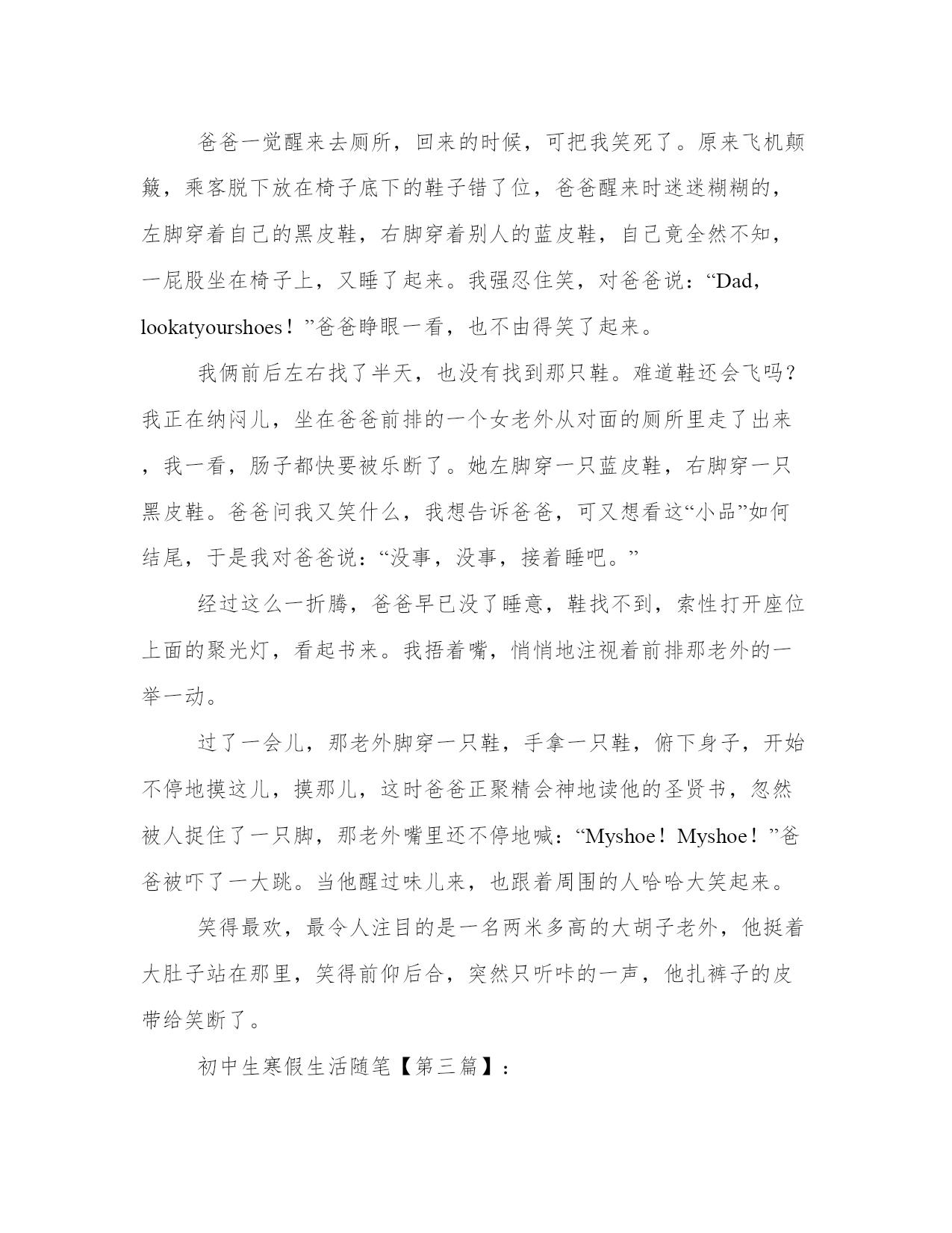 初中生寒假生活随笔【www.sxqingyun.com--初中作文】以下是随笔网小编为大家整理的初中生寒假生活随笔,欢迎阅读。初中生寒假生活随笔【第一篇】:今年我原本以为是一个炎热的冬日令我万万没想到的是今天早晨起床窗外的下着毛毛细雨、刮着这年冬天最令人害怕的冬风有着这个冬天代表性的风,但是我这一天并没有感觉到寒冷因为什么呢?请看下文:因为我们全家来到姥姥家团聚我的姨妈舅舅都会参加这次聚会。一个小小的聚会不算什么但是他们从打工的地方千里昭昭回来就是为了团聚,所以这是千年难得机会因此我们每个人都很珍惜想每一次的团聚。清晨我们一家人来到姥姥家,不久,陆陆续续的都来了。下面姥姥分配任务让男人炒菜、切菜。让女人们洗菜,煮饭。而我们小孩呢?就当大爷等待上菜。任务分配完后,厨房有着前所未有的忙碌,有说话声,有切菜声,有炒菜声,有材被烧得噼里啪啦声。我们小孩子来到楼上玩耍也有着前所未有的开心与兴奋,有尖叫声,有蹦跳声,有欢笑声,还有一个是摔跤声,由于地板太滑所以摔跤声接连不断。几个小时后,我们听见一声吃饭了,每个人刚刚玩饿了就如同一只野狼般的跑下去,途中也有许多摔跤的,不过他们都没哭,来到下面大人们看到的是汗流浃背,狼狈不堪的我们,而我们看到的是一些“非洲佬”因为男人们很少弄饭导致现在的结果,不久我们都哈哈大笑起来。虽然这是一个小小的聚会,但是对于姥姥来说是千年难得机会,只有过年才能见到我们,才能见到他孙女们,才能见到他女儿,才能见到他女婿所以姥姥为我们的到来感到无比欣慰,感动的流下了眼泪,他的女儿看到他这样也不禁潸然泪下,在爸爸们劝说下哭泣停止了,每个人怀着依依不舍的心情离开了。初中生寒假生活随笔【第二篇】:一个快乐而短暂的寒假悄悄地从我们的身边溜走,我们又迎来了一个新的学期,发生在寒假的趣事就像天空中的星星,数不胜数,是我心头不可抹杀的一件件往事。每一颗星星都闪闪发亮,每一件往事都刻骨铭心。寒假期间,我和爸爸乘飞机出门旅行,在飞机上发生了一件非常有趣的事,一想起来就忍不住想笑。飞机刚起飞不到半个小时,乘务员就开始忙活起来,刚给乘客送完饮料,紧接着就送热毛巾,随后就开始供晚餐。由于路途遥远,飞行时间长,吃过晚饭,许多乘客脱下鞋子,盖上毛毯,闭上眼睛,睡起觉来。我第一次坐飞机,看哪都新鲜,一点儿睡意都没有,还不时地向窗外张望。爸爸一觉醒来去厕所,回来的时候,可把我笑死了。原来飞机颠簸,乘客脱下放在椅子底下的鞋子错了位,爸爸醒来时迷迷糊糊的,左脚穿着自己的黑皮鞋,右脚穿着别人的蓝皮鞋,自己竟全然不知,一屁股坐在椅子上,又睡了起来。我强忍住笑,对爸爸说:“Dad,lookatyourshoes!”爸爸睁眼一看,也不由得笑了起来。我俩前后左右找了半天,也没有找到那只鞋。难道鞋还会飞吗?我正在纳闷儿,坐在爸爸前排的一个女老外从对面的厕所里走了出来,我一看,肠子都快要被乐断了。她左脚穿一只蓝皮鞋,右脚穿一只黑皮鞋。爸爸问我又笑什么,我想告诉爸爸,可又想看这“小品”如何结尾,于是我对爸爸说:“没事,没事,接着睡吧。”经过这么一折腾,爸爸早已没了睡意,鞋找不到,索性打开座位上面的聚光灯,看起书来。我捂着嘴,悄悄地注视着前排那老外的一举一动。过了一会儿,那老外脚穿一只鞋,手拿一只鞋,俯下身子,开始不停地摸这儿,摸那儿,这时爸爸正聚精会神地读他的圣贤书,忽然被人捉住了一只脚,那老外嘴里还不停地喊:“Myshoe!Myshoe!”爸爸被吓了一大跳。当他醒过味儿来,也跟着周围的人哈哈大笑起来。笑得最欢,最令人注目的是一名两米多高的大胡子老外,他挺着大肚子站在那里,笑得前仰后合,突然只听咔的一声,他扎裤子的皮带给笑断了。初中生寒假生活随笔【第三篇】:我的寒假丰富而不缺乏韵味,有几件事一直让我记忆犹新。我想,这段回忆应该很值得当作一份永久纪念吧。第一件事,是发生在刚放假的那一天,我依旧像上学时一样,写完作业就是玩玩电脑。就在这时,我的一个伙伴来了,她说了一句话我一直觉得很有道理。他说:“每天都重复同一件事,不是很乏味么?”之后我们想了一个办法来丰富我们的生活。就是每天除了写作业,我们的游戏将有一个很大的改变。我们将原本的玩电脑,改成了在网上传作文,不但丰富了文化生活,而且我们的作文一发表,还会带给我们精神上的享受——“胜利感”。第二件事,我每天都会抽出时间听听歌,听一些比较流行的和比较经典的。我也会偶尔翻唱一些,因为经常实践对我们来说是不断尝试成功的重要方法。其实有一些音乐,不但流行,而且有些还在用音乐诉说着自己所要表达的情感,仔细体会音乐,不断的重复欣赏,重复的翻唱,也会有不同的收获。在写作文时,也常常会碰到有些地方是用歌词来写的,其实音乐的好处不止这些,我们还能在音乐中得到一份心灵上的享受。这就是我在寒假里值得回忆的事,虽然简单,但却给我们带来无穷的享受和无穷的