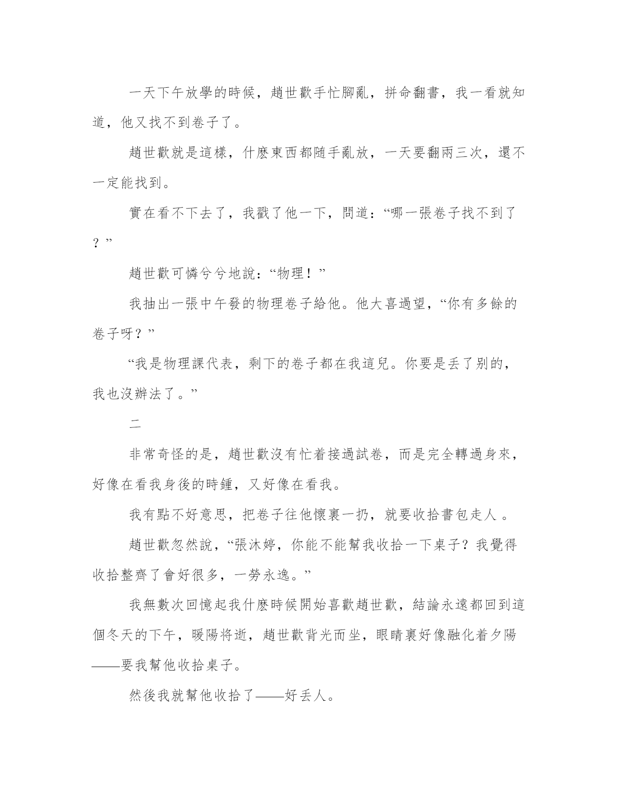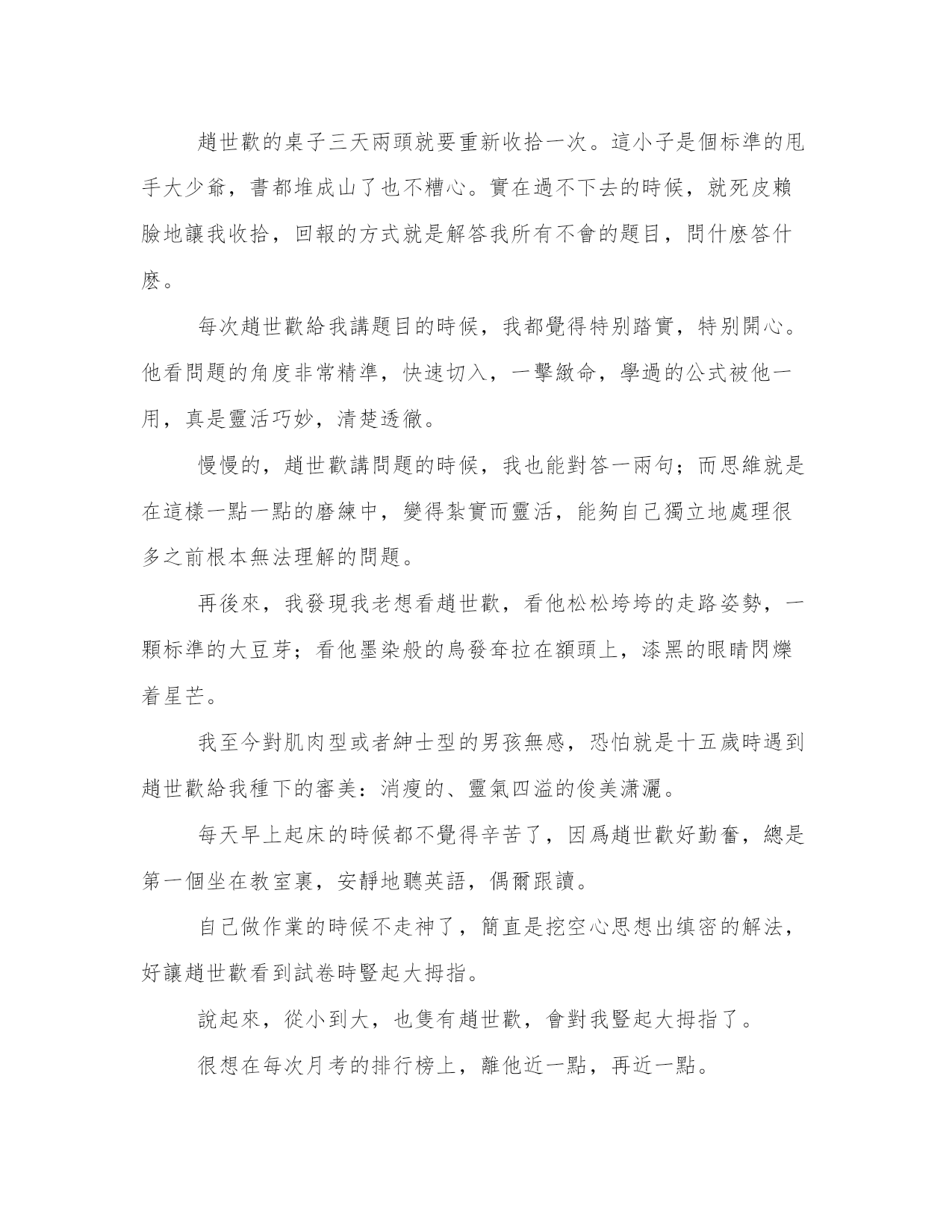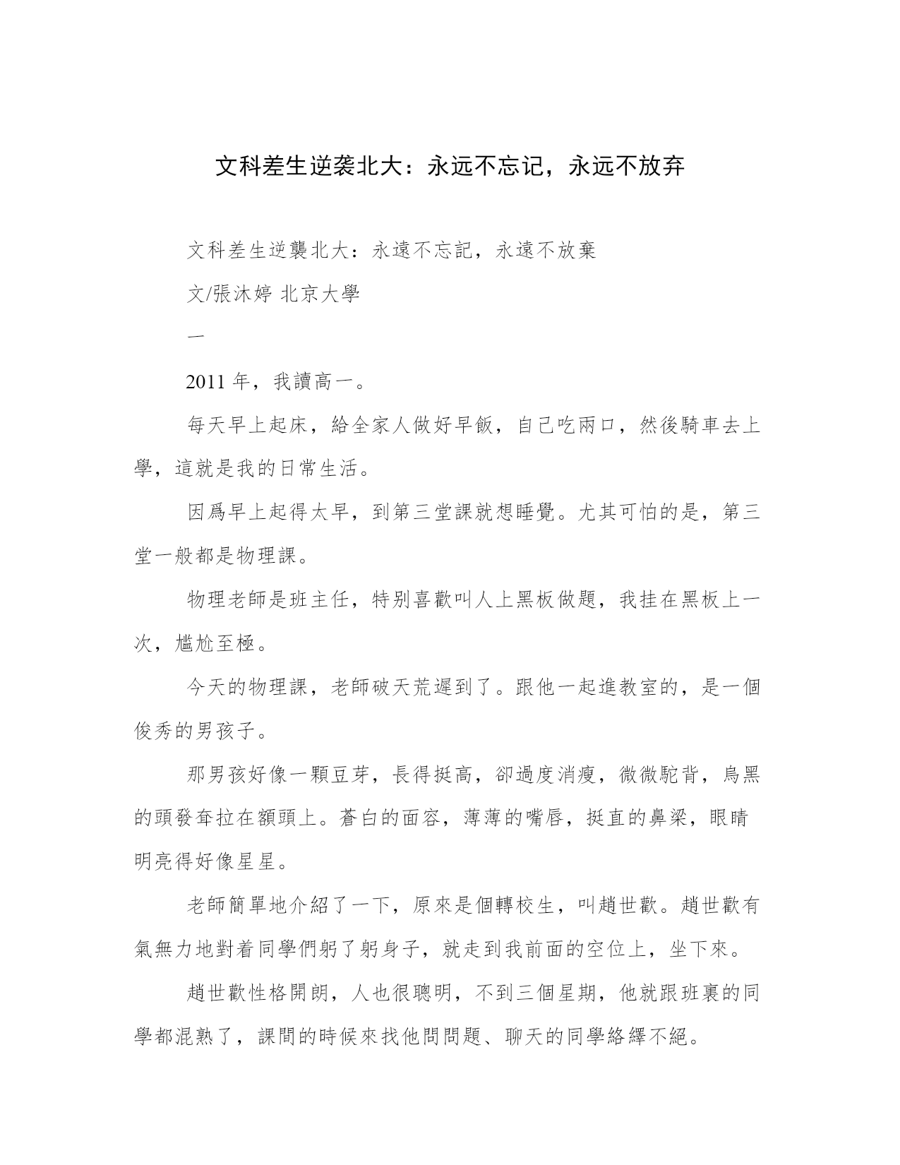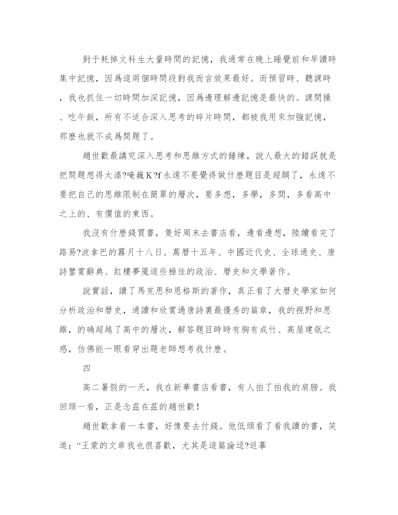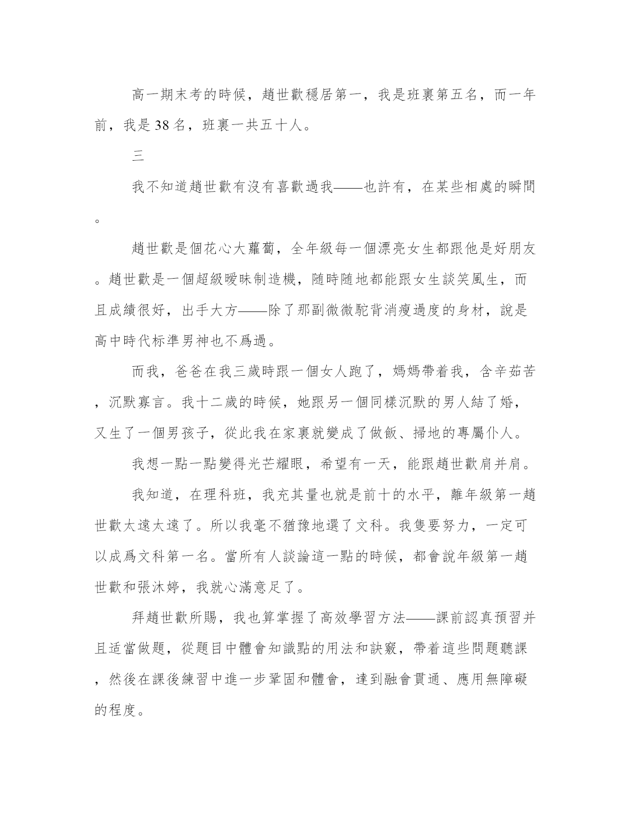 文科差生逆袭北大:永远不忘记,永远不放弃文科差生逆襲北大:永遠不忘記,永遠不放棄文/張沐婷北京大學一2011年,我讀高一。每天早上起床,給全家人做好早飯,自己吃兩口,然後騎車去上學,這就是我的日常生活。因爲早上起得太早,到第三堂課就想睡覺。尤其可怕的是,第三堂一般都是物理課。物理老師是班主任,特别喜歡叫人上黑板做題,我挂在黑板上一次,尴尬至極。今天的物理課,老師破天荒遲到了。跟他一起進教室的,是一個俊秀的男孩子。那男孩好像一顆豆芽,長得挺高,卻過度消瘦,微微駝背,烏黑的頭發耷拉在額頭上。蒼白的面容,薄薄的嘴唇,挺直的鼻梁,眼睛明亮得好像星星。老師簡單地介紹了一下,原來是個轉校生,叫趙世歡。趙世歡有氣無力地對着同學們躬了躬身子,就走到我前面的空位上,坐下來。趙世歡性格開朗,人也很聰明,不到三個星期,他就跟班裏的同學都混熟了,課間的時候來找他問問題、聊天的同學絡繹不絕。一天下午放學的時候,趙世歡手忙腳亂,拼命翻書,我一看就知道,他又找不到卷子了。趙世歡就是這樣,什麽東西都随手亂放,一天要翻兩三次,還不一定能找到。實在看不下去了,我戳了他一下,問道:“哪一張卷子找不到了?”趙世歡可憐兮兮地說:“物理!”我抽出一張中午發的物理卷子給他。他大喜過望,“你有多餘的卷子呀?”“我是物理課代表,剩下的卷子都在我這兒。你要是丢了别的,我也沒辦法了。”二非常奇怪的是,趙世歡沒有忙着接過試卷,而是完全轉過身來,好像在看我身後的時鍾,又好像在看我。我有點不好意思,把卷子往他懷裏一扔,就要收拾書包走人。趙世歡忽然說,“張沐婷,你能不能幫我收拾一下桌子?我覺得收拾整齊了會好很多,一勞永逸。”我無數次回憶起我什麽時候開始喜歡趙世歡,結論永遠都回到這個冬天的下午,暖陽将逝,趙世歡背光而坐,眼睛裏好像融化着夕陽——要我幫他收拾桌子。然後我就幫他收拾了——好丢人。趙世歡的桌子三天兩頭就要重新收拾一次。這小子是個标準的甩手大少爺,書都堆成山了也不糟心。實在過不下去的時候,就死皮賴臉地讓我收拾,回報的方式就是解答我所有不會的題目,問什麽答什麽。每次趙世歡給我講題目的時候,我都覺得特别踏實,特别開心。他看問題的角度非常精準,快速切入,一擊緻命,學過的公式被他一用,真是靈活巧妙,清楚透徹。慢慢的,趙世歡講問題的時候,我也能對答一兩句;而思維就是在這樣一點一點的磨練中,變得紮實而靈活,能夠自己獨立地處理很多之前根本無法理解的問題。再後來,我發現我老想看趙世歡,看他松松垮垮的走路姿勢,一顆标準的大豆芽;看他墨染般的烏發耷拉在額頭上,漆黑的眼睛閃爍着星芒。我至今對肌肉型或者紳士型的男孩無感,恐怕就是十五歲時遇到趙世歡給我種下的審美:消瘦的、靈氣四溢的俊美潇灑。每天早上起床的時候都不覺得辛苦了,因爲趙世歡好勤奮,總是第一個坐在教室裏,安靜地聽英語,偶爾跟讀。自己做作業的時候不走神了,簡直是挖空心思想出缜密的解法,好讓趙世歡看到試卷時豎起大拇指。說起來,從小到大,也隻有趙世歡,會對我豎起大拇指了。很想在每次月考的排行榜上,離他近一點,再近一點。高一期末考的時候,趙世歡穩居第一,我是班裏第五名,而一年前,我是38名,班裏一共五十人。三我不知道趙世歡有沒有喜歡過我——也許有,在某些相處的瞬間。趙世歡是個花心大蘿蔔,全年級每一個漂亮女生都跟他是好朋友。趙世歡是一個超級暧昧制造機,随時随地都能跟女生談笑風生,而且成績很好,出手大方——除了那副微微駝背消瘦過度的身材,說是高中時代标準男神也不爲過。而我,爸爸在我三歲時跟一個女人跑了,媽媽帶着我,含辛茹苦,沉默寡言。我十二歲的時候,她跟另一個同樣沉默的男人結了婚,又生了一個男孩子,從此我在家裏就變成了做飯、掃地的專屬仆人。我想一點一點變得光芒耀眼,希望有一天,能跟趙世歡肩并肩。我知道,在理科班,我充其量也就是前十的水平,離年級第一趙世歡太遠太遠了。所以我毫不猶豫地選了文科。我隻要努力,一定可以成爲文科第一名。當所有人談論這一點的時候,都會說年級第一趙世歡和張沐婷,我就心滿意足了。拜趙世歡所賜,我也算掌握了高效學習方法——課前認真預習并且适當做題,從題目中體會知識點的用法和訣竅,帶着這些問題聽課,然後在課後練習中進一步鞏固和體會,達到融會貫通、應用無障礙的程度。對于耗掉文科生大量時間的記憶,我通常在晚上睡覺前和早讀時集中記憶,因爲這兩個時間段對我而言效果最好。而預習時、聽課時,我也抓住一切時間加深記憶,因爲邊理解邊記憶是最快的。課間操、吃午飯,所有不适合深入思考的碎片時間,都被我用來加強記憶,那麽也就不成爲問題了。趙世歡最講究深入思考和思維方式的錘煉,說人最大的錯誤就是把問題想得太溙?唵巍K?f永遠不要覺得做什麽題目是超綱了,永遠不要把自己的思維限制在簡單的層次,要多想,多學,多問,多看高中之上的、有價值的東西。我沒有什麽錢買書,隻好周末去書店