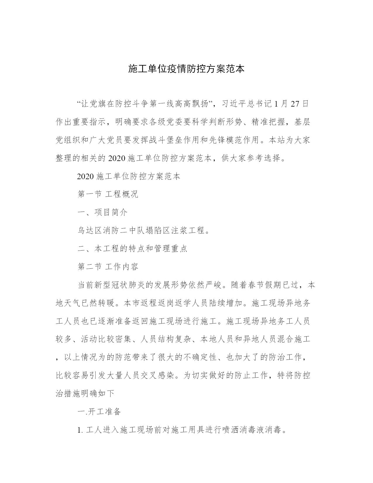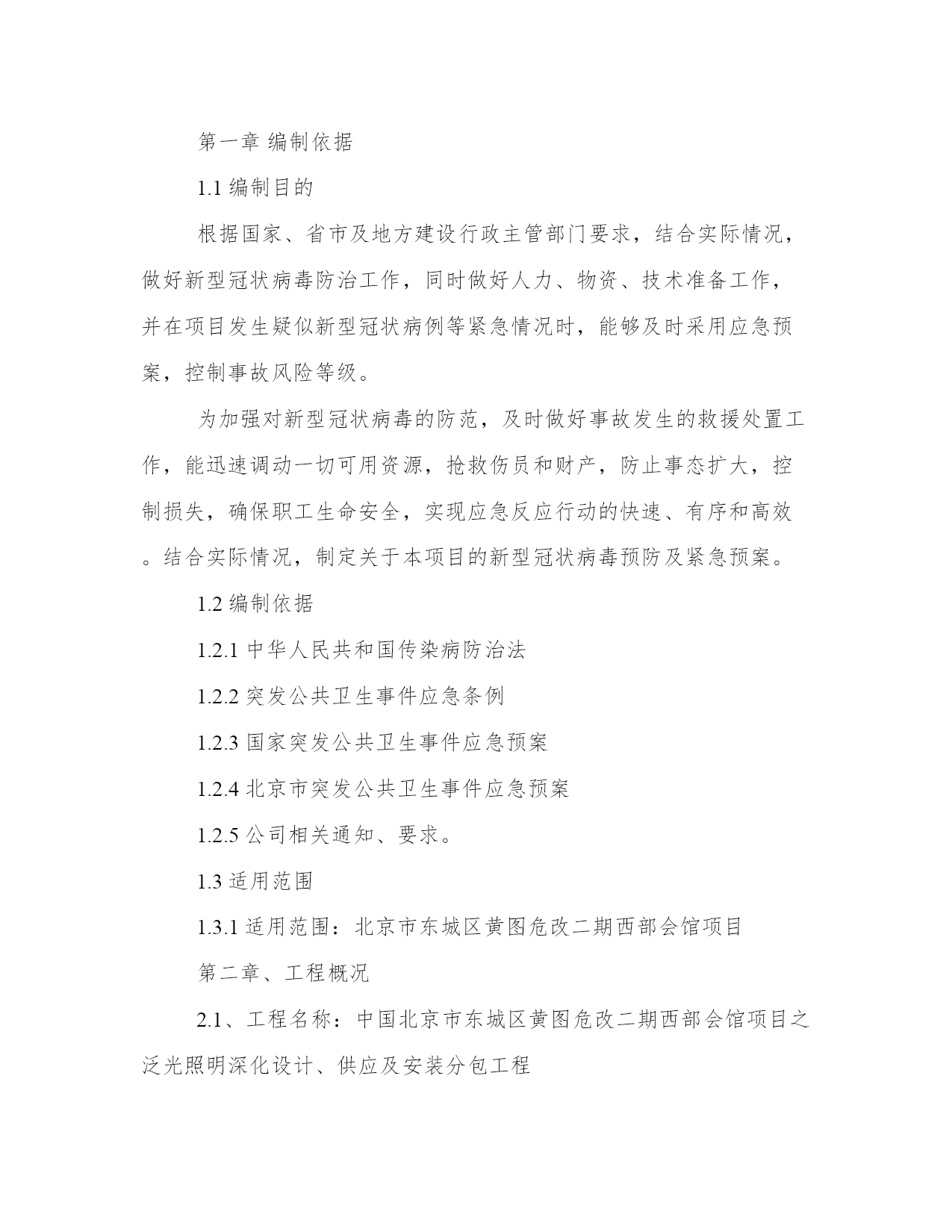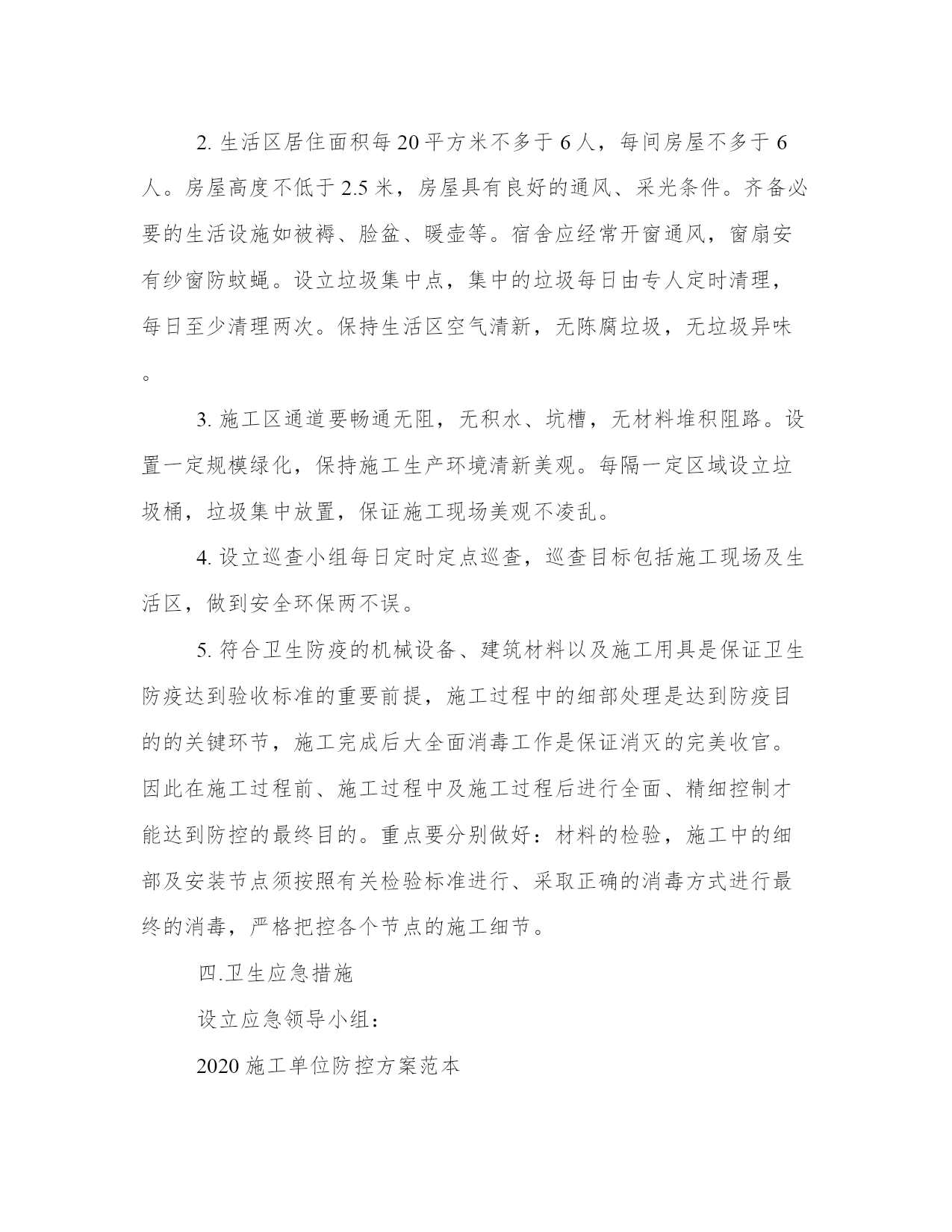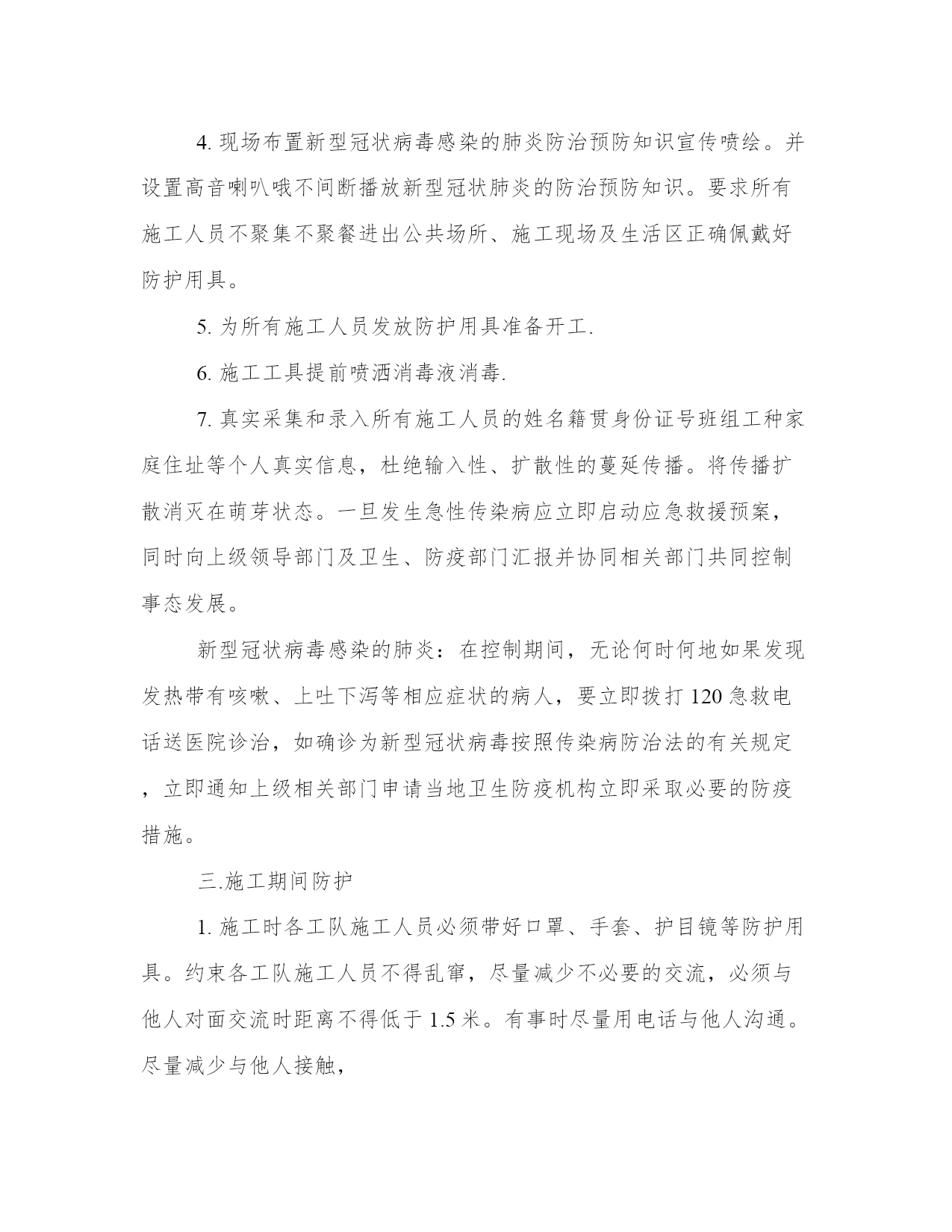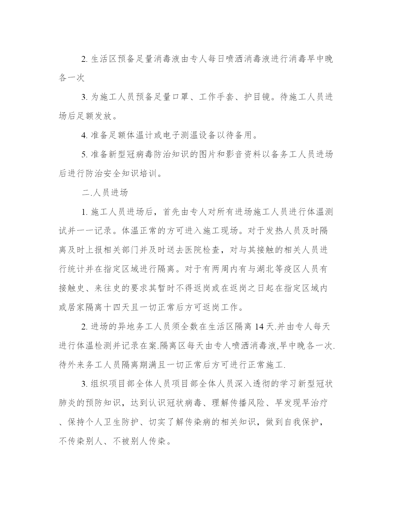 施工单位疫情防控方案范本“让党旗在防控斗争第一线高高飘扬”,习近平总书记1月27日作出重要指示,明确要求各级党委要科学判断形势、精准把握,基层党组织和广大党员要发挥战斗堡垒作用和先锋模范作用。本站为大家整理的相关的2020施工单位防控方案范本,供大家参考选择。2020施工单位防控方案范本第一节工程概况一、项目简介乌达区消防二中队塌陷区注浆工程。二、本工程的特点和管理重点第二节工作内容当前新型冠状肺炎的发展形势依然严峻。随着春节假期已过,本地天气已然转暖。本市返程返岗返学人员陆续增加。施工现场异地务工人员也已逐渐准备返回施工现场进行施工。施工现场异地务工人员较多、活动比较密集、人员结构复杂、本地人员和异地人员混合施工,以上情况为的防范带来了很大的不确定性、也加大了的防治工作,比较容易引发大量人员交叉感染。为切实做好的防止工作,特将防控治措施明确如下一.开工准备1.工人进入施工现场前对施工用具进行喷洒消毒液消毒。2.生活区预备足量消毒液由专人每日喷洒消毒液进行消毒早中晚各一次3.为施工人员预备足量口罩、工作手套、护目镜。待施工人员进场后足额发放。4.准备足额体温计或电子测温设备以待备用。5.准备新型冠病毒防治知识的图片和影音资料以备务工人员进场后进行防治安全知识培训。二.人员进场1.施工人员进场后,首先由专人对所有进场施工人员进行体温测试并一一记录。体温正常的方可进入施工现场。对于发热人员及时隔离及时上报相关部门并及时送去医院检查,对与其接触的相关人员进行统计并在指定区域进行隔离。对于有两周内有与湖北等疫区人员有接触史、来往史的要求其暂时不得返岗或在返岗之日起在指定区域内或居家隔离十四天且一切正常后方可返岗工作。2.进场的异地务工人员须全数在生活区隔离14天.并由专人每天进行体温检测并记录在案.隔离区每天由专人喷洒消毒液,早中晚各一次.待外来务工人员隔离期满且一切正常后方可进行正常施工.3.组织项目部全体人员项目部全体人员深入透彻的学习新型冠状肺炎的预防知识,达到认识冠状病毒、理解传播风险、早发现早治疗、保持个人卫生防护、切实了解传染病的相关知识,做到自我保护,不传染别人、不被别人传染。4.现场布置新型冠状病毒感染的肺炎防治预防知识宣传喷绘。并设置高音喇叭哦不间断播放新型冠状肺炎的防治预防知识。要求所有施工人员不聚集不聚餐进出公共场所、施工现场及生活区正确佩戴好防护用具。5.为所有施工人员发放防护用具准备开工.6.施工工具提前喷洒消毒液消毒.7.真实采集和录入所有施工人员的姓名籍贯身份证号班组工种家庭住址等个人真实信息,杜绝输入性、扩散性的蔓延传播。将传播扩散消灭在萌芽状态。一旦发生急性传染病应立即启动应急救援预案,同时向上级领导部门及卫生、防疫部门汇报并协同相关部门共同控制事态发展。新型冠状病毒感染的肺炎:在控制期间,无论何时何地如果发现发热带有咳嗽、上吐下泻等相应症状的病人,要立即拨打120急救电话送医院诊治,如确诊为新型冠状病毒按照传染病防治法的有关规定,立即通知上级相关部门申请当地卫生防疫机构立即采取必要的防疫措施。三.施工期间防护1.施工时各工队施工人员必须带好口罩、手套、护目镜等防护用具。约束各工队施工人员不得乱窜,尽量减少不必要的交流,必须与他人对面交流时距离不得低于1.5米。有事时尽量用电话与他人沟通。尽量减少与他人接触,2.生活区居住面积每20平方米不多于6人,每间房屋不多于6人。房屋高度不低于2.5米,房屋具有良好的通风、采光条件。齐备必要的生活设施如被褥、脸盆、暖壶等。宿舍应经常开窗通风,窗扇安有纱窗防蚊蝇。设立垃圾集中点,集中的垃圾每日由专人定时清理,每日至少清理两次。保持生活区空气清新,无陈腐垃圾,无垃圾异味。3.施工区通道要畅通无阻,无积水、坑槽,无材料堆积阻路。设置一定规模绿化,保持施工生产环境清新美观。每隔一定区域设立垃圾桶,垃圾集中放置,保证施工现场美观不凌乱。4.设立巡查小组每日定时定点巡查,巡查目标包括施工现场及生活区,做到安全环保两不误。5.符合卫生防疫的机械设备、建筑材料以及施工用具是保证卫生防疫达到验收标准的重要前提,施工过程中的细部处理是达到防疫目的的关键环节,施工完成后大全面消毒工作是保证消灭的完美收官。因此在施工过程前、施工过程中及施工过程后进行全面、精细控制才能达到防控的最终目的。重点要分别做好:材料的检验,施工中的细部及安装节点须按照有关检验标准进行、采取正确的消毒方式进行最终的消毒,严格把控各个节点的施工细节。四.卫生应急措施设立应急领导小组:2020施工单位防控方案范本第一章编制依据1.1编制目的根据国家、省市及地方建设行政主管部门要求,结合实际情况,做好新型冠状病毒防治工作,同时做好人力、物资、技术准备工作,并在项目发生疑似新型冠状病例等紧急情况时,能够及时采用应急预案,