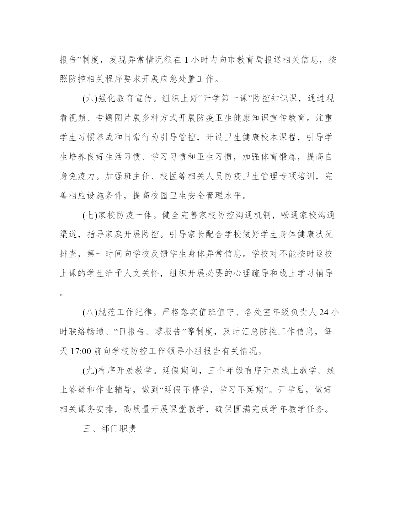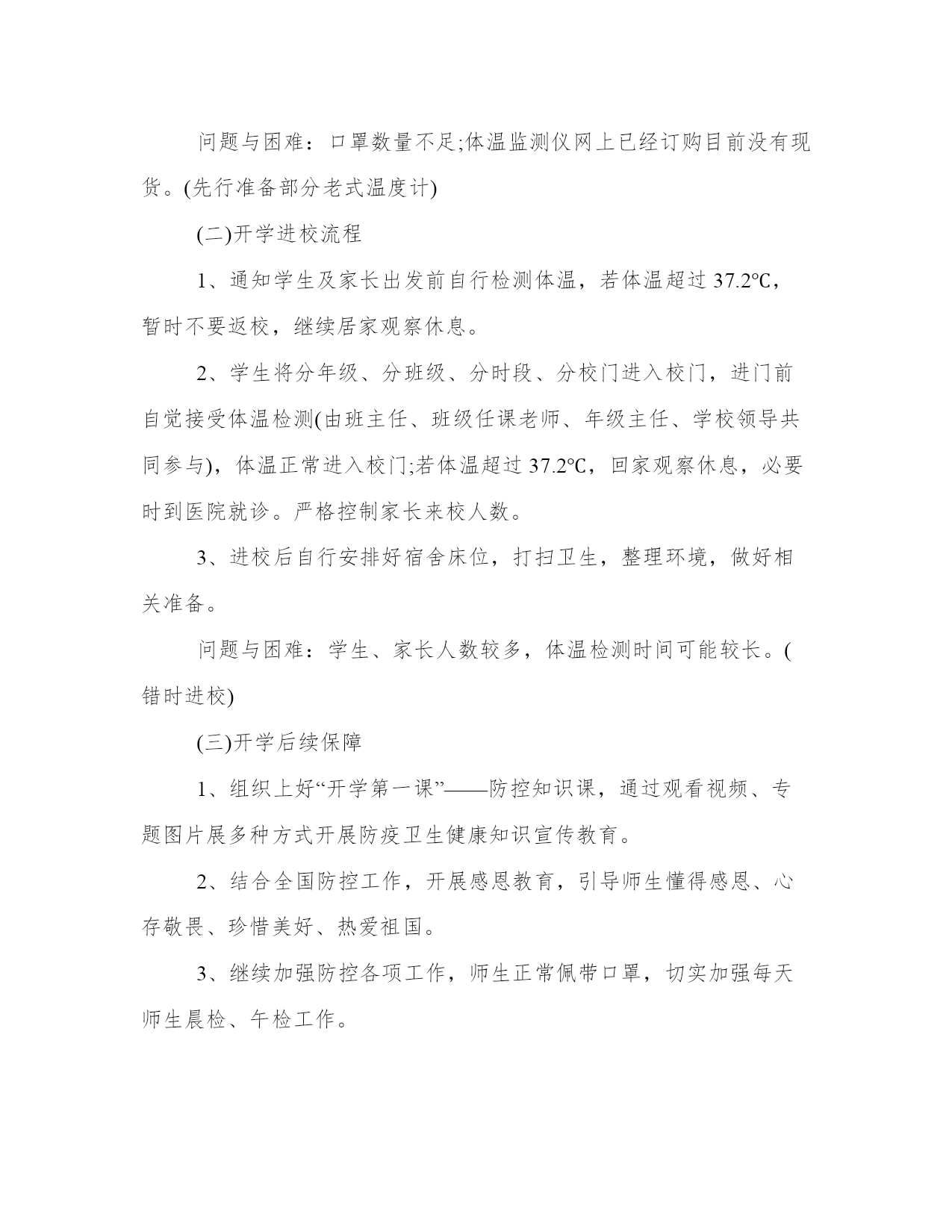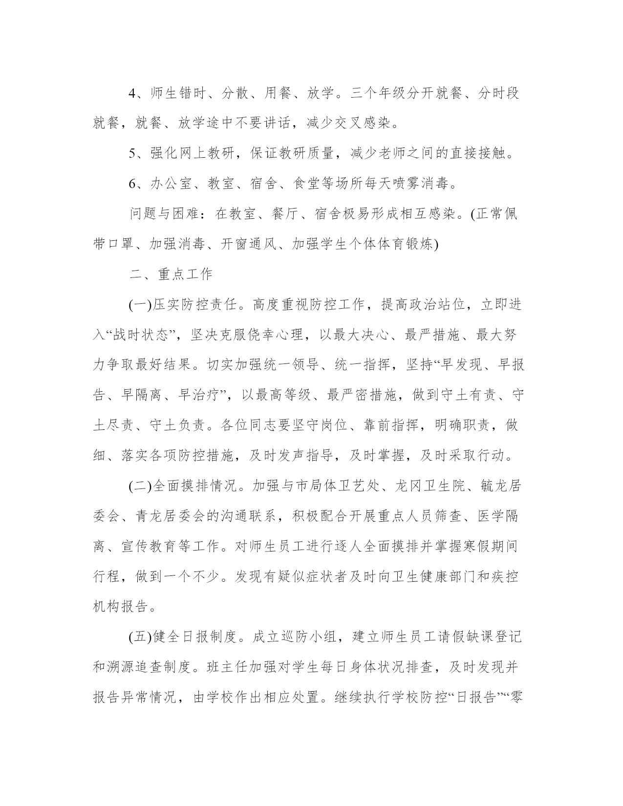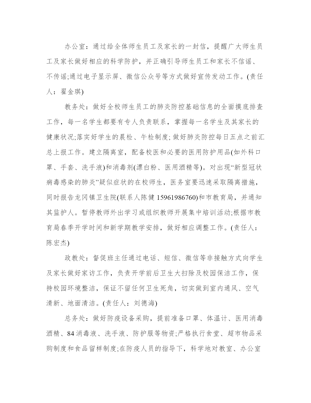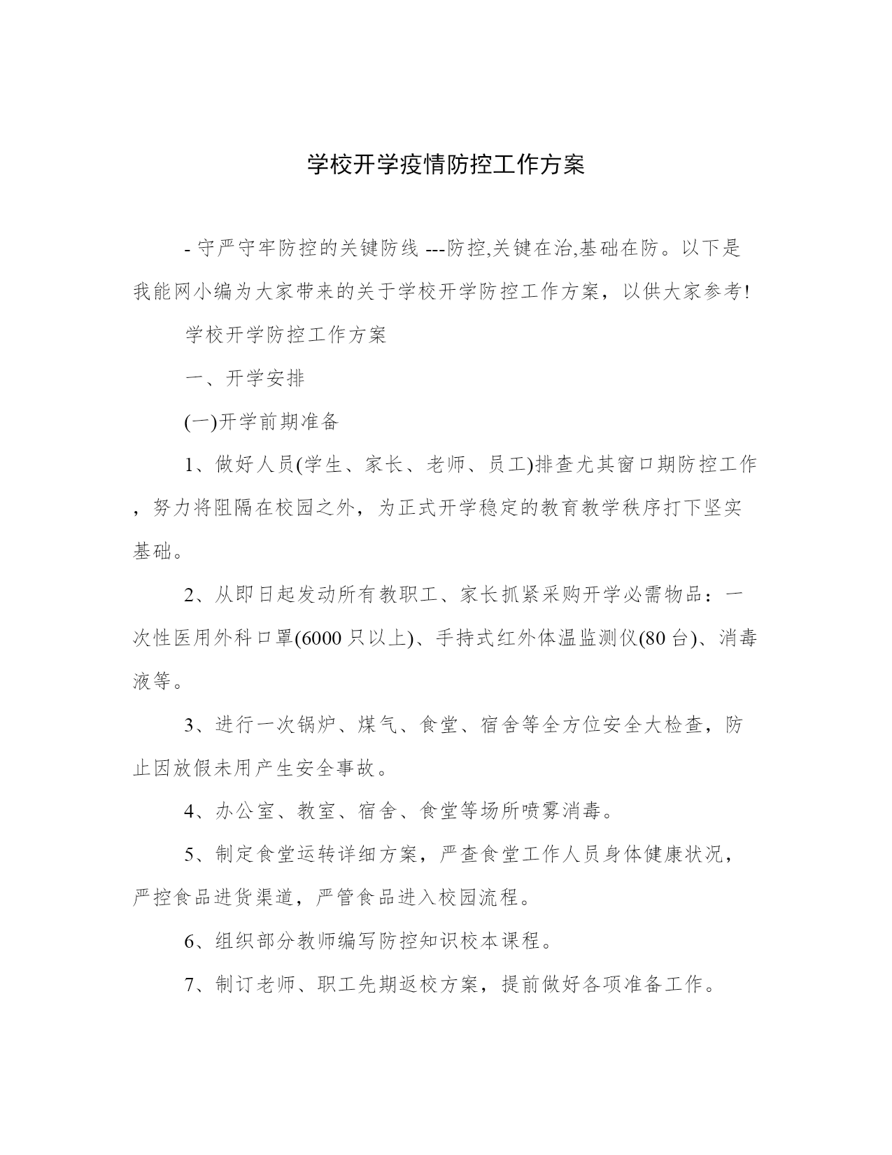 学校开学疫情防控工作方案-守严守牢防控的关键防线---防控,关键在治,基础在防。以下是我能网小编为大家带来的关于学校开学防控工作方案,以供大家参考!学校开学防控工作方案一、开学安排(一)开学前期准备1、做好人员(学生、家长、老师、员工)排查尤其窗口期防控工作,努力将阻隔在校园之外,为正式开学稳定的教育教学秩序打下坚实基础。2、从即日起发动所有教职工、家长抓紧采购开学必需物品:一次性医用外科口罩(6000只以上)、手持式红外体温监测仪(80台)、消毒液等。3、进行一次锅炉、煤气、食堂、宿舍等全方位安全大检查,防止因放假未用产生安全事故。4、办公室、教室、宿舍、食堂等场所喷雾消毒。5、制定食堂运转详细方案,严查食堂工作人员身体健康状况,严控食品进货渠道,严管食品进入校园流程。6、组织部分教师编写防控知识校本课程。7、制订老师、职工先期返校方案,提前做好各项准备工作。问题与困难:口罩数量不足;体温监测仪网上已经订购目前没有现货。(先行准备部分老式温度计)(二)开学进校流程1、通知学生及家长出发前自行检测体温,若体温超过37.2℃,暂时不要返校,继续居家观察休息。2、学生将分年级、分班级、分时段、分校门进入校门,进门前自觉接受体温检测(由班主任、班级任课老师、年级主任、学校领导共同参与),体温正常进入校门;若体温超过37.2℃,回家观察休息,必要时到医院就诊。严格控制家长来校人数。3、进校后自行安排好宿舍床位,打扫卫生,整理环境,做好相关准备。问题与困难:学生、家长人数较多,体温检测时间可能较长。(错时进校)(三)开学后续保障1、组织上好“开学第一课”——防控知识课,通过观看视频、专题图片展多种方式开展防疫卫生健康知识宣传教育。2、结合全国防控工作,开展感恩教育,引导师生懂得感恩、心存敬畏、珍惜美好、热爱祖国。3、继续加强防控各项工作,师生正常佩带口罩,切实加强每天师生晨检、午检工作。4、师生错时、分散、用餐、放学。三个年级分开就餐、分时段就餐,就餐、放学途中不要讲话,减少交叉感染。5、强化网上教研,保证教研质量,减少老师之间的直接接触。6、办公室、教室、宿舍、食堂等场所每天喷雾消毒。问题与困难:在教室、餐厅、宿舍极易形成相互感染。(正常佩带口罩、加强消毒、开窗通风、加强学生个体体育锻炼)二、重点工作(一)压实防控责任。高度重视防控工作,提高政治站位,立即进入“战时状态”,坚决克服侥幸心理,以最大决心、最严措施、最大努力争取最好结果。切实加强统一领导、统一指挥,坚持“早发现、早报告、早隔离、早治疗”,以最高等级、最严密措施,做到守土有责、守土尽责、守土负责。各位同志要坚守岗位、靠前指挥,明确职责,做细、落实各项防控措施,及时发声指导,及时掌握,及时采取行动。(二)全面摸排情况。加强与市局体卫艺处、龙冈卫生院、毓龙居委会、青龙居委会的沟通联系,积极配合开展重点人员筛查、医学隔离、宣传教育等工作。对师生员工进行逐人全面摸排并掌握寒假期间行程,做到一个不少。发现有疑似症状者及时向卫生健康部门和疾控机构报告。(五)健全日报制度。成立巡防小组,建立师生员工请假缺课登记和溯源追查制度。班主任加强对学生每日身体状况排查,及时发现并报告异常情况,由学校作出相应处置。继续执行学校防控“日报告”“零报告”制度,发现异常情况须在1小时内向市教育局报送相关信息,按照防控相关程序要求开展应急处置工作。(六)强化教育宣传。组织上好“开学第一课”防控知识课,通过观看视频、专题图片展多种方式开展防疫卫生健康知识宣传教育。注重学生习惯养成和日常行为引导管控,开设卫生健康校本课程,引导学生培养良好生活习惯、学习习惯和卫生习惯,加强体育锻炼,提高自身免疫力。加强班主任、校医等相关人员防疫卫生管理专项培训,完善相应设施条件,提高校园卫生安全管理水平。(七)家校防疫一体。健全完善家校防控沟通机制,畅通家校沟通渠道,指导家庭开展防控。引导家长配合学校做好学生身体健康状况排查,第一时间向学校反馈学生身体异常信息。学校对不能按时返校上课的学生给予人文关怀,组织开展必要的心理疏导和线上学习辅导。(八)规范工作纪律。严格落实值班值守、各处室年级负责人24小时联络畅通、“日报告、零报告”等制度,及时汇总防控工作信息,每天17:00前向学校防控工作领导小组报告有关情况。(九)有序开展教学。延假期间,三个年级有序开展线上教学、线上答疑和作业辅导,做到“延假不停学,学习不延期”。开学后,做好相关课务安排,高质量开展课堂教学,确保圆满完成学年教学任务。三、部门职责办公室:通过给全体师生员工及家长的一封信,提醒广大师生员工及家长做好相应的科学防护,并正确引导师生员工和家长不信谣、不传谣;通过电子显示屏、微信公众号等方式做好宣传发动工作。(责任人:翟金琪)教务处:做好全校师生员工的肺炎防控基础信息的