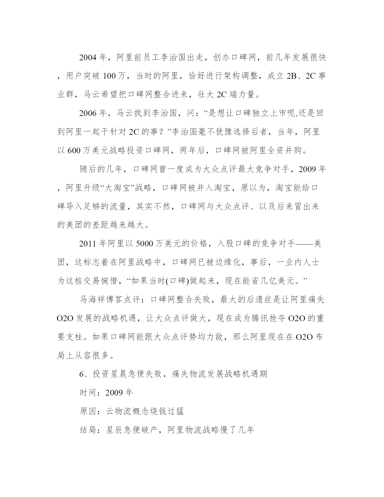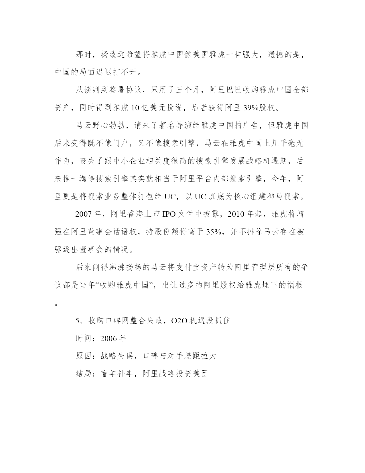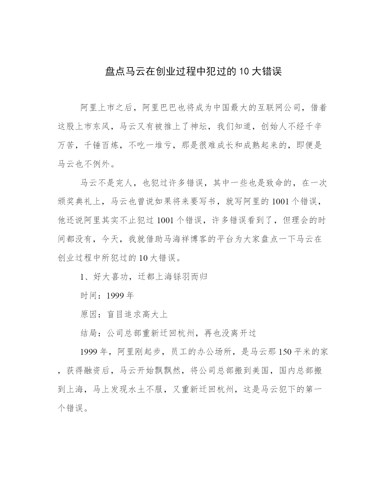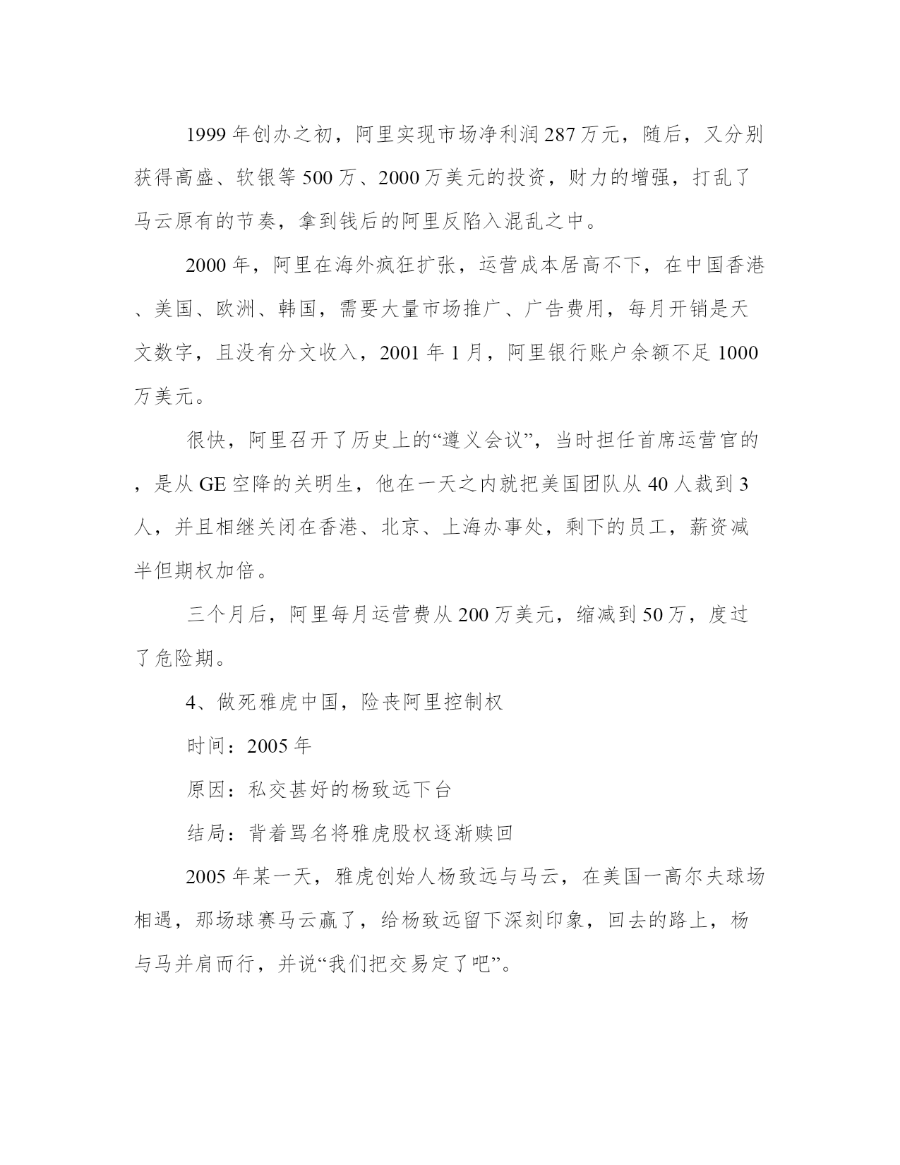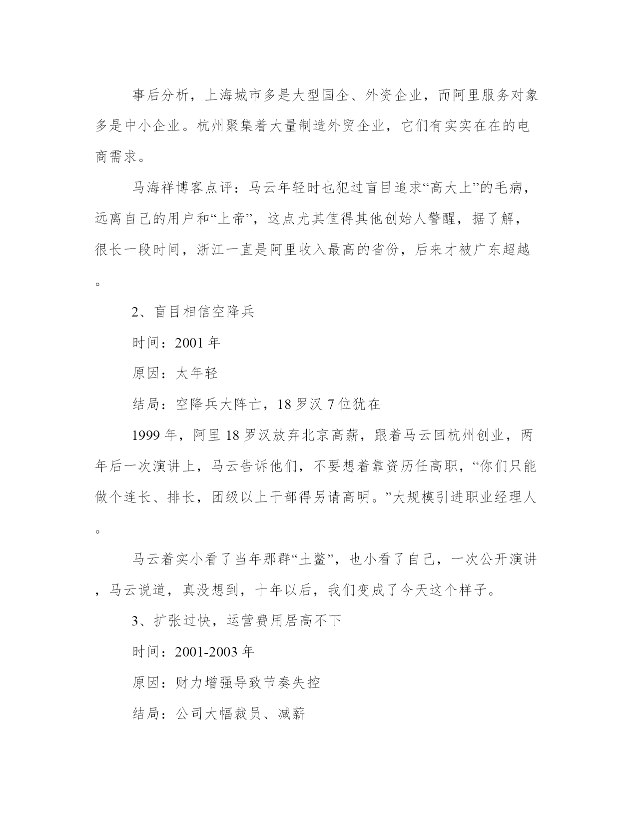 盘点马云在创业过程中犯过的10大错误阿里上市之后,阿里巴巴也将成为中国最大的互联网公司,借着这股上市东风,马云又有被推上了神坛,我们知道,创始人不经千辛万苦,千锤百炼,不吃一堆亏,那是很难成长和成熟起来的,即便是马云也不例外。马云不是完人,也犯过许多错误,其中一些也是致命的,在一次颁奖典礼上,马云也曾说如果将来要写书,就写阿里的1001个错误,他还说阿里其实不止犯过1001个错误,许多错误看到了,但理会的时间都没有,今天,我就借助马海祥博客的平台为大家盘点一下马云在创业过程中所犯过的10大错误。1、好大喜功,迁都上海铩羽而归时间:1999年原因:盲目追求高大上结局:公司总部重新迁回杭州,再也没离开过1999年,阿里刚起步,员工的办公场所,是马云那150平米的家,获得融资后,马云开始飘飘然,将公司总部搬到美国,国内总部搬到上海,马上发现水土不服,又重新迁回杭州,这是马云犯下的第一个错误。事后分析,上海城市多是大型国企、外资企业,而阿里服务对象多是中小企业。杭州聚集着大量制造外贸企业,它们有实实在在的电商需求。马海祥博客点评:马云年轻时也犯过盲目追求“高大上”的毛病,远离自己的用户和“上帝”,这点尤其值得其他创始人警醒,据了解,很长一段时间,浙江一直是阿里收入最高的省份,后来才被广东超越。2、盲目相信空降兵时间:2001年原因:太年轻结局:空降兵大阵亡,18罗汉7位犹在1999年,阿里18罗汉放弃北京高薪,跟着马云回杭州创业,两年后一次演讲上,马云告诉他们,不要想着靠资历任高职,“你们只能做个连长、排长,团级以上干部得另请高明。”大规模引进职业经理人。马云着实小看了当年那群“土鳖”,也小看了自己,一次公开演讲,马云说道,真没想到,十年以后,我们变成了今天这个样子。3、扩张过快,运营费用居高不下时间:2001-2003年原因:财力增强导致节奏失控结局:公司大幅裁员、减薪1999年创办之初,阿里实现市场净利润287万元,随后,又分别获得高盛、软银等500万、2000万美元的投资,财力的增强,打乱了马云原有的节奏,拿到钱后的阿里反陷入混乱之中。2000年,阿里在海外疯狂扩张,运营成本居高不下,在中国香港、美国、欧洲、韩国,需要大量市场推广、广告费用,每月开销是天文数字,且没有分文收入,2001年1月,阿里银行账户余额不足1000万美元。很快,阿里召开了历史上的“遵义会议”,当时担任首席运营官的,是从GE空降的关明生,他在一天之内就把美国团队从40人裁到3人,并且相继关闭在香港、北京、上海办事处,剩下的员工,薪资减半但期权加倍。三个月后,阿里每月运营费从200万美元,缩减到50万,度过了危险期。4、做死雅虎中国,险丧阿里控制权时间:2005年原因:私交甚好的杨致远下台结局:背着骂名将雅虎股权逐渐赎回2005年某一天,雅虎创始人杨致远与马云,在美国一高尔夫球场相遇,那场球赛马云赢了,给杨致远留下深刻印象,回去的路上,杨与马并肩而行,并说“我们把交易定了吧”。那时,杨致远希望将雅虎中国像美国雅虎一样强大,遗憾的是,中国的局面迟迟打不开。从谈判到签署协议,只用了三个月,阿里巴巴收购雅虎中国全部资产,同时得到雅虎10亿美元投资,后者获得阿里39%股权。马云野心勃勃,请来了著名导演给雅虎中国拍广告,但雅虎中国后来变得既不像门户,又不像搜索引擎,马云在雅虎中国上几乎毫无作为,丧失了跟中小企业相关度很高的搜索引擎发展战略机遇期,后来推一淘等搜索引擎其实就相当于阿里平台内部搜索引擎,今年,阿里更是将搜索业务整体打包给UC,以UC班底为核心组建神马搜索。2007年,阿里香港上市IPO文件中披露,2010年起,雅虎将增强在阿里董事会话语权,持股份额将高于35%,并不排除马云存在被驱逐出董事会的情况。后来闹得沸沸扬扬的马云将支付宝资产转为阿里管理层所有的争议都是当年“收购雅虎中国”,出让过多的阿里股权给雅虎埋下的祸根。5、收购口碑网整合失败,O2O机遇没抓住时间:2006年原因:战略失误,口碑与对手差距拉大结局:盲羊补牢,阿里战略投资美团2004年,阿里前员工李治国出走,创办口碑网,前几年发展很快,用户突破100万,当时的阿里,恰好进行架构调整,成立2B、2C事业群,马云希望把口碑网整合进来,壮大2C端力量。2006年,马云找到李治国,问:“是想让口碑独立上市呢,还是回到阿里一起干针对2C的事?”李治国毫不犹豫选择后者,当年,阿里以600万美元战略投资口碑网,两年后,口碑网被阿里全资并购。随后的几年,口碑网曾一度成为大众点评最大竞争对手,2009年,阿里升级“大淘宝”战略,口碑网被并入淘宝,原以为,淘宝能给口碑导入足够的流量,其实不然,口碑网与大众点评、以及后来冒出来的美团的差距越来越大。2011年阿里以5000万美元的价格,入股口碑的竞争对手——美团,这标志