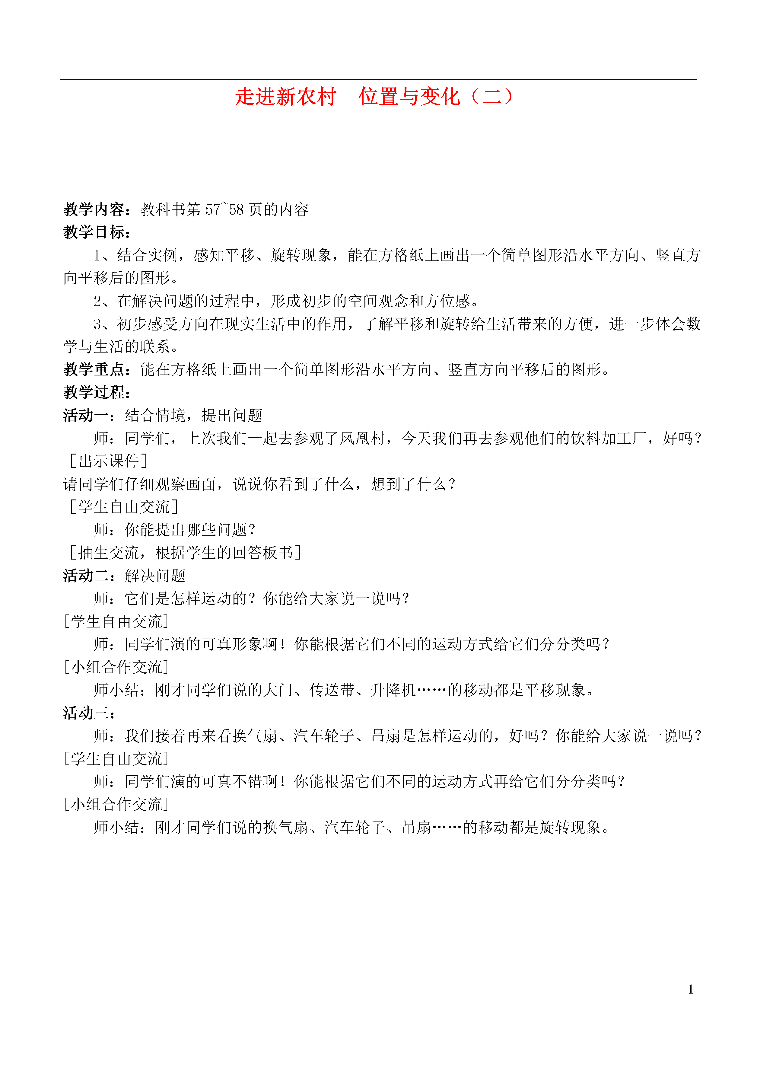 1走进新农村位置与变化(二)教学内容:教科书第57~58页的内容教学目标:1、结合实例,感知平移、旋转现象,能在方格纸上画出一个简单图形沿水平方向、竖直方向平移后的图形。2、在解决问题的过程中,形成初步的空间观念和方位感。3、初步感受方向在现实生活中的作用,了解平移和旋转给生活带来的方便,进一步体会数学与生活的联系。教学重点:能在方格纸上画出一个简单图形沿水平方向、竖直方向平移后的图形。教学过程:活动一:结合情境,提出问题师:同学们,上次我们一起去参观了凤凰村,今天我们再去参观他们的饮料加工厂,好吗?[出示课件]请同学们仔细观察画面,说说你看到了什么,想到了什么?[学生自由交流]师:你能提出哪些问题?[抽生交流,根据学生的回答板书]活动二:解决问题师:它们是怎样运动的?你能给大家说一说吗?[学生自由交流]师:同学们演的可真形象啊!你能根据它们不同的运动方式给它们分分类吗?[小组合作交流]师小结:刚才同学们说的大门、传送带、升降机……的移动都是平移现象。活动三:师:我们接着再来看换气扇、汽车轮子、吊扇是怎样运动的,好吗?你能给大家说一说吗?[学生自由交流]师:同学们演的可真不错啊!你能根据它们不同的运动方式再给它们分分类吗?[小组合作交流]师小结:刚才同学们说的换气扇、汽车轮子、吊扇……的移动都是旋转现象。