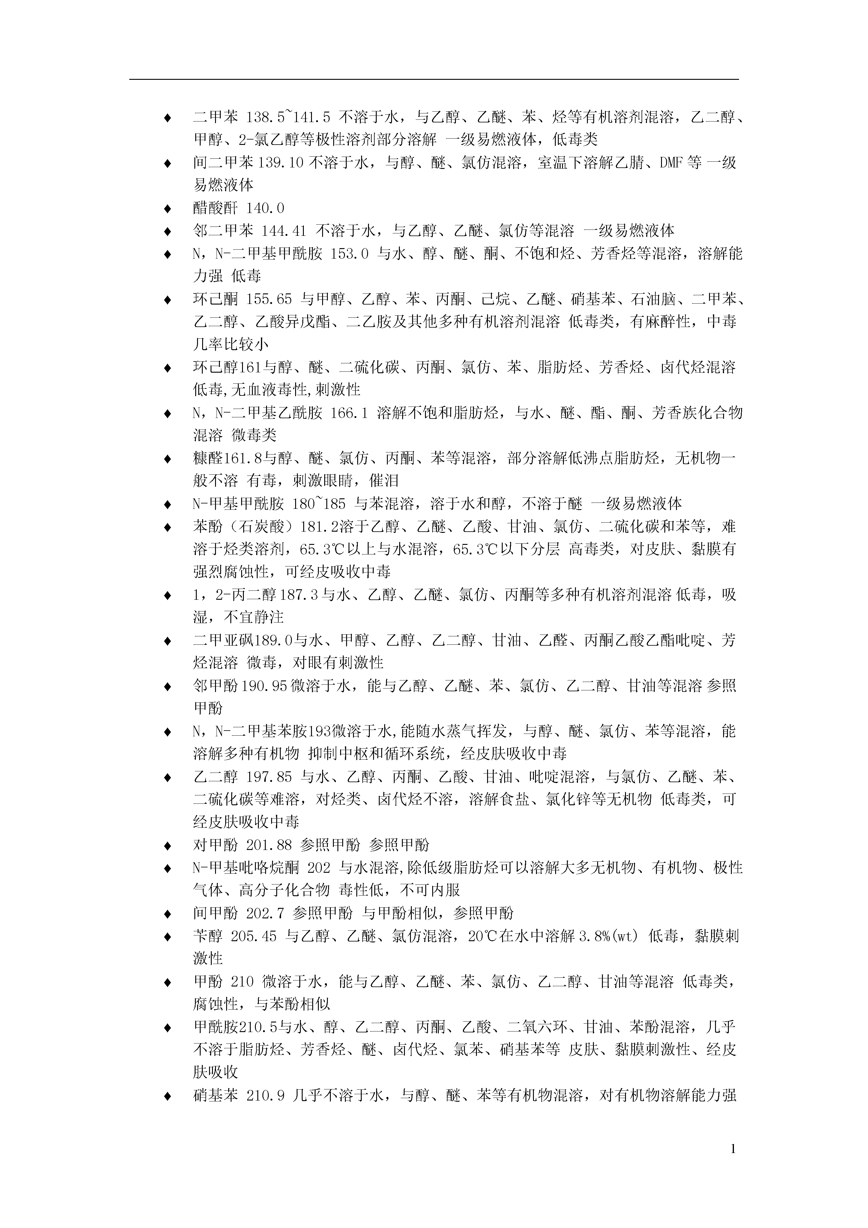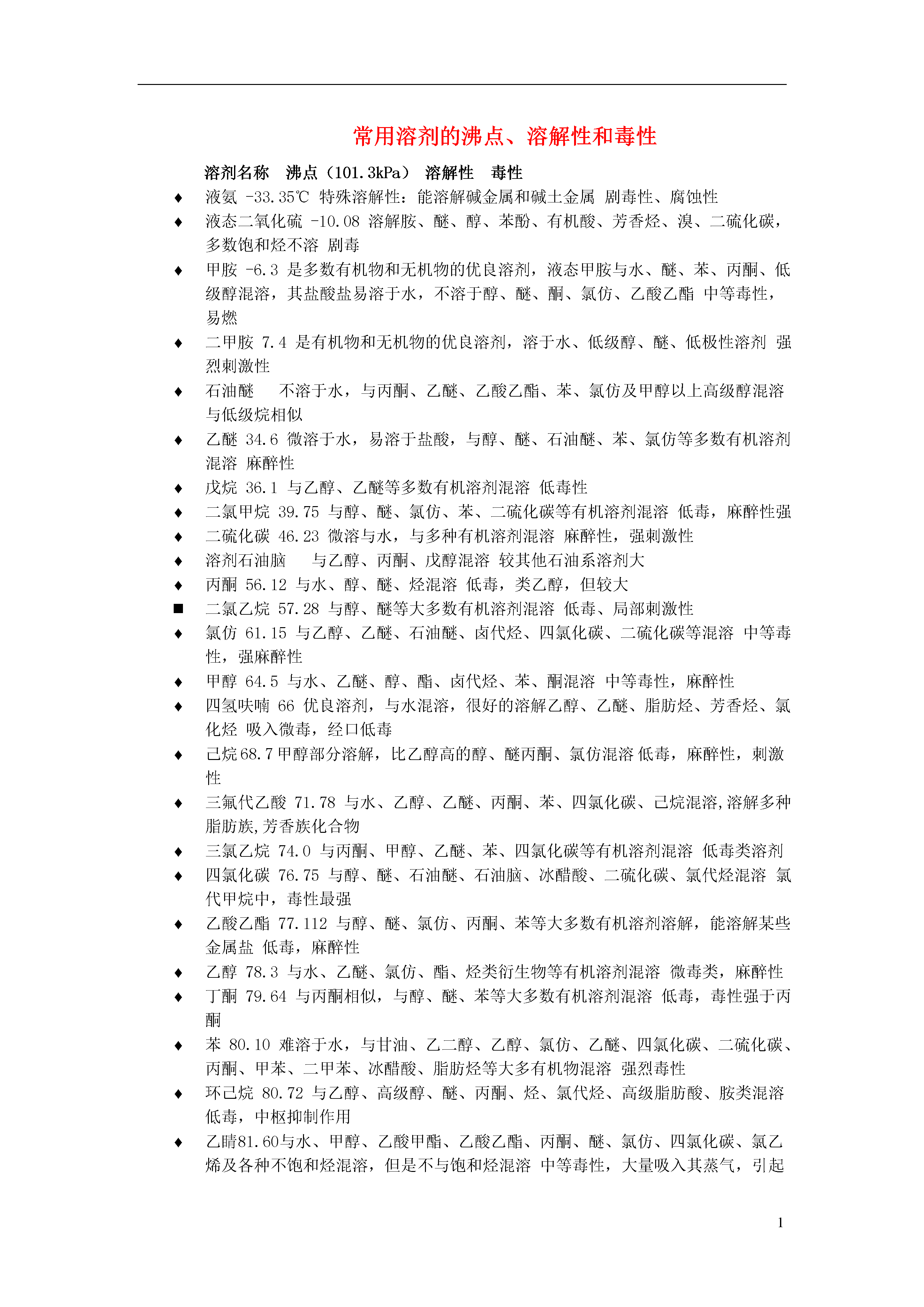 1常用溶剂的沸点、溶解性和毒性溶剂名称沸点(101.3kPa)溶解性毒性液氨-33.35℃特殊溶解性:能溶解碱金属和碱土金属剧毒性、腐蚀性液态二氧化硫-10.08溶解胺、醚、醇、苯酚、有机酸、芳香烃、溴、二硫化碳,多数饱和烃不溶剧毒甲胺-6.3是多数有机物和无机物的优良溶剂,液态甲胺与水、醚、苯、丙酮、低级醇混溶,其盐酸盐易溶于水,不溶于醇、醚、酮、氯仿、乙酸乙酯中等毒性,易燃二甲胺7.4是有机物和无机物的优良溶剂,溶于水、低级醇、醚、低极性溶剂强烈刺激性石油醚不溶于水,与丙酮、乙醚、乙酸乙酯、苯、氯仿及甲醇以上高级醇混溶与低级烷相似乙醚34.6微溶于水,易溶于盐酸,与醇、醚、石油醚、苯、氯仿等多数有机溶剂混溶麻醉性戊烷36.1与乙醇、乙醚等多数有机溶剂混溶低毒性二氯甲烷39.75与醇、醚、氯仿、苯、二硫化碳等有机溶剂混溶低毒,麻醉性强二硫化碳46.23微溶与水,与多种有机溶剂混溶麻醉性,强刺激性溶剂石油脑与乙醇、丙酮、戊醇混溶较其他石油系溶剂大丙酮56.12与水、醇、醚、烃混溶低毒,类乙醇,但较大二氯乙烷57.28与醇、醚等大多数有机溶剂混溶低毒、局部刺激性氯仿61.15与乙醇、乙醚、石油醚、卤代烃、四氯化碳、二硫化碳等混溶中等毒性,强麻醉性甲醇64.5与水、乙醚、醇、酯、卤代烃、苯、酮混溶中等毒性,麻醉性四氢呋喃66优良溶剂,与水混溶,很好的溶解乙醇、乙醚、脂肪烃、芳香烃、氯化烃吸入微毒,经口低毒己烷68.7甲醇部分溶解,比乙醇高的醇、醚丙酮、氯仿混溶低毒,麻醉性,刺激性三氟代乙酸71.78与水、乙醇、乙醚、丙酮、苯、四氯化碳、己烷混溶,溶解多种脂肪族,芳香族化合物三氯乙烷74.0与丙酮、甲醇、乙醚、苯、四氯化碳等有机溶剂混溶低毒类溶剂四氯化碳76.75与醇、醚、石油醚、石油脑、冰醋酸、二硫化碳、氯代烃混溶氯代甲烷中,毒性最强乙酸乙酯77.112与醇、醚、氯仿、丙酮、苯等大多数有机溶剂溶解,能溶解某些金属盐低毒,麻醉性乙醇78.3与水、乙醚、氯仿、酯、烃类衍生物等有机溶剂混溶微毒类,麻醉性丁酮79.64与丙酮相似,与醇、醚、苯等大多数有机溶剂混溶低毒,毒性强于丙酮苯80.10难溶于水,与甘油、乙二醇、乙醇、氯仿、乙醚、四氯化碳、二硫化碳、丙酮、甲苯、二甲苯、冰醋酸、脂肪烃等大多有机物混溶强烈毒性环己烷80.72与乙醇、高级醇、醚、丙酮、烃、氯代烃、高级脂肪酸、胺类混溶低毒,中枢抑制作用乙睛81.60与水、甲醇、乙酸甲酯、乙酸乙酯、丙酮、醚、氯仿、四氯化碳、氯乙烯及各种不饱和烃混溶,但是不与饱和烃混溶中等毒性,大量吸入其蒸气,引起急性中毒异丙醇82.40与乙醇、乙醚、氯仿、水混溶微毒,类似乙醇二氯乙烷83.48与乙醇、乙醚、氯仿、四氯化碳等多种有机溶剂混溶高毒性、致癌乙二醇二甲醚85.2溶于水,与醇、醚、酮、酯、烃、氯代烃等多种有机溶剂混溶。能溶解各种树脂,还是二氧化硫、氯代甲烷、乙烯等气体的优良溶剂吸入和经口低毒三氯乙烯87.19不溶于水,与乙醇、乙醚、丙酮、苯、乙酸乙酯、脂肪族氯代烃、汽油混溶有机有毒品三乙胺89.6水:18.7以下混溶,以上微溶;易溶于氯仿、丙酮,溶于乙醇、乙醚易爆,皮肤黏膜刺激性强丙睛97.35溶解醇、醚、DMF、乙二胺等有机物,与多种金属盐形成加成有机物高毒性,与氢氰酸相似庚烷98.4与己烷类似低毒,刺激性、麻醉性水100略略硝基甲烷101.2与醇、醚、四氯化碳、DMF、等混溶麻醉性,刺激性二氧六环101.32能与水及多数有机溶剂混溶,仍溶解能力很强微毒,强于乙醚2~3倍甲苯110.63不溶于水,与甲醇、乙醇、氯仿、丙酮、乙醚、冰醋酸、苯等有机溶剂混溶低毒类,麻醉作用硝基乙烷114.0与醇、醚、氯仿混溶,溶解多种树脂和纤维素衍生物局部刺激性较强吡啶115.3与水、醇、醚、石油醚、苯、油类混溶。能溶多种有机物和无机物低毒,皮肤黏膜刺激性4-甲基-2-戊酮115.9能与乙醇、乙醚、苯等大多数有机溶剂和动植物油相混溶毒性和局部刺激性较强乙二胺117.26溶于水、乙醇、苯和乙醚,微溶于庚烷刺激皮肤、眼睛丁醇117.7与醇、醚、苯混溶低毒,大于乙醇3倍乙酸118.1与水、乙醇、乙醚、四氯化碳混溶,不溶于二硫化碳及C12以上高级脂肪烃低毒,浓溶液毒性强乙二醇一甲醚124.6与水、醛、醚、苯、乙二醇、丙酮、四氯化碳、DMF等混溶低毒类辛烷125.67几乎不溶于水,微溶于乙醇,与醚、丙酮、石油醚、苯、氯仿、汽油混溶低毒性,麻醉性乙酸丁酯126.11优良有机溶剂,广泛应用于医药行业,还可以用做萃取剂一般条件毒性不大吗啉128.94溶解能力强,超过二氧六环、苯、和吡啶,与水混溶,溶解丙酮、苯、乙醚、甲醇、乙