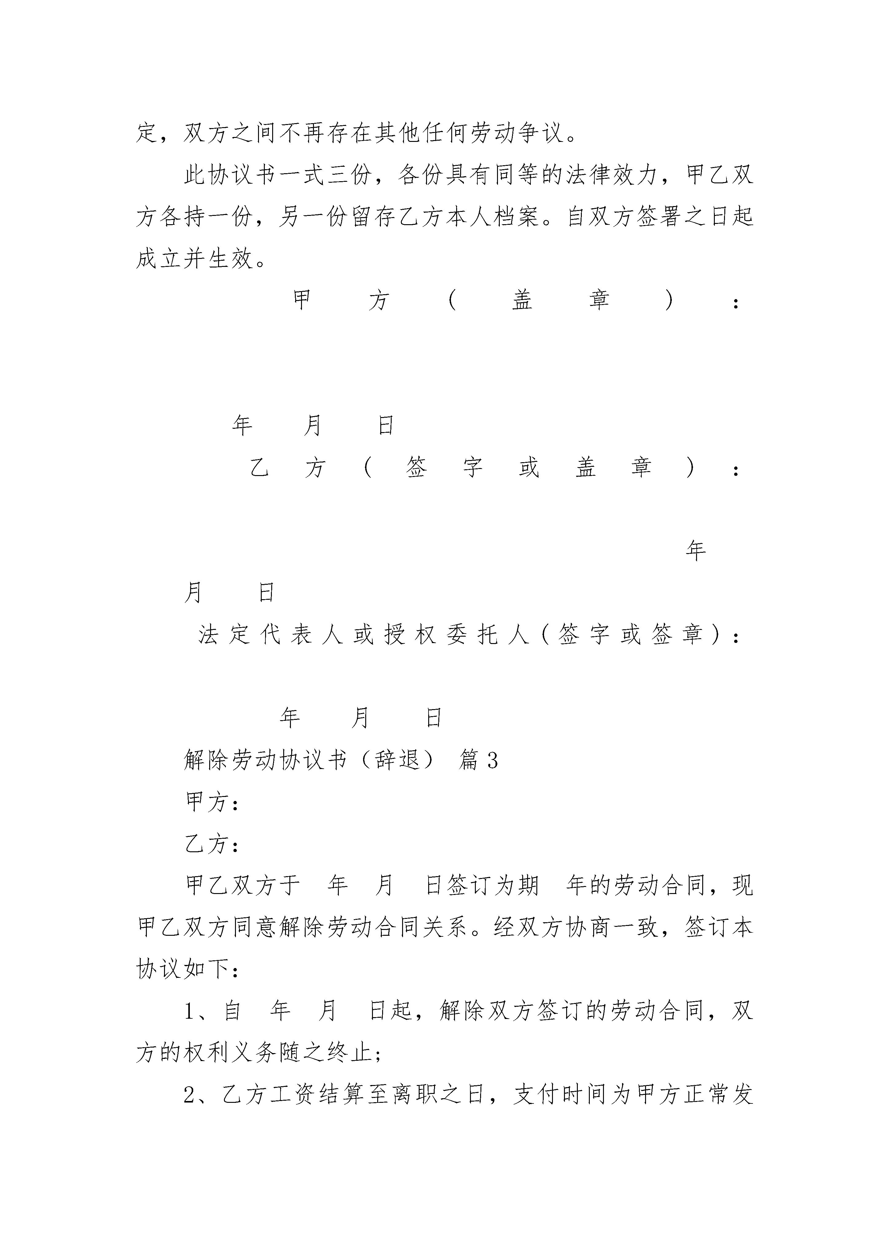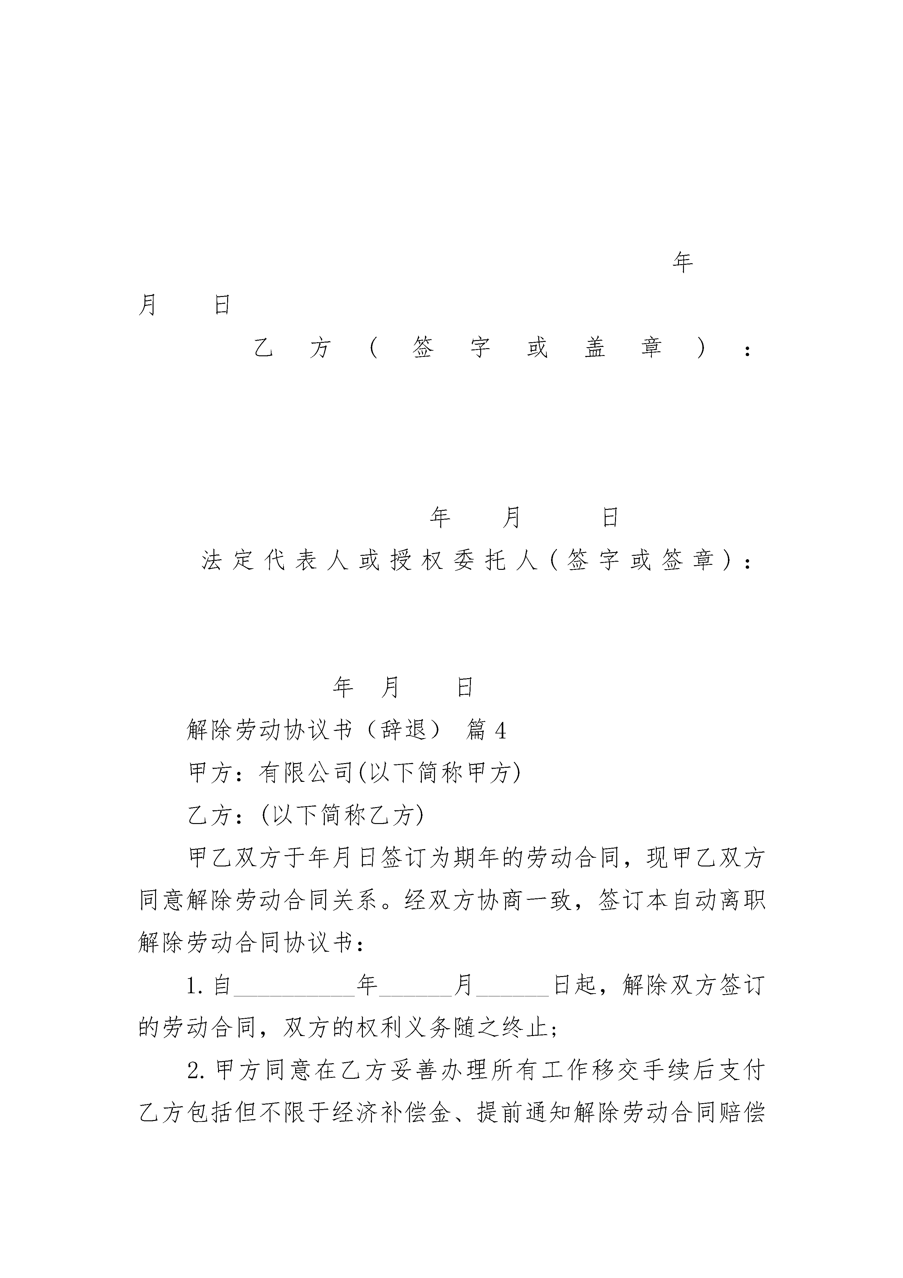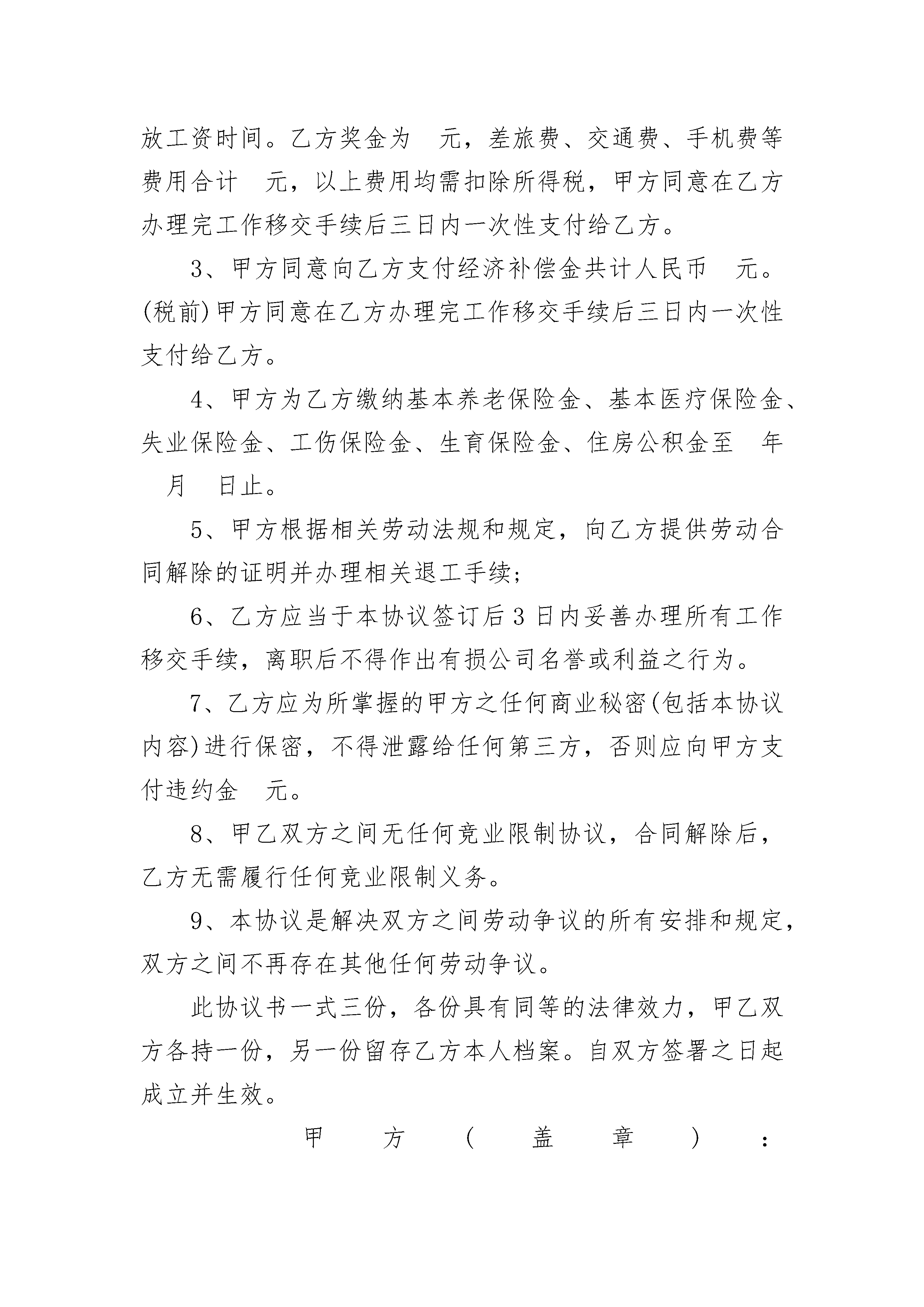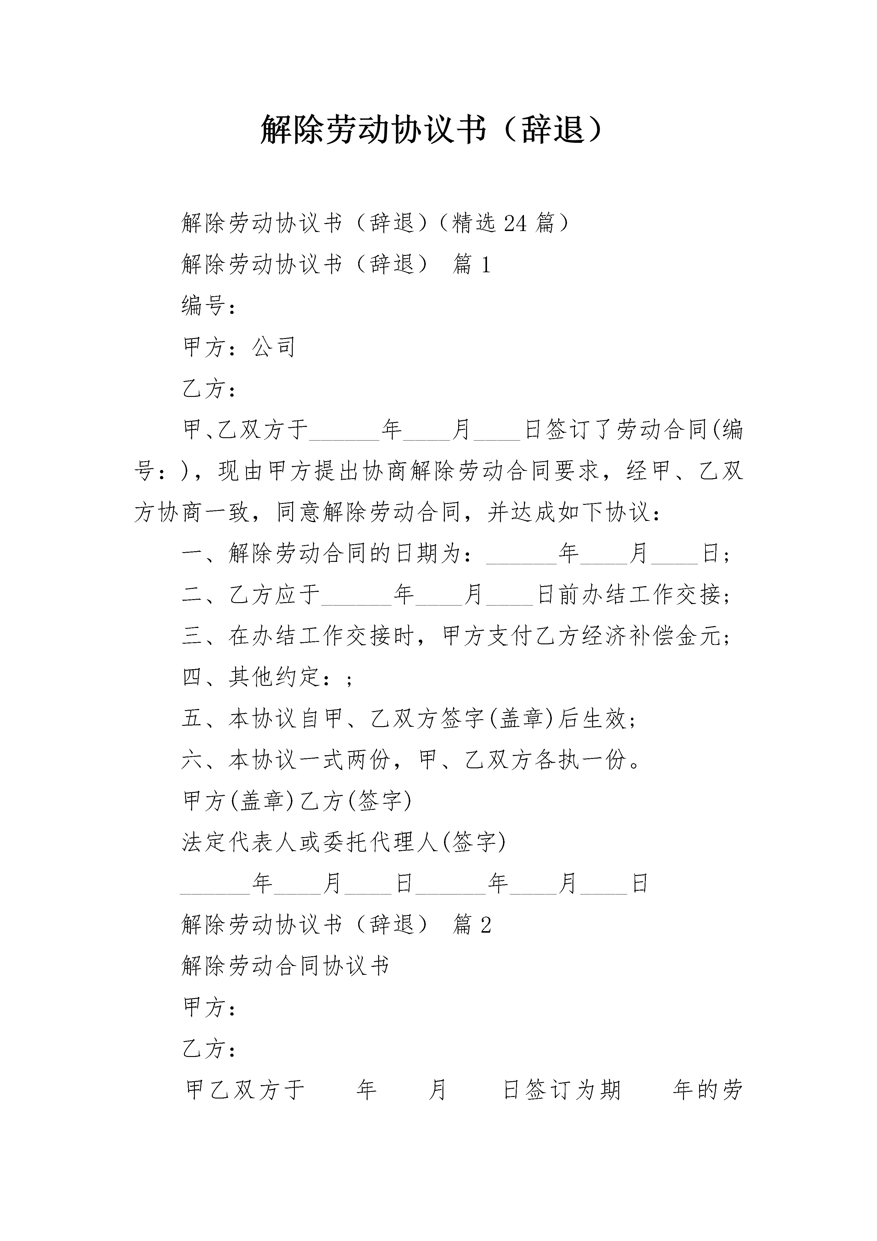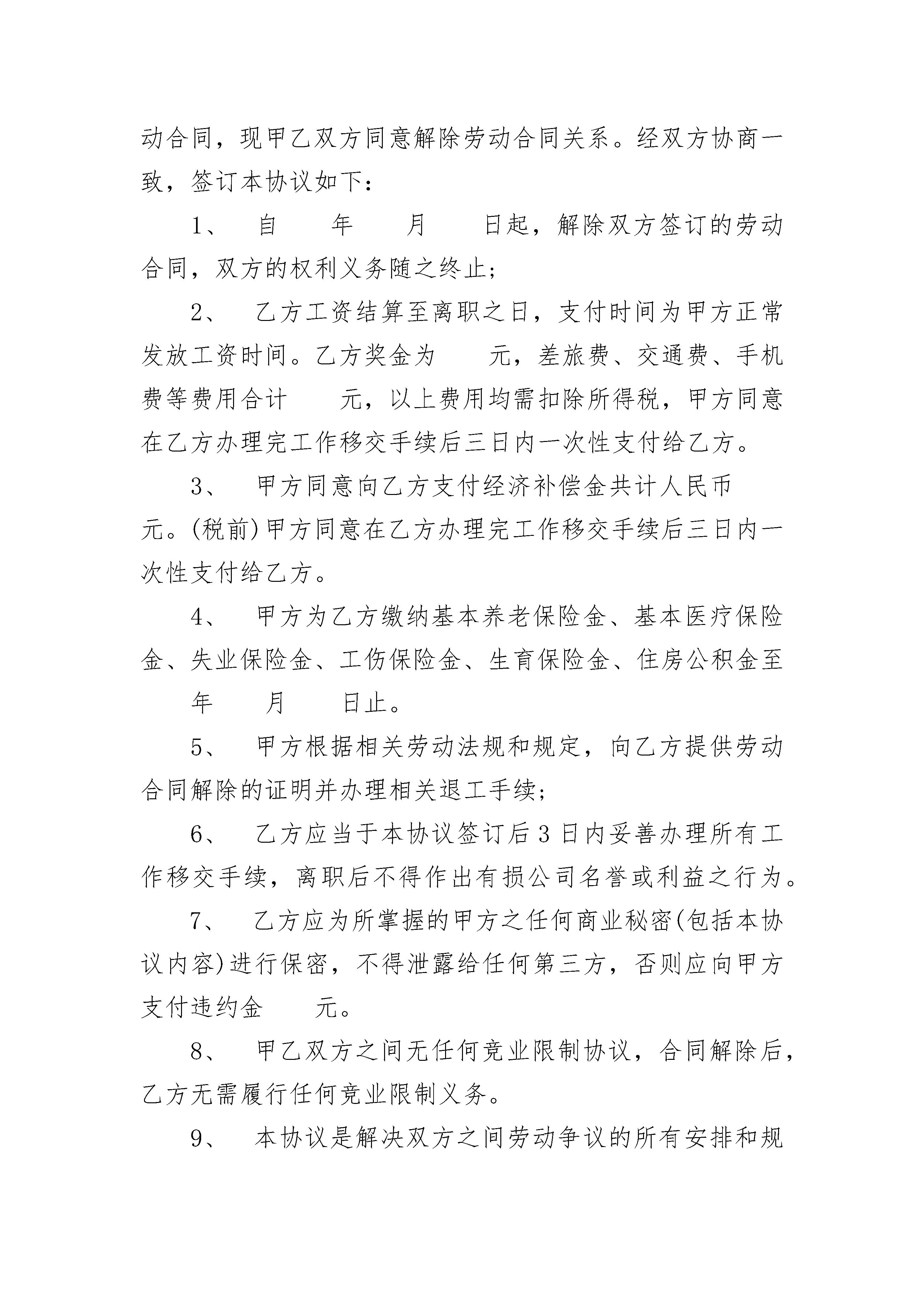 解除劳动协议书(辞退)解除劳动协议书(辞退)(精选24篇)解除劳动协议书(辞退)篇1编号:甲方:公司乙方:甲、乙双方于______年____月____日签订了劳动合同(编号:),现由甲方提出协商解除劳动合同要求,经甲、乙双方协商一致,同意解除劳动合同,并达成如下协议:一、解除劳动合同的日期为:______年____月____日;二、乙方应于______年____月____日前办结工作交接;三、在办结工作交接时,甲方支付乙方经济补偿金元;四、其他约定:;五、本协议自甲、乙双方签字(盖章)后生效;六、本协议一式两份,甲、乙双方各执一份。甲方(盖章)乙方(签字)法定代表人或委托代理人(签字)______年____月____日______年____月____日解除劳动协议书(辞退)篇2解除劳动合同协议书甲方:乙方:甲乙双方于年月日签订为期年的劳动合同,现甲乙双方同意解除劳动合同关系。经双方协商一致,签订本协议如下:1、自年月日起,解除双方签订的劳动合同,双方的权利义务随之终止;2、乙方工资结算至离职之日,支付时间为甲方正常发放工资时间。乙方奖金为元,差旅费、交通费、手机费等费用合计元,以上费用均需扣除所得税,甲方同意在乙方办理完工作移交手续后三日内一次性支付给乙方。3、甲方同意向乙方支付经济补偿金共计人民币元。(税前)甲方同意在乙方办理完工作移交手续后三日内一次性支付给乙方。4、甲方为乙方缴纳基本养老保险金、基本医疗保险金、失业保险金、工伤保险金、生育保险金、住房公积金至年月日止。5、甲方根据相关劳动法规和规定,向乙方提供劳动合同解除的证明并办理相关退工手续;6、乙方应当于本协议签订后3日内妥善办理所有工作移交手续,离职后不得作出有损公司名誉或利益之行为。7、乙方应为所掌握的甲方之任何商业秘密(包括本协议内容)进行保密,不得泄露给任何第三方,否则应向甲方支付违约金元。8、甲乙双方之间无任何竞业限制协议,合同解除后,乙方无需履行任何竞业限制义务。9、本协议是解决双方之间劳动争议的所有安排和规定,双方之间不再存在其他任何劳动争议。此协议书一式三份,各份具有同等的法律效力,甲乙双方各持一份,另一份留存乙方本人档案。自双方签署之日起成立并生效。甲方(盖章):年月日乙方(签字或盖章):年月日法定代表人或授权委托人(签字或签章):年月日解除劳动协议书(辞退)篇3甲方:乙方:甲乙双方于年月日签订为期年的劳动合同,现甲乙双方同意解除劳动合同关系。经双方协商一致,签订本协议如下:1、自年月日起,解除双方签订的劳动合同,双方的权利义务随之终止;2、乙方工资结算至离职之日,支付时间为甲方正常发放工资时间。乙方奖金为元,差旅费、交通费、手机费等费用合计元,以上费用均需扣除所得税,甲方同意在乙方办理完工作移交手续后三日内一次性支付给乙方。3、甲方同意向乙方支付经济补偿金共计人民币元。(税前)甲方同意在乙方办理完工作移交手续后三日内一次性支付给乙方。4、甲方为乙方缴纳基本养老保险金、基本医疗保险金、失业保险金、工伤保险金、生育保险金、住房公积金至年月日止。5、甲方根据相关劳动法规和规定,向乙方提供劳动合同解除的证明并办理相关退工手续;6、乙方应当于本协议签订后3日内妥善办理所有工作移交手续,离职后不得作出有损公司名誉或利益之行为。7、乙方应为所掌握的甲方之任何商业秘密(包括本协议内容)进行保密,不得泄露给任何第三方,否则应向甲方支付违约金元。8、甲乙双方之间无任何竞业限制协议,合同解除后,乙方无需履行任何竞业限制义务。9、本协议是解决双方之间劳动争议的所有安排和规定,双方之间不再存在其他任何劳动争议。此协议书一式三份,各份具有同等的法律效力,甲乙双方各持一份,另一份留存乙方本人档案。自双方签署之日起成立并生效。甲方(盖章):年月日乙方(签字或盖章):年月日法定代表人或授权委托人(签字或签章):