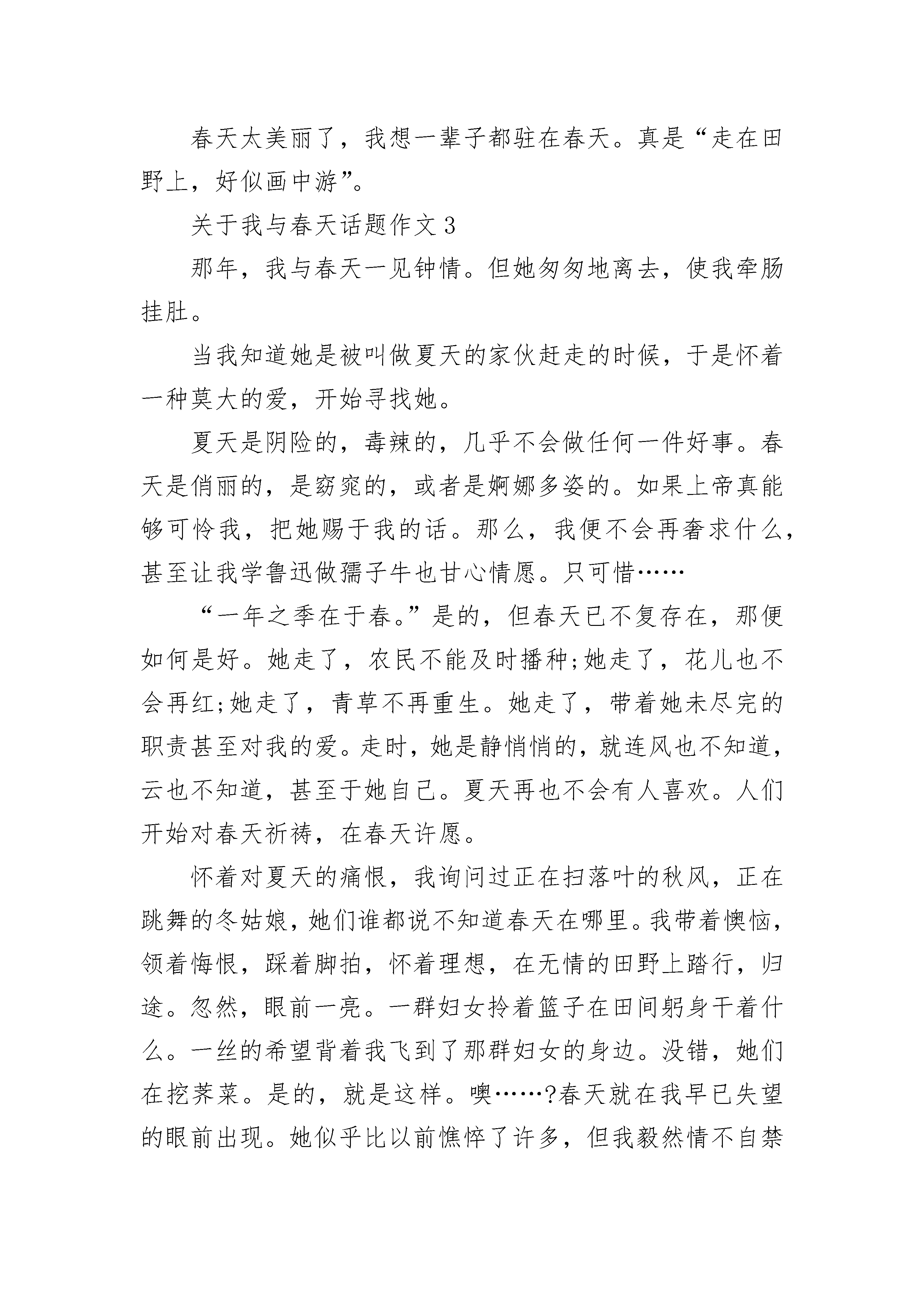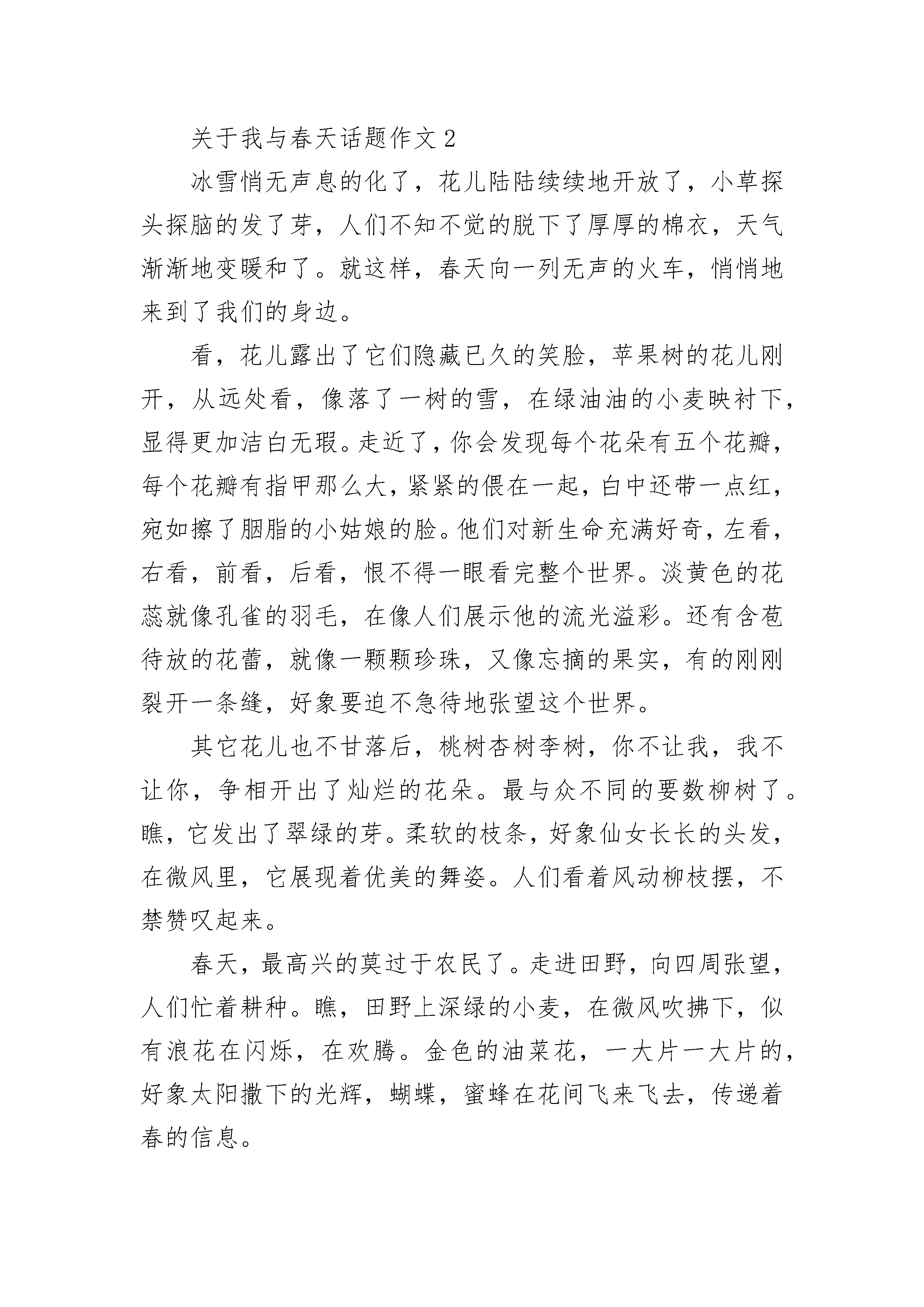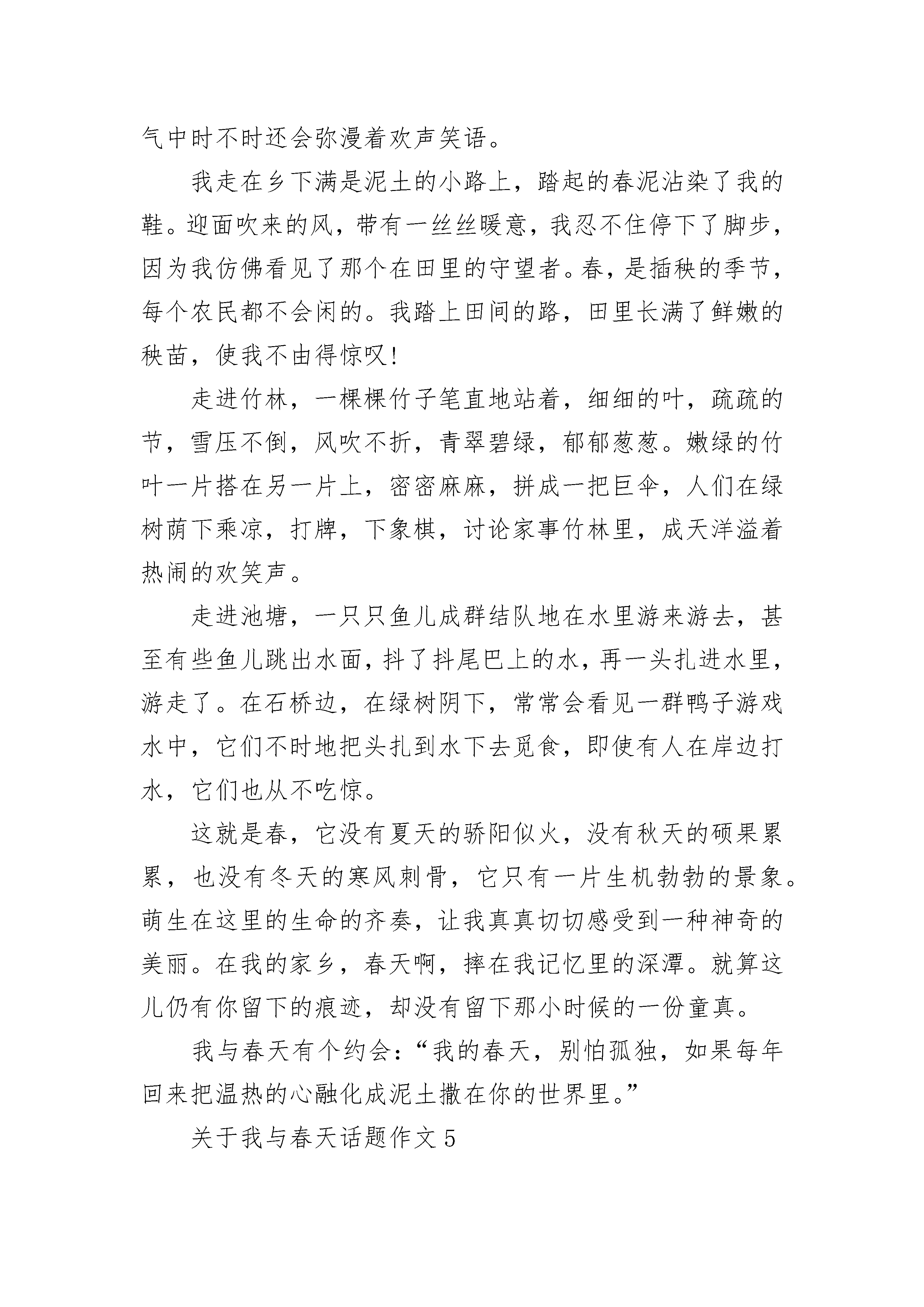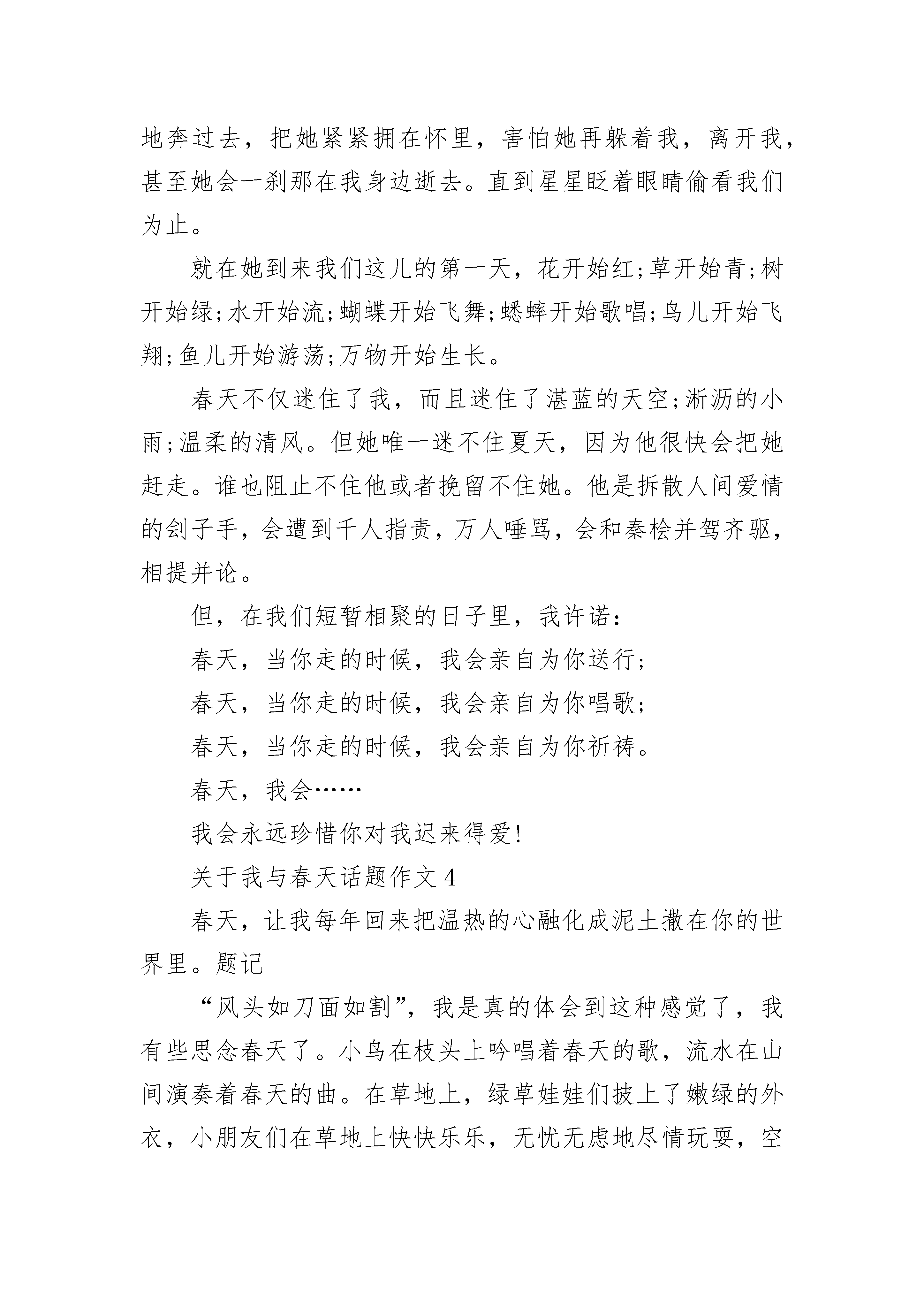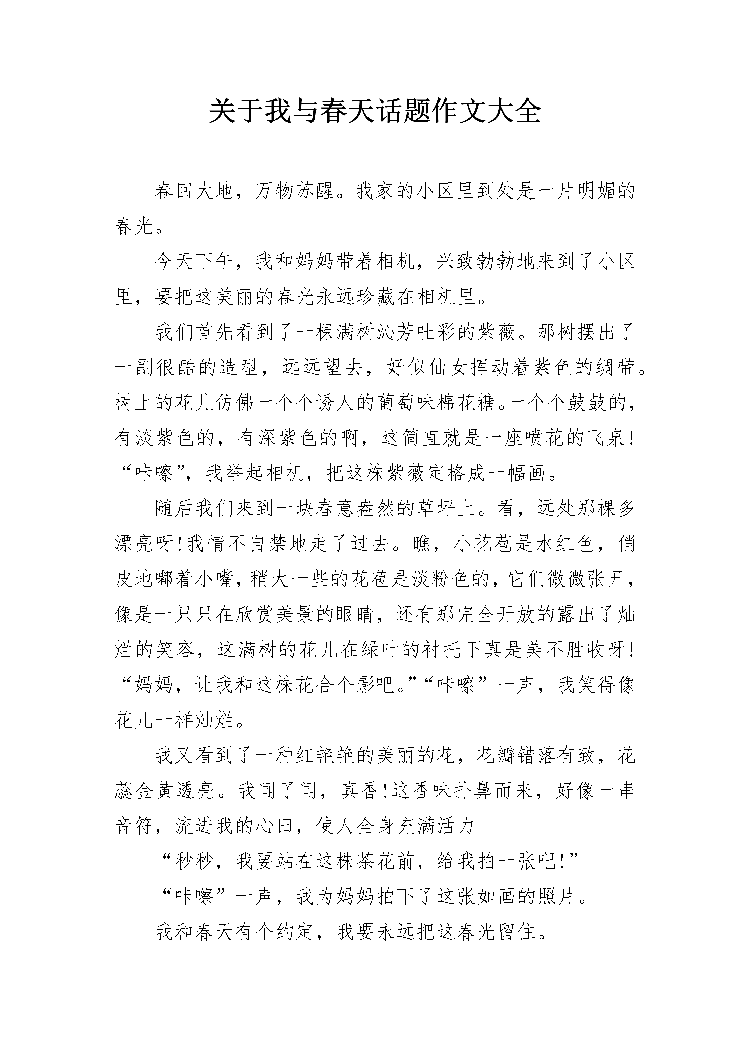 关于我与春天话题作文大全春回大地,万物苏醒。我家的小区里到处是一片明媚的春光。今天下午,我和妈妈带着相机,兴致勃勃地来到了小区里,要把这美丽的春光永远珍藏在相机里。我们首先看到了一棵满树沁芳吐彩的紫薇。那树摆出了一副很酷的造型,远远望去,好似仙女挥动着紫色的绸带。树上的花儿仿佛一个个诱人的葡萄味棉花糖。一个个鼓鼓的,有淡紫色的,有深紫色的啊,这简直就是一座喷花的飞泉!“咔嚓”,我举起相机,把这株紫薇定格成一幅画。随后我们来到一块春意盎然的草坪上。看,远处那棵多漂亮呀!我情不自禁地走了过去。瞧,小花苞是水红色,俏皮地嘟着小嘴,稍大一些的花苞是淡粉色的,它们微微张开,像是一只只在欣赏美景的眼睛,还有那完全开放的露出了灿烂的笑容,这满树的花儿在绿叶的衬托下真是美不胜收呀!“妈妈,让我和这株花合个影吧。”“咔嚓”一声,我笑得像花儿一样灿烂。我又看到了一种红艳艳的美丽的花,花瓣错落有致,花蕊金黄透亮。我闻了闻,真香!这香味扑鼻而来,好像一串音符,流进我的心田,使人全身充满活力“秒秒,我要站在这株茶花前,给我拍一张吧!”“咔嚓”一声,我为妈妈拍下了这张如画的照片。我和春天有个约定,我要永远把这春光留住。关于我与春天话题作文2冰雪悄无声息的化了,花儿陆陆续续地开放了,小草探头探脑的发了芽,人们不知不觉的脱下了厚厚的棉衣,天气渐渐地变暖和了。就这样,春天向一列无声的火车,悄悄地来到了我们的身边。看,花儿露出了它们隐藏已久的笑脸,苹果树的花儿刚开,从远处看,像落了一树的雪,在绿油油的小麦映衬下,显得更加洁白无瑕。走近了,你会发现每个花朵有五个花瓣,每个花瓣有指甲那么大,紧紧的偎在一起,白中还带一点红,宛如擦了胭脂的小姑娘的脸。他们对新生命充满好奇,左看,右看,前看,后看,恨不得一眼看完整个世界。淡黄色的花蕊就像孔雀的羽毛,在像人们展示他的流光溢彩。还有含苞待放的花蕾,就像一颗颗珍珠,又像忘摘的果实,有的刚刚裂开一条缝,好象要迫不急待地张望这个世界。其它花儿也不甘落后,桃树杏树李树,你不让我,我不让你,争相开出了灿烂的花朵。最与众不同的要数柳树了。瞧,它发出了翠绿的芽。柔软的枝条,好象仙女长长的头发,在微风里,它展现着优美的舞姿。人们看着风动柳枝摆,不禁赞叹起来。春天,最高兴的莫过于农民了。走进田野,向四周张望,人们忙着耕种。瞧,田野上深绿的小麦,在微风吹拂下,似有浪花在闪烁,在欢腾。金色的油菜花,一大片一大片的,好象太阳撒下的光辉,蝴蝶,蜜蜂在花间飞来飞去,传递着春的信息。春天太美丽了,我想一辈子都驻在春天。真是“走在田野上,好似画中游”。关于我与春天话题作文3那年,我与春天一见钟情。但她匆匆地离去,使我牵肠挂肚。当我知道她是被叫做夏天的家伙赶走的时候,于是怀着一种莫大的爱,开始寻找她。夏天是阴险的,毒辣的,几乎不会做任何一件好事。春天是俏丽的,是窈窕的,或者是婀娜多姿的。如果上帝真能够可怜我,把她赐于我的话。那么,我便不会再奢求什么,甚至让我学鲁迅做孺子牛也甘心情愿。只可惜……“一年之季在于春。”是的,但春天已不复存在,那便如何是好。她走了,农民不能及时播种;她走了,花儿也不会再红;她走了,青草不再重生。她走了,带着她未尽完的职责甚至对我的爱。走时,她是静悄悄的,就连风也不知道,云也不知道,甚至于她自己。夏天再也不会有人喜欢。人们开始对春天祈祷,在春天许愿。怀着对夏天的痛恨,我询问过正在扫落叶的秋风,正在跳舞的冬姑娘,她们谁都说不知道春天在哪里。我带着懊恼,领着悔恨,踩着脚拍,怀着理想,在无情的田野上踏行,归途。忽然,眼前一亮。一群妇女拎着篮子在田间躬身干着什么。一丝的希望背着我飞到了那群妇女的身边。没错,她们在挖荠菜。是的,就是这样。噢……?春天就在我早已失望的眼前出现。她似乎比以前憔悴了许多,但我毅然情不自禁地奔过去,把她紧紧拥在怀里,害怕她再躲着我,离开我,甚至她会一刹那在我身边逝去。直到星星眨着眼睛偷看我们为止。就在她到来我们这儿的第一天,花开始红;草开始青;树开始绿;水开始流;蝴蝶开始飞舞;蟋蟀开始歌唱;鸟儿开始飞翔;鱼儿开始游荡;万物开始生长。春天不仅迷住了我,而且迷住了湛蓝的天空;淅沥的小雨;温柔的清风。但她唯一迷不住夏天,因为他很快会把她赶走。谁也阻止不住他或者挽留不住她。他是拆散人间爱情的刽子手,会遭到千人指责,万人唾骂,会和秦桧并驾齐驱,相提并论。但,在我们短暂相聚的日子里,我许诺:春天,当你走的时候,我会亲自为你送行;春天,当你走的时候,我会亲自为你唱歌;春天,当你走的时候,我会亲自为你祈祷。春天,我会……我会永远珍惜你对我迟来得爱!关于我与春天话题作文4春天,让我每年回来把温热的心融化成泥土撒在你的世界里。题记“风头如刀面如割”,我是真的体会到这种感觉了,我有些思念春天了。小鸟在枝头上吟唱着春天的歌,流水在山间演奏