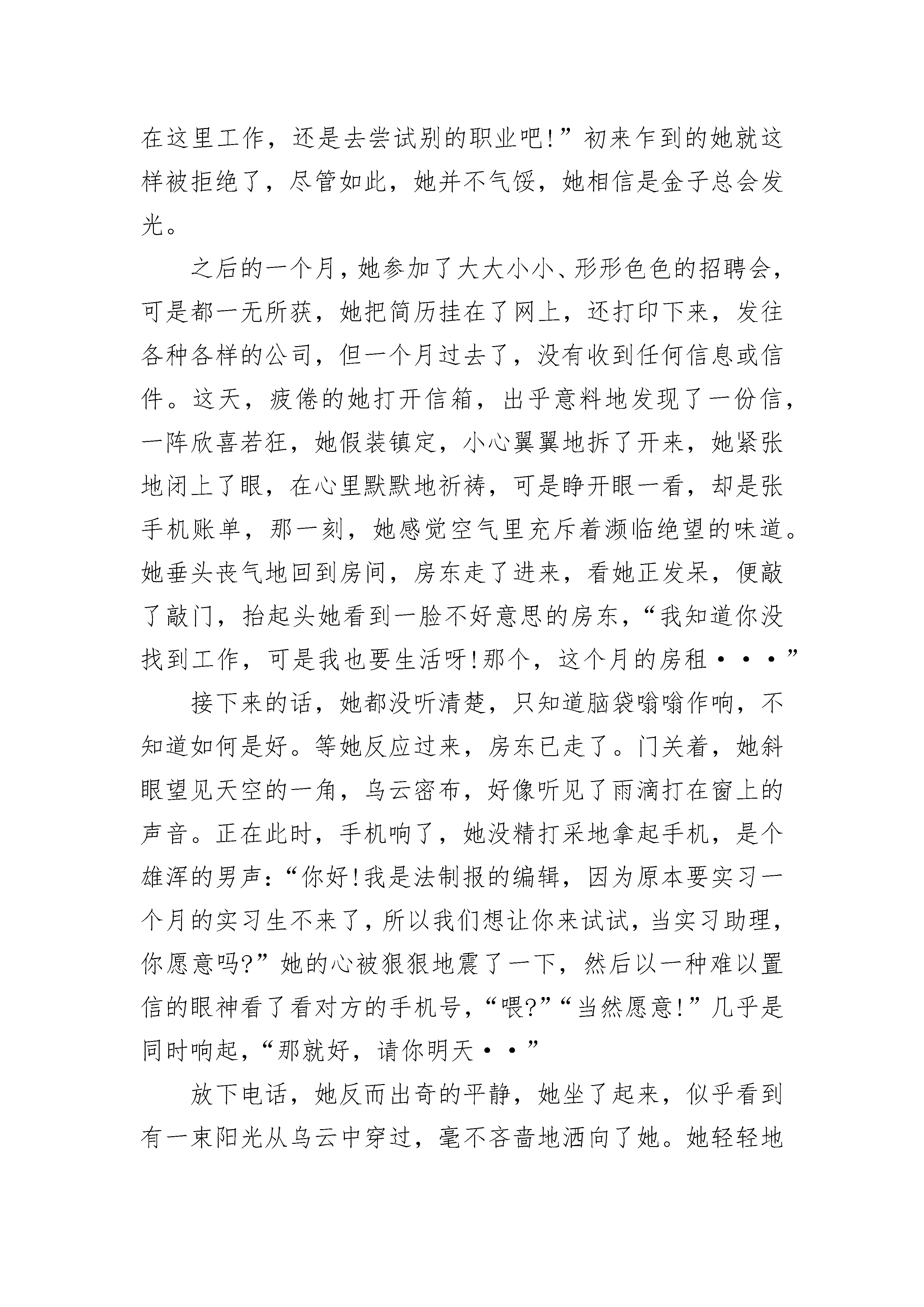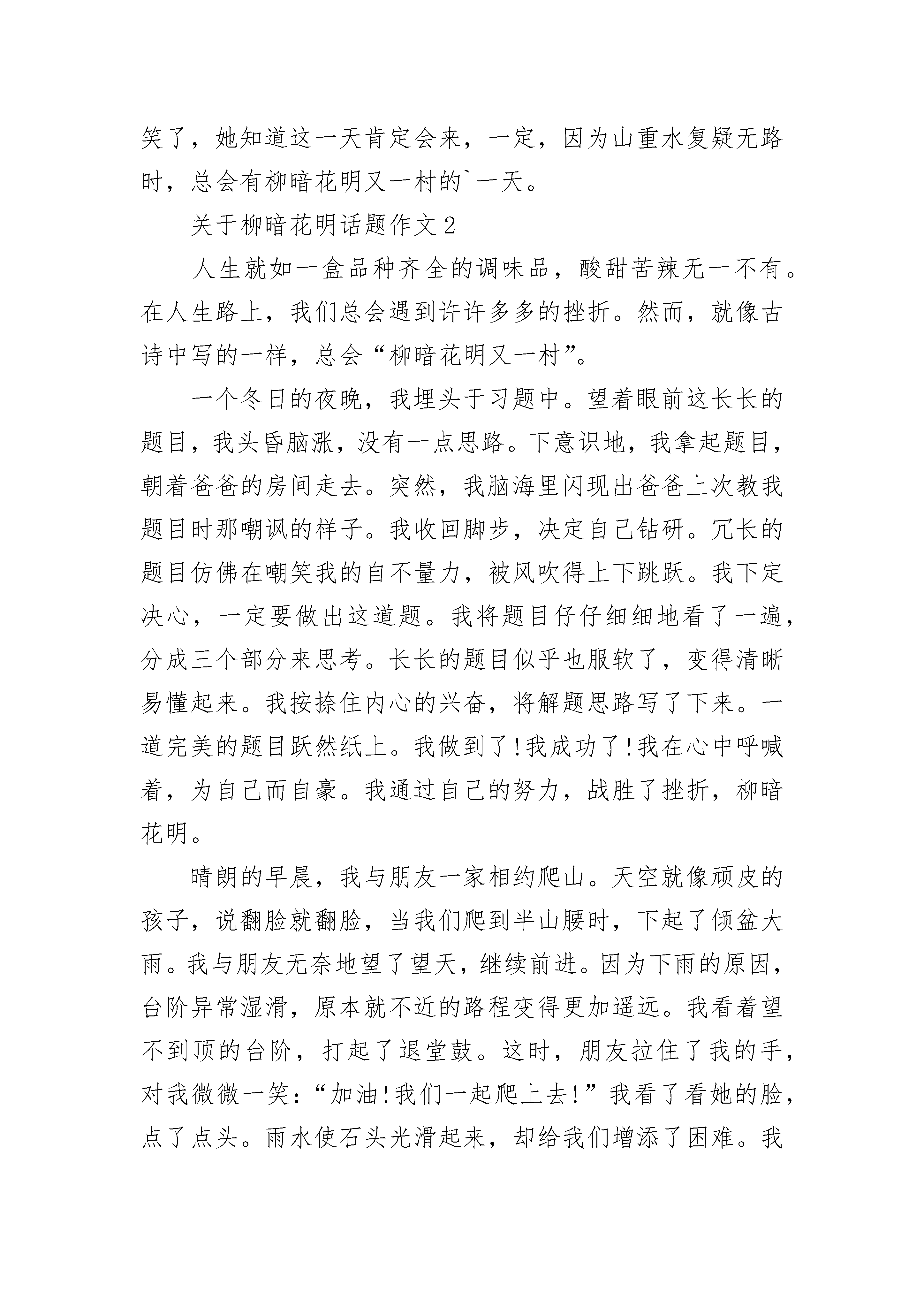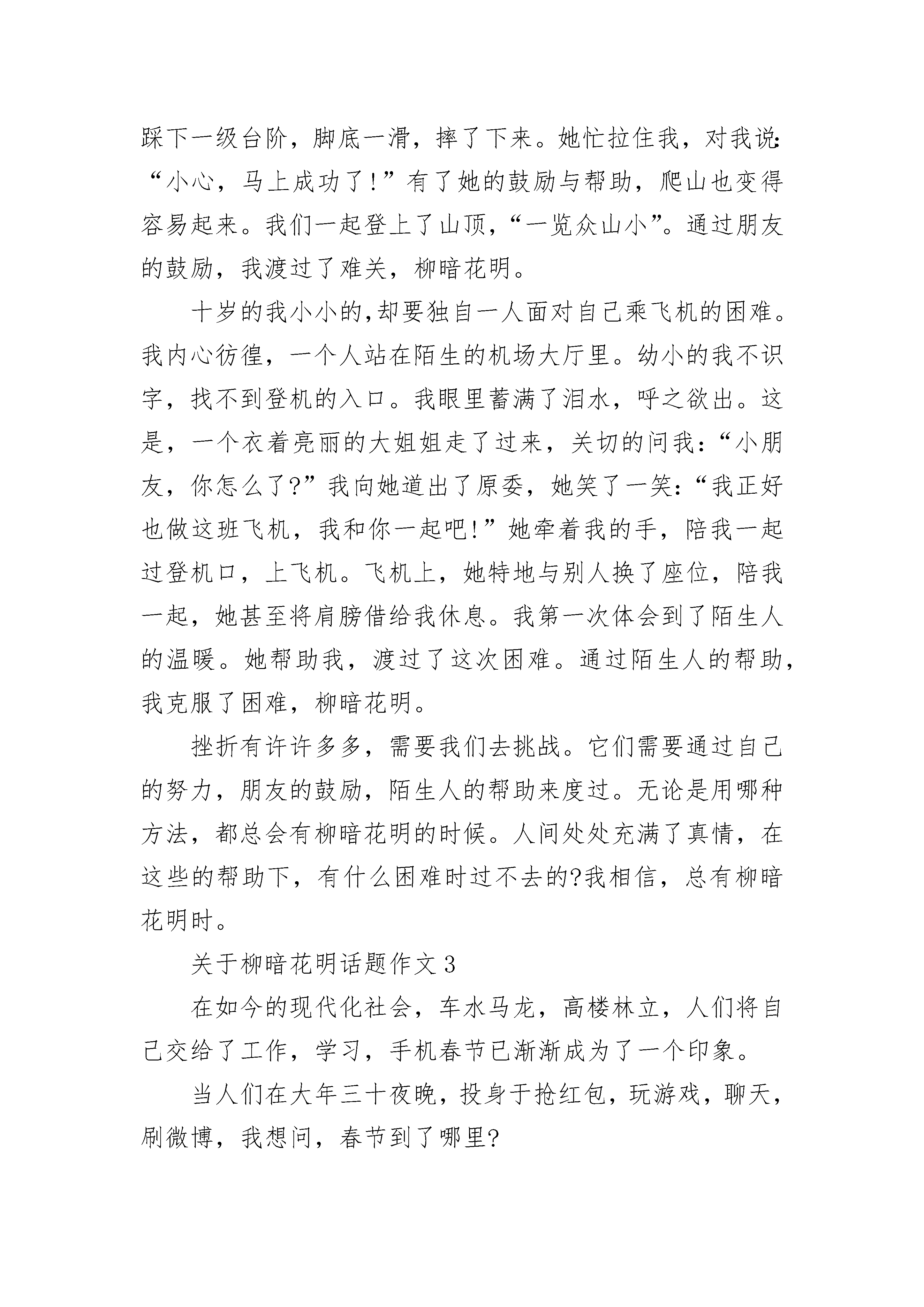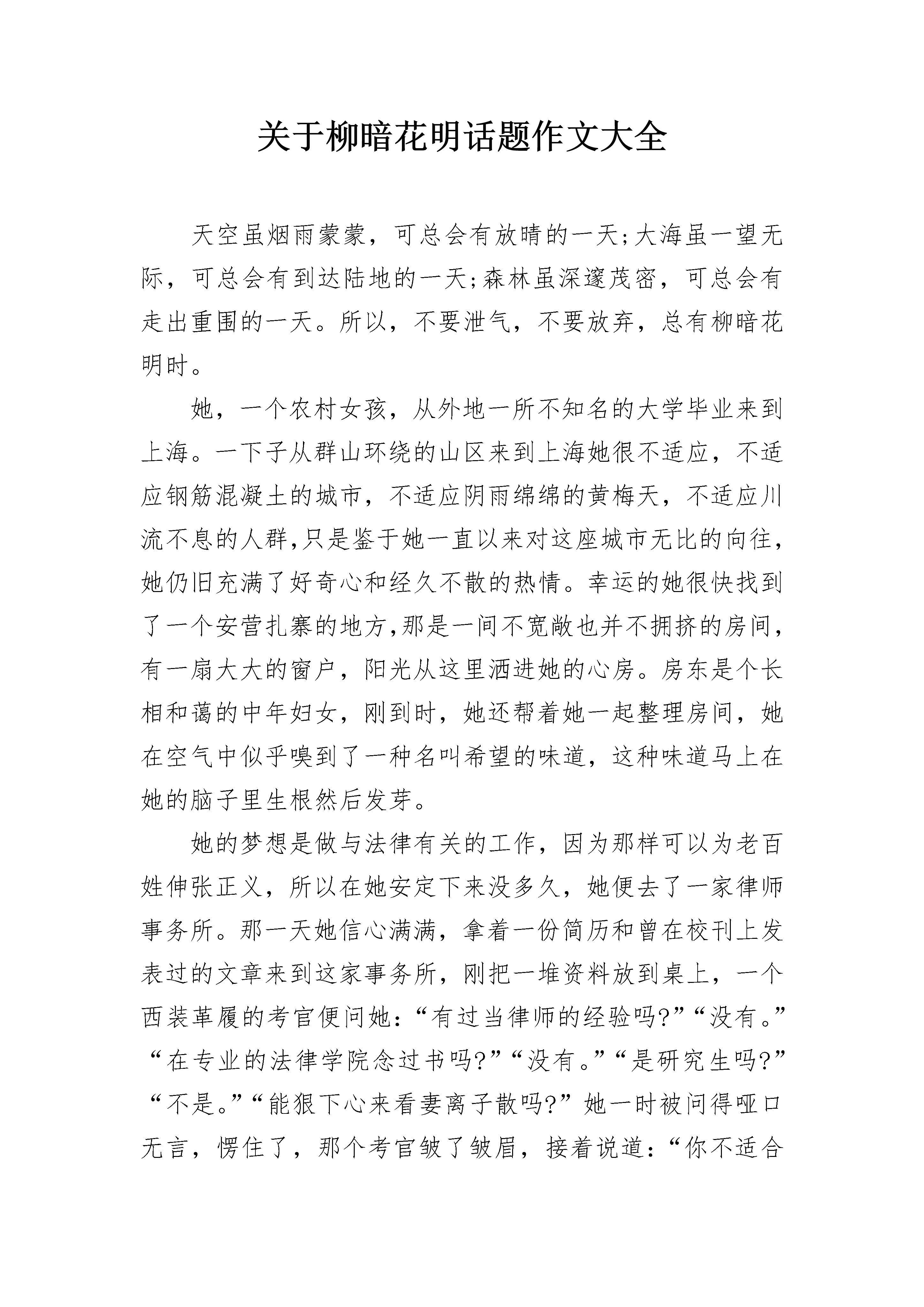 关于柳暗花明话题作文大全天空虽烟雨蒙蒙,可总会有放晴的一天;大海虽一望无际,可总会有到达陆地的一天;森林虽深邃茂密,可总会有走出重围的一天。所以,不要泄气,不要放弃,总有柳暗花明时。她,一个农村女孩,从外地一所不知名的大学毕业来到上海。一下子从群山环绕的山区来到上海她很不适应,不适应钢筋混凝土的城市,不适应阴雨绵绵的黄梅天,不适应川流不息的人群,只是鉴于她一直以来对这座城市无比的向往,她仍旧充满了好奇心和经久不散的热情。幸运的她很快找到了一个安营扎寨的地方,那是一间不宽敞也并不拥挤的房间,有一扇大大的窗户,阳光从这里洒进她的心房。房东是个长相和蔼的中年妇女,刚到时,她还帮着她一起整理房间,她在空气中似乎嗅到了一种名叫希望的味道,这种味道马上在她的脑子里生根然后发芽。她的梦想是做与法律有关的工作,因为那样可以为老百姓伸张正义,所以在她安定下来没多久,她便去了一家律师事务所。那一天她信心满满,拿着一份简历和曾在校刊上发表过的文章来到这家事务所,刚把一堆资料放到桌上,一个西装革履的考官便问她:“有过当律师的经验吗?”“没有。”“在专业的法律学院念过书吗?”“没有。”“是研究生吗?”“不是。”“能狠下心来看妻离子散吗?”她一时被问得哑口无言,愣住了,那个考官皱了皱眉,接着说道:“你不适合在这里工作,还是去尝试别的职业吧!”初来乍到的她就这样被拒绝了,尽管如此,她并不气馁,她相信是金子总会发光。之后的一个月,她参加了大大小小、形形色色的招聘会,可是都一无所获,她把简历挂在了网上,还打印下来,发往各种各样的公司,但一个月过去了,没有收到任何信息或信件。这天,疲倦的她打开信箱,出乎意料地发现了一份信,一阵欣喜若狂,她假装镇定,小心翼翼地拆了开来,她紧张地闭上了眼,在心里默默地祈祷,可是睁开眼一看,却是张手机账单,那一刻,她感觉空气里充斥着濒临绝望的味道。她垂头丧气地回到房间,房东走了进来,看她正发呆,便敲了敲门,抬起头她看到一脸不好意思的房东,“我知道你没找到工作,可是我也要生活呀!那个,这个月的房租···”接下来的话,她都没听清楚,只知道脑袋嗡嗡作响,不知道如何是好。等她反应过来,房东已走了。门关着,她斜眼望见天空的一角,乌云密布,好像听见了雨滴打在窗上的声音。正在此时,手机响了,她没精打采地拿起手机,是个雄浑的男声:“你好!我是法制报的编辑,因为原本要实习一个月的实习生不来了,所以我们想让你来试试,当实习助理,你愿意吗?”她的心被狠狠地震了一下,然后以一种难以置信的眼神看了看对方的手机号,“喂?”“当然愿意!”几乎是同时响起,“那就好,请你明天··”放下电话,她反而出奇的平静,她坐了起来,似乎看到有一束阳光从乌云中穿过,毫不吝啬地洒向了她。她轻轻地笑了,她知道这一天肯定会来,一定,因为山重水复疑无路时,总会有柳暗花明又一村的`一天。关于柳暗花明话题作文2人生就如一盒品种齐全的调味品,酸甜苦辣无一不有。在人生路上,我们总会遇到许许多多的挫折。然而,就像古诗中写的一样,总会“柳暗花明又一村”。一个冬日的夜晚,我埋头于习题中。望着眼前这长长的题目,我头昏脑涨,没有一点思路。下意识地,我拿起题目,朝着爸爸的房间走去。突然,我脑海里闪现出爸爸上次教我题目时那嘲讽的样子。我收回脚步,决定自己钻研。冗长的题目仿佛在嘲笑我的自不量力,被风吹得上下跳跃。我下定决心,一定要做出这道题。我将题目仔仔细细地看了一遍,分成三个部分来思考。长长的题目似乎也服软了,变得清晰易懂起来。我按捺住内心的兴奋,将解题思路写了下来。一道完美的题目跃然纸上。我做到了!我成功了!我在心中呼喊着,为自己而自豪。我通过自己的努力,战胜了挫折,柳暗花明。晴朗的早晨,我与朋友一家相约爬山。天空就像顽皮的孩子,说翻脸就翻脸,当我们爬到半山腰时,下起了倾盆大雨。我与朋友无奈地望了望天,继续前进。因为下雨的原因,台阶异常湿滑,原本就不近的路程变得更加遥远。我看着望不到顶的台阶,打起了退堂鼓。这时,朋友拉住了我的手,对我微微一笑:“加油!我们一起爬上去!”我看了看她的脸,点了点头。雨水使石头光滑起来,却给我们增添了困难。我踩下一级台阶,脚底一滑,摔了下来。她忙拉住我,对我说:“小心,马上成功了!”有了她的鼓励与帮助,爬山也变得容易起来。我们一起登上了山顶,“一览众山小”。通过朋友的鼓励,我渡过了难关,柳暗花明。十岁的我小小的,却要独自一人面对自己乘飞机的困难。我内心彷徨,一个人站在陌生的机场大厅里。幼小的我不识字,找不到登机的入口。我眼里蓄满了泪水,呼之欲出。这是,一个衣着亮丽的大姐姐走了过来,关切的问我:“小朋友,你怎么了?”我向她道出了原委,她笑了一笑:“我正好也做这班飞机,我和你一起吧!”她牵着我的手,陪我一起过登机口,上飞机。飞机上,她特地与别人换了座位,陪我一起,她甚至将肩膀借给我