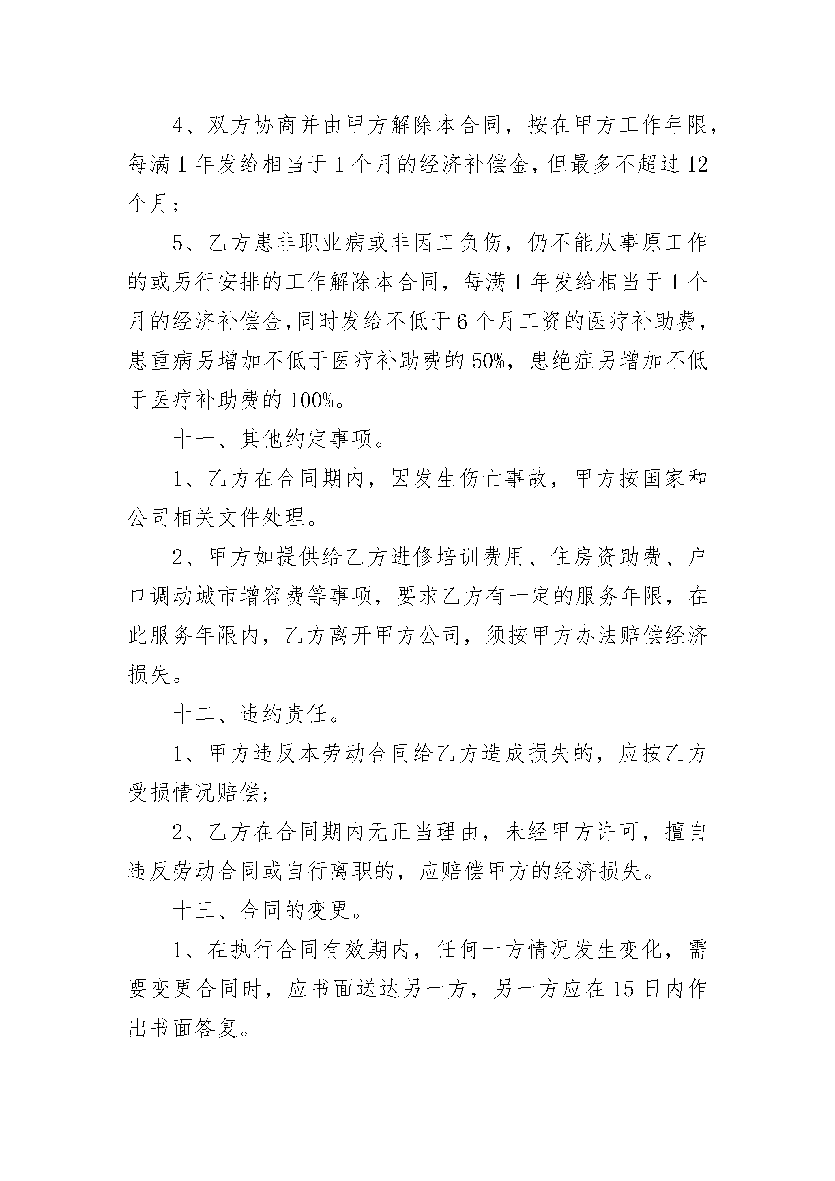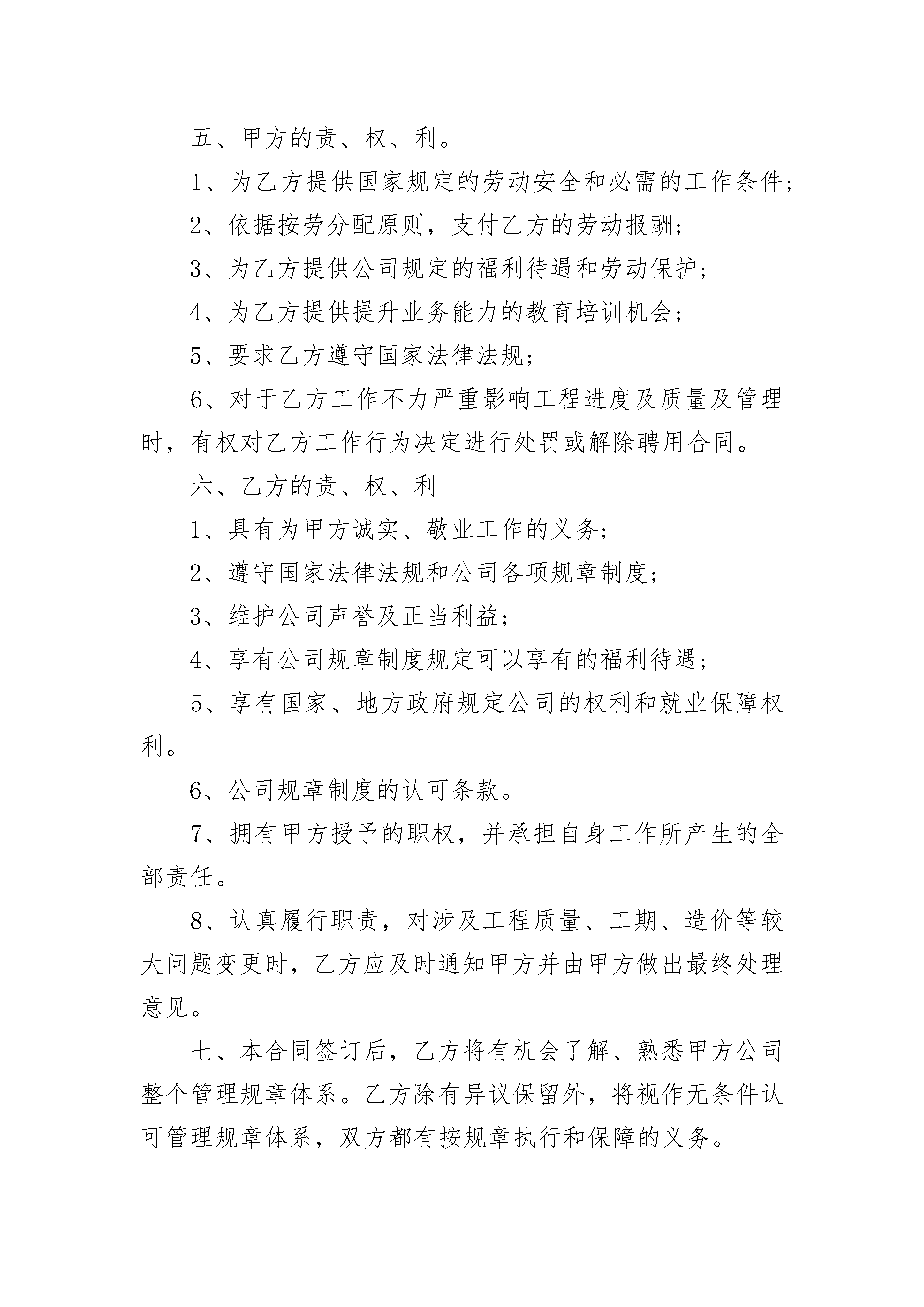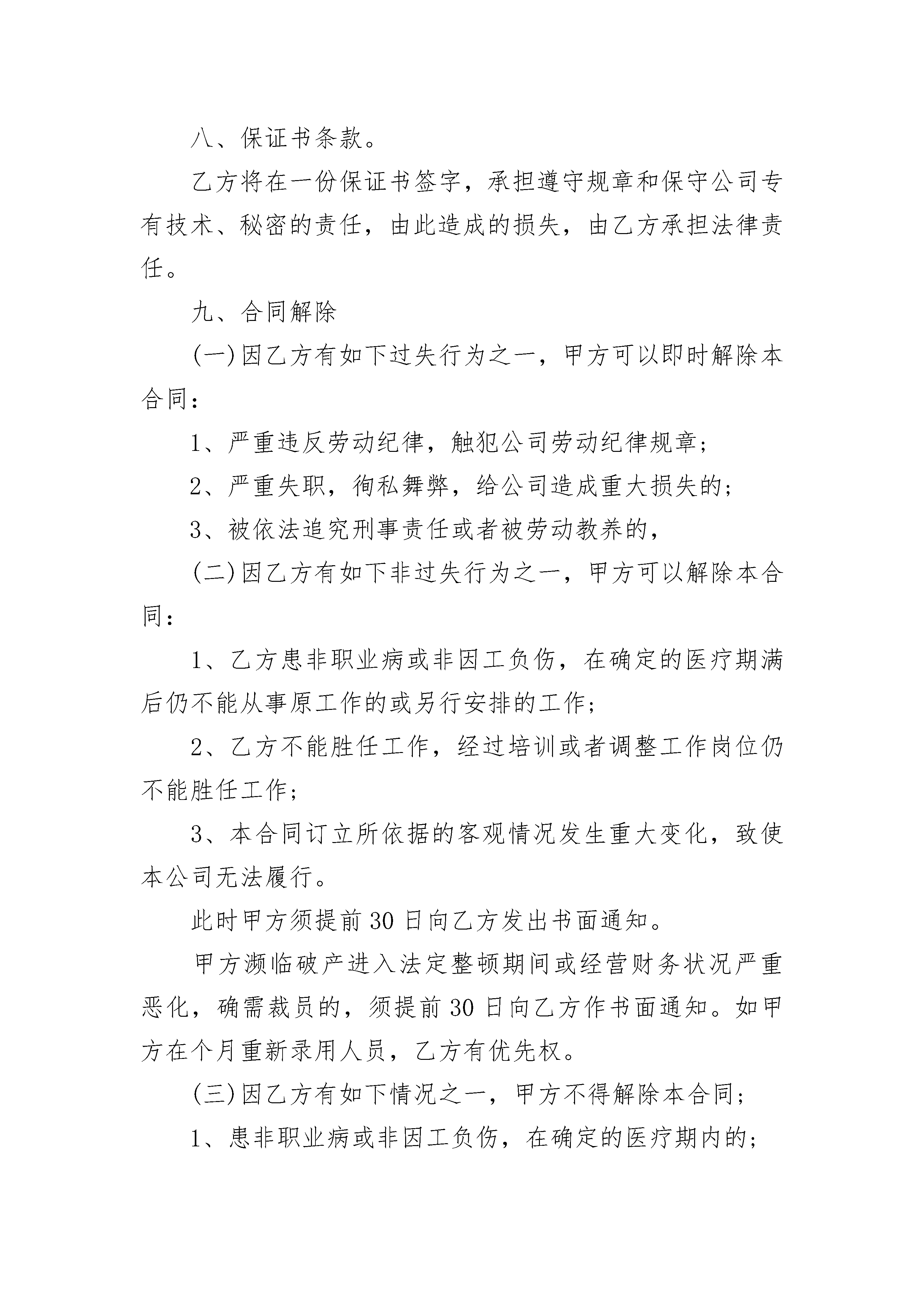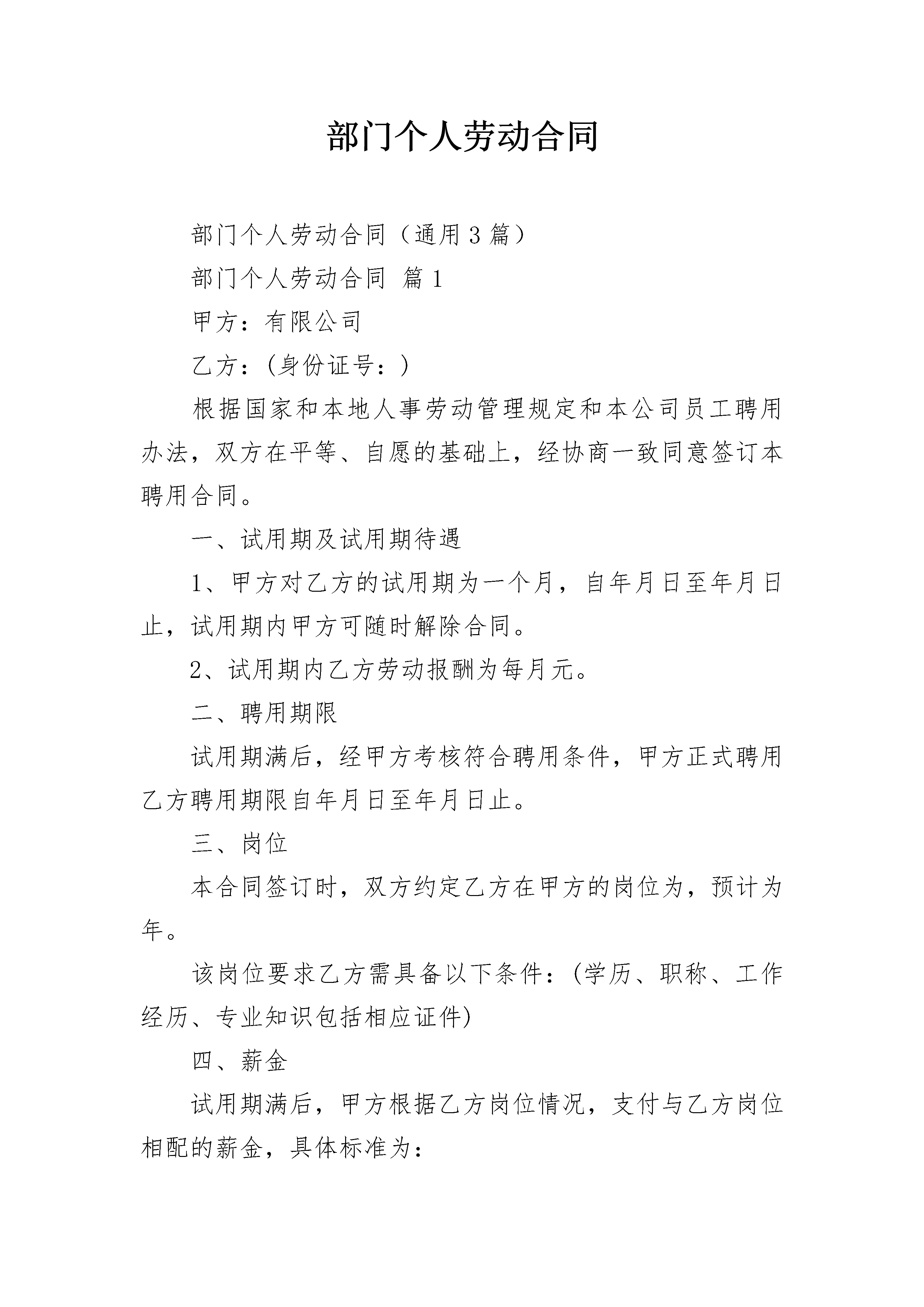 部门个人劳动合同部门个人劳动合同(通用3篇)部门个人劳动合同篇1甲方:有限公司乙方:(身份证号:)根据国家和本地人事劳动管理规定和本公司员工聘用办法,双方在平等、自愿的基础上,经协商一致同意签订本聘用合同。一、试用期及试用期待遇1、甲方对乙方的试用期为一个月,自年月日至年月日止,试用期内甲方可随时解除合同。2、试用期内乙方劳动报酬为每月元。二、聘用期限试用期满后,经甲方考核符合聘用条件,甲方正式聘用乙方聘用期限自年月日至年月日止。三、岗位本合同签订时,双方约定乙方在甲方的岗位为,预计为年。该岗位要求乙方需具备以下条件:(学历、职称、工作经历、专业知识包括相应证件)四、薪金试用期满后,甲方根据乙方岗位情况,支付与乙方岗位相配的薪金,具体标准为:五、甲方的责、权、利。1、为乙方提供国家规定的劳动安全和必需的工作条件;2、依据按劳分配原则,支付乙方的劳动报酬;3、为乙方提供公司规定的福利待遇和劳动保护;4、为乙方提供提升业务能力的教育培训机会;5、要求乙方遵守国家法律法规;6、对于乙方工作不力严重影响工程进度及质量及管理时,有权对乙方工作行为决定进行处罚或解除聘用合同。六、乙方的责、权、利1、具有为甲方诚实、敬业工作的义务;2、遵守国家法律法规和公司各项规章制度;3、维护公司声誉及正当利益;4、享有公司规章制度规定可以享有的福利待遇;5、享有国家、地方政府规定公司的权利和就业保障权利。6、公司规章制度的认可条款。7、拥有甲方授予的职权,并承担自身工作所产生的全部责任。8、认真履行职责,对涉及工程质量、工期、造价等较大问题变更时,乙方应及时通知甲方并由甲方做出最终处理意见。七、本合同签订后,乙方将有机会了解、熟悉甲方公司整个管理规章体系。乙方除有异议保留外,将视作无条件认可管理规章体系,双方都有按规章执行和保障的义务。八、保证书条款。乙方将在一份保证书签字,承担遵守规章和保守公司专有技术、秘密的责任,由此造成的损失,由乙方承担法律责任。九、合同解除(一)因乙方有如下过失行为之一,甲方可以即时解除本合同:1、严重违反劳动纪律,触犯公司劳动纪律规章;2、严重失职,徇私舞弊,给公司造成重大损失的;3、被依法追究刑事责任或者被劳动教养的,(二)因乙方有如下非过失行为之一,甲方可以解除本合同:1、乙方患非职业病或非因工负伤,在确定的医疗期满后仍不能从事原工作的或另行安排的工作;2、乙方不能胜任工作,经过培训或者调整工作岗位仍不能胜任工作;3、本合同订立所依据的客观情况发生重大变化,致使本公司无法履行。此时甲方须提前30日向乙方发出书面通知。甲方濒临破产进入法定整顿期间或经营财务状况严重恶化,确需裁员的,须提前30日向乙方作书面通知。如甲方在个月重新录用人员,乙方有优先权。(三)因乙方有如下情况之一,甲方不得解除本合同;1、患非职业病或非因工负伤,在确定的医疗期内的;2、患职业病或因工负伤,经劳动鉴定委员会确定部分或全部丧失劳动能力的;3、如为女职工时,在孕期、产期、哺乳期内的;4、国家法律、法规、规章规定的其他情况。(四)乙方在以下情况之一,可以提出解除或终止本合同:1、甲方不履行本合同的;2、甲方违反国家法律、法律,侵害乙方合法权益的;3、甲方劳动安全、工作条件不合国家规定,损害乙方安全、健康的;4、甲方未按规定支付报酬;5、乙方因参军、升学或经批准出国定居的;6、属正常工作调动的;7、乙方有正当理由,确定不能继续在甲方工作的。乙方解除或终止本合同,须提前30日向甲方作书面通知。十、解除本合同的经济补偿。1、乙方违反保密事项,给甲方造成经济损失的,应当依法承担补偿和赔偿责任。2、乙方不能胜任工作,由甲方解除本合同,按在甲方工作年限,每满1年发给相当于1个月的经济补偿,但最多不超过12个月;3、甲方经营财务状况严重恶化需裁员的,或合同订立所依据的客观情况发生重大变化,由甲方解除本合同,按在甲方工作年限,每满1年发给相当于1个月的经济补偿金;4、双方协商并由甲方解除本合同,按在甲方工作年限,每满1年发给相当于1个月的经济补偿金,但最多不超过12个月;5、乙方患非职业病或非因工负伤,仍不能从事原工作的或另行安排的工作解除本合同,每满1年发给相当于1个月的经济补偿金,同时发给不低于6个月工资的医疗补助费,患重病另增加不低于医疗补助费的50%,患绝症另增加不低于医疗补助费的100%。十一、其他约定事项。1、乙方在合同期内,因发生伤亡事故,甲方按国家和公司相关文件处理。2、甲方如提供给乙方进修培训费用、住房资助费、户口调动城市增容费等事项,要求乙方有一定的服务年限,在此服务年限内,乙方离开甲方公司,须按甲方办法赔偿经济损失。十二、违约责任。1、甲方违反本劳动合同给乙方造成损失的,应按乙方受损情况赔偿;2、乙方在合同期内无正当理由,未经甲方许可,擅自违