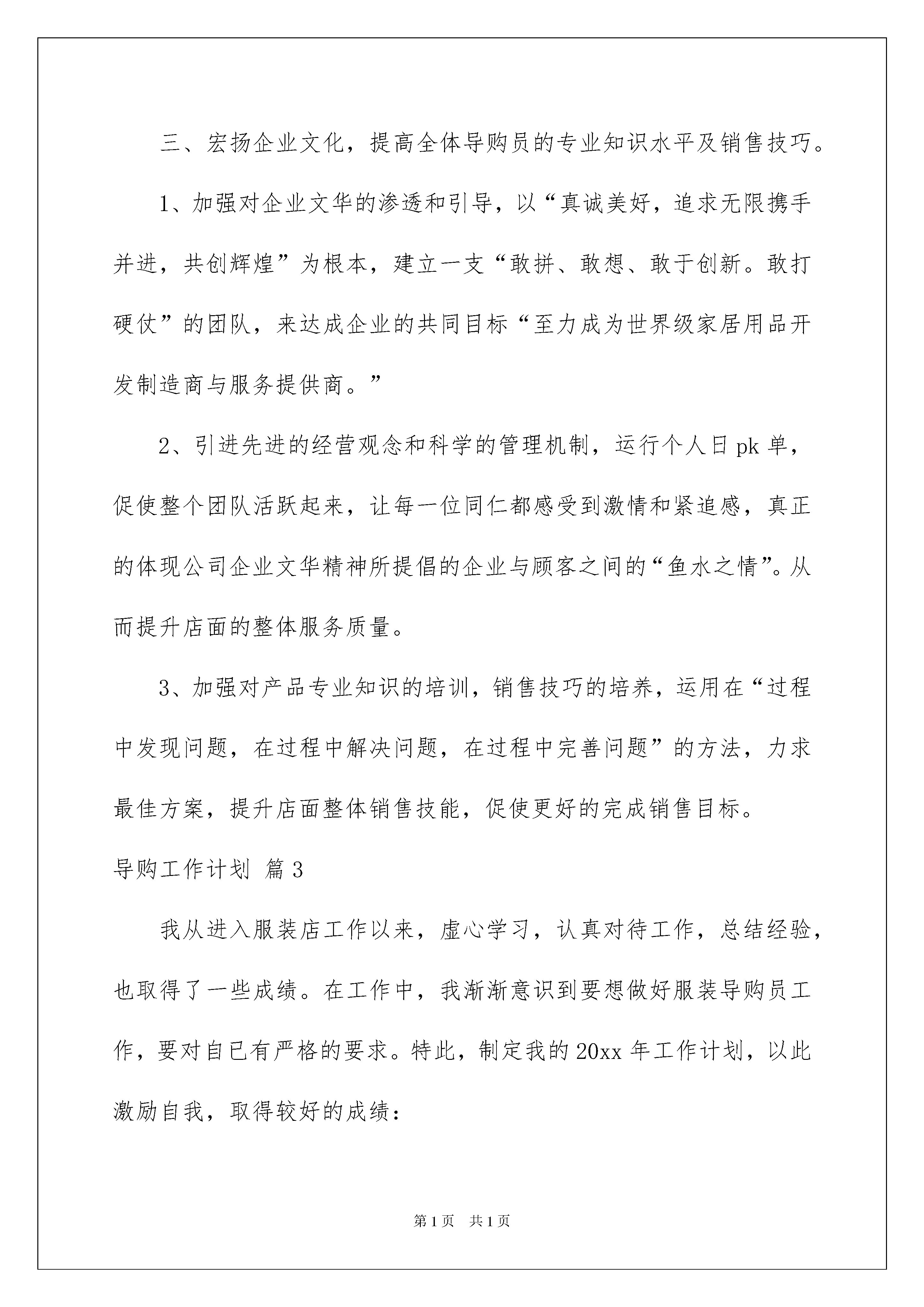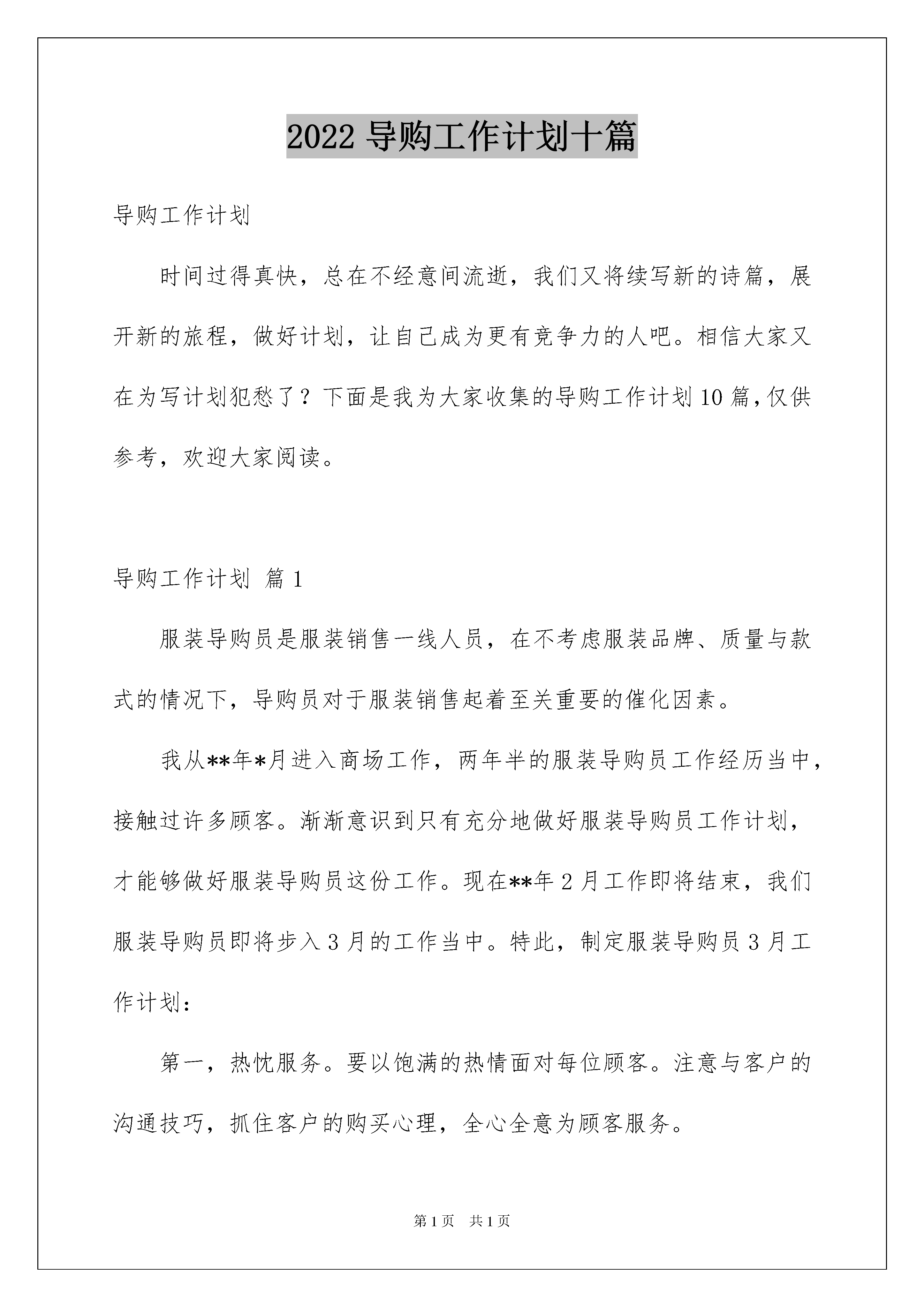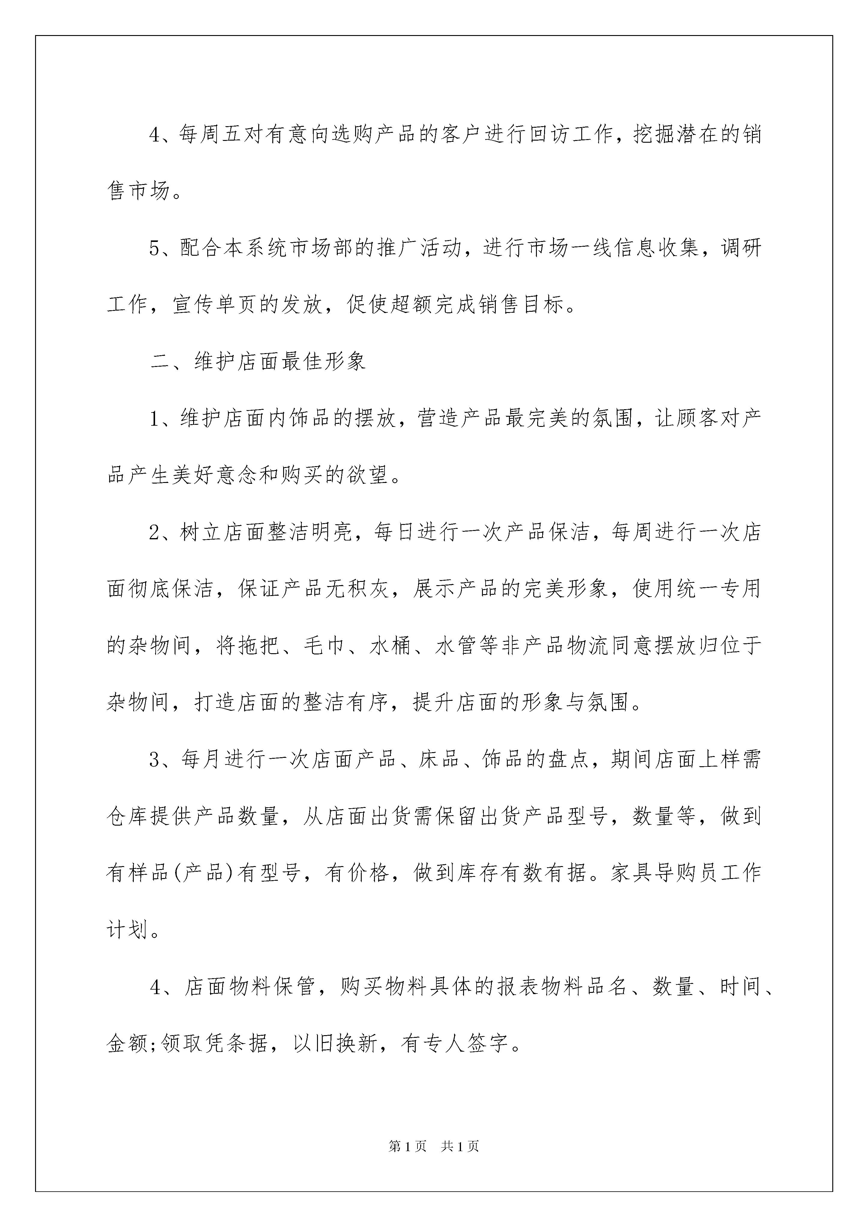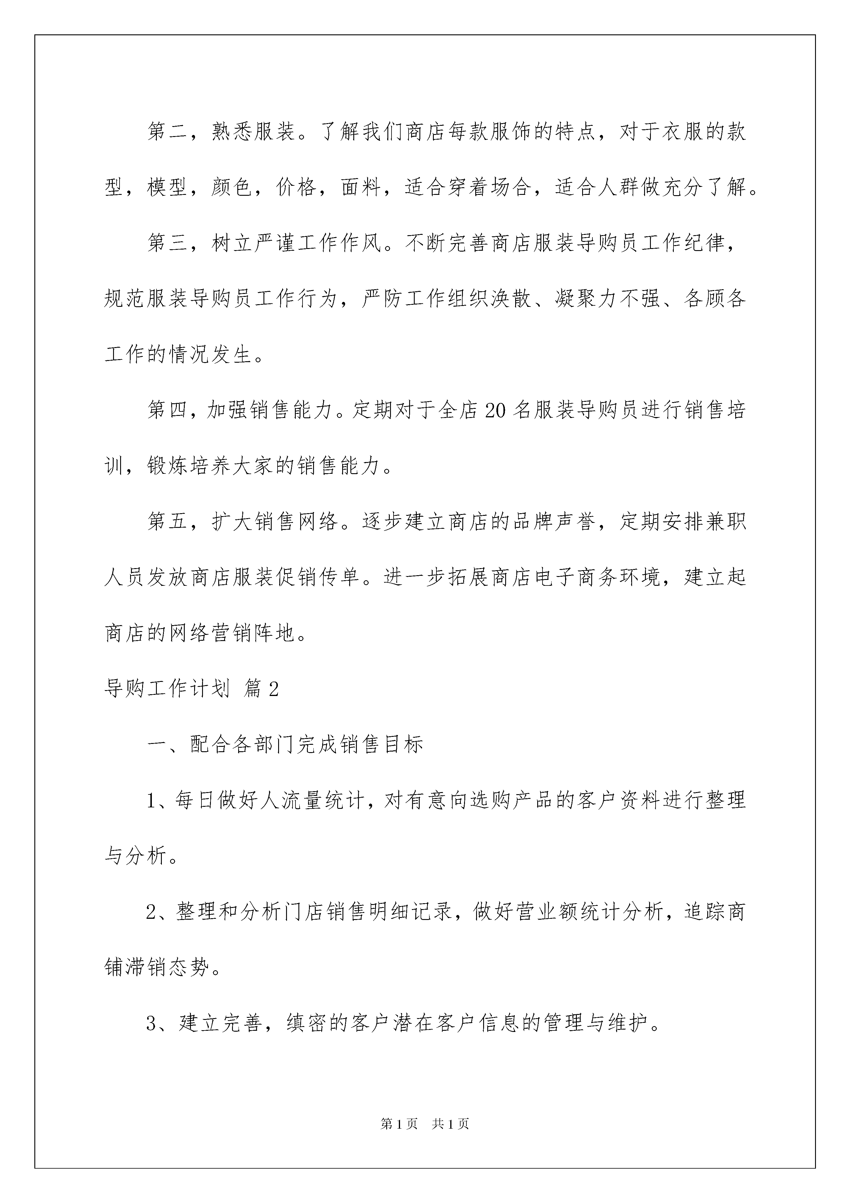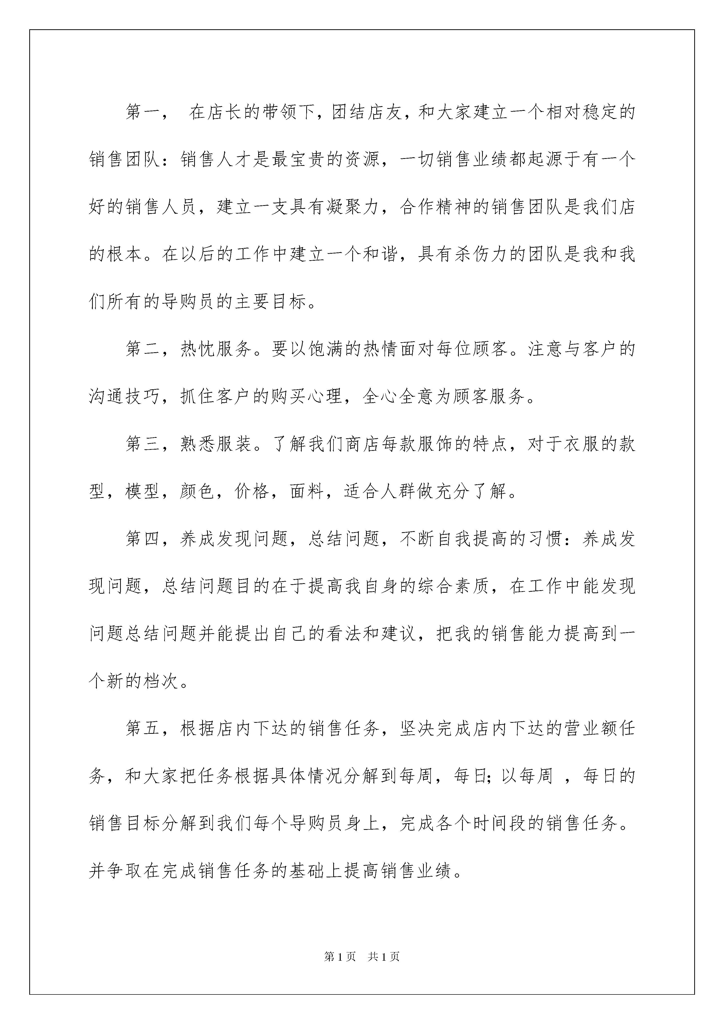 2022导购工作计划十篇导购工作计划时间过得真快,总在不经意间流逝,我们又将续写新的诗篇,展开新的旅程,做好计划,让自己成为更有竞争力的人吧。相信大家又在为写计划犯愁了?下面是我为大家收集的导购工作计划10篇,仅供参考,欢迎大家阅读。导购工作计划篇1服装导购员是服装销售一线人员,在不考虑服装品牌、质量与款式的情况下,导购员对于服装销售起着至关重要的催化因素。我从**年*月进入商场工作,两年半的服装导购员工作经历当中,接触过许多顾客。渐渐意识到只有充分地做好服装导购员工作计划,才能够做好服装导购员这份工作。现在**年2月工作即将结束,我们服装导购员即将步入3月的工作当中。特此,制定服装导购员3月工作计划:第一,热忱服务。要以饱满的热情面对每位顾客。注意与客户的沟通技巧,抓住客户的购买心理,全心全意为顾客服务。第二,熟悉服装。了解我们商店每款服饰的特点,对于衣服的款型,模型,颜色,价格,面料,适合穿着场合,适合人群做充分了解。第三,树立严谨工作作风。不断完善商店服装导购员工作纪律,规范服装导购员工作行为,严防工作组织涣散、凝聚力不强、各顾各工作的情况发生。第四,加强销售能力。定期对于全店20名服装导购员进行销售培训,锻炼培养大家的销售能力。第五,扩大销售网络。逐步建立商店的品牌声誉,定期安排兼职人员发放商店服装促销传单。进一步拓展商店电子商务环境,建立起商店的网络营销阵地。导购工作计划篇2一、配合各部门完成销售目标1、每日做好人流量统计,对有意向选购产品的客户资料进行整理与分析。2、整理和分析门店销售明细记录,做好营业额统计分析,追踪商铺滞销态势。3、建立完善,缜密的客户潜在客户信息的管理与维护。4、每周五对有意向选购产品的客户进行回访工作,挖掘潜在的销售市场。5、配合本系统市场部的推广活动,进行市场一线信息收集,调研工作,宣传单页的发放,促使超额完成销售目标。二、维护店面最佳形象1、维护店面内饰品的摆放,营造产品最完美的氛围,让顾客对产品产生美好意念和购买的欲望。2、树立店面整洁明亮,每日进行一次产品保洁,每周进行一次店面彻底保洁,保证产品无积灰,展示产品的完美形象,使用统一专用的杂物间,将拖把、毛巾、水桶、水管等非产品物流同意摆放归位于杂物间,打造店面的整洁有序,提升店面的形象与氛围。3、每月进行一次店面产品、床品、饰品的盘点,期间店面上样需仓库提供产品数量,从店面出货需保留出货产品型号,数量等,做到有样品(产品)有型号,有价格,做到库存有数有据。家具导购员工作计划。4、店面物料保管,购买物料具体的报表物料品名、数量、时间、金额;领取凭条据,以旧换新,有专人签字。三、宏扬企业文化,提高全体导购员的专业知识水平及销售技巧。1、加强对企业文华的渗透和引导,以“真诚美好,追求无限携手并进,共创辉煌”为根本,建立一支“敢拼、敢想、敢于创新。敢打硬仗”的团队,来达成企业的共同目标“至力成为世界级家居用品开发制造商与服务提供商。”2、引进先进的经营观念和科学的管理机制,运行个人日pk单,促使整个团队活跃起来,让每一位同仁都感受到激情和紧追感,真正的体现公司企业文华精神所提倡的企业与顾客之间的“鱼水之情”。从而提升店面的整体服务质量。3、加强对产品专业知识的培训,销售技巧的培养,运用在“过程中发现问题,在过程中解决问题,在过程中完善问题”的方法,力求最佳方案,提升店面整体销售技能,促使更好的完成销售目标。导购工作计划篇3我从进入服装店工作以来,虚心学习,认真对待工作,总结经验,也取得了一些成绩。在工作中,我渐渐意识到要想做好服装导购员工作,要对自已有严格的要求。特此,制定我的20xx年工作计划,以此激励自我,取得较好的成绩:第一,在店长的带领下,团结店友,和大家建立一个相对稳定的销售团队:销售人才是最宝贵的资源,一切销售业绩都起源于有一个好的销售人员,建立一支具有凝聚力,合作精神的销售团队是我们店的根本。在以后的工作中建立一个和谐,具有杀伤力的团队是我和我们所有的导购员的主要目标。第二,热忱服务。要以饱满的热情面对每位顾客。注意与客户的沟通技巧,抓住客户的购买心理,全心全意为顾客服务。第三,熟悉服装。了解我们商店每款服饰的特点,对于衣服的款型,模型,颜色,价格,面料,适合人群做充分了解。第四,养成发现问题,总结问题,不断自我提高的习惯:养成发现问题,总结问题目的在于提高我自身的综合素质,在工作中能发现问题总结问题并能提出自己的看法和建议,把我的销售能力提高到一个新的档次。第五,根据店内下达的销售任务,坚决完成店内下达的营业额任务,和大家把任务根据具体情况分解到每周,每日;以每周,每日的