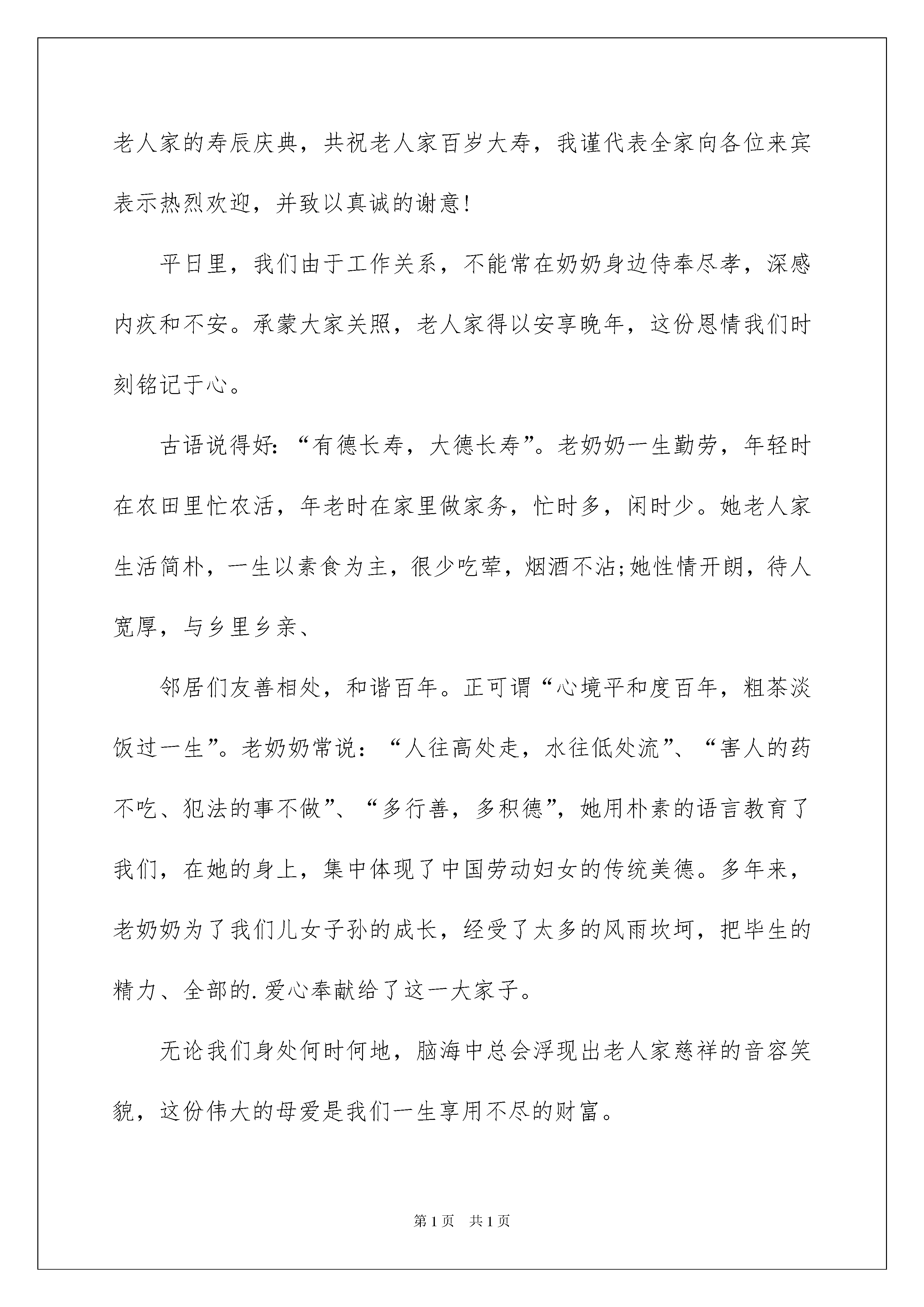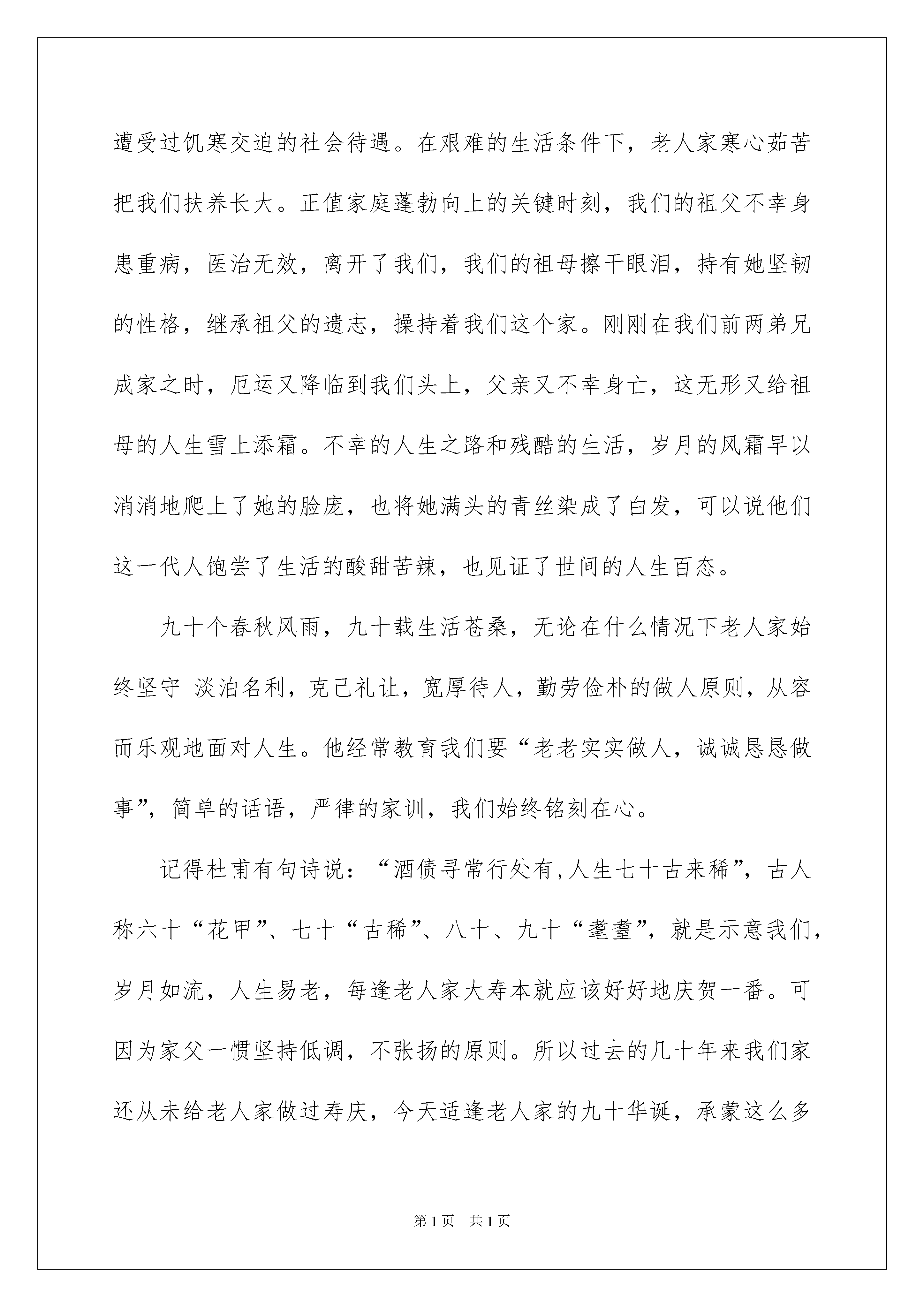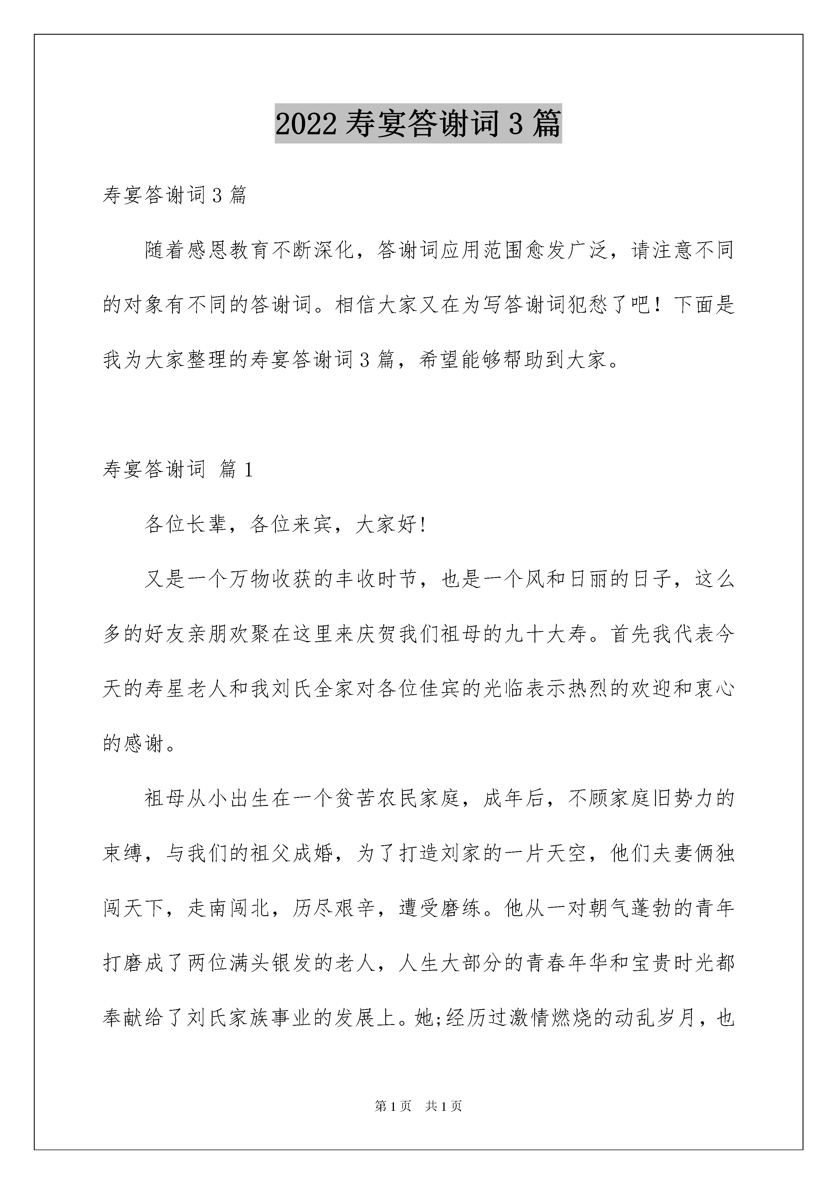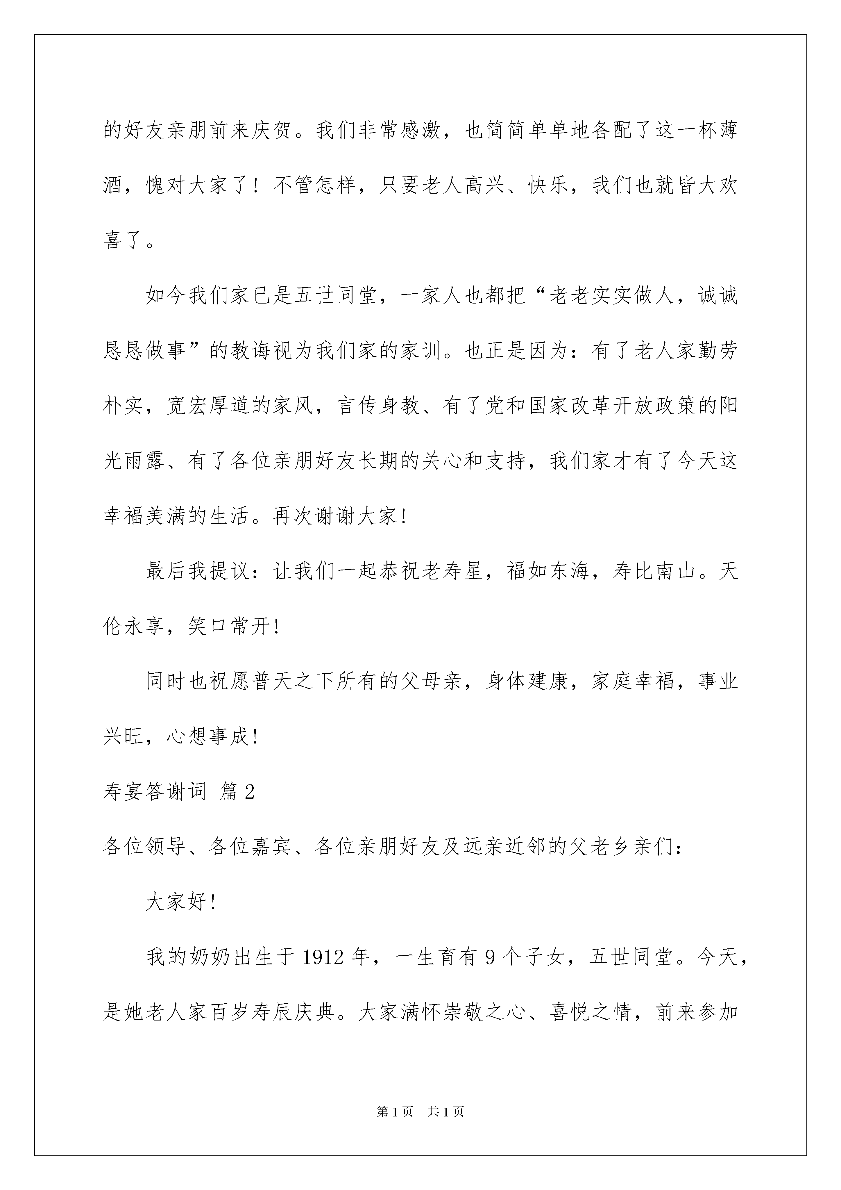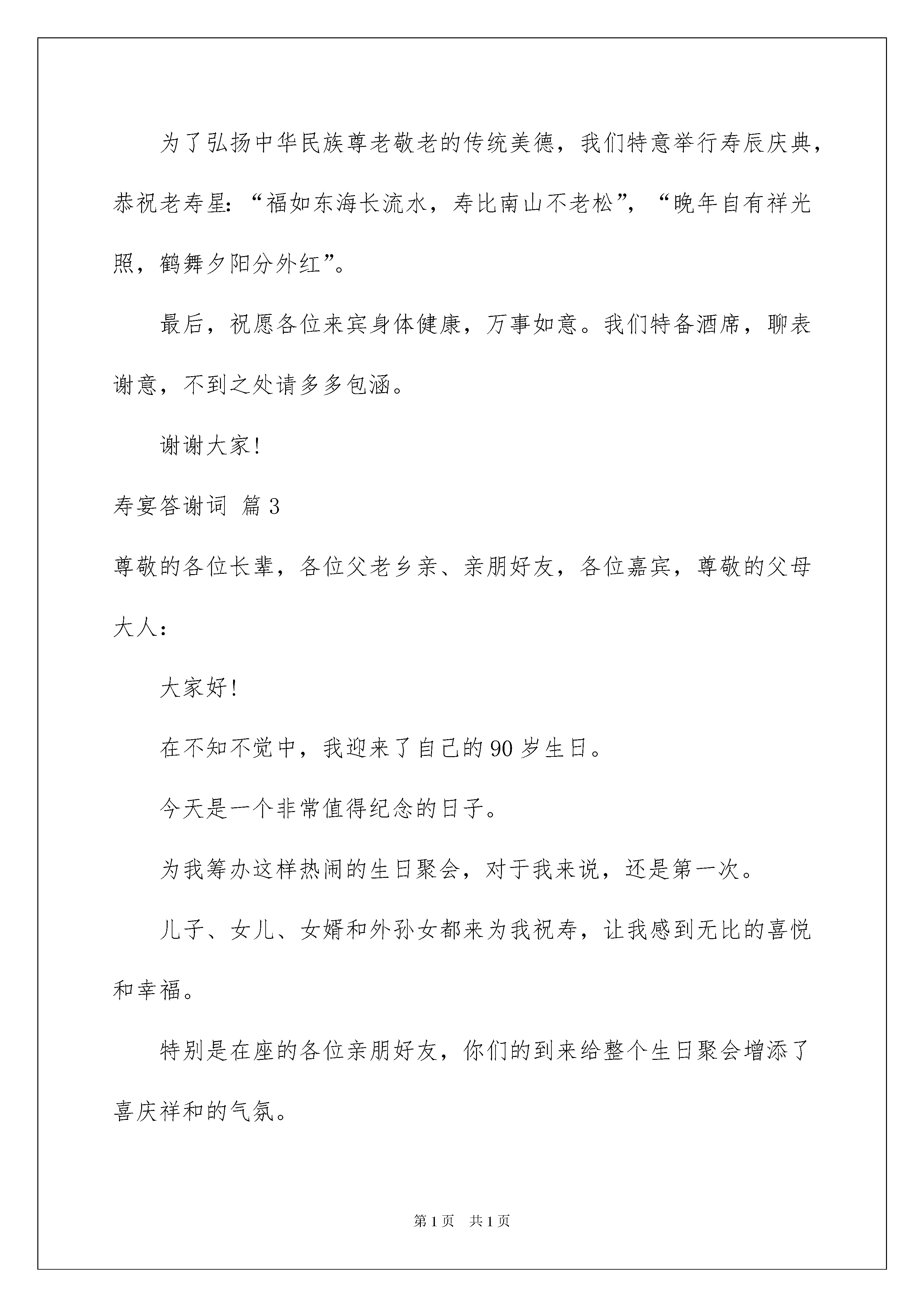 2022寿宴答谢词3篇寿宴答谢词3篇随着感恩教育不断深化,答谢词应用范围愈发广泛,请注意不同的对象有不同的答谢词。相信大家又在为写答谢词犯愁了吧!下面是我为大家整理的寿宴答谢词3篇,希望能够帮助到大家。寿宴答谢词篇1各位长辈,各位来宾,大家好!又是一个万物收获的丰收时节,也是一个风和日丽的日子,这么多的好友亲朋欢聚在这里来庆贺我们祖母的九十大寿。首先我代表今天的寿星老人和我刘氏全家对各位佳宾的光临表示热烈的欢迎和衷心的感谢。祖母从小出生在一个贫苦农民家庭,成年后,不顾家庭旧势力的束缚,与我们的祖父成婚,为了打造刘家的一片天空,他们夫妻俩独闯天下,走南闯北,历尽艰辛,遭受磨练。他从一对朝气蓬勃的青年打磨成了两位满头银发的老人,人生大部分的青春年华和宝贵时光都奉献给了刘氏家族事业的发展上。她;经历过激情燃烧的动乱岁月,也遭受过饥寒交迫的社会待遇。在艰难的生活条件下,老人家寒心茹苦把我们扶养长大。正值家庭蓬勃向上的关键时刻,我们的祖父不幸身患重病,医治无效,离开了我们,我们的祖母擦干眼泪,持有她坚韧的性格,继承祖父的遗志,操持着我们这个家。刚刚在我们前两弟兄成家之时,厄运又降临到我们头上,父亲又不幸身亡,这无形又给祖母的人生雪上添霜。不幸的人生之路和残酷的生活,岁月的风霜早以消消地爬上了她的脸庞,也将她满头的青丝染成了白发,可以说他们这一代人饱尝了生活的酸甜苦辣,也见证了世间的人生百态。九十个春秋风雨,九十载生活苍桑,无论在什么情况下老人家始终坚守淡泊名利,克己礼让,宽厚待人,勤劳俭朴的做人原则,从容而乐观地面对人生。他经常教育我们要“老老实实做人,诚诚恳恳做事”,简单的话语,严律的家训,我们始终铭刻在心。记得杜甫有句诗说:“酒债寻常行处有,人生七十古来稀”,古人称六十“花甲”、七十“古稀”、八十、九十“耄耋”,就是示意我们,岁月如流,人生易老,每逢老人家大寿本就应该好好地庆贺一番。可因为家父一惯坚持低调,不张扬的原则。所以过去的几十年来我们家还从未给老人家做过寿庆,今天适逢老人家的九十华诞,承蒙这么多的好友亲朋前来庆贺。我们非常感激,也简简单单地备配了这一杯薄酒,愧对大家了!不管怎样,只要老人高兴、快乐,我们也就皆大欢喜了。如今我们家已是五世同堂,一家人也都把“老老实实做人,诚诚恳恳做事”的教诲视为我们家的家训。也正是因为:有了老人家勤劳朴实,宽宏厚道的家风,言传身教、有了党和国家改革开放政策的阳光雨露、有了各位亲朋好友长期的关心和支持,我们家才有了今天这幸福美满的生活。再次谢谢大家!最后我提议:让我们一起恭祝老寿星,福如东海,寿比南山。天伦永享,笑口常开!同时也祝愿普天之下所有的父母亲,身体建康,家庭幸福,事业兴旺,心想事成!寿宴答谢词篇2各位领导、各位嘉宾、各位亲朋好友及远亲近邻的父老乡亲们:大家好!我的奶奶出生于1912年,一生育有9个子女,五世同堂。今天,是她老人家百岁寿辰庆典。大家满怀崇敬之心、喜悦之情,前来参加老人家的寿辰庆典,共祝老人家百岁大寿,我谨代表全家向各位来宾表示热烈欢迎,并致以真诚的谢意!平日里,我们由于工作关系,不能常在奶奶身边侍奉尽孝,深感内疚和不安。承蒙大家关照,老人家得以安享晚年,这份恩情我们时刻铭记于心。古语说得好:“有德长寿,大德长寿”。老奶奶一生勤劳,年轻时在农田里忙农活,年老时在家里做家务,忙时多,闲时少。她老人家生活简朴,一生以素食为主,很少吃荤,烟酒不沾;她性情开朗,待人宽厚,与乡里乡亲、邻居们友善相处,和谐百年。正可谓“心境平和度百年,粗茶淡饭过一生”。老奶奶常说:“人往高处走,水往低处流”、“害人的药不吃、犯法的事不做”、“多行善,多积德”,她用朴素的语言教育了我们,在她的身上,集中体现了中国劳动妇女的传统美德。多年来,老奶奶为了我们儿女子孙的成长,经受了太多的风雨坎坷,把毕生的精力、全部的.爱心奉献给了这一大家子。无论我们身处何时何地,脑海中总会浮现出老人家慈祥的音容笑貌,这份伟大的母爱是我们一生享用不尽的财富。为了弘扬中华民族尊老敬老的传统美德,我们特意举行寿辰庆典,恭祝老寿星:“福如东海长流水,寿比南山不老松”,“晚年自有祥光照,鹤舞夕阳分外红”。最后,祝愿各位来宾身体健康,万事如意。我们特备酒席,聊表谢意,不到之处请多多包涵。谢谢大家!寿宴答谢词篇3尊敬的各位长辈,各位父老乡亲、亲朋好友,各位嘉宾,尊敬的父母大人:大家好!在不知不觉中,我迎来了自己的90岁生日。今天是一个非常值得纪念的日子。为我筹办这样热闹的生日聚会,对于我来说,还是第一次。儿子、女儿、女婿和外孙女都来为我祝寿,让我感到无比的喜悦和幸福。特别是在座的各位
