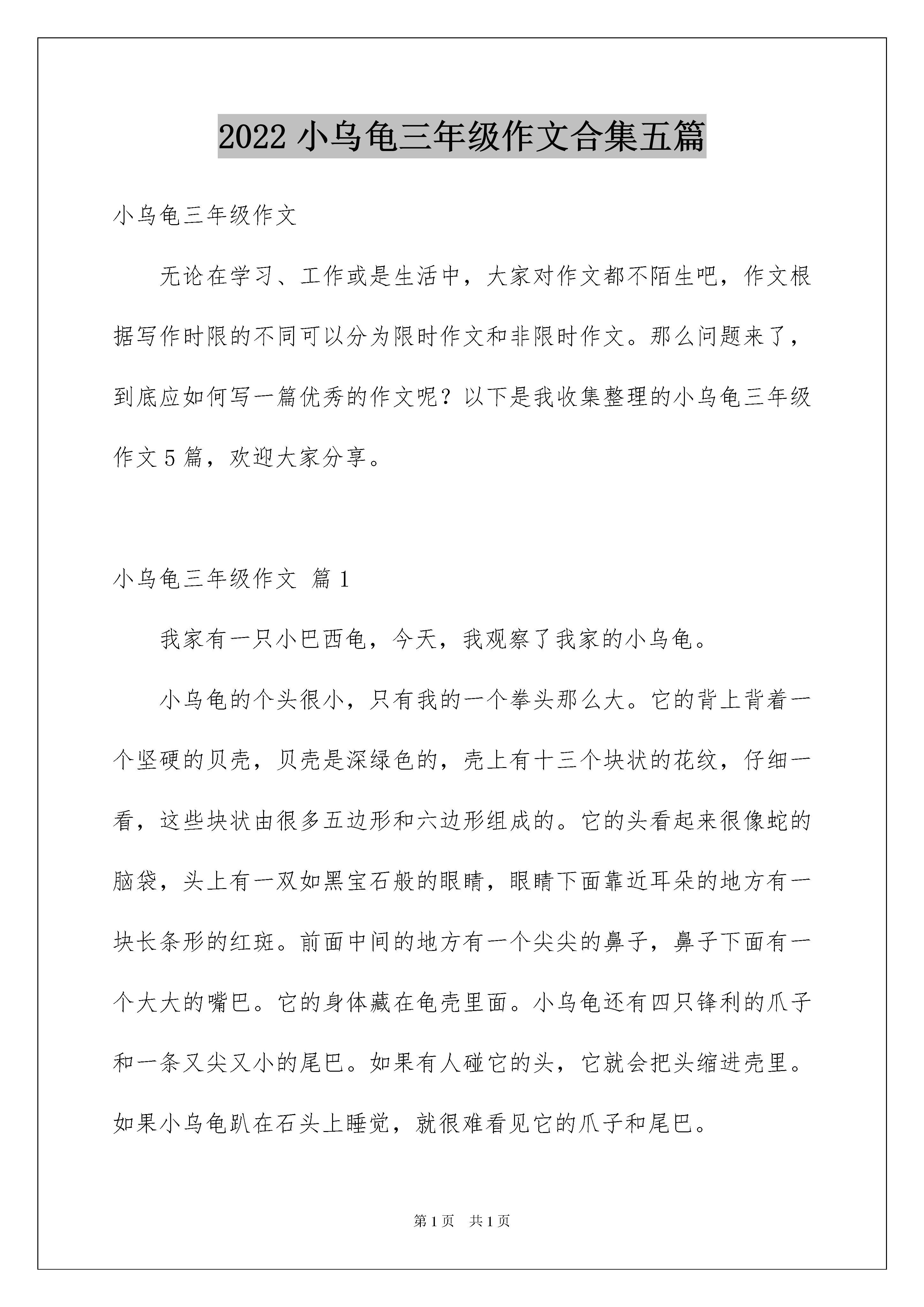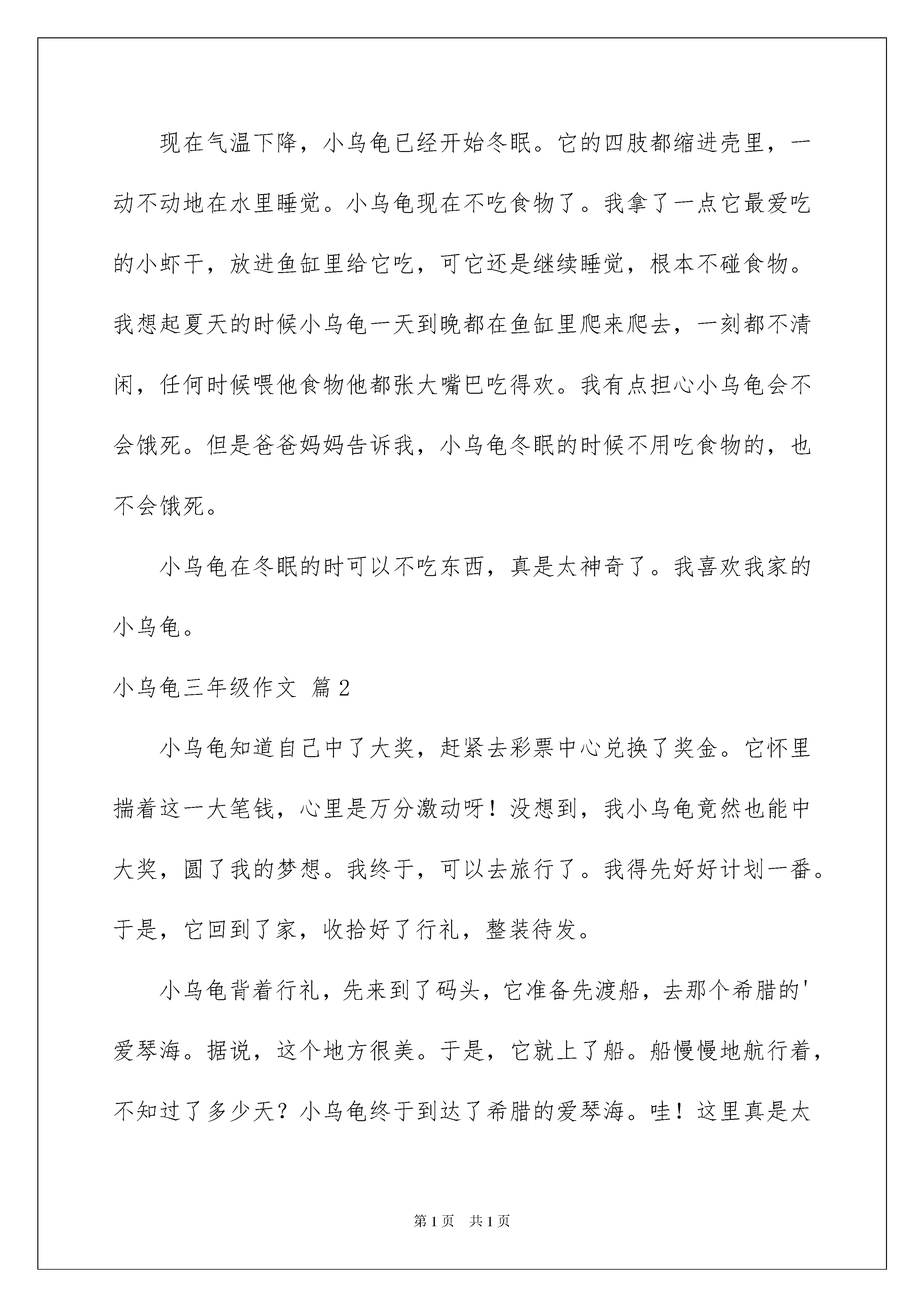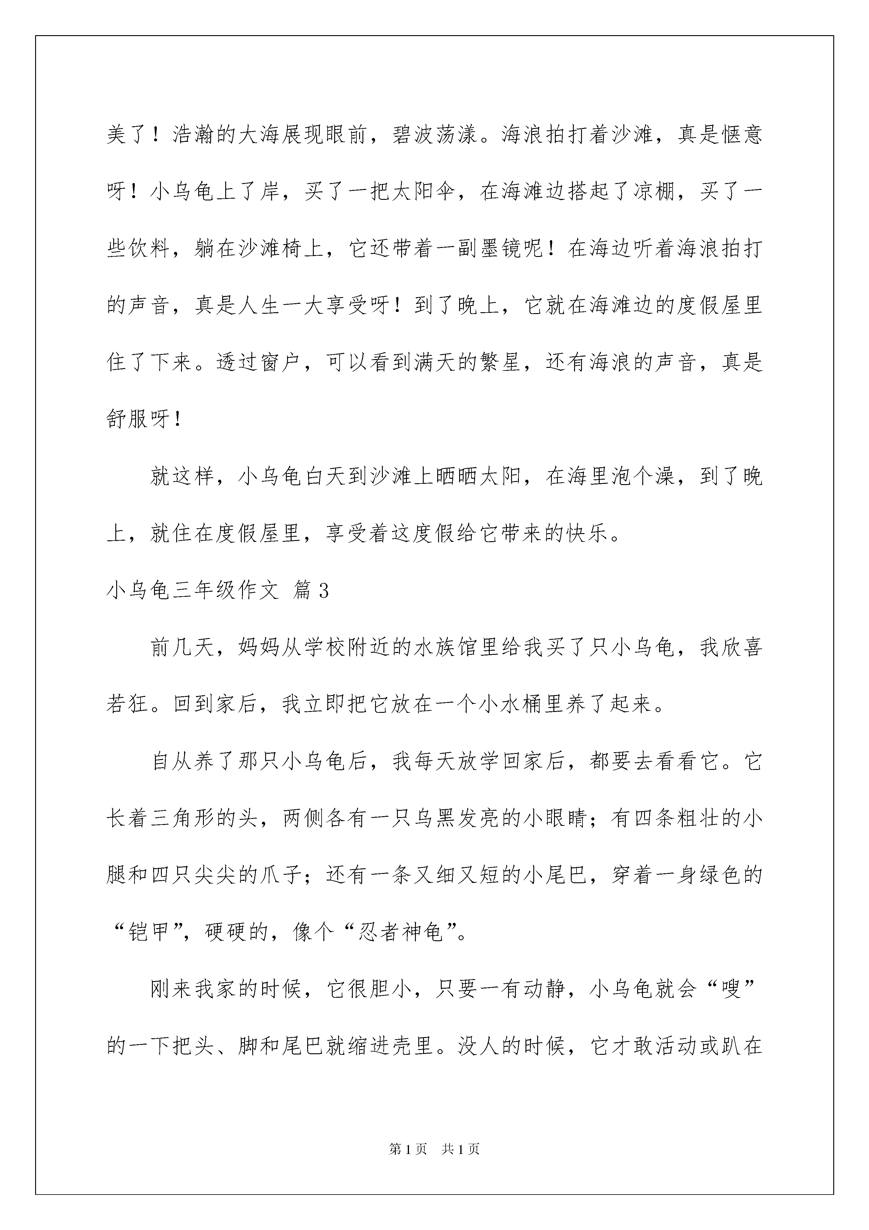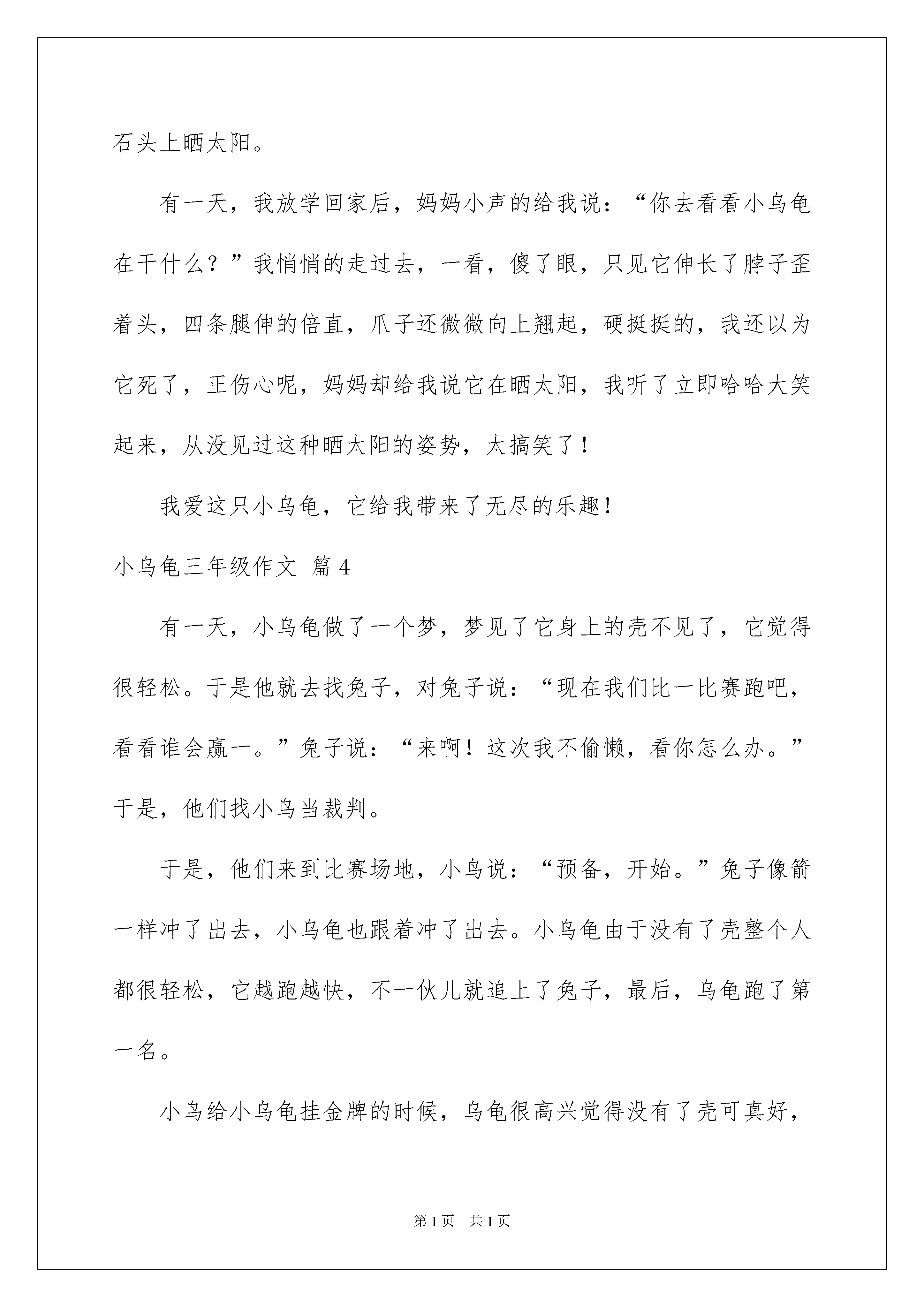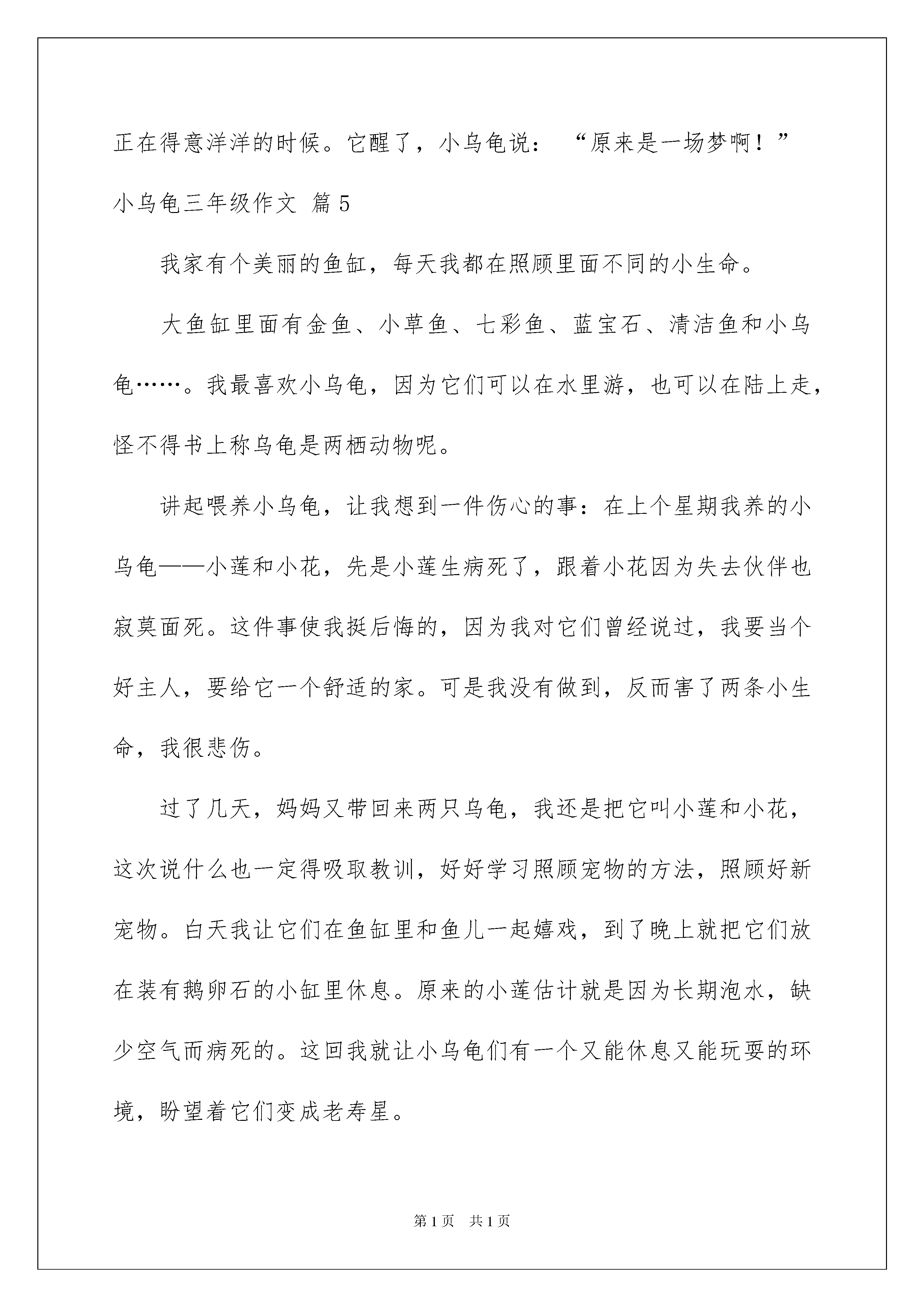 2022小乌龟三年级作文合集五篇小乌龟三年级作文无论在学习、工作或是生活中,大家对作文都不陌生吧,作文根据写作时限的不同可以分为限时作文和非限时作文。那么问题来了,到底应如何写一篇优秀的作文呢?以下是我收集整理的小乌龟三年级作文5篇,欢迎大家分享。小乌龟三年级作文篇1我家有一只小巴西龟,今天,我观察了我家的小乌龟。小乌龟的个头很小,只有我的一个拳头那么大。它的背上背着一个坚硬的贝壳,贝壳是深绿色的,壳上有十三个块状的花纹,仔细一看,这些块状由很多五边形和六边形组成的。它的头看起来很像蛇的脑袋,头上有一双如黑宝石般的眼睛,眼睛下面靠近耳朵的地方有一块长条形的红斑。前面中间的地方有一个尖尖的鼻子,鼻子下面有一个大大的嘴巴。它的身体藏在龟壳里面。小乌龟还有四只锋利的爪子和一条又尖又小的尾巴。如果有人碰它的头,它就会把头缩进壳里。如果小乌龟趴在石头上睡觉,就很难看见它的爪子和尾巴。现在气温下降,小乌龟已经开始冬眠。它的四肢都缩进壳里,一动不动地在水里睡觉。小乌龟现在不吃食物了。我拿了一点它最爱吃的小虾干,放进鱼缸里给它吃,可它还是继续睡觉,根本不碰食物。我想起夏天的时候小乌龟一天到晚都在鱼缸里爬来爬去,一刻都不清闲,任何时候喂他食物他都张大嘴巴吃得欢。我有点担心小乌龟会不会饿死。但是爸爸妈妈告诉我,小乌龟冬眠的时候不用吃食物的,也不会饿死。小乌龟在冬眠的时可以不吃东西,真是太神奇了。我喜欢我家的小乌龟。小乌龟三年级作文篇2小乌龟知道自己中了大奖,赶紧去彩票中心兑换了奖金。它怀里揣着这一大笔钱,心里是万分激动呀!没想到,我小乌龟竟然也能中大奖,圆了我的梦想。我终于,可以去旅行了。我得先好好计划一番。于是,它回到了家,收拾好了行礼,整装待发。小乌龟背着行礼,先来到了码头,它准备先渡船,去那个希腊的'爱琴海。据说,这个地方很美。于是,它就上了船。船慢慢地航行着,不知过了多少天?小乌龟终于到达了希腊的爱琴海。哇!这里真是太美了!浩瀚的大海展现眼前,碧波荡漾。海浪拍打着沙滩,真是惬意呀!小乌龟上了岸,买了一把太阳伞,在海滩边搭起了凉棚,买了一些饮料,躺在沙滩椅上,它还带着一副墨镜呢!在海边听着海浪拍打的声音,真是人生一大享受呀!到了晚上,它就在海滩边的度假屋里住了下来。透过窗户,可以看到满天的繁星,还有海浪的声音,真是舒服呀!就这样,小乌龟白天到沙滩上晒晒太阳,在海里泡个澡,到了晚上,就住在度假屋里,享受着这度假给它带来的快乐。小乌龟三年级作文篇3前几天,妈妈从学校附近的水族馆里给我买了只小乌龟,我欣喜若狂。回到家后,我立即把它放在一个小水桶里养了起来。自从养了那只小乌龟后,我每天放学回家后,都要去看看它。它长着三角形的头,两侧各有一只乌黑发亮的小眼睛;有四条粗壮的小腿和四只尖尖的爪子;还有一条又细又短的小尾巴,穿着一身绿色的“铠甲”,硬硬的,像个“忍者神龟”。刚来我家的时候,它很胆小,只要一有动静,小乌龟就会“嗖”的一下把头、脚和尾巴就缩进壳里。没人的时候,它才敢活动或趴在石头上晒太阳。有一天,我放学回家后,妈妈小声的给我说:“你去看看小乌龟在干什么?”我悄悄的走过去,一看,傻了眼,只见它伸长了脖子歪着头,四条腿伸的倍直,爪子还微微向上翘起,硬挺挺的,我还以为它死了,正伤心呢,妈妈却给我说它在晒太阳,我听了立即哈哈大笑起来,从没见过这种晒太阳的姿势,太搞笑了!我爱这只小乌龟,它给我带来了无尽的乐趣!小乌龟三年级作文篇4有一天,小乌龟做了一个梦,梦见了它身上的壳不见了,它觉得很轻松。于是他就去找兔子,对兔子说:“现在我们比一比赛跑吧,看看谁会赢一。”兔子说:“来啊!这次我不偷懒,看你怎么办。”于是,他们找小鸟当裁判。于是,他们来到比赛场地,小鸟说:“预备,开始。”兔子像箭一样冲了出去,小乌龟也跟着冲了出去。小乌龟由于没有了壳整个人都很轻松,它越跑越快,不一伙儿就追上了兔子,最后,乌龟跑了第一名。小鸟给小乌龟挂金牌的时候,乌龟很高兴觉得没有了壳可真好,正在得意洋洋的时候。它醒了,小乌龟说:“原来是一场梦啊!”小乌龟三年级作文篇5我家有个美丽的鱼缸,每天我都在照顾里面不同的小生命。大鱼缸里面有金鱼、小草鱼、七彩鱼、蓝宝石、清洁鱼和小乌龟……。我最喜欢小乌龟,因为它们可以在水里游,也可以在陆上走,怪不得书上称乌龟是两栖动物呢。讲起喂养小乌龟,让我想到一件伤心的事:在上个星期我养的小乌龟——小莲和小花,先是小莲生病死了,跟着小花因为失去伙伴也寂莫面死。这件事使我挺后悔的,因为我对它们曾经说过,我要当个好主人,要给它一个舒适的家。可是我没有做到,反而害了两条小生命,我很悲伤。过了几天,妈妈又带回来两