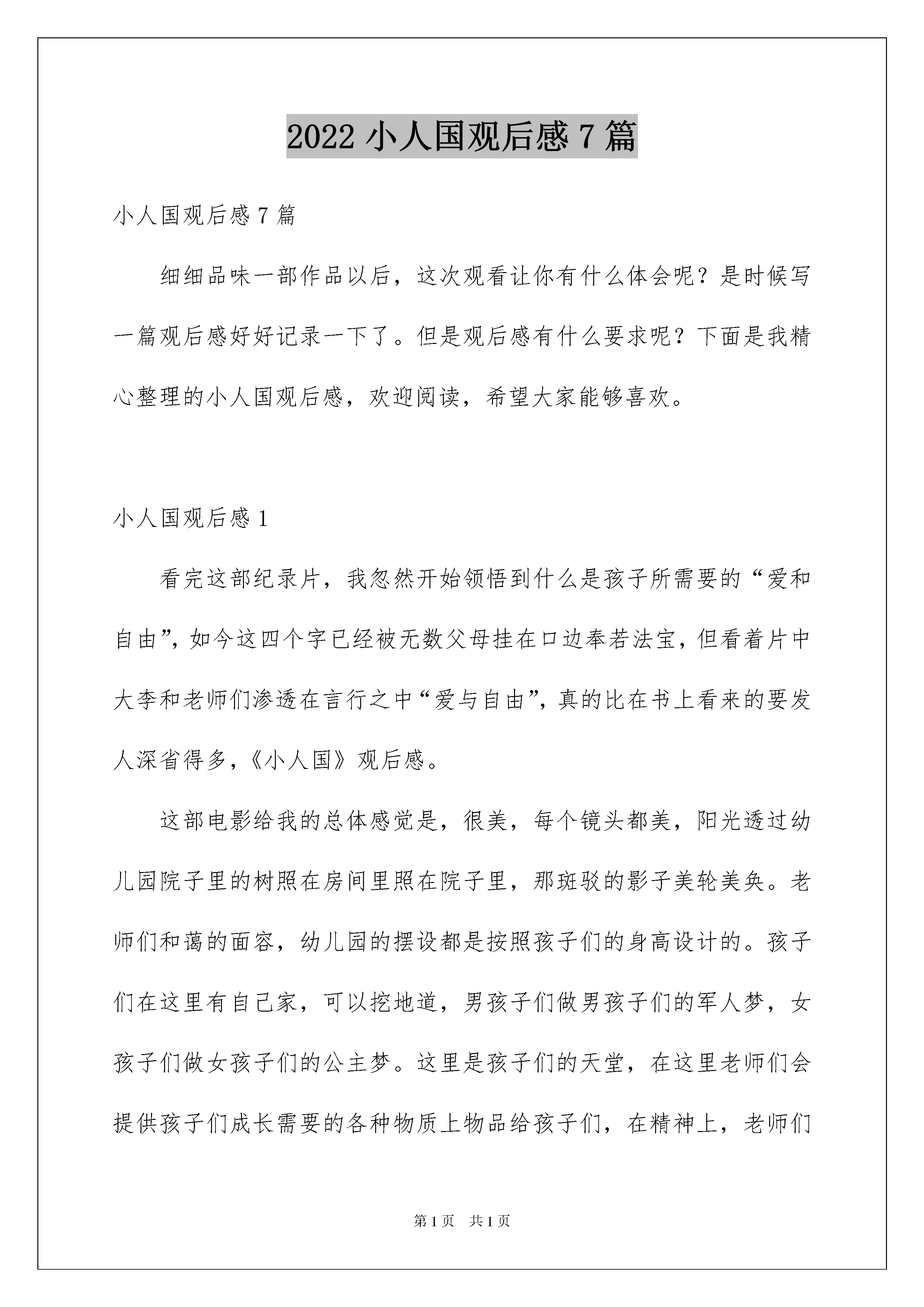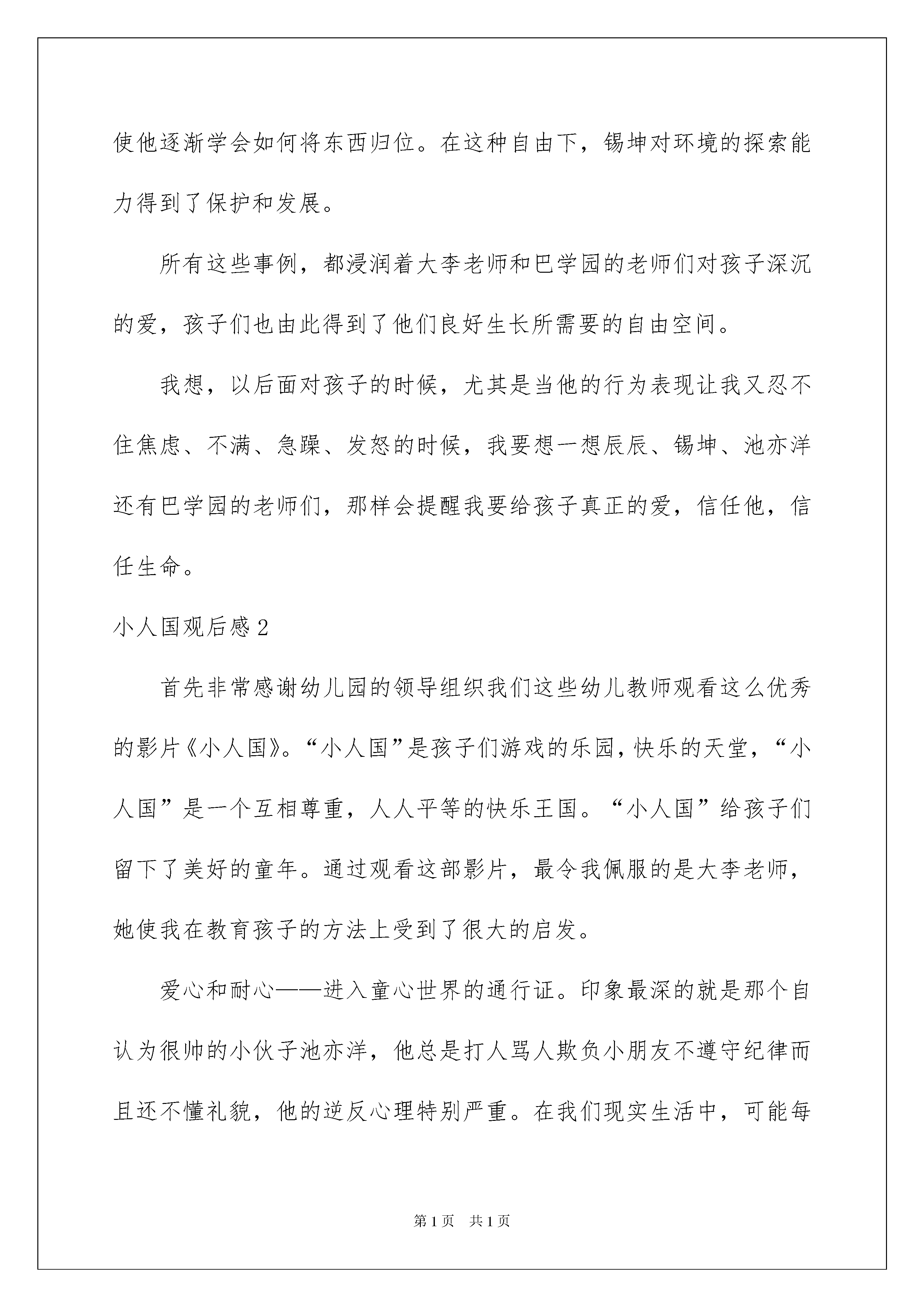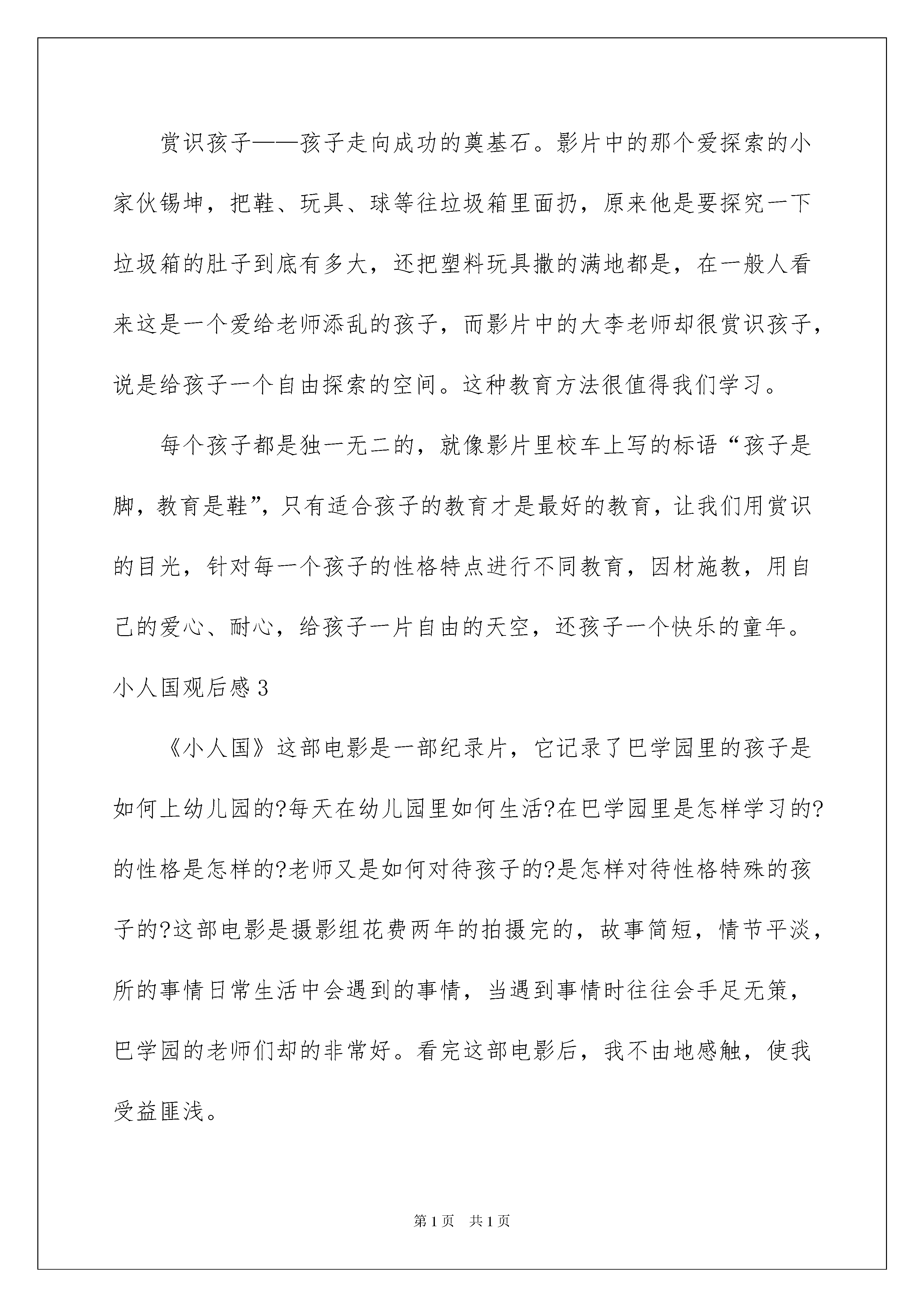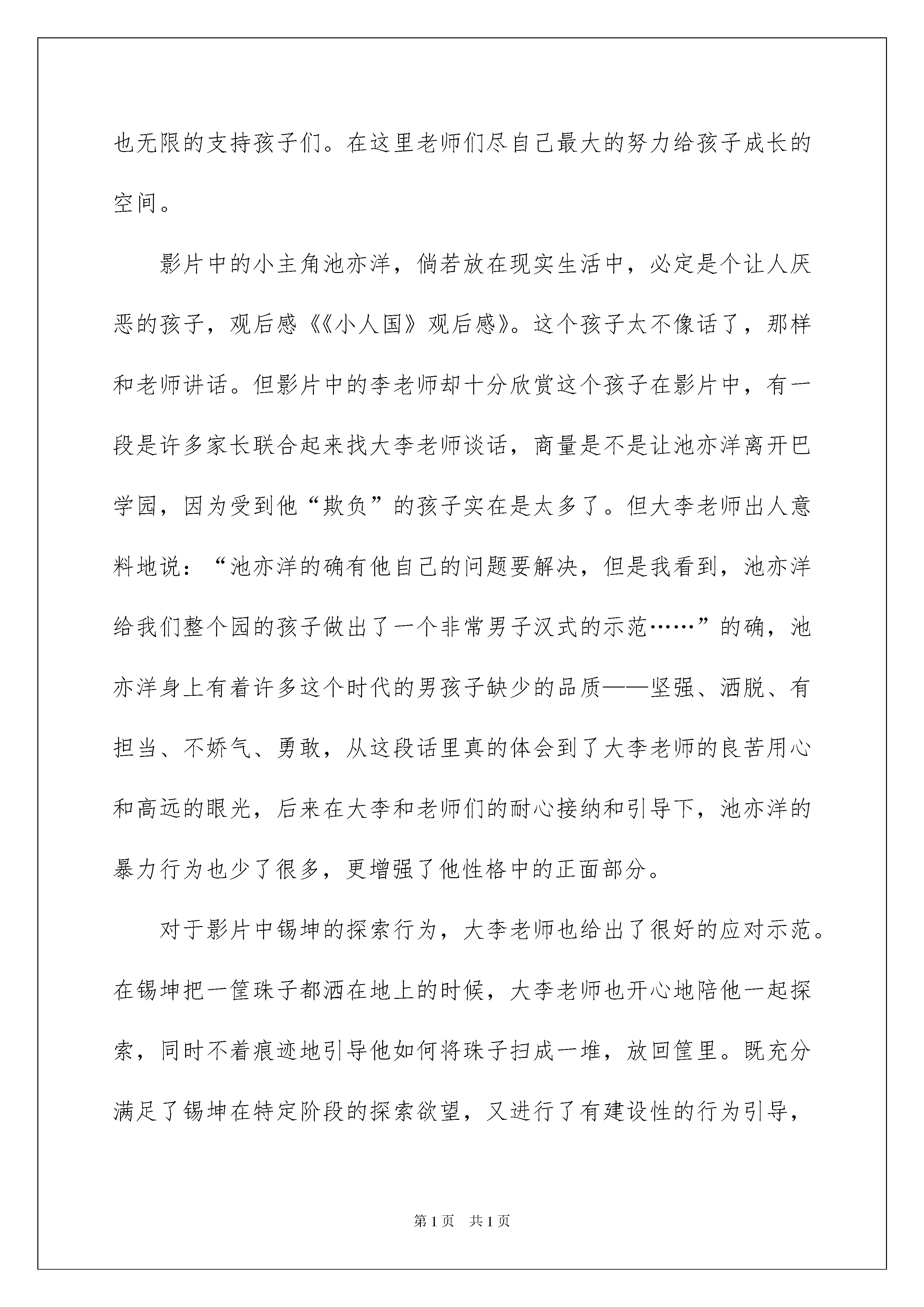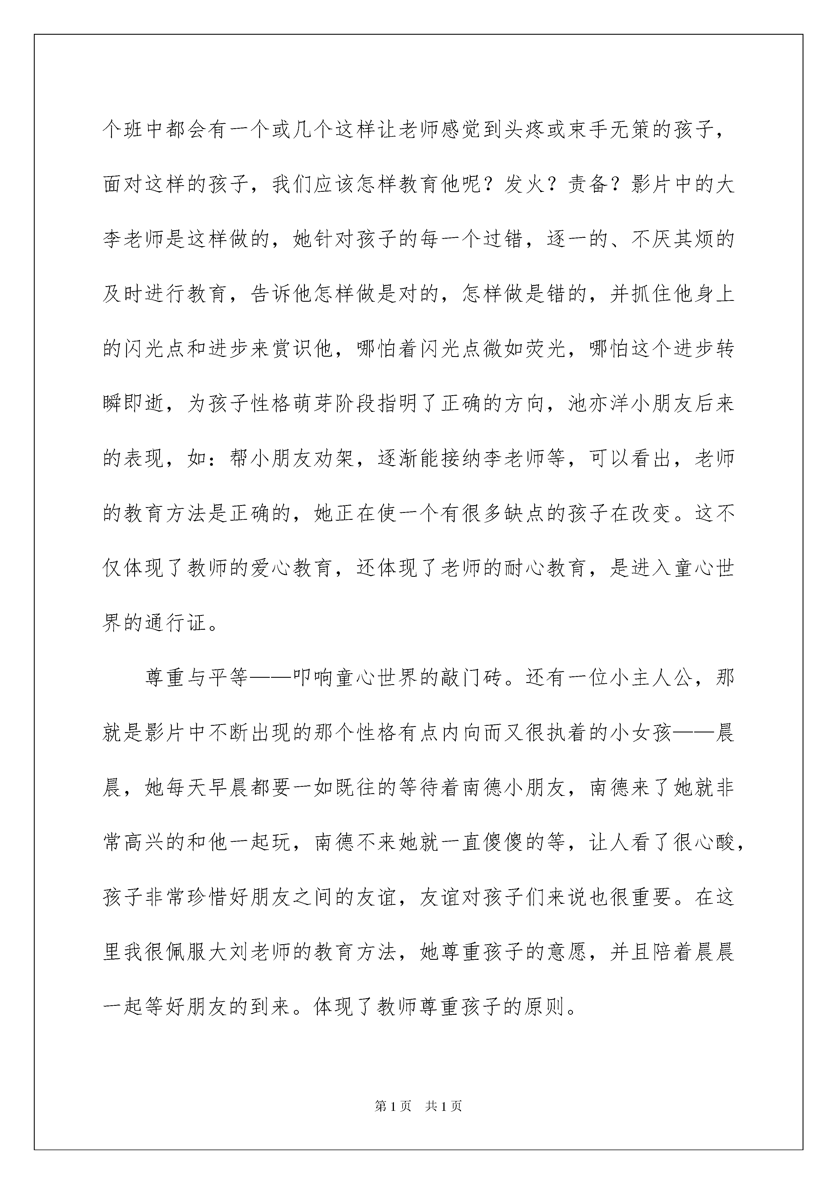 2022小人国观后感7篇小人国观后感7篇细细品味一部作品以后,这次观看让你有什么体会呢?是时候写一篇观后感好好记录一下了。但是观后感有什么要求呢?下面是我精心整理的小人国观后感,欢迎阅读,希望大家能够喜欢。小人国观后感1看完这部纪录片,我忽然开始领悟到什么是孩子所需要的“爱和自由”,如今这四个字已经被无数父母挂在口边奉若法宝,但看着片中大李和老师们渗透在言行之中“爱与自由”,真的比在书上看来的要发人深省得多,《小人国》观后感。这部电影给我的总体感觉是,很美,每个镜头都美,阳光透过幼儿园院子里的树照在房间里照在院子里,那斑驳的影子美轮美奂。老师们和蔼的面容,幼儿园的摆设都是按照孩子们的身高设计的。孩子们在这里有自己家,可以挖地道,男孩子们做男孩子们的军人梦,女孩子们做女孩子们的公主梦。这里是孩子们的天堂,在这里老师们会提供孩子们成长需要的各种物质上物品给孩子们,在精神上,老师们也无限的支持孩子们。在这里老师们尽自己最大的努力给孩子成长的空间。影片中的小主角池亦洋,倘若放在现实生活中,必定是个让人厌恶的孩子,观后感《《小人国》观后感》。这个孩子太不像话了,那样和老师讲话。但影片中的李老师却十分欣赏这个孩子在影片中,有一段是许多家长联合起来找大李老师谈话,商量是不是让池亦洋离开巴学园,因为受到他“欺负”的孩子实在是太多了。但大李老师出人意料地说:“池亦洋的确有他自己的问题要解决,但是我看到,池亦洋给我们整个园的孩子做出了一个非常男子汉式的示范……”的确,池亦洋身上有着许多这个时代的男孩子缺少的品质——坚强、洒脱、有担当、不娇气、勇敢,从这段话里真的体会到了大李老师的良苦用心和高远的眼光,后来在大李和老师们的耐心接纳和引导下,池亦洋的暴力行为也少了很多,更增强了他性格中的正面部分。对于影片中锡坤的探索行为,大李老师也给出了很好的应对示范。在锡坤把一筐珠子都洒在地上的时候,大李老师也开心地陪他一起探索,同时不着痕迹地引导他如何将珠子扫成一堆,放回筐里。既充分满足了锡坤在特定阶段的探索欲望,又进行了有建设性的行为引导,使他逐渐学会如何将东西归位。在这种自由下,锡坤对环境的探索能力得到了保护和发展。所有这些事例,都浸润着大李老师和巴学园的老师们对孩子深沉的爱,孩子们也由此得到了他们良好生长所需要的自由空间。我想,以后面对孩子的时候,尤其是当他的行为表现让我又忍不住焦虑、不满、急躁、发怒的时候,我要想一想辰辰、锡坤、池亦洋还有巴学园的老师们,那样会提醒我要给孩子真正的爱,信任他,信任生命。小人国观后感2首先非常感谢幼儿园的领导组织我们这些幼儿教师观看这么优秀的影片《小人国》。“小人国”是孩子们游戏的乐园,快乐的天堂,“小人国”是一个互相尊重,人人平等的快乐王国。“小人国”给孩子们留下了美好的童年。通过观看这部影片,最令我佩服的是大李老师,她使我在教育孩子的方法上受到了很大的启发。爱心和耐心——进入童心世界的通行证。印象最深的就是那个自认为很帅的小伙子池亦洋,他总是打人骂人欺负小朋友不遵守纪律而且还不懂礼貌,他的逆反心理特别严重。在我们现实生活中,可能每个班中都会有一个或几个这样让老师感觉到头疼或束手无策的孩子,面对这样的孩子,我们应该怎样教育他呢?发火?责备?影片中的大李老师是这样做的,她针对孩子的每一个过错,逐一的、不厌其烦的及时进行教育,告诉他怎样做是对的,怎样做是错的,并抓住他身上的闪光点和进步来赏识他,哪怕着闪光点微如荧光,哪怕这个进步转瞬即逝,为孩子性格萌芽阶段指明了正确的方向,池亦洋小朋友后来的表现,如:帮小朋友劝架,逐渐能接纳李老师等,可以看出,老师的教育方法是正确的,她正在使一个有很多缺点的孩子在改变。这不仅体现了教师的爱心教育,还体现了老师的耐心教育,是进入童心世界的通行证。尊重与平等——叩响童心世界的敲门砖。还有一位小主人公,那就是影片中不断出现的那个性格有点内向而又很执着的小女孩——晨晨,她每天早晨都要一如既往的等待着南德小朋友,南德来了她就非常高兴的和他一起玩,南德不来她就一直傻傻的等,让人看了很心酸,孩子非常珍惜好朋友之间的友谊,友谊对孩子们来说也很重要。在这里我很佩服大刘老师的教育方法,她尊重孩子的意愿,并且陪着晨晨一起等好朋友的到来。体现了教师尊重孩子的原则。赏识孩子——孩子走向成功的奠基石。影片中的那个爱探索的小家伙锡坤,把鞋、玩具、球等往垃圾箱里面扔,原来他是要探究一下垃圾箱的肚子到底有多大,还把塑料玩具撒的满地都是,在一般人看来这是一个爱给老师添乱的孩子,而影片中的大李老师却很赏识孩子,说是给孩子一个自由探索的空间。这种教育方法很值得我们学习。每个孩子