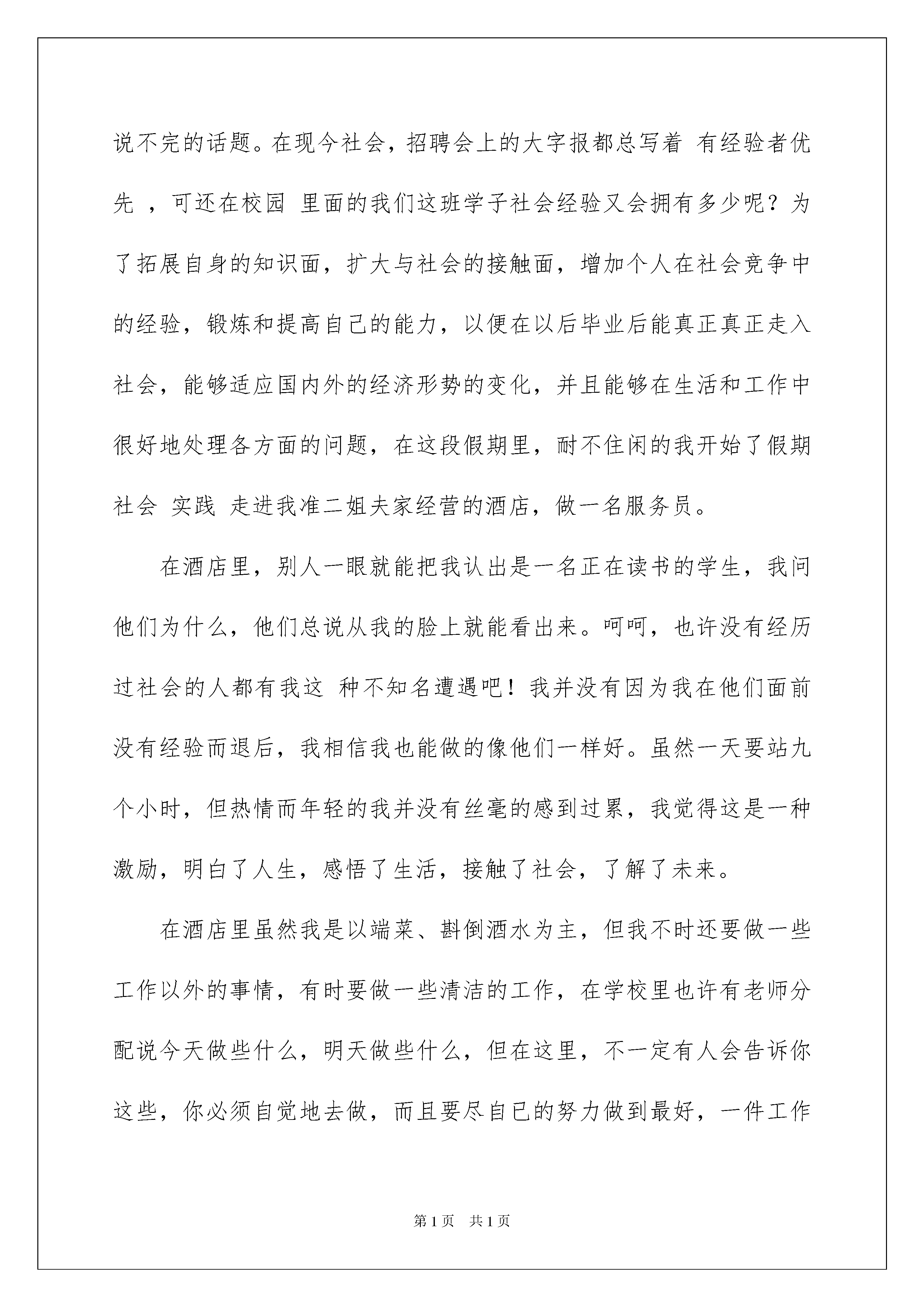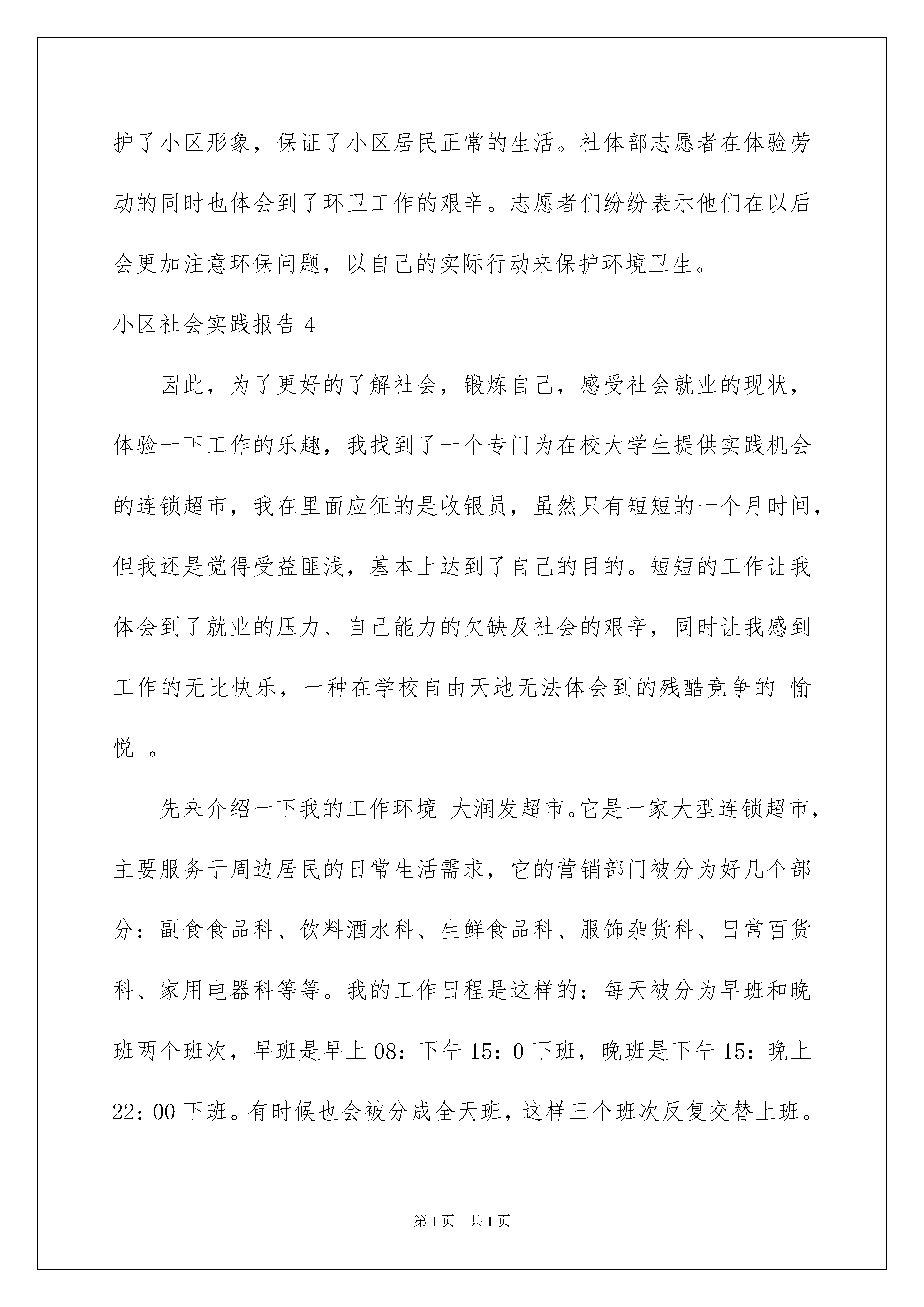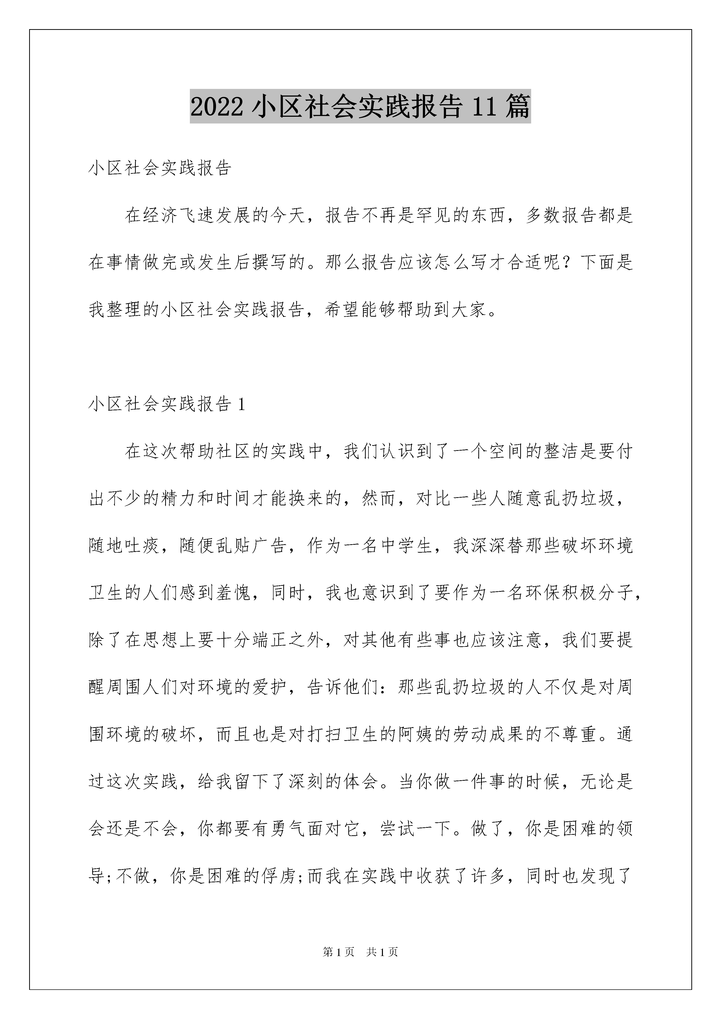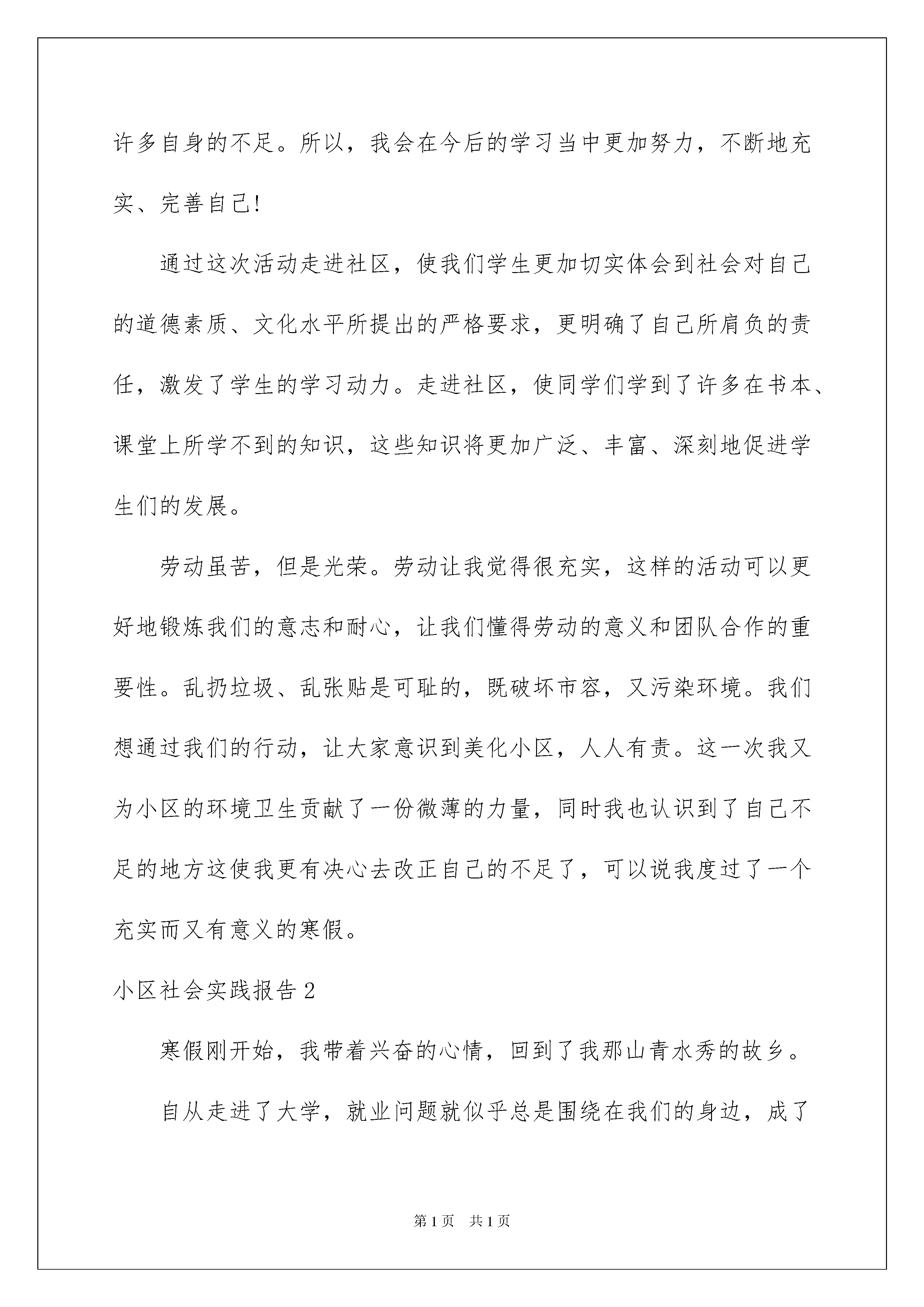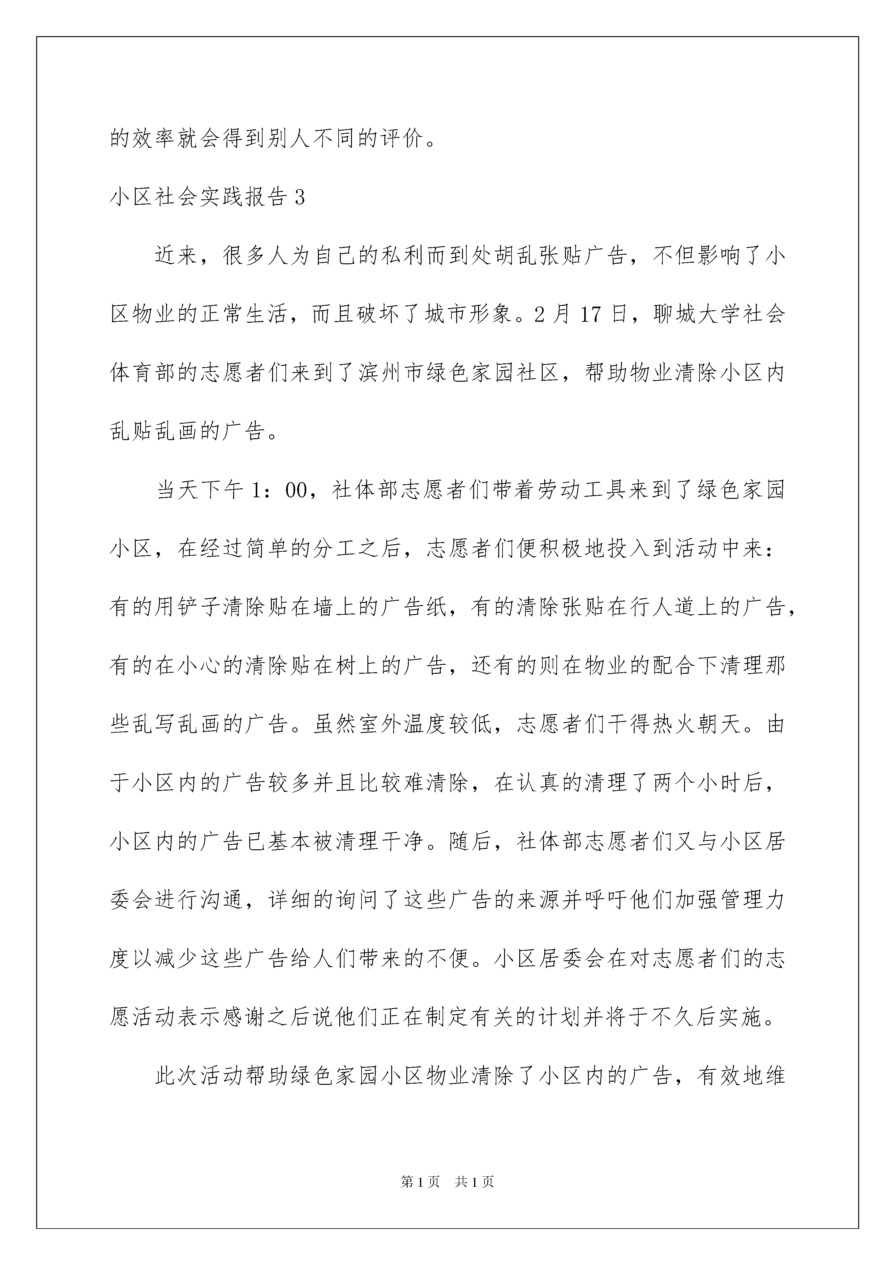 2022小区社会实践报告11篇小区社会实践报告在经济飞速发展的今天,报告不再是罕见的东西,多数报告都是在事情做完或发生后撰写的。那么报告应该怎么写才合适呢?下面是我整理的小区社会实践报告,希望能够帮助到大家。小区社会实践报告1在这次帮助社区的实践中,我们认识到了一个空间的整洁是要付出不少的精力和时间才能换来的,然而,对比一些人随意乱扔垃圾,随地吐痰,随便乱贴广告,作为一名中学生,我深深替那些破坏环境卫生的人们感到羞愧,同时,我也意识到了要作为一名环保积极分子,除了在思想上要十分端正之外,对其他有些事也应该注意,我们要提醒周围人们对环境的爱护,告诉他们:那些乱扔垃圾的人不仅是对周围环境的破坏,而且也是对打扫卫生的阿姨的劳动成果的不尊重。通过这次实践,给我留下了深刻的体会。当你做一件事的时候,无论是会还是不会,你都要有勇气面对它,尝试一下。做了,你是困难的领导;不做,你是困难的俘虏;而我在实践中收获了许多,同时也发现了许多自身的不足。所以,我会在今后的学习当中更加努力,不断地充实、完善自己!通过这次活动走进社区,使我们学生更加切实体会到社会对自己的道德素质、文化水平所提出的严格要求,更明确了自己所肩负的责任,激发了学生的学习动力。走进社区,使同学们学到了许多在书本、课堂上所学不到的知识,这些知识将更加广泛、丰富、深刻地促进学生们的发展。劳动虽苦,但是光荣。劳动让我觉得很充实,这样的活动可以更好地锻炼我们的意志和耐心,让我们懂得劳动的意义和团队合作的重要性。乱扔垃圾、乱张贴是可耻的,既破坏市容,又污染环境。我们想通过我们的行动,让大家意识到美化小区,人人有责。这一次我又为小区的环境卫生贡献了一份微薄的力量,同时我也认识到了自己不足的地方这使我更有决心去改正自己的不足了,可以说我度过了一个充实而又有意义的寒假。小区社会实践报告2寒假刚开始,我带着兴奋的心情,回到了我那山青水秀的故乡。自从走进了大学,就业问题就似乎总是围绕在我们的身边,成了说不完的话题。在现今社会,招聘会上的大字报都总写着有经验者优先,可还在校园里面的我们这班学子社会经验又会拥有多少呢?为了拓展自身的知识面,扩大与社会的接触面,增加个人在社会竞争中的经验,锻炼和提高自己的能力,以便在以后毕业后能真正真正走入社会,能够适应国内外的经济形势的变化,并且能够在生活和工作中很好地处理各方面的问题,在这段假期里,耐不住闲的我开始了假期社会实践走进我准二姐夫家经营的酒店,做一名服务员。在酒店里,别人一眼就能把我认出是一名正在读书的学生,我问他们为什么,他们总说从我的脸上就能看出来。呵呵,也许没有经历过社会的人都有我这种不知名遭遇吧!我并没有因为我在他们面前没有经验而退后,我相信我也能做的像他们一样好。虽然一天要站九个小时,但热情而年轻的我并没有丝毫的感到过累,我觉得这是一种激励,明白了人生,感悟了生活,接触了社会,了解了未来。在酒店里虽然我是以端菜、斟倒酒水为主,但我不时还要做一些工作以外的事情,有时要做一些清洁的工作,在学校里也许有老师分配说今天做些什么,明天做些什么,但在这里,不一定有人会告诉你这些,你必须自觉地去做,而且要尽自已的努力做到最好,一件工作的效率就会得到别人不同的评价。小区社会实践报告3近来,很多人为自己的私利而到处胡乱张贴广告,不但影响了小区物业的正常生活,而且破坏了城市形象。2月17日,聊城大学社会体育部的志愿者们来到了滨州市绿色家园社区,帮助物业清除小区内乱贴乱画的广告。当天下午1:00,社体部志愿者们带着劳动工具来到了绿色家园小区,在经过简单的分工之后,志愿者们便积极地投入到活动中来:有的用铲子清除贴在墙上的广告纸,有的清除张贴在行人道上的广告,有的在小心的清除贴在树上的广告,还有的则在物业的配合下清理那些乱写乱画的广告。虽然室外温度较低,志愿者们干得热火朝天。由于小区内的广告较多并且比较难清除,在认真的清理了两个小时后,小区内的广告已基本被清理干净。随后,社体部志愿者们又与小区居委会进行沟通,详细的询问了这些广告的来源并呼吁他们加强管理力度以减少这些广告给人们带来的不便。小区居委会在对志愿者们的志愿活动表示感谢之后说他们正在制定有关的计划并将于不久后实施。此次活动帮助绿色家园小区物业清除了小区内的广告,有效地维护了小区形象,保证了小区居民正常的生活。社体部志愿者在体验劳动的同时也体会到了环卫工作的艰辛。志愿者们纷纷表示他们在以后会更加注意环保问题,以自己的实际行动来保护环境卫生。小区社会实践报告4因此,为了更好的了解社会,锻炼自己,感受社会就业的现状,体验一下工作的乐趣,我找到了一个专门为在校大学生