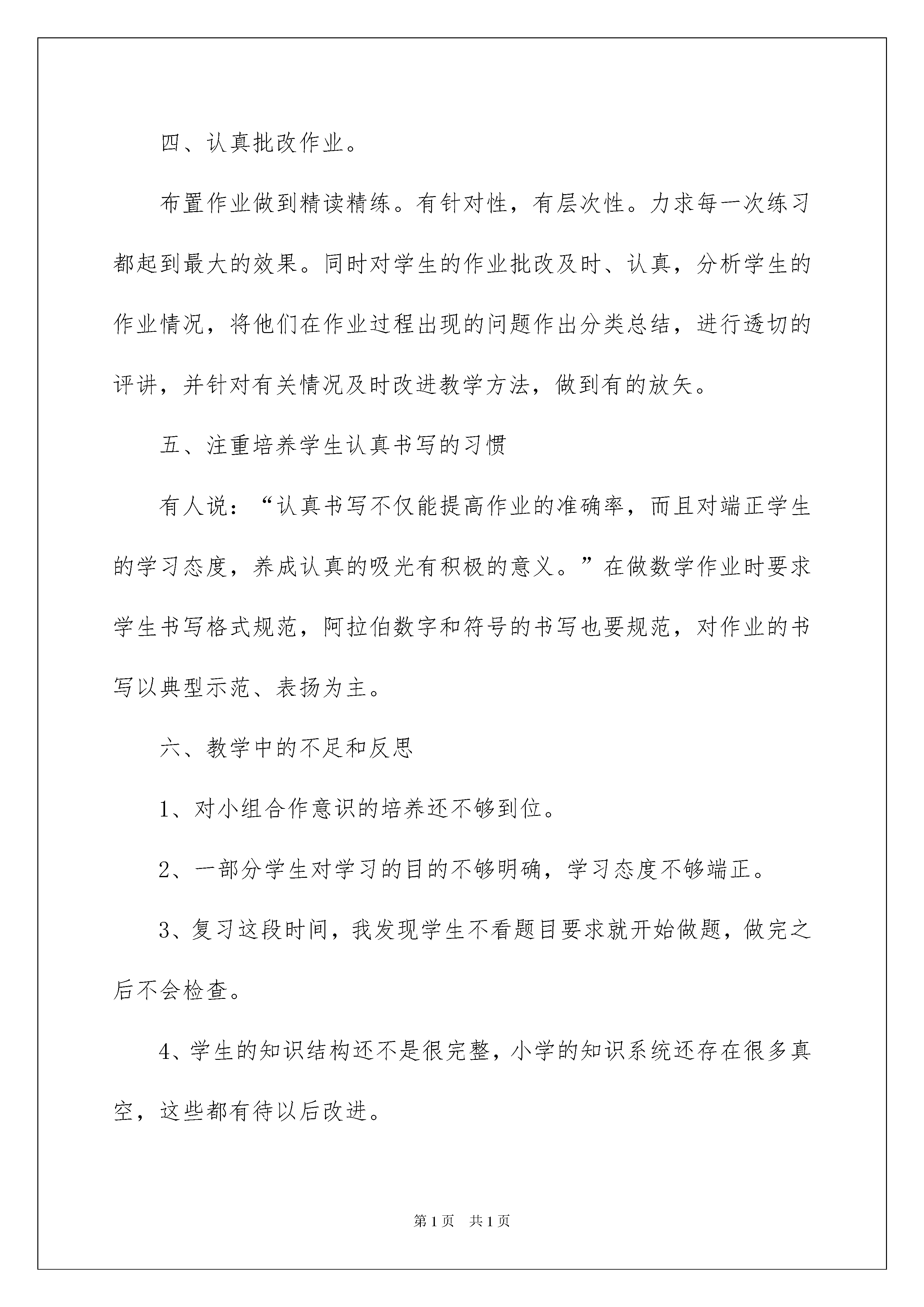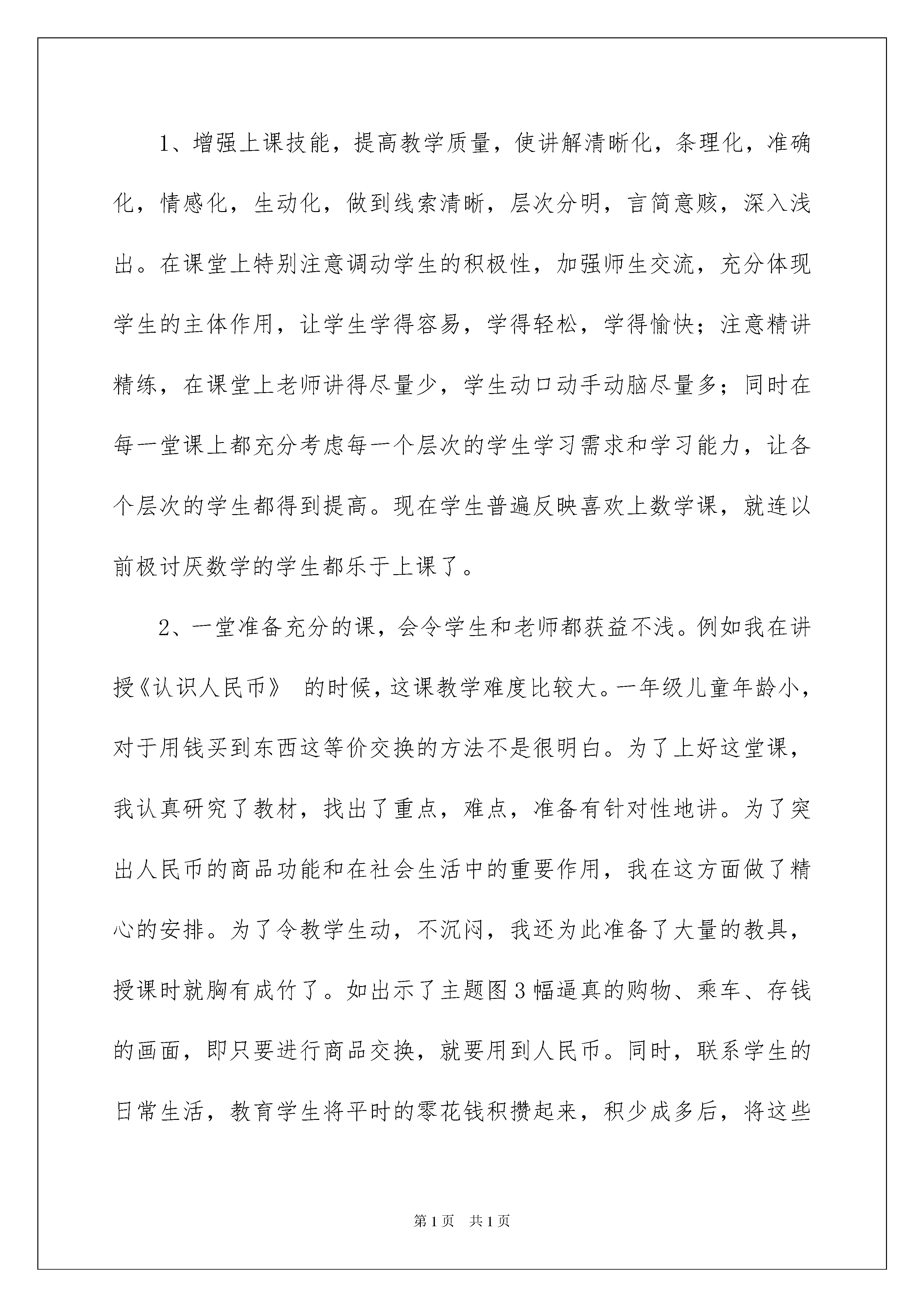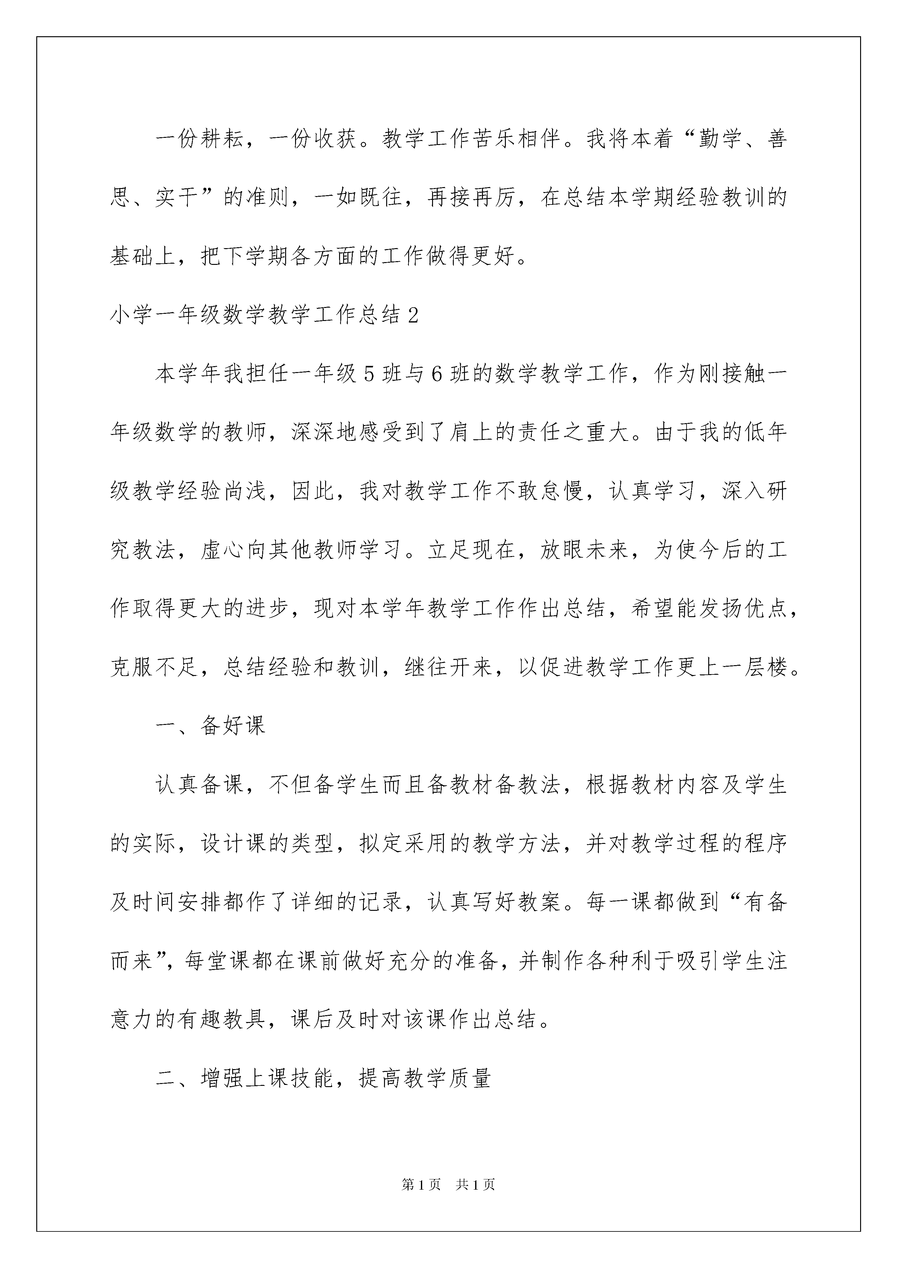 2022小学一年级数学教学工作总结小学一年级数学教学工作总结总结是把一定阶段内的有关情况分析研究,做出有指导性结论的书面材料,它可以有效锻炼我们的语言组织能力,快快来写一份总结吧。那么你真的懂得怎么写总结吗?以下是我精心整理的小学一年级数学教学工作总结,欢迎大家借鉴与参考,希望对大家有所帮助。小学一年级数学教学工作总结120xx年秋季,我担任了一年级的数学教学工作任务。本届一年级学生人数多,底子薄,基础差,从一开始,我便深深地感受到自己肩上担子的重要。所以,我对自己的这份工作丝毫不敢怠慢,认真学习,深入研究,立足现在,放眼未来,取得了一定的成绩和进步。本学期已经近结束,为了更好地总结过去,迎接下学期的工作,现对本学期教学工作作如下总结:一、做好课前准备——备好课在备课的过程中,我根据教材内容及学生的实际,设计课的类型,拟定采用的教学方法,并对教学过程的程序及时间安排都作了详细的记录,认真写好教案。每一课都做到“有备而来”,每堂课都在课前做好充分的准备,并制作各种利于吸引学生注意力的有趣教具,课前、课后及时对该课作出分析和总结,写好教学反思。二、增强上课技能——上好课在上课中,我做到讲解清晰化、条理化、准确化、条理化、准确化、情感化和生动化,注重调动学生的积极性,加强师生之间的交流。我还特别注意以知识本身吸引学生,巧妙引入,精心设疑,造成学生渴求新知识的心理状态,激发学生学习的积极性和主动性。三、做好课后辅导工作在自习课上为不同层次的学生进行相应的辅导,以满足不同层次的学生需求,同时加大后进生的辅导力度,对后进生的辅导并不限于学习知识性的辅导,更重要的是学习思想的辅导,要提高后进生的成绩首先要激发他们的学习兴趣,有人说:“兴趣是最好的老师。”一年级孩子年龄小特别喜欢爱表扬,抓住他们的闪光点,越表扬他就会越学越好,在提高兴趣的同时还要教给他们学习的方法,并认真细致的做好查漏补缺工作,在课堂上抓住机会提问他,鼓励他,表扬他,这样他们就会学得轻松学的愉快。进步越快。四、认真批改作业。布置作业做到精读精练。有针对性,有层次性。力求每一次练习都起到最大的效果。同时对学生的作业批改及时、认真,分析学生的作业情况,将他们在作业过程出现的问题作出分类总结,进行透切的评讲,并针对有关情况及时改进教学方法,做到有的放矢。五、注重培养学生认真书写的习惯有人说:“认真书写不仅能提高作业的准确率,而且对端正学生的学习态度,养成认真的吸光有积极的意义。”在做数学作业时要求学生书写格式规范,阿拉伯数字和符号的书写也要规范,对作业的书写以典型示范、表扬为主。六、教学中的不足和反思1、对小组合作意识的培养还不够到位。2、一部分学生对学习的目的不够明确,学习态度不够端正。3、复习这段时间,我发现学生不看题目要求就开始做题,做完之后不会检查。4、学生的知识结构还不是很完整,小学的知识系统还存在很多真空,这些都有待以后改进。一份耕耘,一份收获。教学工作苦乐相伴。我将本着“勤学、善思、实干”的准则,一如既往,再接再厉,在总结本学期经验教训的基础上,把下学期各方面的工作做得更好。小学一年级数学教学工作总结2本学年我担任一年级5班与6班的数学教学工作,作为刚接触一年级数学的教师,深深地感受到了肩上的责任之重大。由于我的低年级教学经验尚浅,因此,我对教学工作不敢怠慢,认真学习,深入研究教法,虚心向其他教师学习。立足现在,放眼未来,为使今后的工作取得更大的进步,现对本学年教学工作作出总结,希望能发扬优点,克服不足,总结经验和教训,继往开来,以促进教学工作更上一层楼。一、备好课认真备课,不但备学生而且备教材备教法,根据教材内容及学生的实际,设计课的类型,拟定采用的教学方法,并对教学过程的程序及时间安排都作了详细的记录,认真写好教案。每一课都做到“有备而来”,每堂课都在课前做好充分的准备,并制作各种利于吸引学生注意力的有趣教具,课后及时对该课作出总结。二、增强上课技能,提高教学质量1、增强上课技能,提高教学质量,使讲解清晰化,条理化,准确化,情感化,生动化,做到线索清晰,层次分明,言简意赅,深入浅出。在课堂上特别注意调动学生的积极性,加强师生交流,充分体现学生的主体作用,让学生学得容易,学得轻松,学得愉快;注意精讲精练,在课堂上老师讲得尽量少,学生动口动手动脑尽量多;同时在每一堂课上都充分考虑每一个层次的学生学习需求和学习能力,让各个层次的学生都得到提高。现在学生普遍反映喜欢上数学课,就连以前极讨厌数学的学生都乐于上课了。2、一堂准备充分的课,会令学生和老师都获益不浅。例如我在讲授《认识人民币》的时候,这课教学难度比较大。一年
