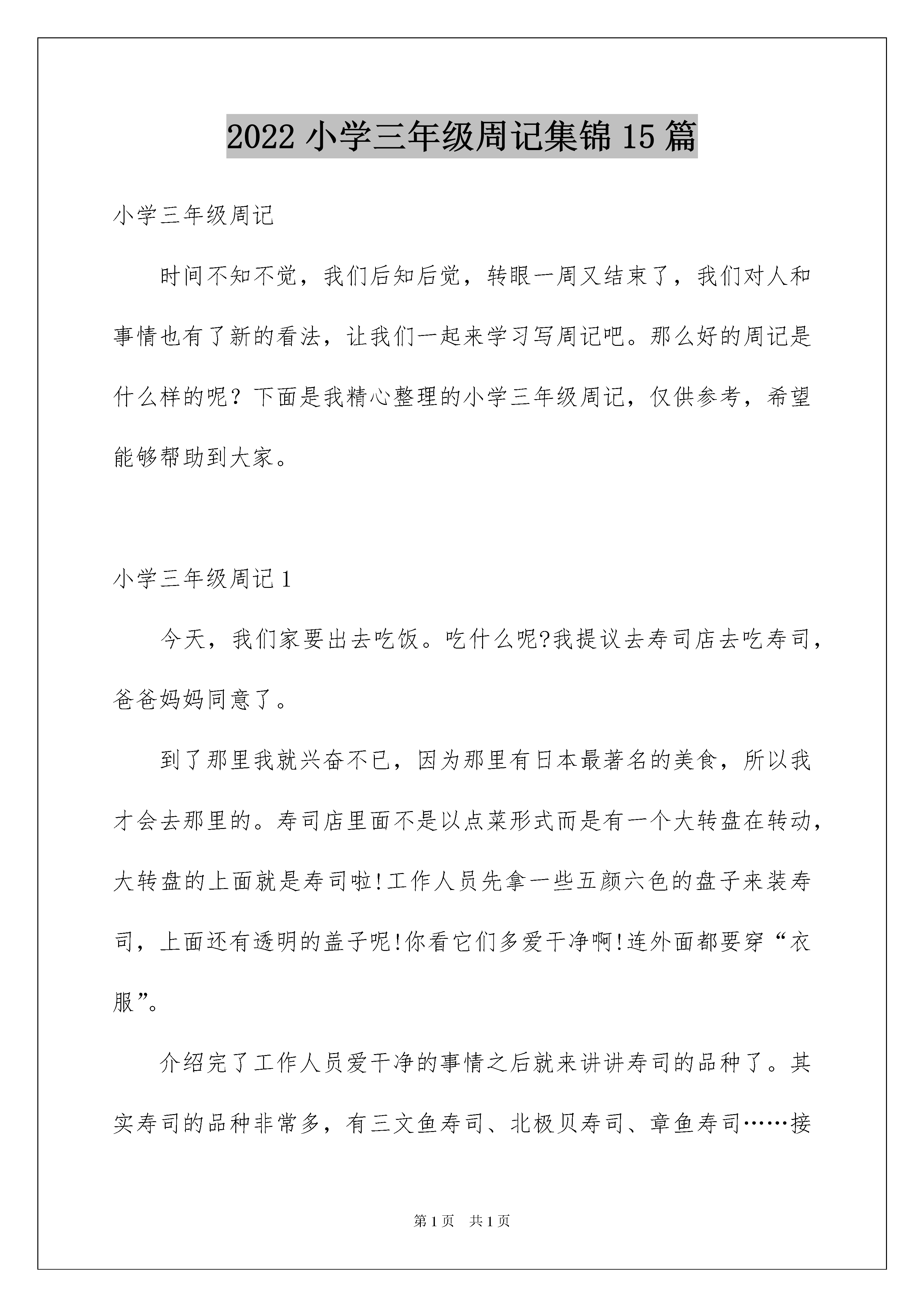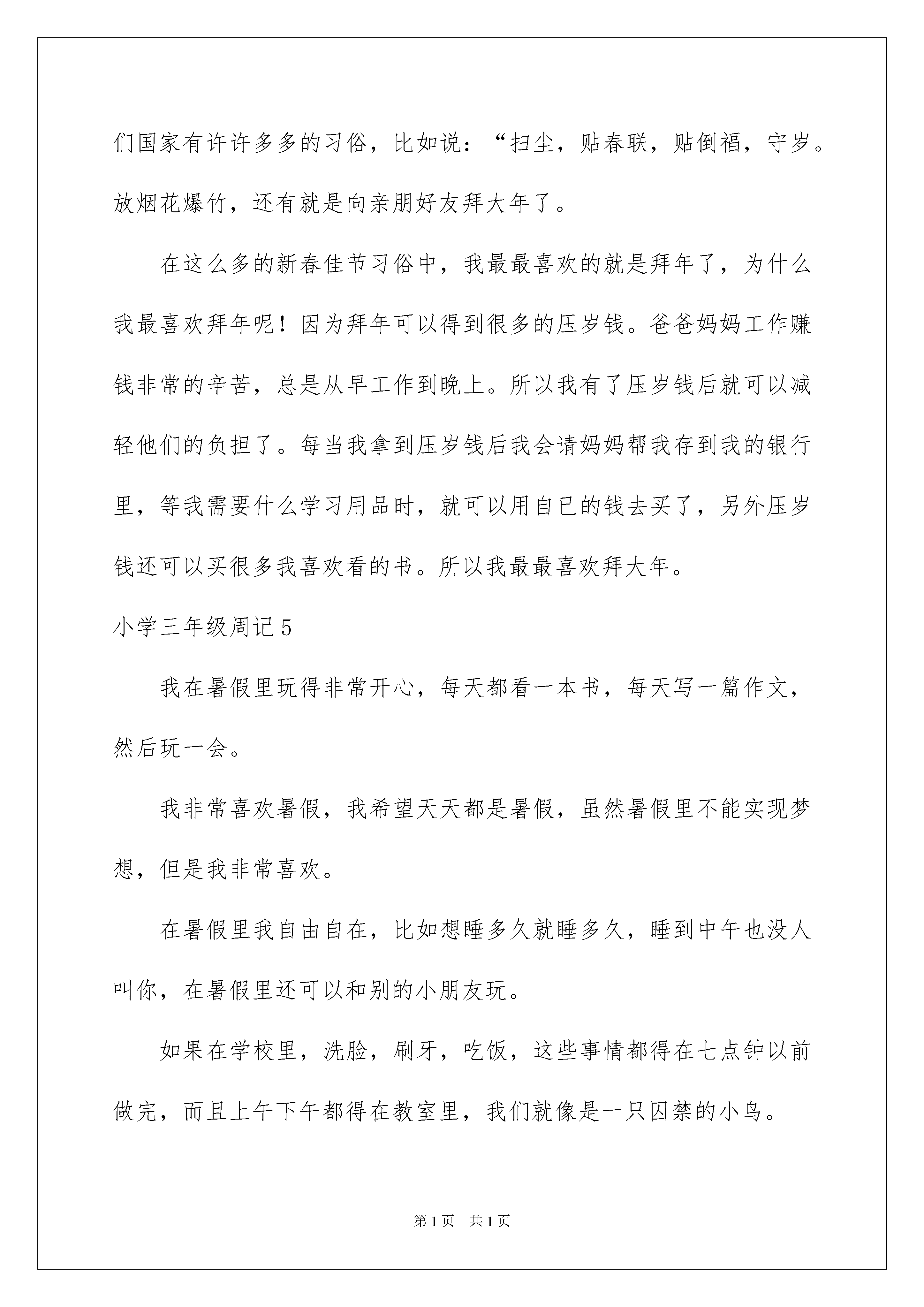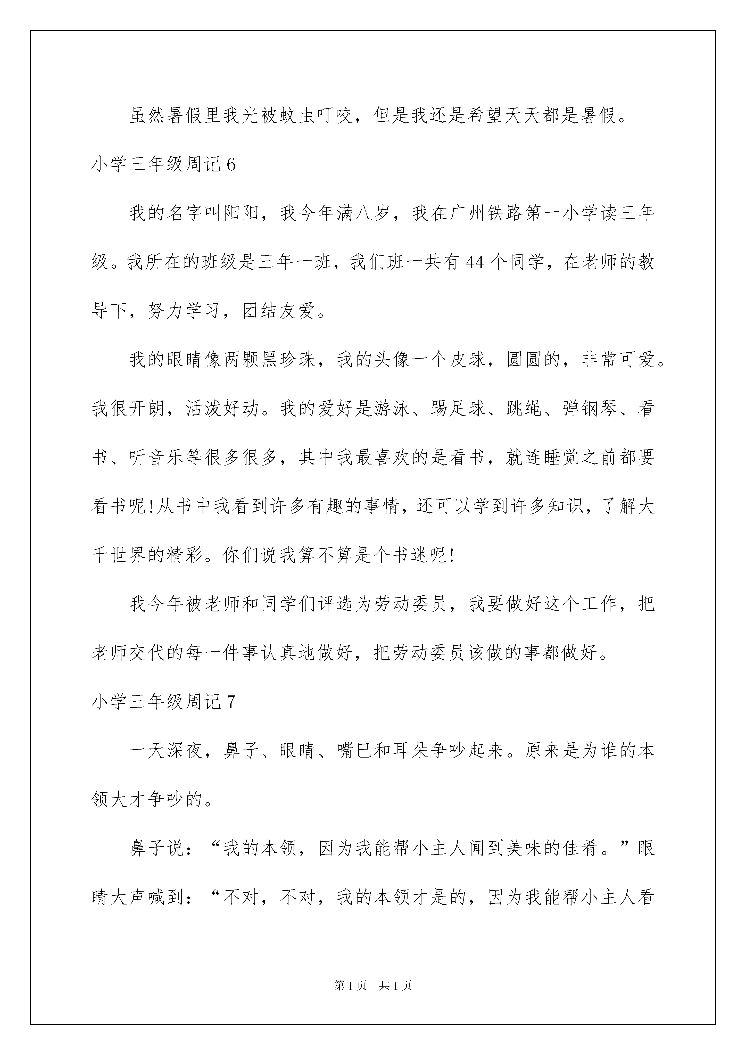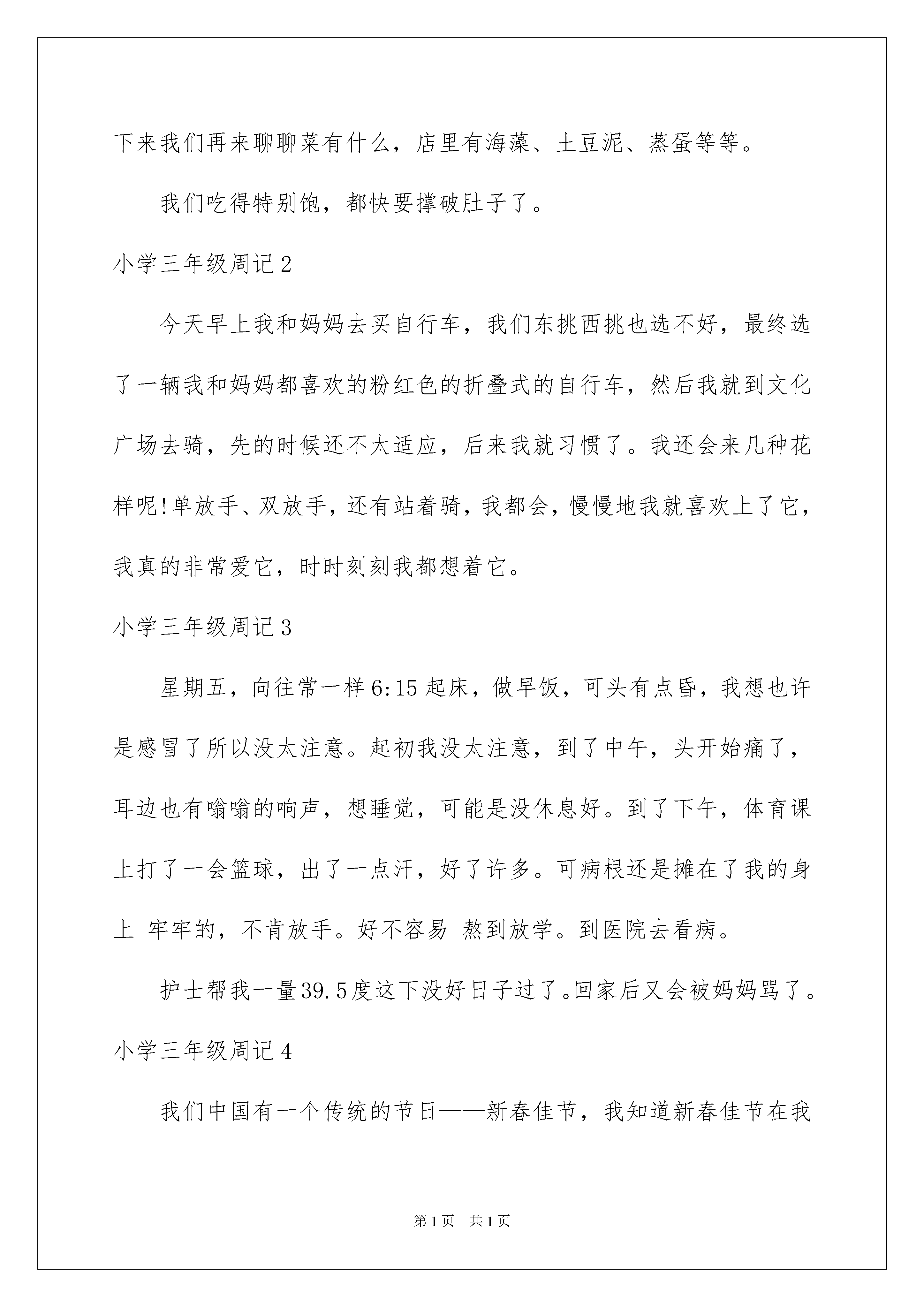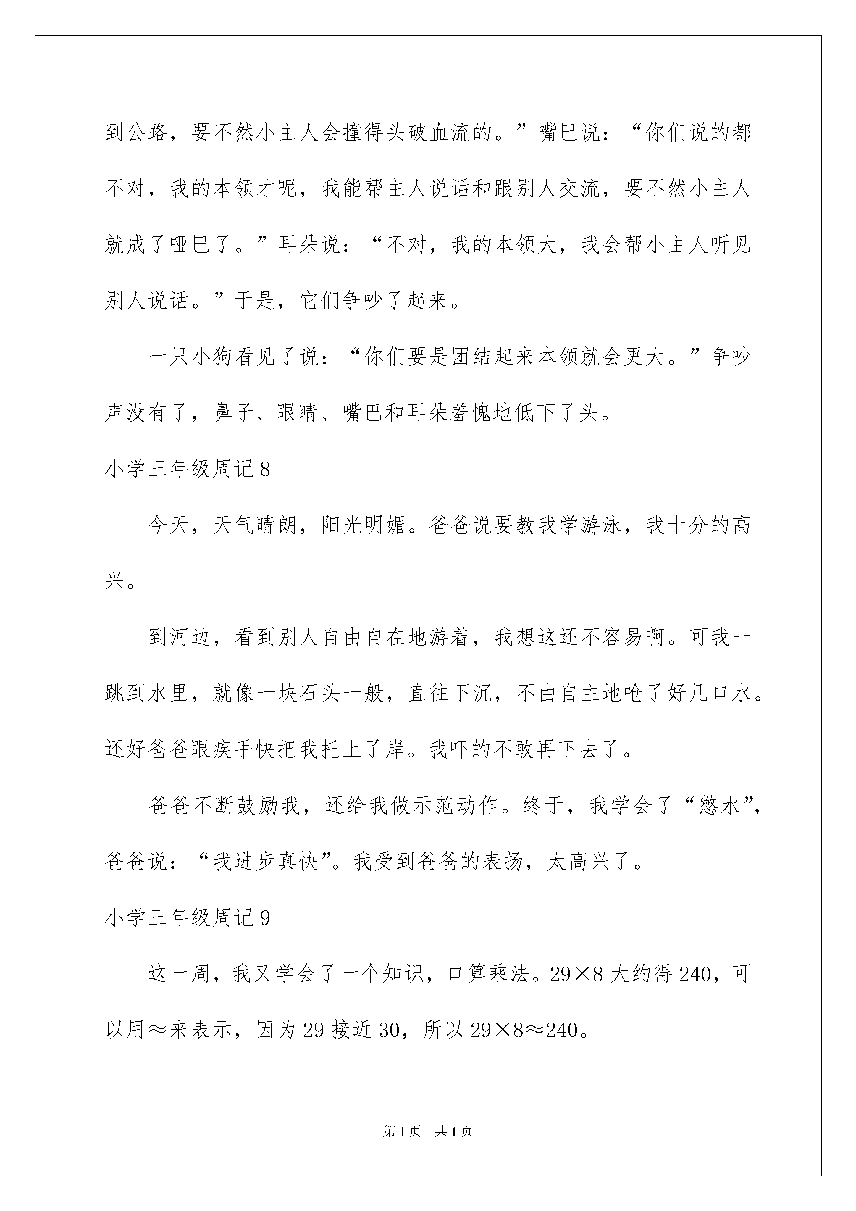 2022小学三年级周记集锦15篇小学三年级周记时间不知不觉,我们后知后觉,转眼一周又结束了,我们对人和事情也有了新的看法,让我们一起来学习写周记吧。那么好的周记是什么样的呢?下面是我精心整理的小学三年级周记,仅供参考,希望能够帮助到大家。小学三年级周记1今天,我们家要出去吃饭。吃什么呢?我提议去寿司店去吃寿司,爸爸妈妈同意了。到了那里我就兴奋不已,因为那里有日本最著名的美食,所以我才会去那里的。寿司店里面不是以点菜形式而是有一个大转盘在转动,大转盘的上面就是寿司啦!工作人员先拿一些五颜六色的盘子来装寿司,上面还有透明的盖子呢!你看它们多爱干净啊!连外面都要穿“衣服”。介绍完了工作人员爱干净的事情之后就来讲讲寿司的品种了。其实寿司的品种非常多,有三文鱼寿司、北极贝寿司、章鱼寿司……接下来我们再来聊聊菜有什么,店里有海藻、土豆泥、蒸蛋等等。我们吃得特别饱,都快要撑破肚子了。小学三年级周记2今天早上我和妈妈去买自行车,我们东挑西挑也选不好,最终选了一辆我和妈妈都喜欢的粉红色的折叠式的自行车,然后我就到文化广场去骑,先的时候还不太适应,后来我就习惯了。我还会来几种花样呢!单放手、双放手,还有站着骑,我都会,慢慢地我就喜欢上了它,我真的非常爱它,时时刻刻我都想着它。小学三年级周记3星期五,向往常一样6:15起床,做早饭,可头有点昏,我想也许是感冒了所以没太注意。起初我没太注意,到了中午,头开始痛了,耳边也有嗡嗡的响声,想睡觉,可能是没休息好。到了下午,体育课上打了一会篮球,出了一点汗,好了许多。可病根还是摊在了我的身上牢牢的,不肯放手。好不容易熬到放学。到医院去看病。护士帮我一量39.5度这下没好日子过了。回家后又会被妈妈骂了。小学三年级周记4我们中国有一个传统的节日——新春佳节,我知道新春佳节在我们国家有许许多多的习俗,比如说:“扫尘,贴春联,贴倒福,守岁。放烟花爆竹,还有就是向亲朋好友拜大年了。在这么多的新春佳节习俗中,我最最喜欢的就是拜年了,为什么我最喜欢拜年呢!因为拜年可以得到很多的压岁钱。爸爸妈妈工作赚钱非常的辛苦,总是从早工作到晚上。所以我有了压岁钱后就可以减轻他们的负担了。每当我拿到压岁钱后我会请妈妈帮我存到我的银行里,等我需要什么学习用品时,就可以用自已的钱去买了,另外压岁钱还可以买很多我喜欢看的书。所以我最最喜欢拜大年。小学三年级周记5我在暑假里玩得非常开心,每天都看一本书,每天写一篇作文,然后玩一会。我非常喜欢暑假,我希望天天都是暑假,虽然暑假里不能实现梦想,但是我非常喜欢。在暑假里我自由自在,比如想睡多久就睡多久,睡到中午也没人叫你,在暑假里还可以和别的小朋友玩。如果在学校里,洗脸,刷牙,吃饭,这些事情都得在七点钟以前做完,而且上午下午都得在教室里,我们就像是一只囚禁的小鸟。虽然暑假里我光被蚊虫叮咬,但是我还是希望天天都是暑假。小学三年级周记6我的名字叫阳阳,我今年满八岁,我在广州铁路第一小学读三年级。我所在的班级是三年一班,我们班一共有44个同学,在老师的教导下,努力学习,团结友爱。我的眼睛像两颗黑珍珠,我的头像一个皮球,圆圆的,非常可爱。我很开朗,活泼好动。我的爱好是游泳、踢足球、跳绳、弹钢琴、看书、听音乐等很多很多,其中我最喜欢的是看书,就连睡觉之前都要看书呢!从书中我看到许多有趣的事情,还可以学到许多知识,了解大千世界的精彩。你们说我算不算是个书迷呢!我今年被老师和同学们评选为劳动委员,我要做好这个工作,把老师交代的每一件事认真地做好,把劳动委员该做的事都做好。小学三年级周记7一天深夜,鼻子、眼睛、嘴巴和耳朵争吵起来。原来是为谁的本领大才争吵的。鼻子说:“我的本领,因为我能帮小主人闻到美味的佳肴。”眼睛大声喊到:“不对,不对,我的本领才是的,因为我能帮小主人看到公路,要不然小主人会撞得头破血流的。”嘴巴说:“你们说的都不对,我的本领才呢,我能帮主人说话和跟别人交流,要不然小主人就成了哑巴了。”耳朵说:“不对,我的本领大,我会帮小主人听见别人说话。”于是,它们争吵了起来。一只小狗看见了说:“你们要是团结起来本领就会更大。”争吵声没有了,鼻子、眼睛、嘴巴和耳朵羞愧地低下了头。小学三年级周记8今天,天气晴朗,阳光明媚。爸爸说要教我学游泳,我十分的高兴。到河边,看到别人自由自在地游着,我想这还不容易啊。可我一跳到水里,就像一块石头一般,直往下沉,不由自主地呛了好几口水。还好爸爸眼疾手快把我托上了岸。我吓的不敢再下去了。爸爸不断鼓励我,还给我做示范动作。终于,我学会了“憋水”,爸爸说:“我进步真快”。我受到爸爸的表扬,太高兴了。小学三年级周记9这一周,我又学会了