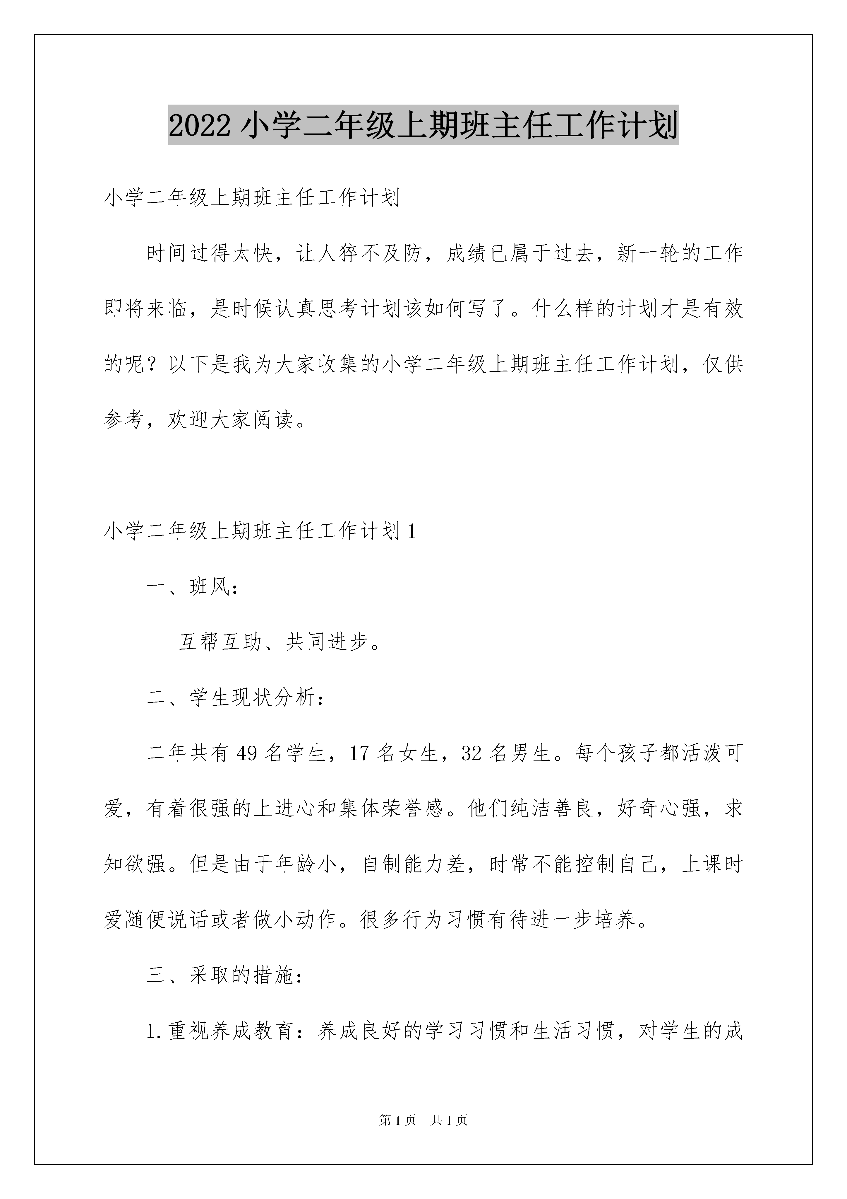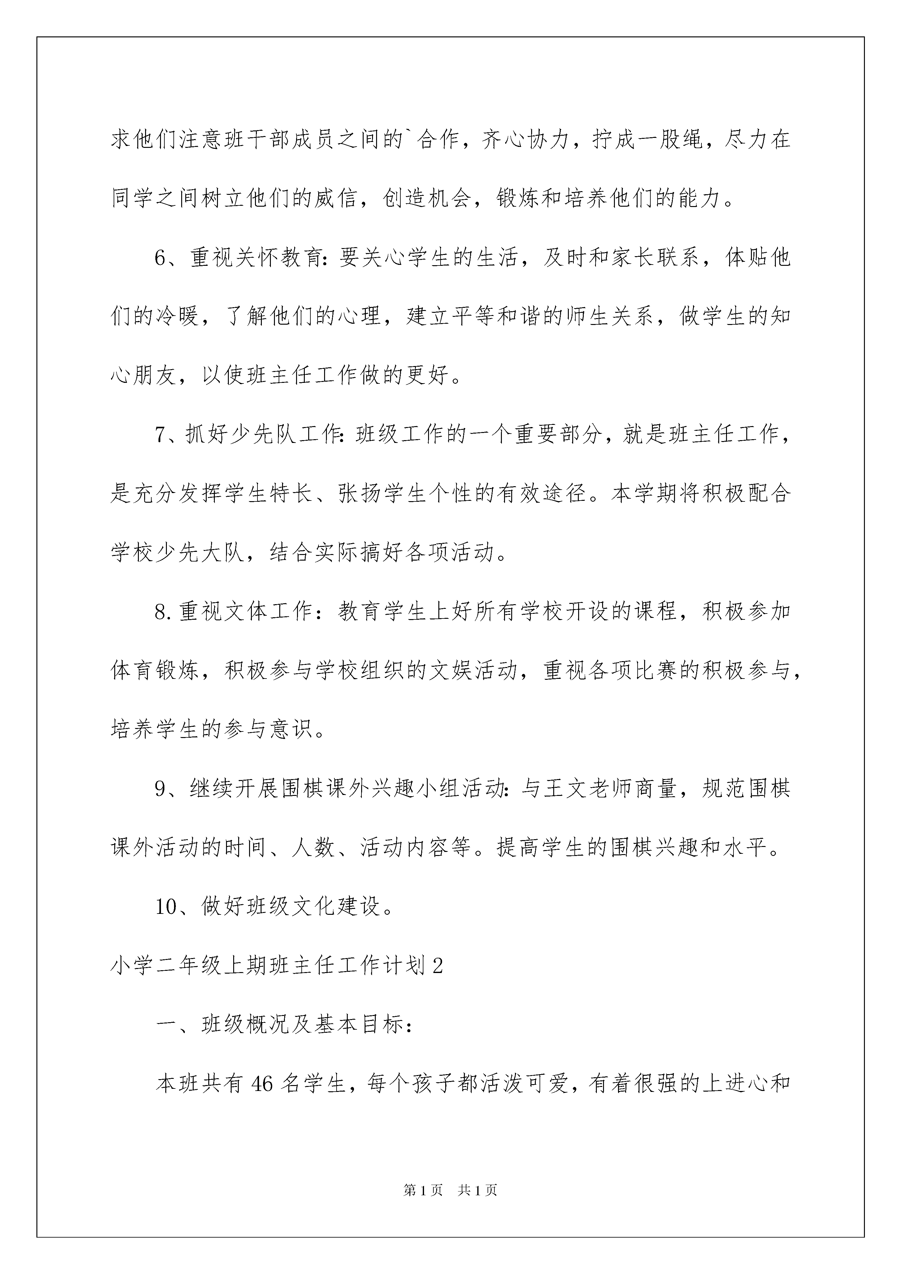 2022小学二年级上期班主任工作计划小学二年级上期班主任工作计划时间过得太快,让人猝不及防,成绩已属于过去,新一轮的工作即将来临,是时候认真思考计划该如何写了。什么样的计划才是有效的呢?以下是我为大家收集的小学二年级上期班主任工作计划,仅供参考,欢迎大家阅读。小学二年级上期班主任工作计划1一、班风:互帮互助、共同进步。二、学生现状分析:二年共有49名学生,17名女生,32名男生。每个孩子都活泼可爱,有着很强的上进心和集体荣誉感。他们纯洁善良,好奇心强,求知欲强。但是由于年龄小,自制能力差,时常不能控制自己,上课时爱随便说话或者做小动作。很多行为习惯有待进一步培养。三、采取的措施:1.重视养成教育:养成良好的学习习惯和生活习惯,对学生的成长进步是十分必要的,良好的行为习惯使一个人的终生发展受益非浅。因此,在班级进行良好品德的养成教育是十分必要的。根据学生的思想实际情况,与学校的德育工作密切配合,本学期,将在晨间谈话中从不同的方面和角度对学生进行规律性的常规训练。重点落实好《小学生日常行为规范》,使学生逐步形成良好的道德品质,行为习惯,学习习惯和积极的学习态度,不使一个学生掉队。2、加强后进生管理:面向全体学生,分类施教,加强对后进生的辅导,要从关心、爱护学生的角度出发,了解关心学生。及时了解学生的心理变化,掌握他们成长道路上的发展情况。3、及时了解学情:准确把握学生对知识的掌握,因材施教,在重点难点上下工夫,以促进全班成绩的平稳、扎实地上升。4、家教结合:经常保持与否学生家长联系,使学校教育和家庭教育有机地结合起来。要不厌其烦的做好后进生的转化工作,抓两头,促中间,使全班形成一盘棋,真正成为一个团结向上的班集体。5、培养班级干部:充分发挥班级干部的功能,及时召开班干部会议,针对他们在工作中出现的问题,教给他们工作方法,使他们明确自己的职责,指出他们的优缺点和今后努力工作的方向。同时,还要求他们注意班干部成员之间的`合作,齐心协力,拧成一股绳,尽力在同学之间树立他们的威信,创造机会,锻炼和培养他们的能力。6、重视关怀教育:要关心学生的生活,及时和家长联系,体贴他们的冷暖,了解他们的心理,建立平等和谐的师生关系,做学生的知心朋友,以使班主任工作做的更好。7、抓好少先队工作:班级工作的一个重要部分,就是班主任工作,是充分发挥学生特长、张扬学生个性的有效途径。本学期将积极配合学校少先大队,结合实际搞好各项活动。8.重视文体工作:教育学生上好所有学校开设的课程,积极参加体育锻炼,积极参与学校组织的文娱活动,重视各项比赛的积极参与,培养学生的参与意识。9、继续开展围棋课外兴趣小组活动:与王文老师商量,规范围棋课外活动的时间、人数、活动内容等。提高学生的围棋兴趣和水平。10、做好班级文化建设。小学二年级上期班主任工作计划2一、班级概况及基本目标:本班共有46名学生,每个孩子都活泼可爱,有着很强的上进心和集体荣誉感。但是由于年龄小,自制能力差,时常不能控制自己,上课时爱随便说话或者做小动作,男生在这方面明显不足。很多行为习惯有待进一步培养。学习方面已经有了一定的学习习惯,大部分学生能较自觉完成学习任务,个别学生缺乏主动性,书写有待于加强。本学期我班的基本目标是:建立一支有进取心、管理能力较强的班干部队伍,全体同学都能树立明确的学习目的,形成良好的学习风气;培养学生良好的行为规范,弘扬正气,逐步形成守纪、进取、勤奋的班风。继续抓好学生的常规教育,强化《小学生日常行为规范》的落实,培养学生良好的行为习惯。师生中进行赏识教育,老师赏识学生,让学生学会赏识自己,赏识他人。积极配合学校、少先队的各种活动,开展丰富多彩的中队活动,培养学生强烈的责任感、班级荣誉感,以及自我约束,自我管理的能力。二、基本措施和做法:(一)常规教育方面。学生经过一个假期的放松,对于学校的日常生活和学习必定不太适应,做到每一项规章制度对于他们来说都不太容易。为了使学生能够及早进入角色,适应学校的生活,这就要班主任在日常生活中能有序的引导,并且内容要近一点、小一点、实一点,时时处处向学生进行有针对性的常规教育。因此,我决定从以下几点入手:1、利用升旗仪式和班会时间,加强学生的德育教育。升旗结束后,对上周的情况进行总结。使学生懂得做人的道理,培养其爱国主义情感。同时,让学生在各种活动和劳动中学会合作,学会生活。对于学生的书写读的姿势,在课堂上随时提醒与帮助。2、开学师生共同制定班规班纪,并制定相应的奖惩办法。从纪律、卫生、劳动及两操几方面制定。先由学生写出自己的违规现象及奖惩办法,再由班主任统一归纳完善,如有违规照章处罚。我们班
