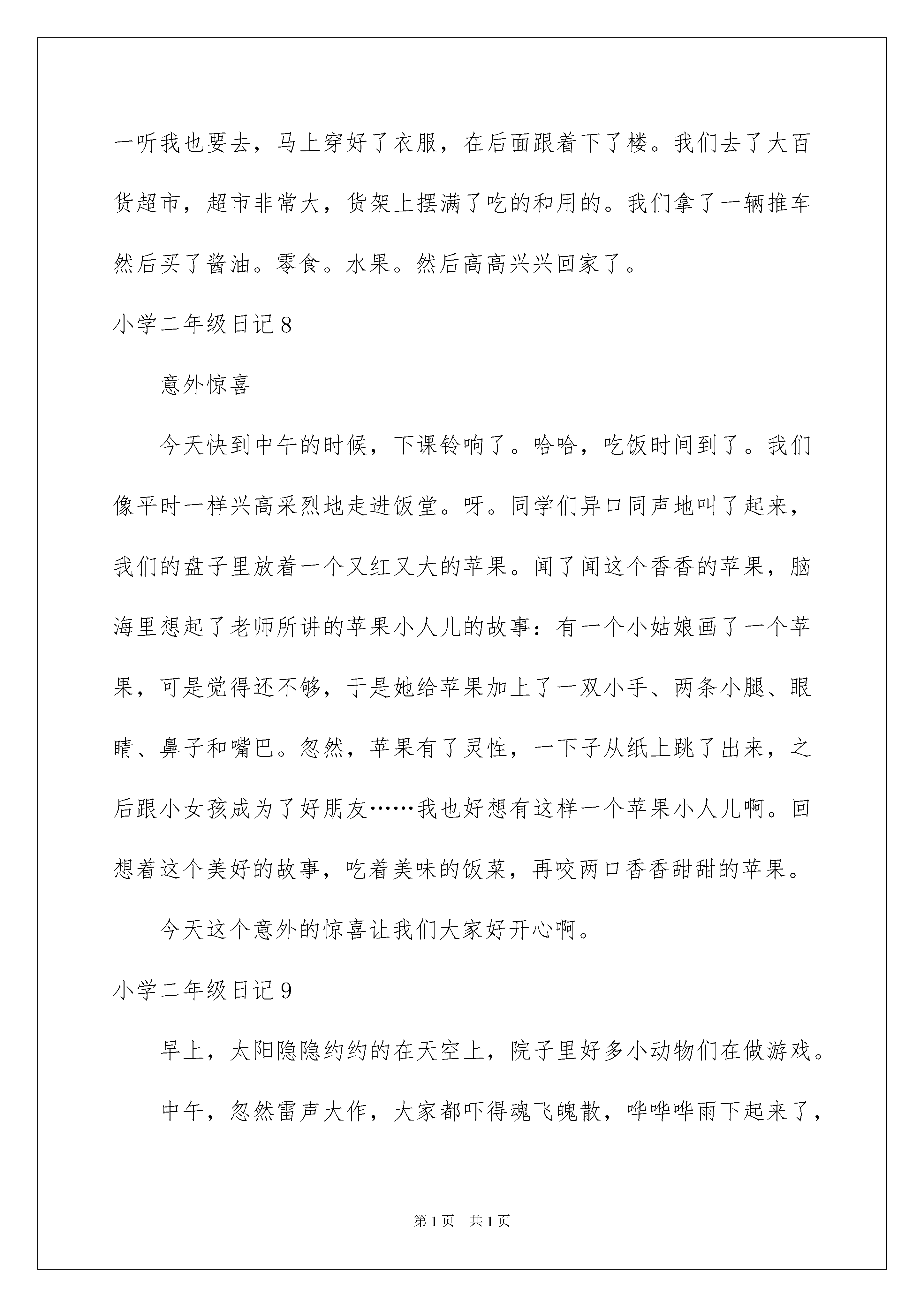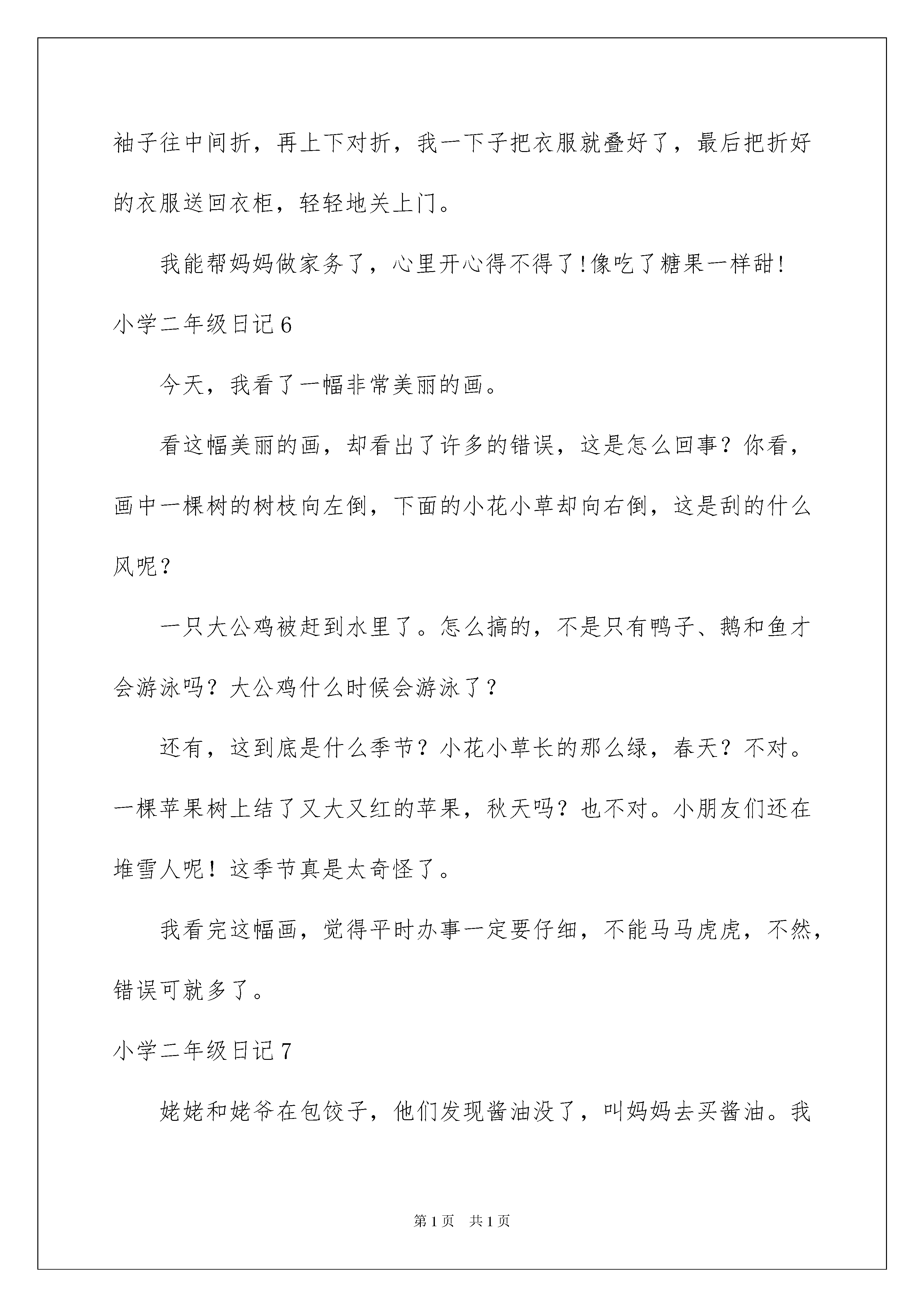 2022小学二年级日记(集锦15篇)小学二年级日记不知不觉中一天又要结束了,你有什么总结呢?请好好地记录下在日记里。那么日记有什么格式呢?下面是我为大家整理的小学二年级日记,希望对大家有所帮助。小学二年级日记1我有很多好帮手,他们分别是:钢笔、铅笔、橡皮、尺子、文具盒……钢笔和铅笔是我的好帮手,因为他们帮我写出漂亮的字;橡皮是我的好帮手,因为他能帮我擦掉写错的字;尺子也是我的好帮手,因为他能帮我画一条直直的线;文具盒是我最好的帮手,因为他能帮我装着钢笔、铅笔、橡皮、尺子等之类的东西。我非常喜欢我的这些好帮手。小学二年级日记2今天我可得好好学习了,要不妈妈回家后,又该瞪大眼珠了。妈妈的眼睛很漂亮,左眼是专门看韩剧的,右眼是专门看我学习的。两只眼睛都很忙,太累了!要是再长一只眼那该多好啊!但是要是再长一只眼睛我就没法活了。小学二年级日记3小草感谢土地,让它自由快乐的成长。小鱼感谢河水,让它无拘无束的遨游。风筝感谢风儿,让它感受到了成功的喜悦。果实感谢秋天,让它有着美丽和成熟。台灯感谢电源,让它有着迷人的光亮。鸟儿感谢蓝天,让它得以自在的飞翔。我们感谢自己的爸爸妈妈,让我们生活得幸福、安康。小学二年级日记4我家的小狗真可爱,一见到我,它总是跟着我又蹦又跳。有时还抓我的裤子,咬我的鞋子。今天放学回家,我看见小狗身上很脏,就对妈妈说:“我们给小狗洗澡吧。”妈妈说:“好吧。”洗完澡,我看见小狗在那里冻得发抖。我就拿出妈妈的吹风机把它的毛吹干了,这时候,我发现它比以前更漂亮了。简评:只有孩子,才会满心欢喜觉得:给小狗洗澡并且用吹风机吹干狗毛,也是一件乐事。小学二年级日记5今天,阳光明媚,是个好天气。妈妈早早地把衣服洗得干干净净的。拿出来晾在阳光照射的地方。我放学回家时,看见床上是一大堆刚收进来的暖洋洋的衣服。妈妈正忙着叠衣服,身上满头大汗。我急忙对妈妈说:妈妈,我来帮你叠衣服吧!妈妈笑着说:好孩子,你居然这么懂事,真是长大了!我拿着衣服高高兴兴地叠起了。首先把衣服铺平,然后把两边的袖子往中间折,再上下对折,我一下子把衣服就叠好了,最后把折好的衣服送回衣柜,轻轻地关上门。我能帮妈妈做家务了,心里开心得不得了!像吃了糖果一样甜!小学二年级日记6今天,我看了一幅非常美丽的画。看这幅美丽的画,却看出了许多的错误,这是怎么回事?你看,画中一棵树的树枝向左倒,下面的小花小草却向右倒,这是刮的什么风呢?一只大公鸡被赶到水里了。怎么搞的,不是只有鸭子、鹅和鱼才会游泳吗?大公鸡什么时候会游泳了?还有,这到底是什么季节?小花小草长的那么绿,春天?不对。一棵苹果树上结了又大又红的苹果,秋天吗?也不对。小朋友们还在堆雪人呢!这季节真是太奇怪了。我看完这幅画,觉得平时办事一定要仔细,不能马马虎虎,不然,错误可就多了。小学二年级日记7姥姥和姥爷在包饺子,他们发现酱油没了,叫妈妈去买酱油。我一听我也要去,马上穿好了衣服,在后面跟着下了楼。我们去了大百货超市,超市非常大,货架上摆满了吃的和用的。我们拿了一辆推车然后买了酱油。零食。水果。然后高高兴兴回家了。小学二年级日记8意外惊喜今天快到中午的时候,下课铃响了。哈哈,吃饭时间到了。我们像平时一样兴高采烈地走进饭堂。呀。同学们异口同声地叫了起来,我们的盘子里放着一个又红又大的苹果。闻了闻这个香香的苹果,脑海里想起了老师所讲的苹果小人儿的故事:有一个小姑娘画了一个苹果,可是觉得还不够,于是她给苹果加上了一双小手、两条小腿、眼睛、鼻子和嘴巴。忽然,苹果有了灵性,一下子从纸上跳了出来,之后跟小女孩成为了好朋友……我也好想有这样一个苹果小人儿啊。回想着这个美好的故事,吃着美味的饭菜,再咬两口香香甜甜的苹果。今天这个意外的惊喜让我们大家好开心啊。小学二年级日记9早上,太阳隐隐约约的在天空上,院子里好多小动物们在做游戏。中午,忽然雷声大作,大家都吓得魂飞魄散,哗哗哗雨下起来了,青蛙、乌龟、鸭子和公鸡东躲西藏,就是找不到一个可以避雨的地方。这个时候,小猫拿着它心爱的花伞走出家门,想把伞借给他们,可是只有一把伞,借给谁呢?雨越下越大,池塘的水满了,青蛙、乌龟和鸭子可兴奋了!因为他们会游泳,可以在水里避雨,可公鸡不会水呀,小猫想了想说:“公鸡,你不会游泳吧,花伞就借你了,赶快回家吧。”公鸡拿了花伞后就高高兴兴的回家了。小学二年级日记10在前几天,我家搞装修,我们家准备开店,今天,我家开业了。我家有卖烟,饮料,洗衣粉,零食,沐浴露之类生活用品,算是个小卖部。今天第一天生意还不错,我们家亲戚挺多的,这对于开店有很好的条件,亲戚一般都会来我家买,照顾一下。我发现现在的人买东西都不会选择便宜的,