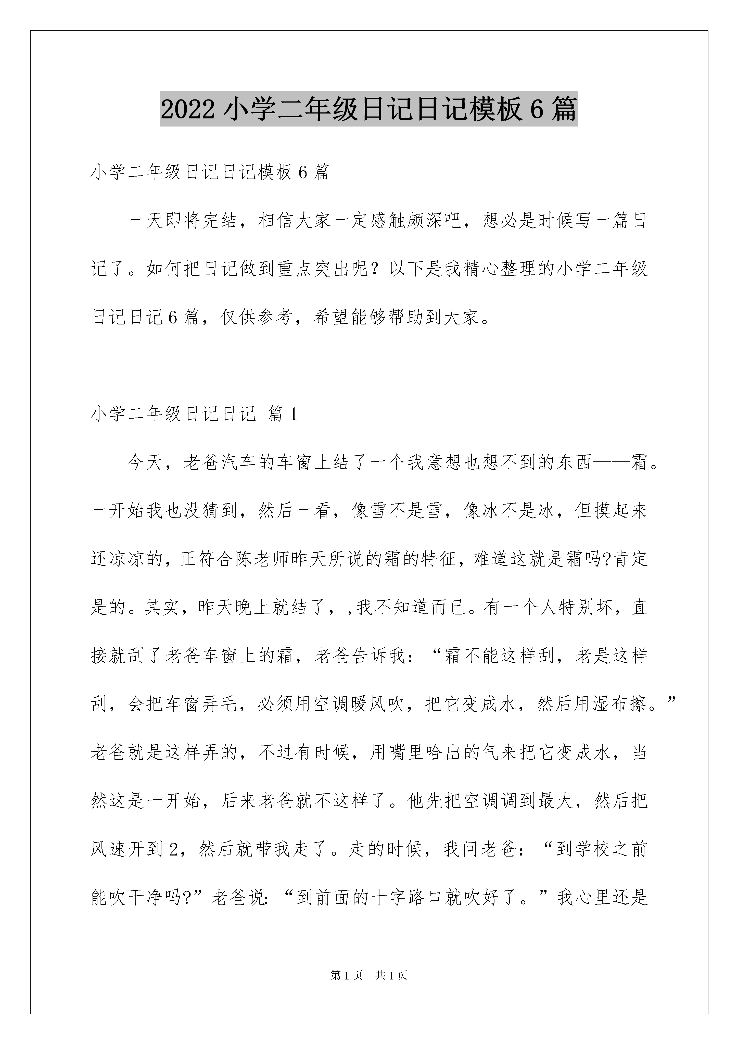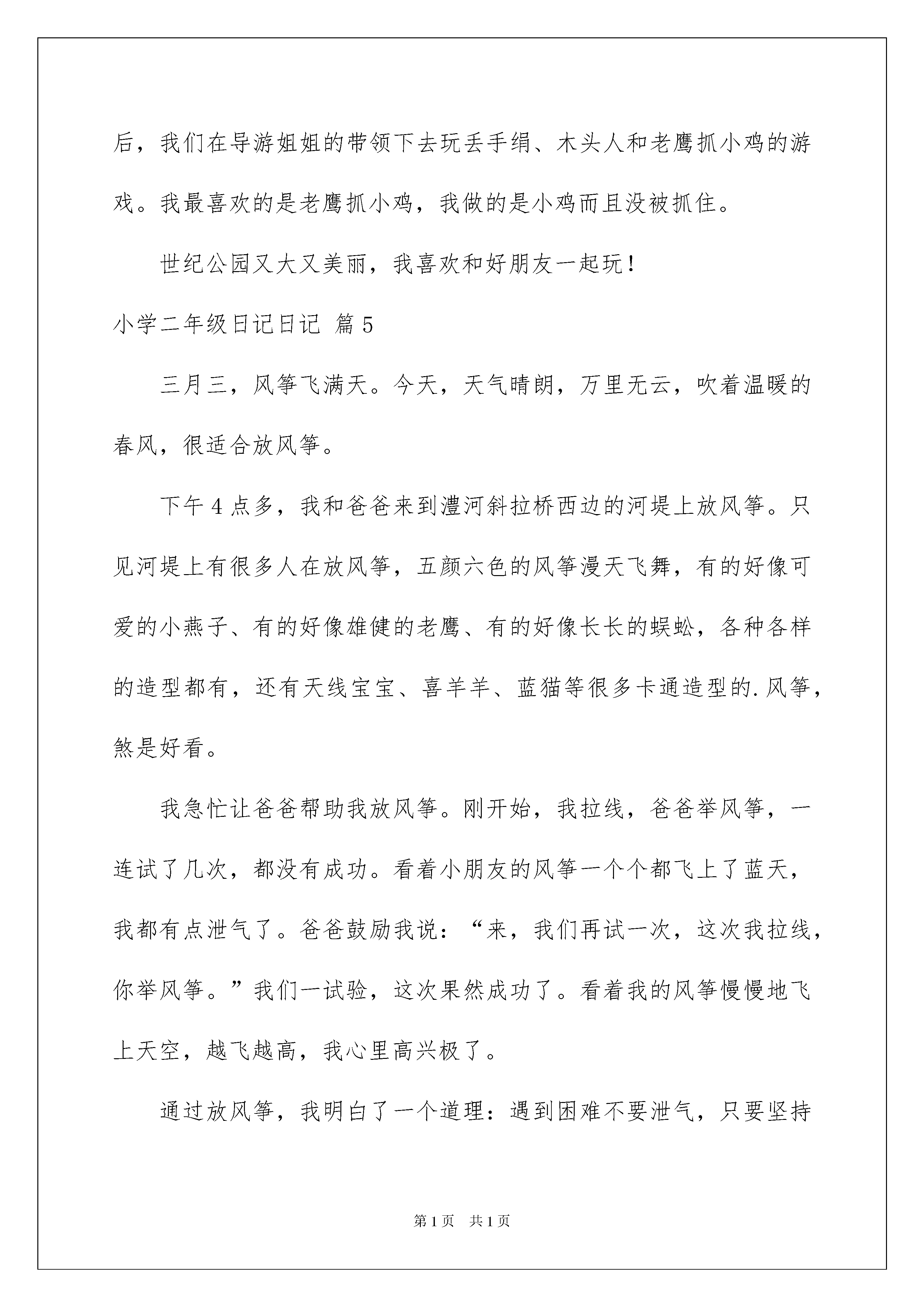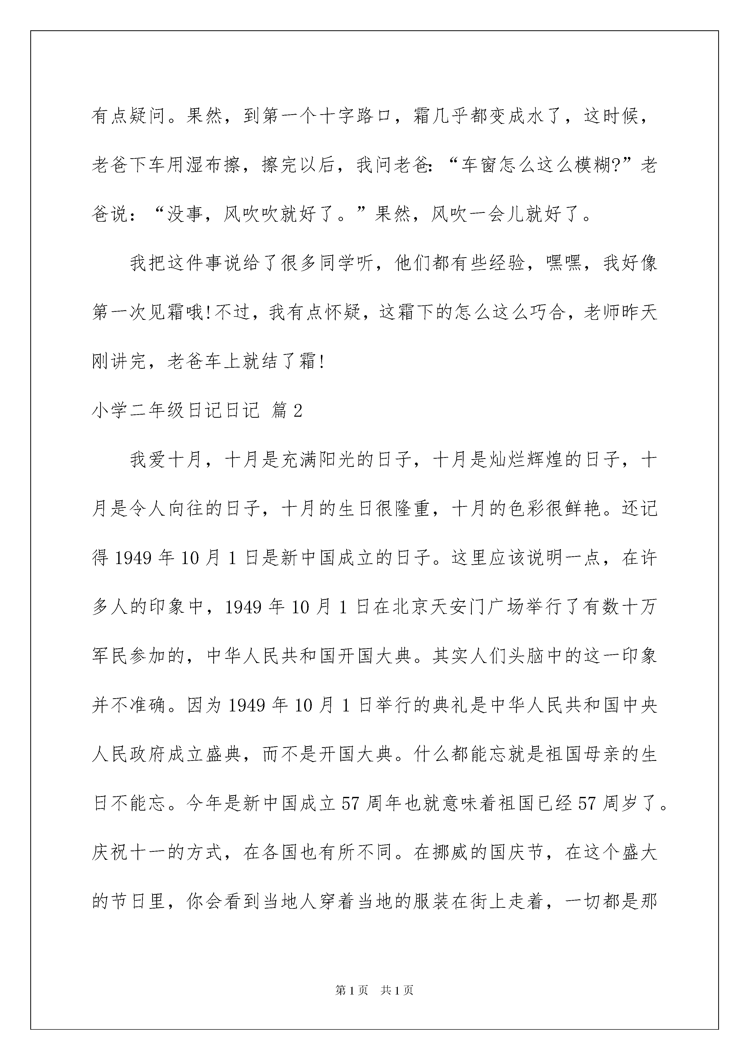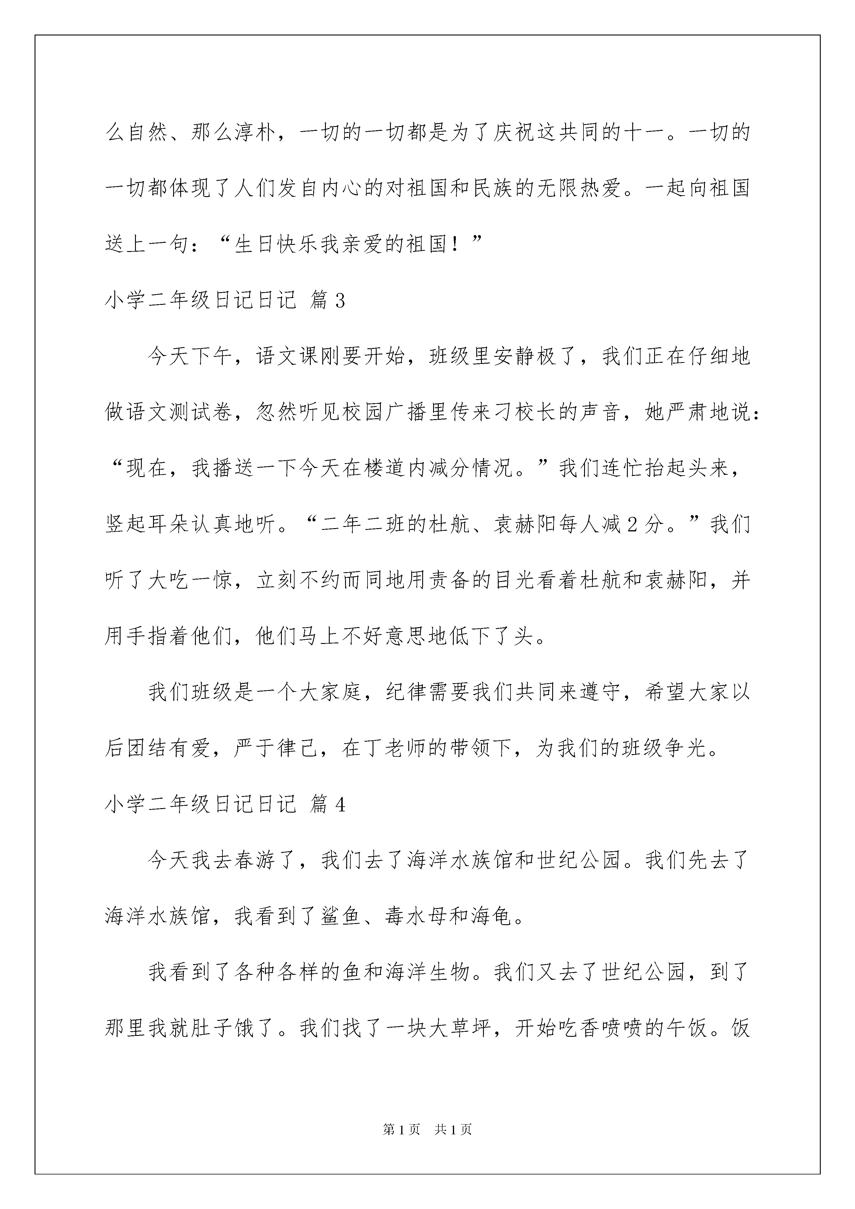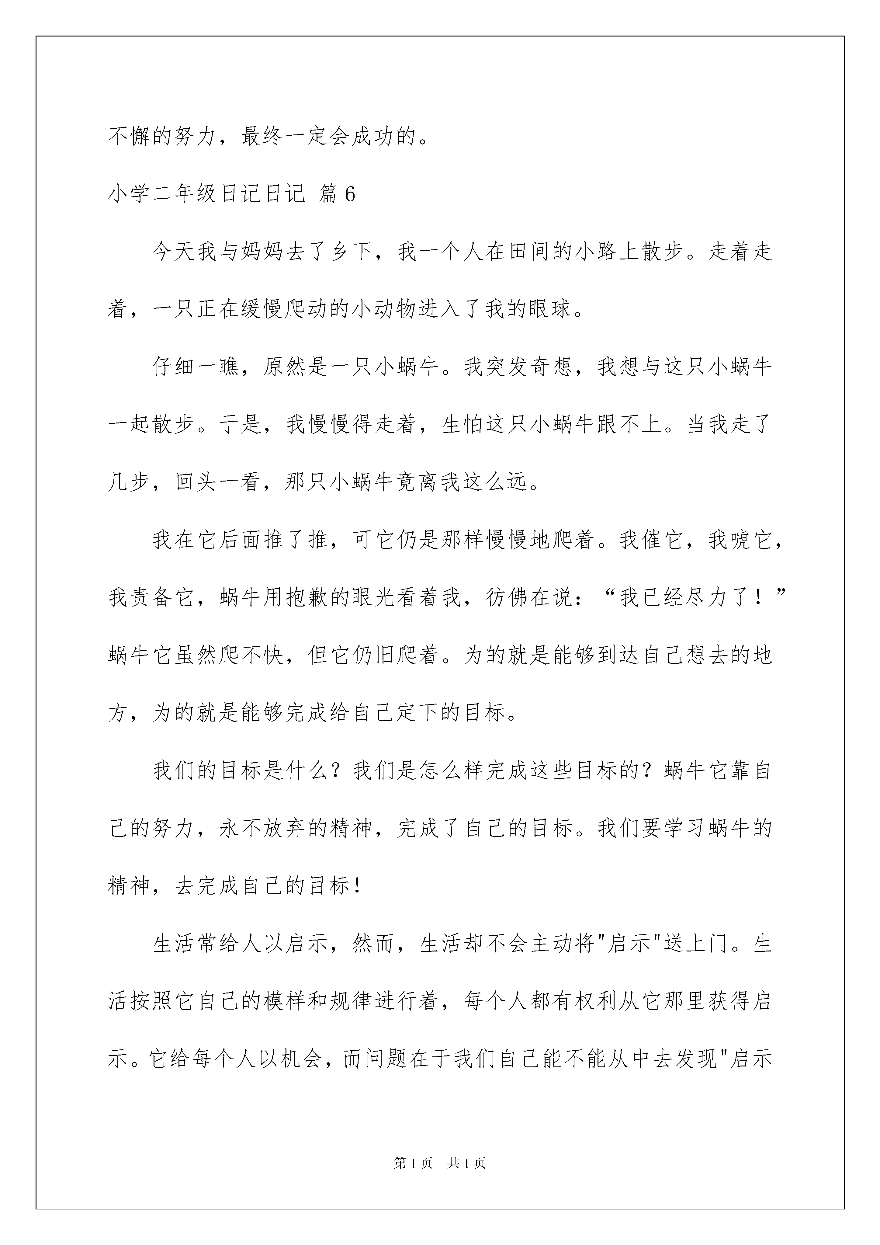 2022小学二年级日记日记模板6篇小学二年级日记日记模板6篇一天即将完结,相信大家一定感触颇深吧,想必是时候写一篇日记了。如何把日记做到重点突出呢?以下是我精心整理的小学二年级日记日记6篇,仅供参考,希望能够帮助到大家。小学二年级日记日记篇1今天,老爸汽车的车窗上结了一个我意想也想不到的东西——霜。一开始我也没猜到,然后一看,像雪不是雪,像冰不是冰,但摸起来还凉凉的,正符合陈老师昨天所说的霜的特征,难道这就是霜吗?肯定是的。其实,昨天晚上就结了,,我不知道而已。有一个人特别坏,直接就刮了老爸车窗上的霜,老爸告诉我:“霜不能这样刮,老是这样刮,会把车窗弄毛,必须用空调暖风吹,把它变成水,然后用湿布擦。”老爸就是这样弄的,不过有时候,用嘴里哈出的气来把它变成水,当然这是一开始,后来老爸就不这样了。他先把空调调到最大,然后把风速开到2,然后就带我走了。走的时候,我问老爸:“到学校之前能吹干净吗?”老爸说:“到前面的十字路口就吹好了。”我心里还是有点疑问。果然,到第一个十字路口,霜几乎都变成水了,这时候,老爸下车用湿布擦,擦完以后,我问老爸:“车窗怎么这么模糊?”老爸说:“没事,风吹吹就好了。”果然,风吹一会儿就好了。我把这件事说给了很多同学听,他们都有些经验,嘿嘿,我好像第一次见霜哦!不过,我有点怀疑,这霜下的怎么这么巧合,老师昨天刚讲完,老爸车上就结了霜!小学二年级日记日记篇2我爱十月,十月是充满阳光的日子,十月是灿烂辉煌的日子,十月是令人向往的日子,十月的生日很隆重,十月的色彩很鲜艳。还记得1949年10月1日是新中国成立的日子。这里应该说明一点,在许多人的印象中,1949年10月1日在北京天安门广场举行了有数十万军民参加的,中华人民共和国开国大典。其实人们头脑中的这一印象并不准确。因为1949年10月1日举行的典礼是中华人民共和国中央人民政府成立盛典,而不是开国大典。什么都能忘就是祖国母亲的生日不能忘。今年是新中国成立57周年也就意味着祖国已经57周岁了。庆祝十一的方式,在各国也有所不同。在挪威的国庆节,在这个盛大的节日里,你会看到当地人穿着当地的服装在街上走着,一切都是那么自然、那么淳朴,一切的一切都是为了庆祝这共同的十一。一切的一切都体现了人们发自内心的对祖国和民族的无限热爱。一起向祖国送上一句:“生日快乐我亲爱的祖国!”小学二年级日记日记篇3今天下午,语文课刚要开始,班级里安静极了,我们正在仔细地做语文测试卷,忽然听见校园广播里传来刁校长的声音,她严肃地说:“现在,我播送一下今天在楼道内减分情况。”我们连忙抬起头来,竖起耳朵认真地听。“二年二班的杜航、袁赫阳每人减2分。”我们听了大吃一惊,立刻不约而同地用责备的目光看着杜航和袁赫阳,并用手指着他们,他们马上不好意思地低下了头。我们班级是一个大家庭,纪律需要我们共同来遵守,希望大家以后团结有爱,严于律己,在丁老师的带领下,为我们的班级争光。小学二年级日记日记篇4今天我去春游了,我们去了海洋水族馆和世纪公园。我们先去了海洋水族馆,我看到了鲨鱼、毒水母和海龟。我看到了各种各样的鱼和海洋生物。我们又去了世纪公园,到了那里我就肚子饿了。我们找了一块大草坪,开始吃香喷喷的午饭。饭后,我们在导游姐姐的带领下去玩丢手绢、木头人和老鹰抓小鸡的游戏。我最喜欢的是老鹰抓小鸡,我做的是小鸡而且没被抓住。世纪公园又大又美丽,我喜欢和好朋友一起玩!小学二年级日记日记篇5三月三,风筝飞满天。今天,天气晴朗,万里无云,吹着温暖的春风,很适合放风筝。下午4点多,我和爸爸来到澧河斜拉桥西边的河堤上放风筝。只见河堤上有很多人在放风筝,五颜六色的风筝漫天飞舞,有的好像可爱的小燕子、有的好像雄健的老鹰、有的好像长长的蜈蚣,各种各样的造型都有,还有天线宝宝、喜羊羊、蓝猫等很多卡通造型的.风筝,煞是好看。我急忙让爸爸帮助我放风筝。刚开始,我拉线,爸爸举风筝,一连试了几次,都没有成功。看着小朋友的风筝一个个都飞上了蓝天,我都有点泄气了。爸爸鼓励我说:“来,我们再试一次,这次我拉线,你举风筝。”我们一试验,这次果然成功了。看着我的风筝慢慢地飞上天空,越飞越高,我心里高兴极了。通过放风筝,我明白了一个道理:遇到困难不要泄气,只要坚持不懈的努力,最终一定会成功的。小学二年级日记日记篇6今天我与妈妈去了乡下,我一个人在田间的小路上散步。走着走着,一只正在缓慢爬动的小动物进入了我的眼球。仔细一瞧,原然是一只小蜗牛。我突发奇想,我想与这只小蜗牛一起散步。于是,我慢慢得走着,生怕这只小蜗牛跟不上。当我走了几步,回头一看,那只小蜗牛竟离我这么远。我在它后面推了推,可它仍是那样慢慢